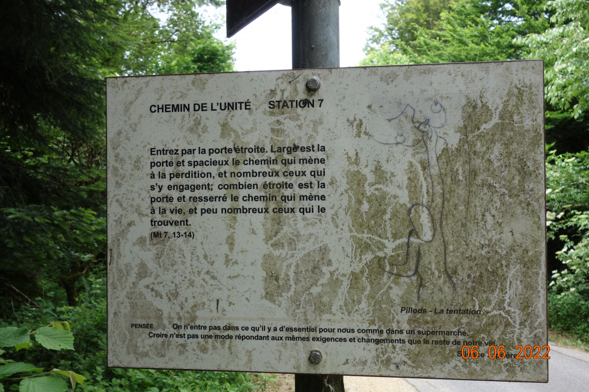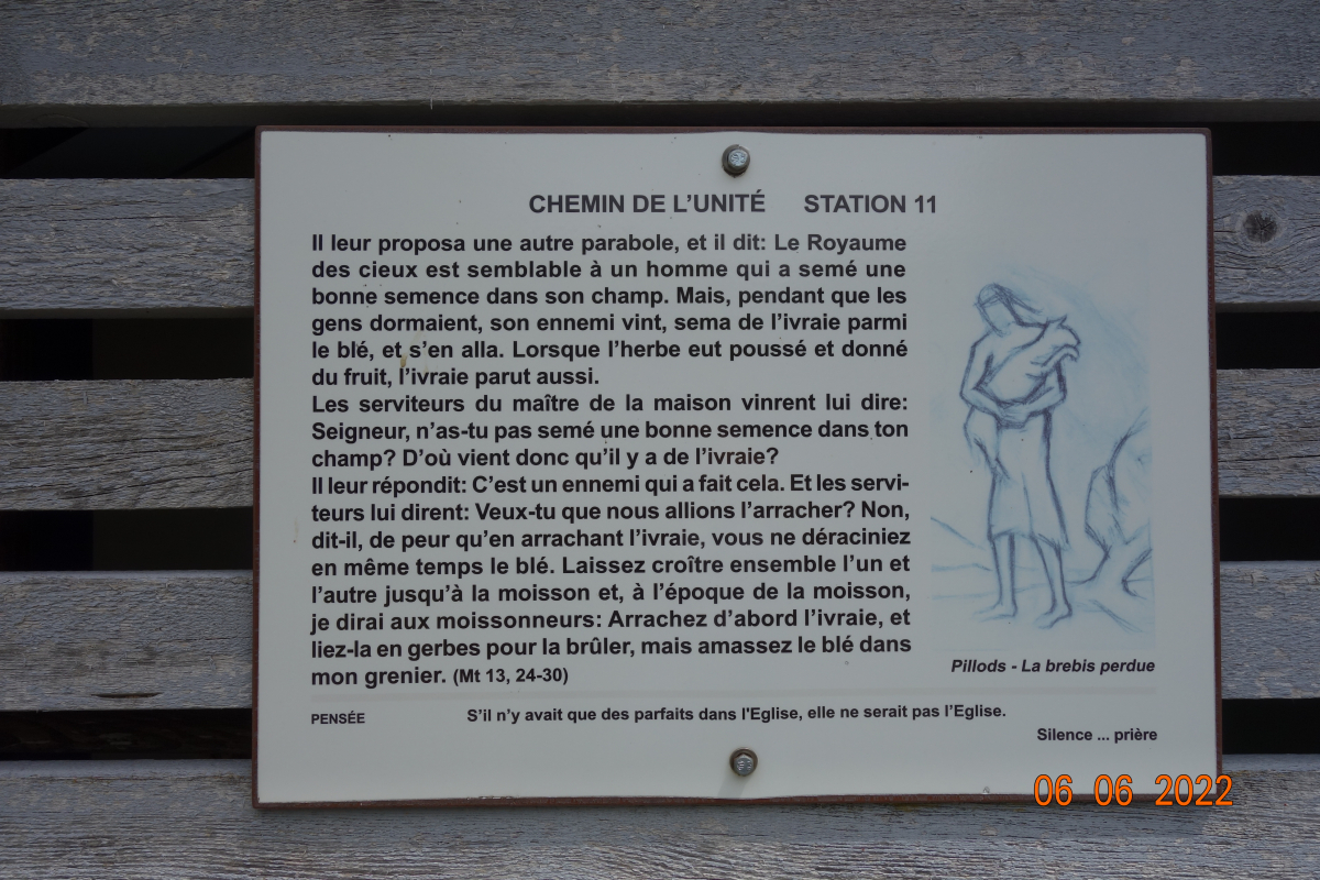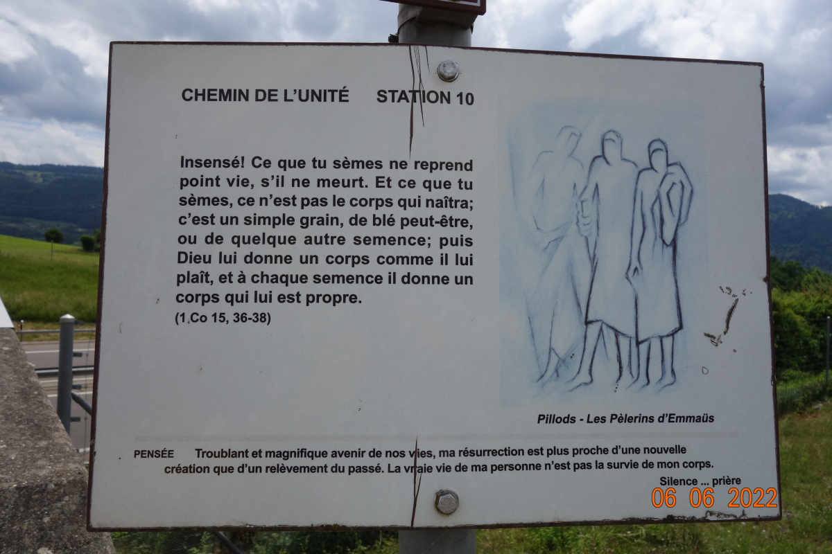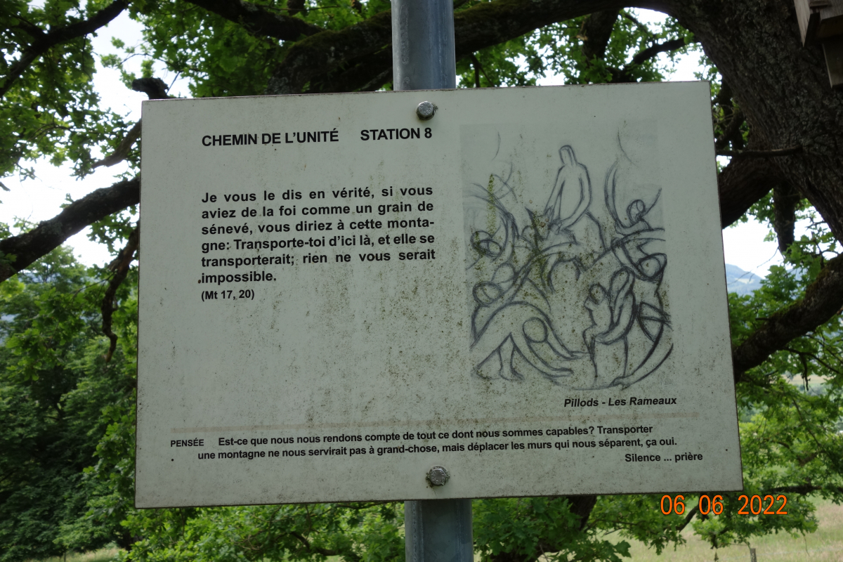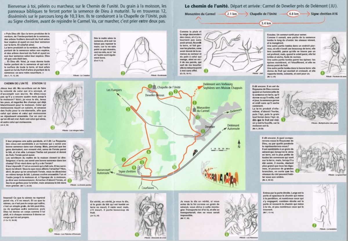 Ce chemin, fait de douze stations bibliques et d'une halte à la chapelle de l'unité à Develier-Dessus, est une initiative des chrétiens catholiques, réformés et orthodoxes du canton du Jura, en réponse à la prière insistante de Jésus, à la veille de sa Passion : "Que tous soient un" (Jean 17, 21).