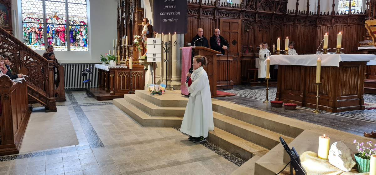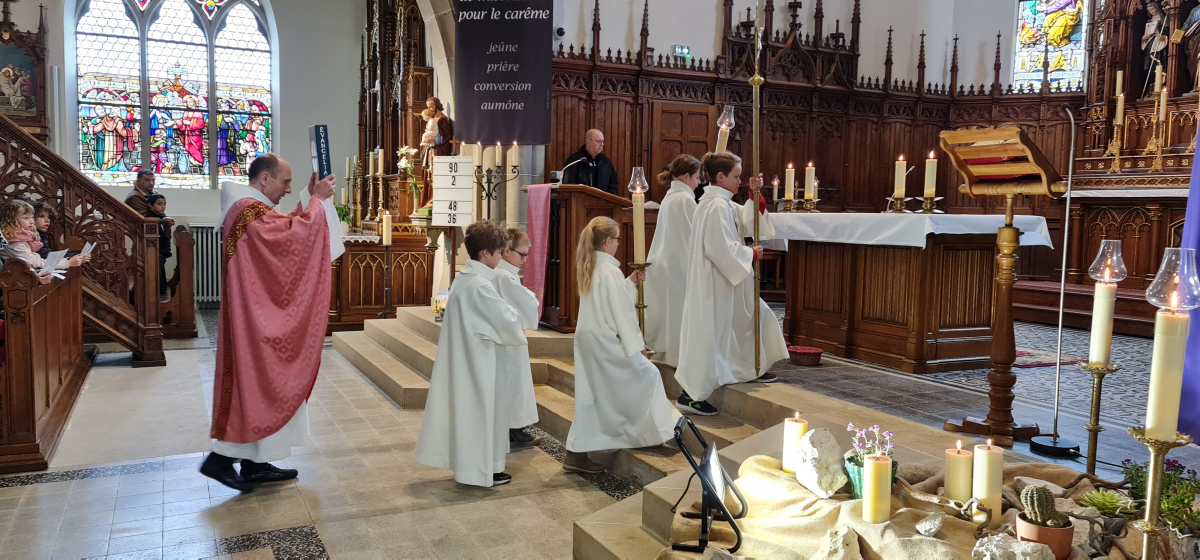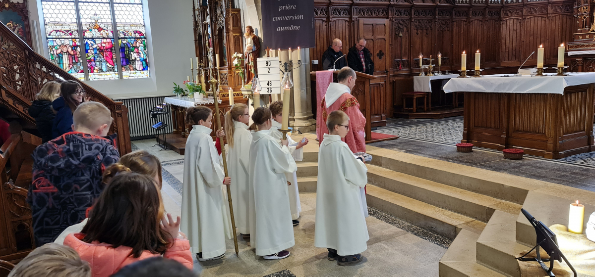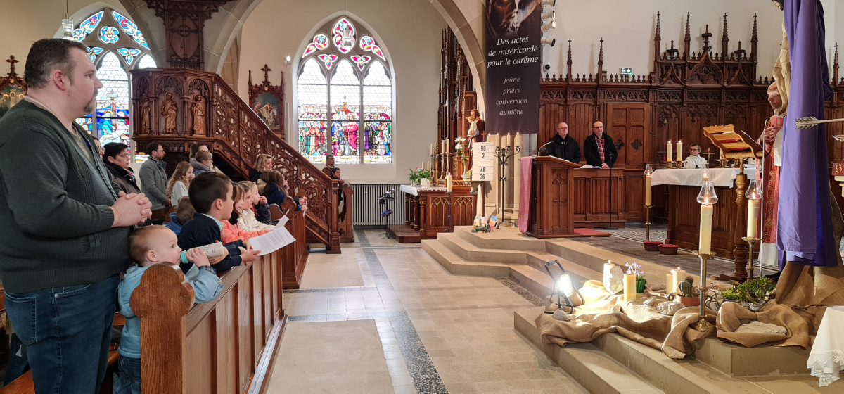 Les enfants se sont réunis avant la messe en famille pour découvrir l'Evangile du jour, celui de la rencontre de Jésus et de l'aveugle né.