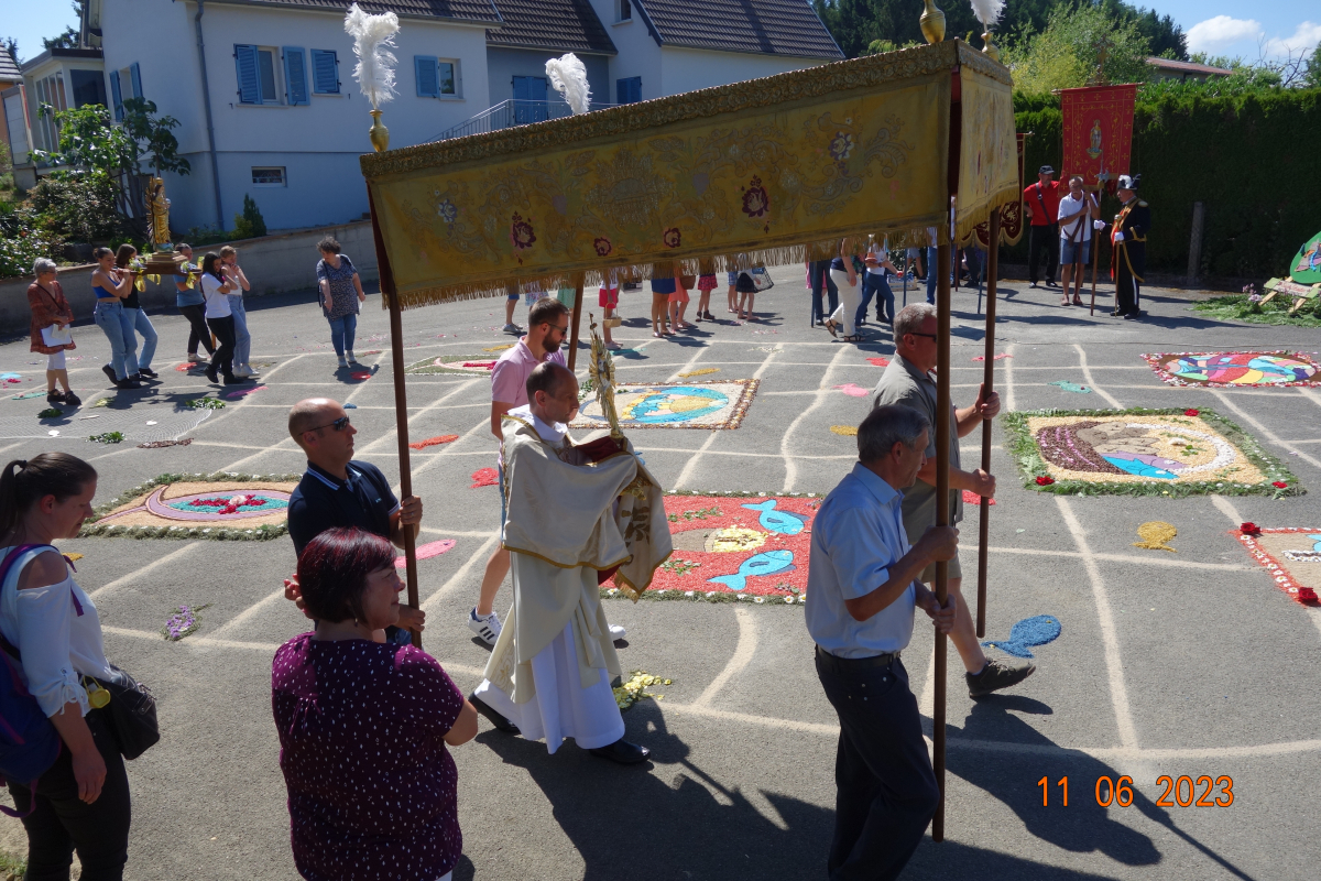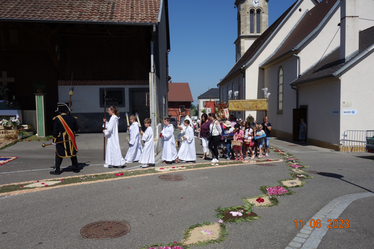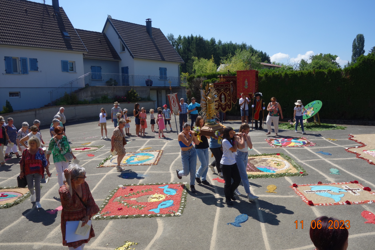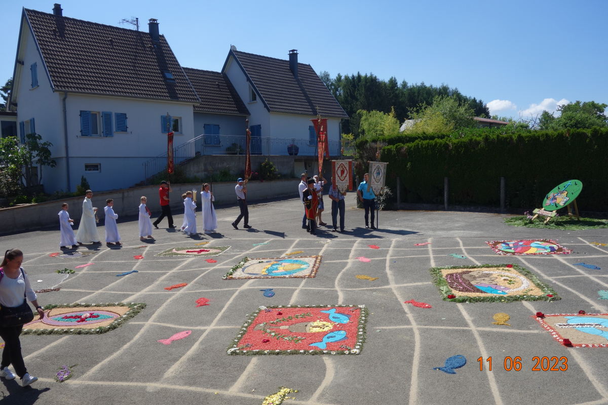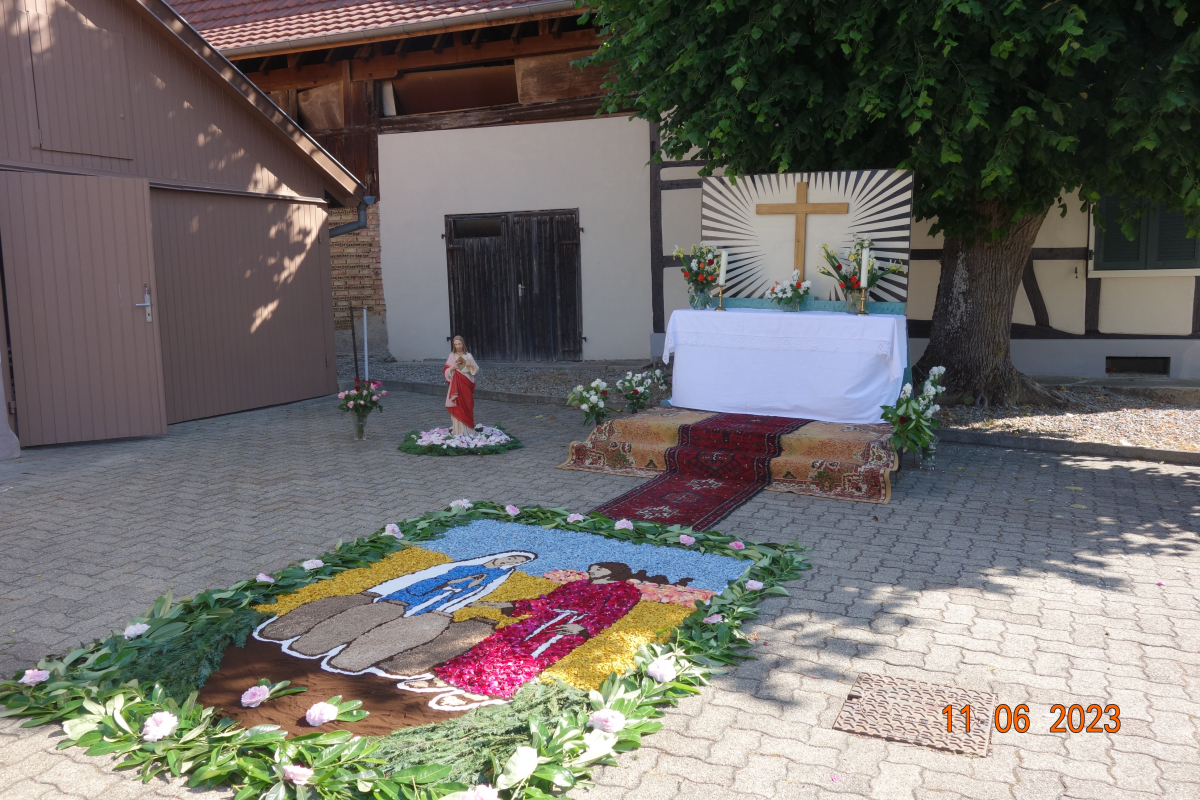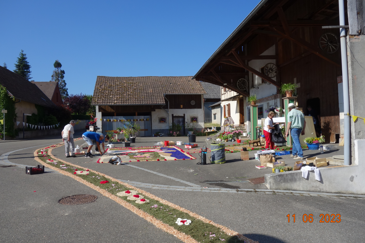 Cette année encore, à Muespach-le-Haut, un bon groupe de personnes aux mains expertes était à pied d'œuvre dès les premières lueurs du jour pour réaliser, comme à l'habitude, les magnifiques tapis de fleurs et orner les trois reposoirs pour la procession du Saint-Sacrement.