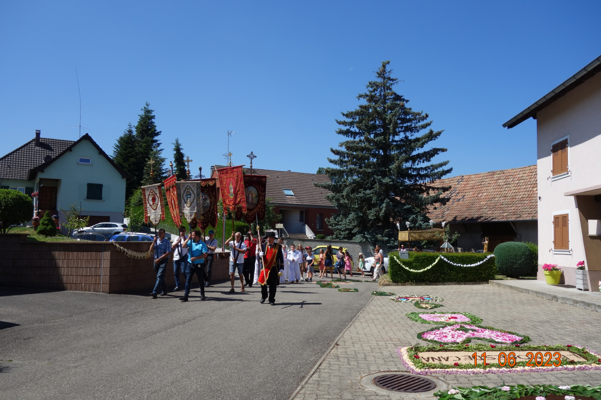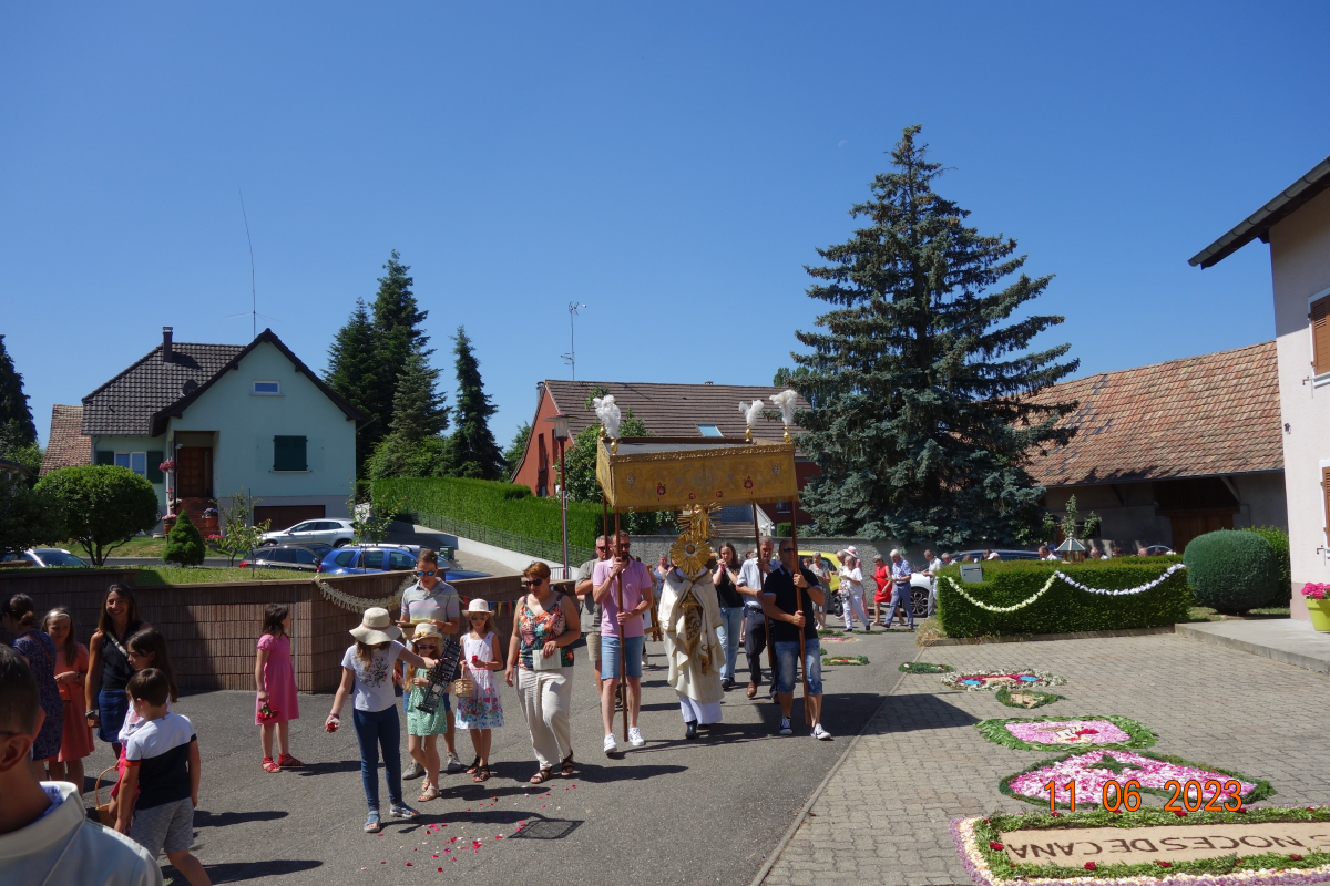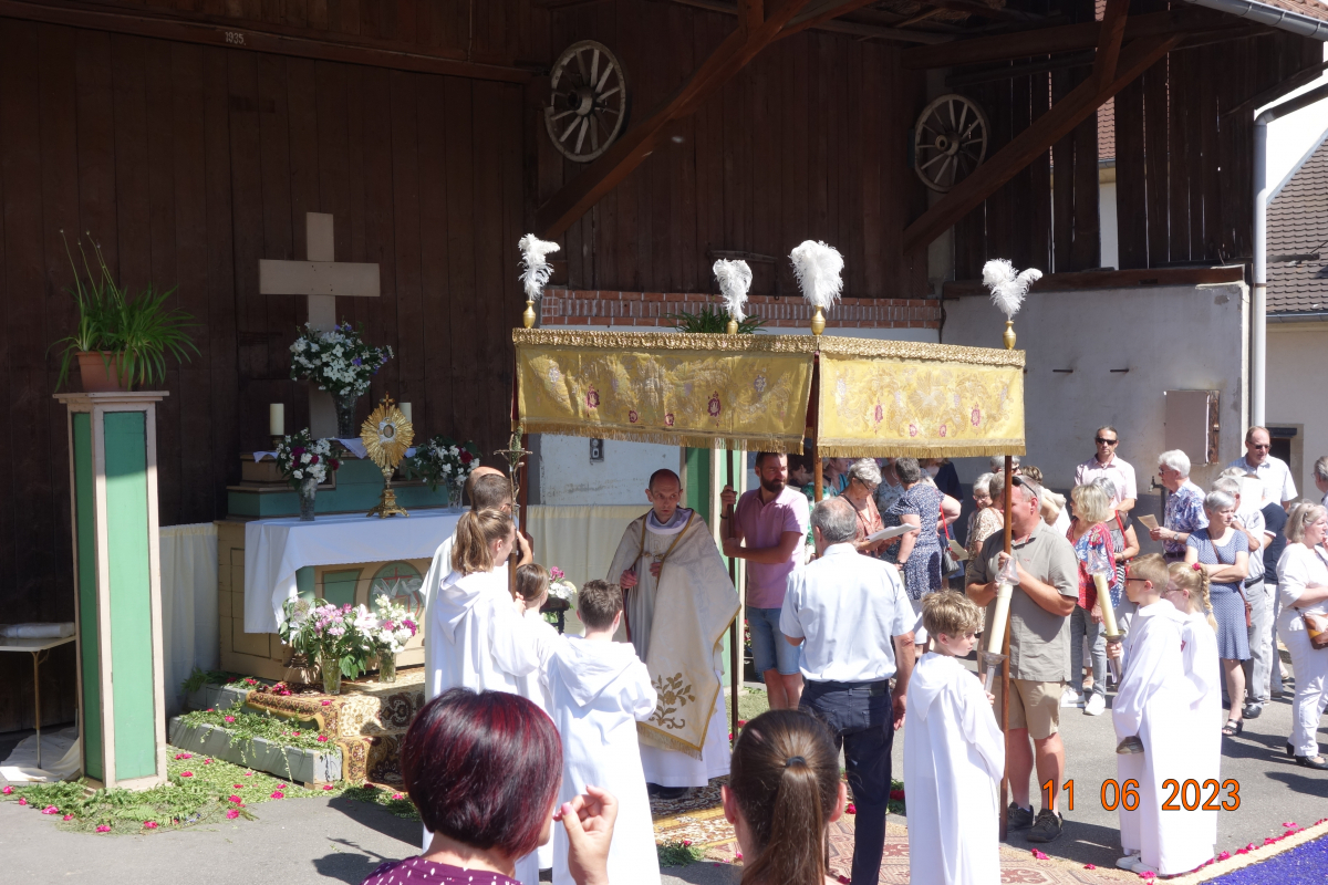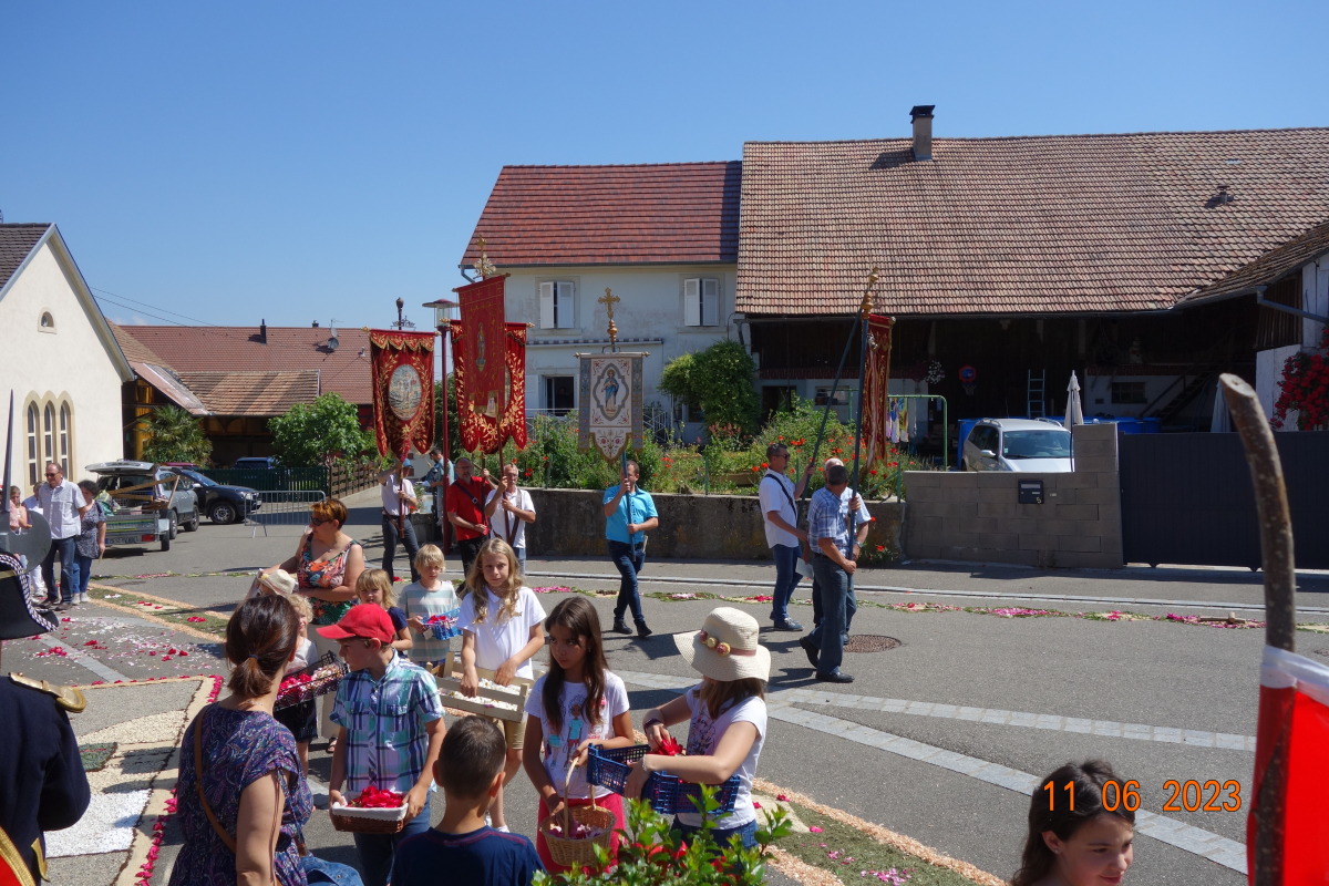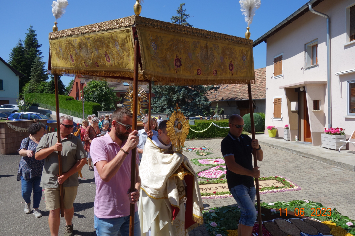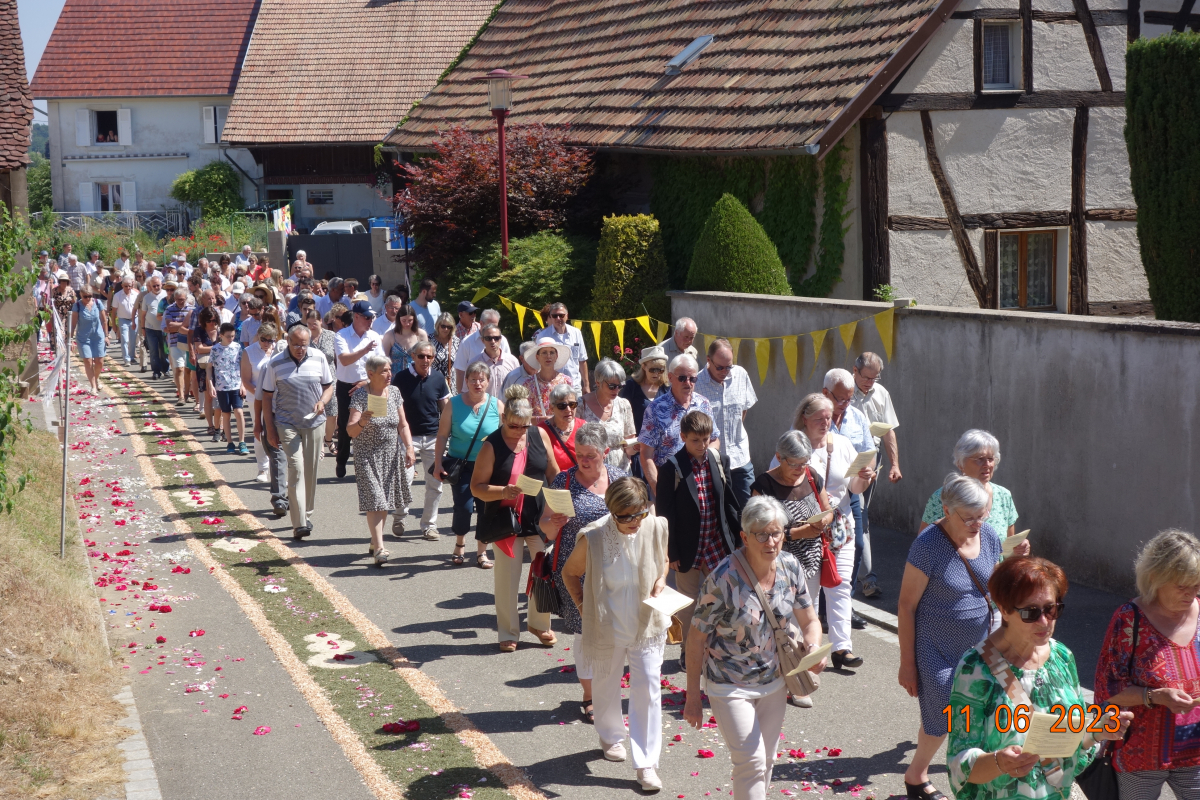 Cette année encore, à Muespach-le-Haut, un bon groupe de personnes aux mains expertes était à pied d'œuvre dès les premières lueurs du jour pour réaliser, comme à l'habitude, les magnifiques tapis de fleurs et orner les trois reposoirs pour la procession du Saint-Sacrement.