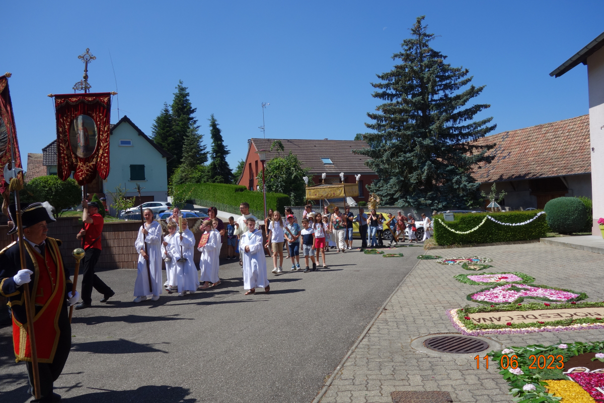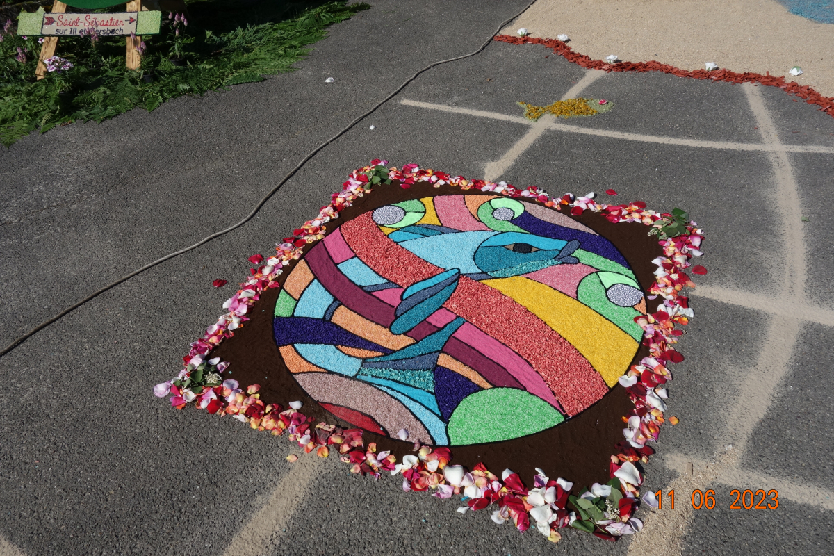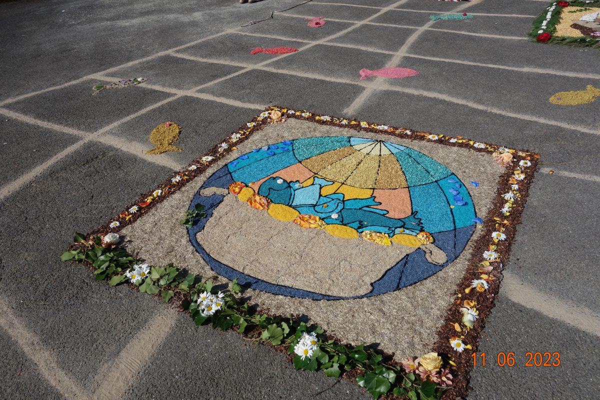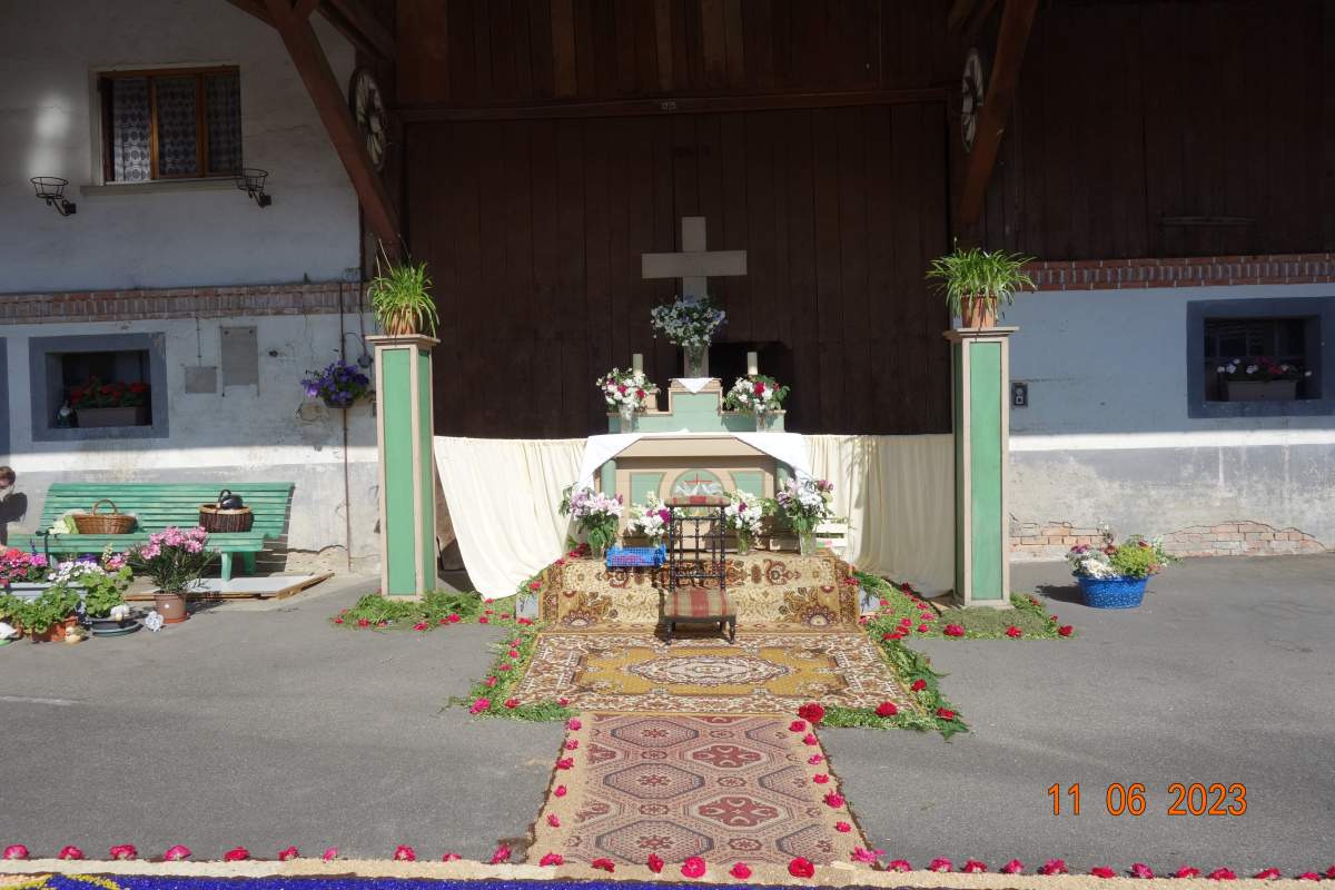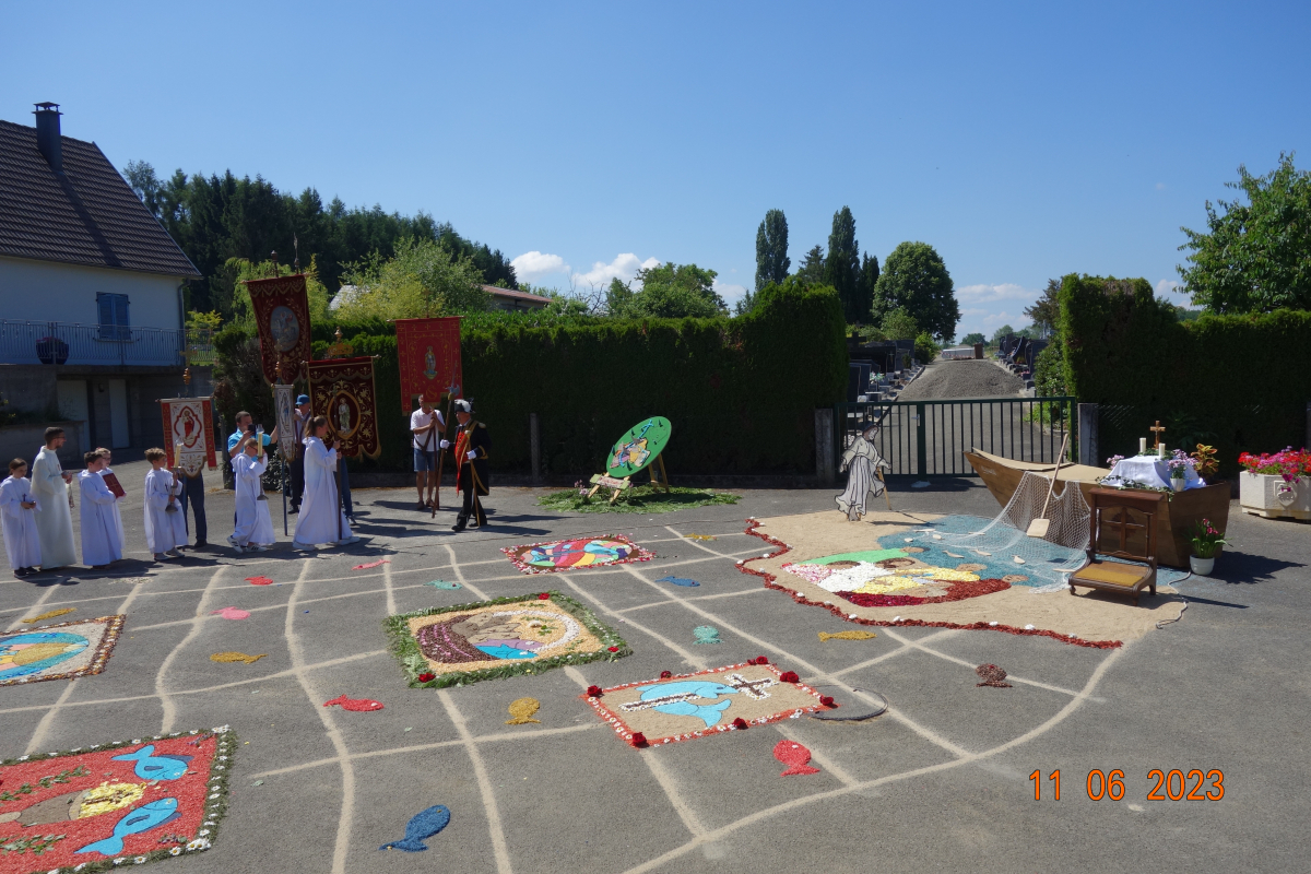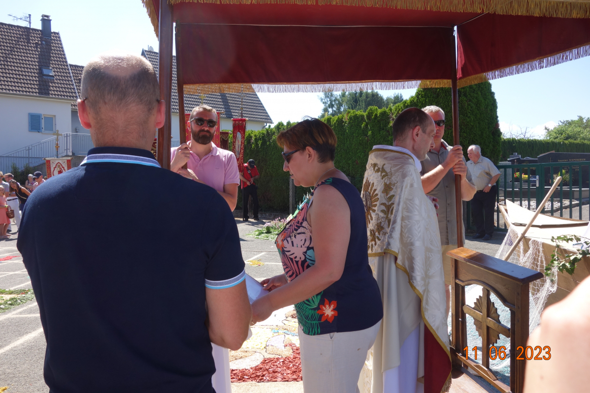 Cette année encore, à Muespach-le-Haut, un bon groupe de personnes aux mains expertes était à pied d'œuvre dès les premières lueurs du jour pour réaliser, comme à l'habitude, les magnifiques tapis de fleurs et orner les trois reposoirs pour la procession du Saint-Sacrement.