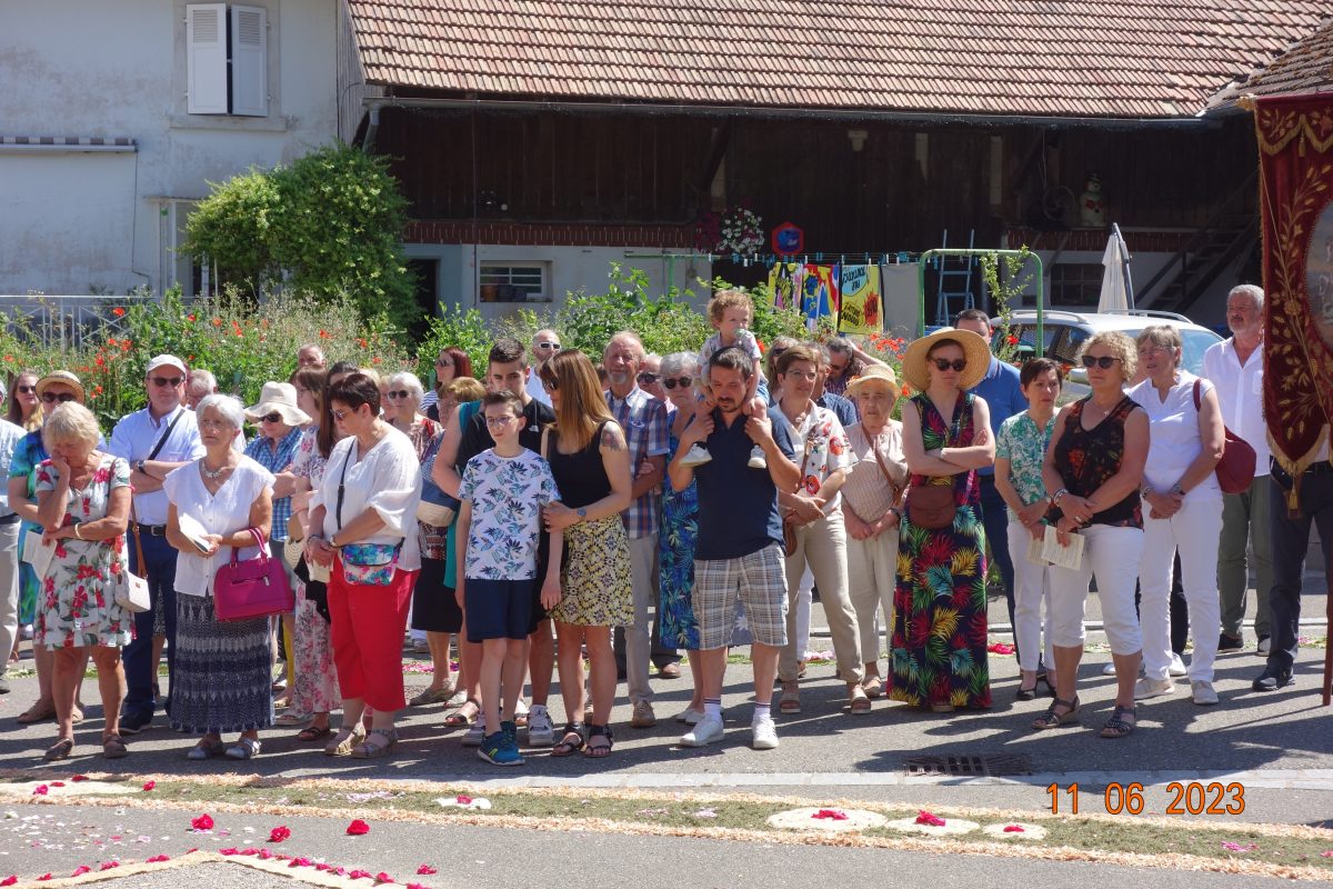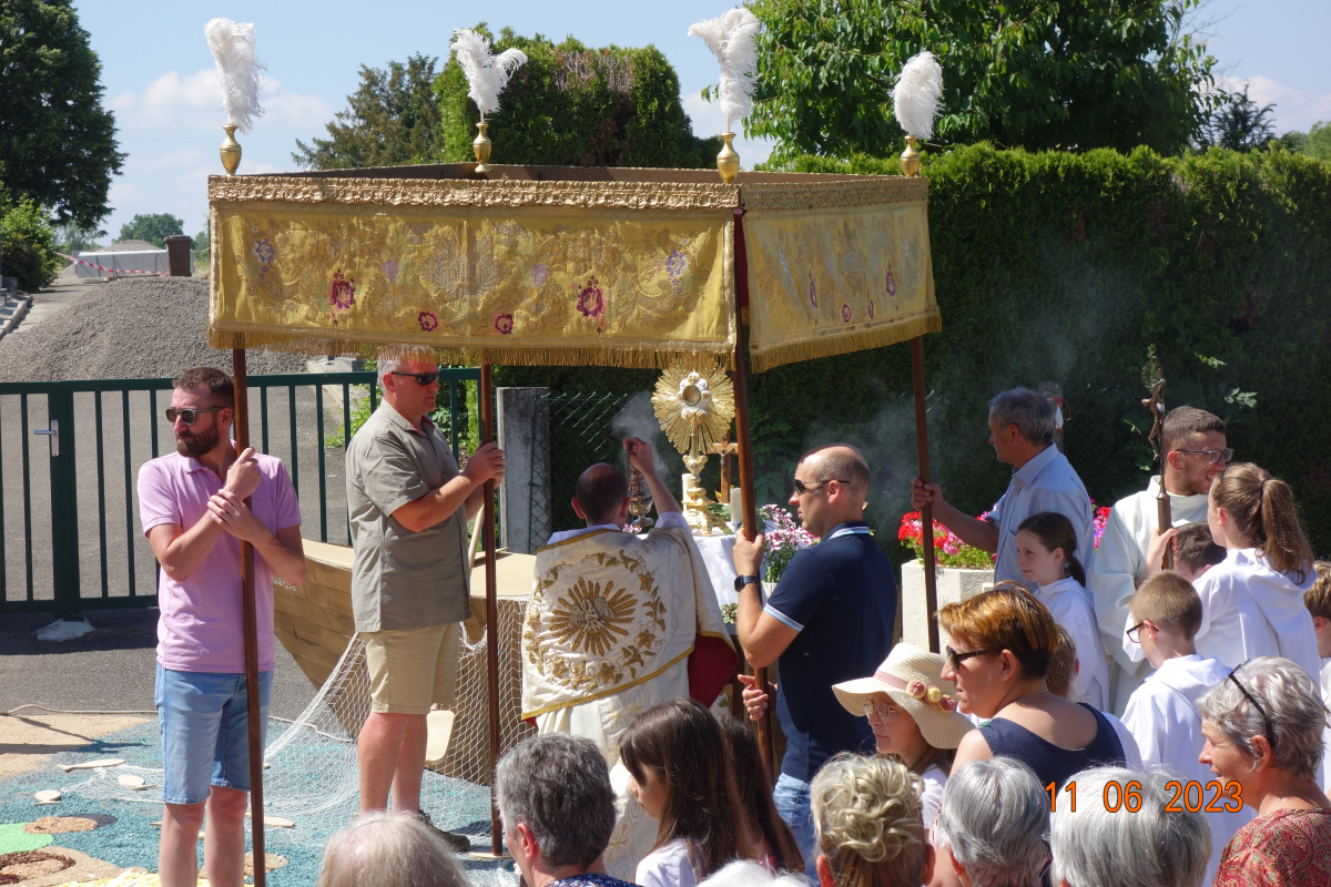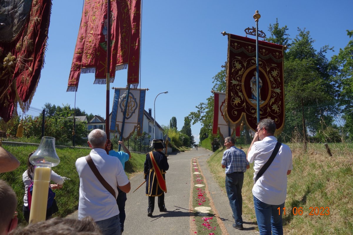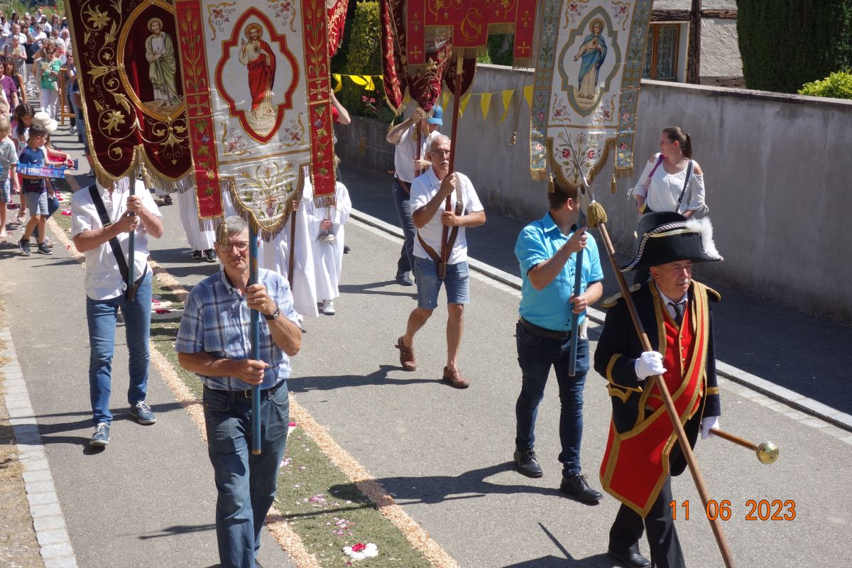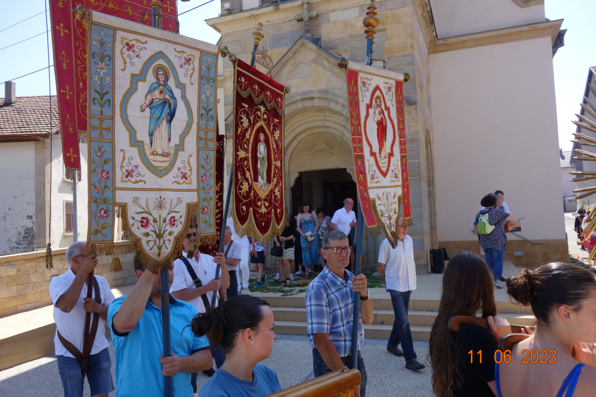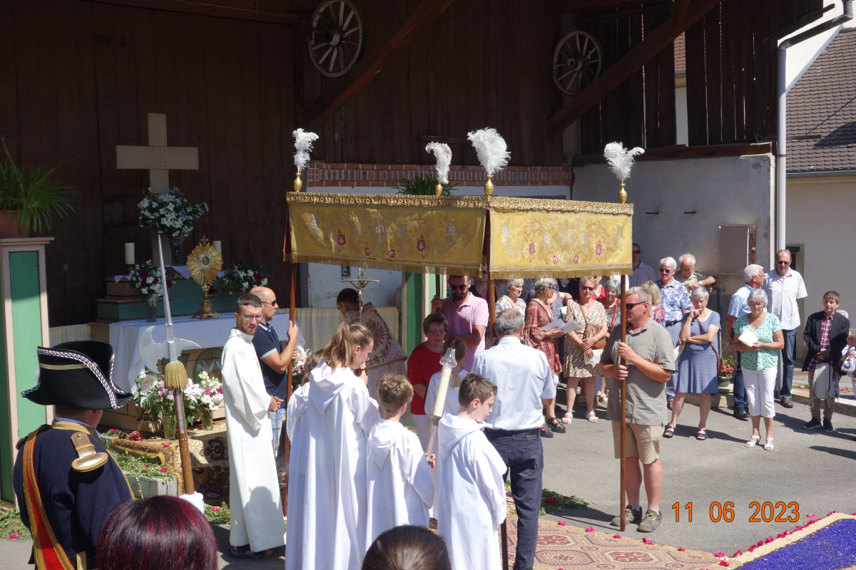Cette année encore, à Muespach-le-Haut, un bon groupe de personnes aux mains expertes était à pied d'œuvre dès les premières lueurs du jour pour réaliser, comme à l'habitude, les magnifiques tapis de fleurs et orner les trois reposoirs pour la procession du Saint-Sacrement.