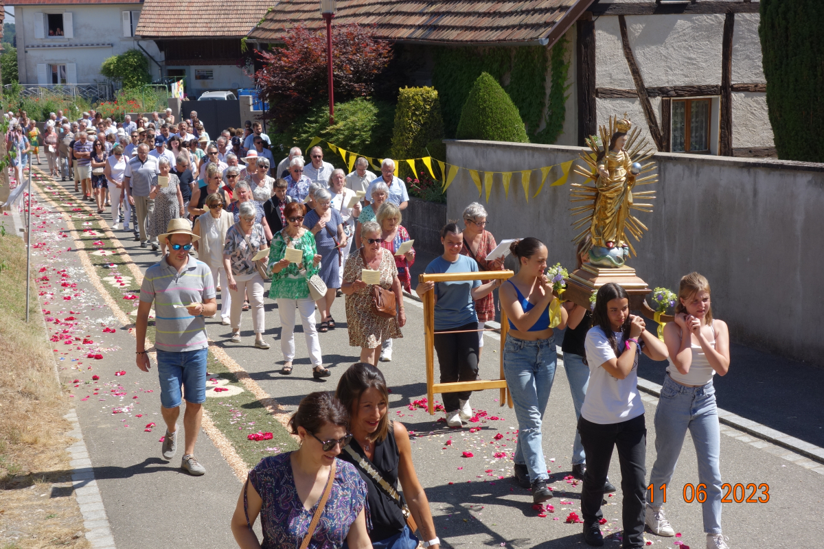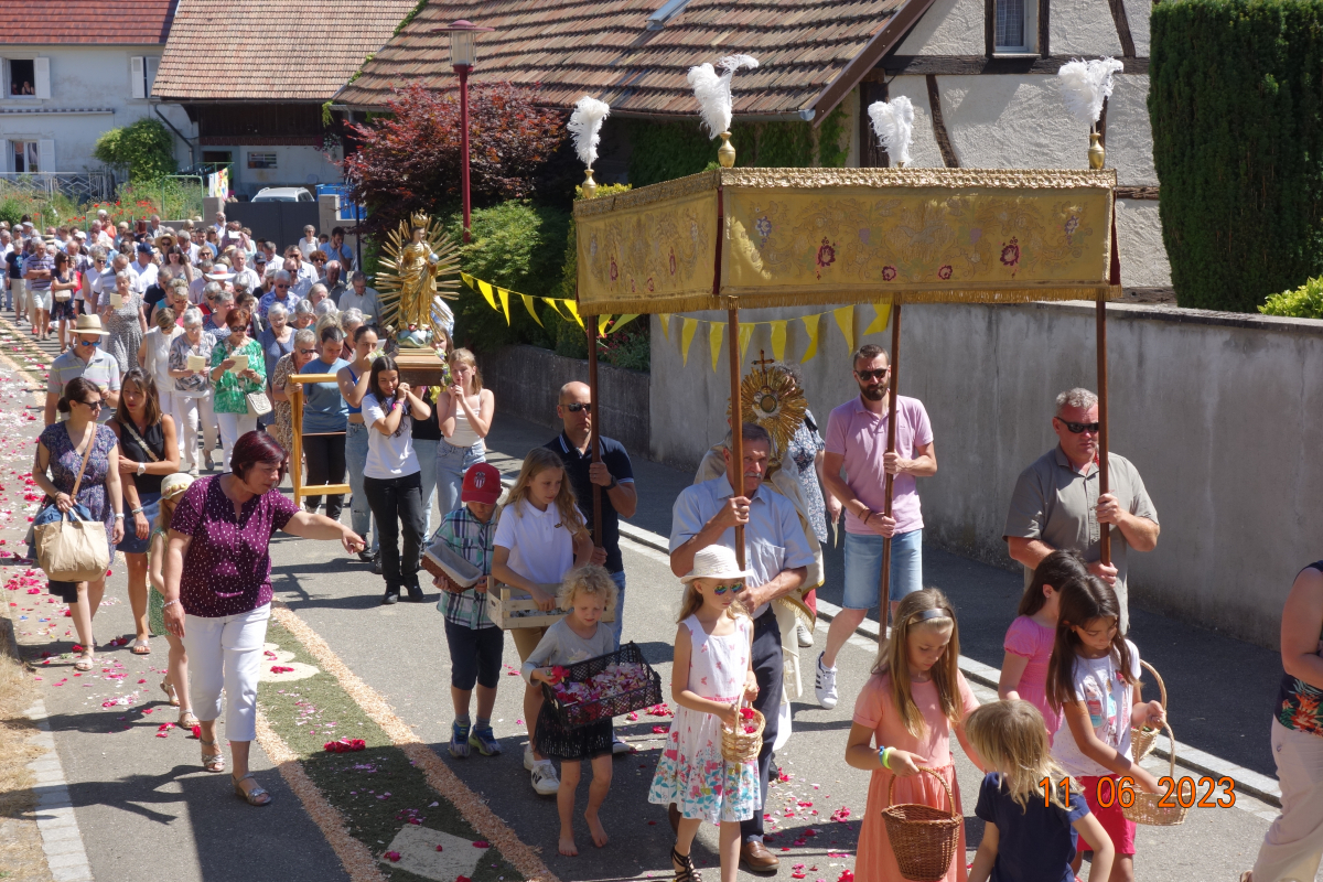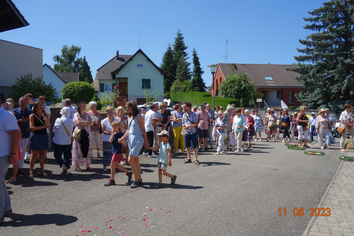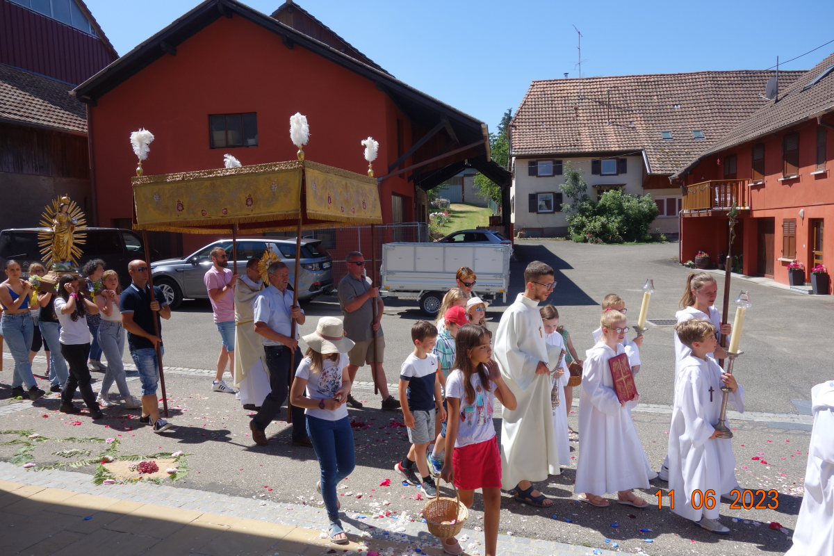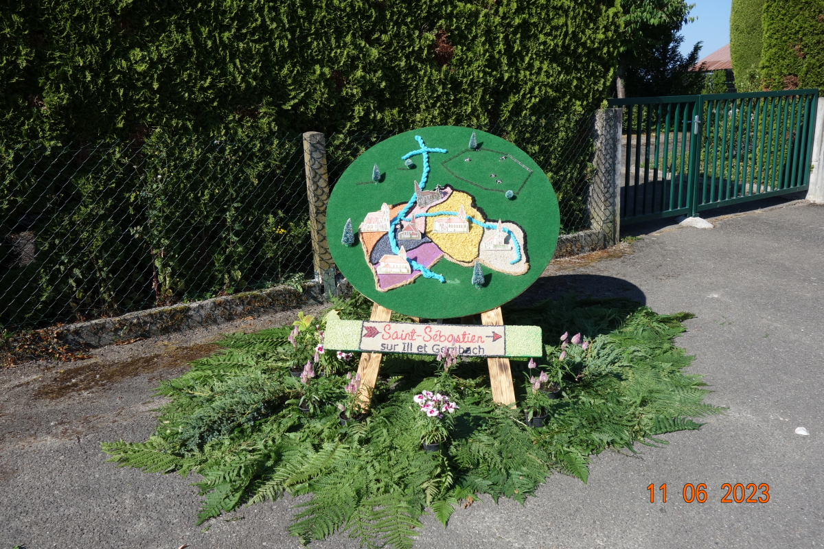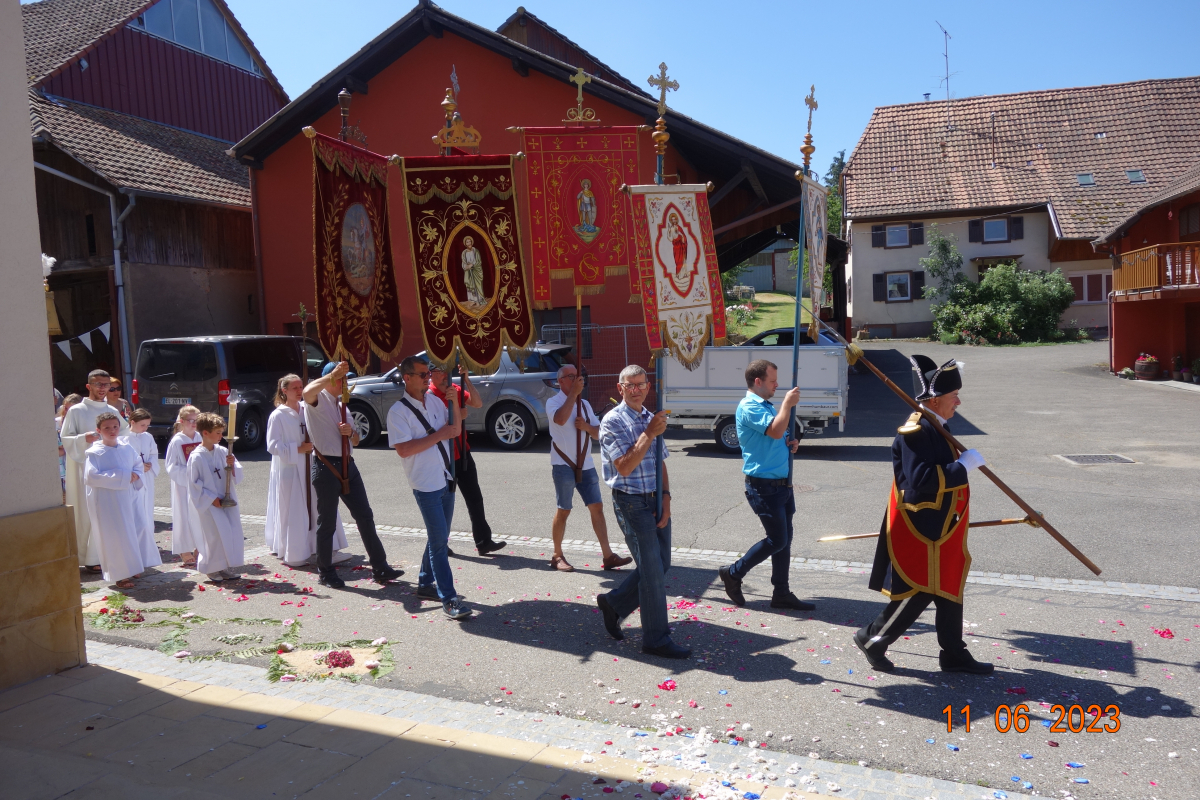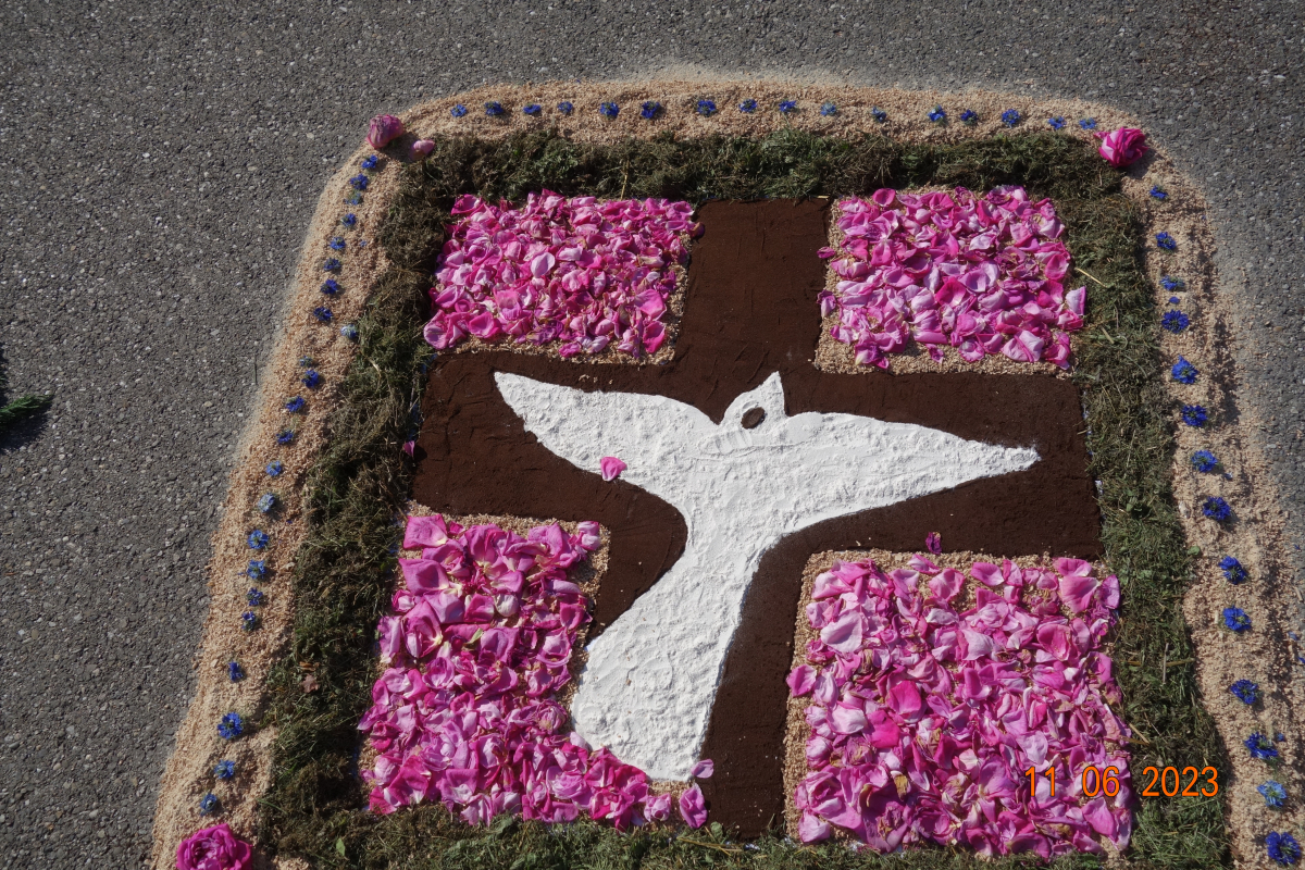 Cette année encore, à Muespach-le-Haut, un bon groupe de personnes aux mains expertes était à pied d'œuvre dès les premières lueurs du jour pour réaliser, comme à l'habitude, les magnifiques tapis de fleurs et orner les trois reposoirs pour la procession du Saint-Sacrement.