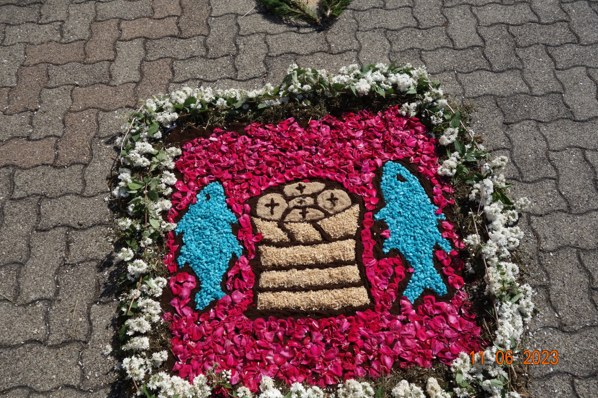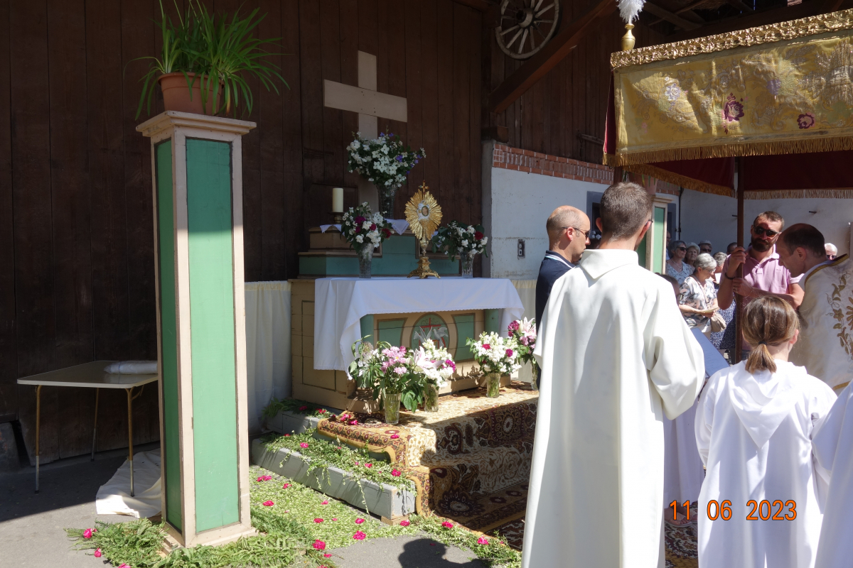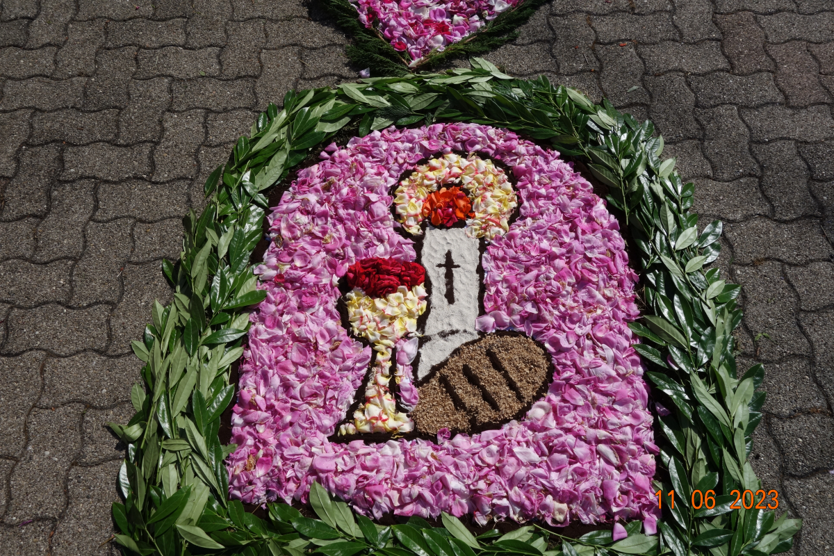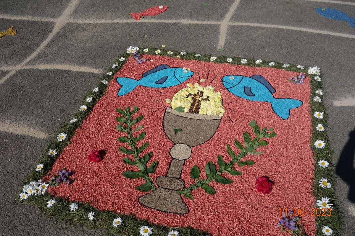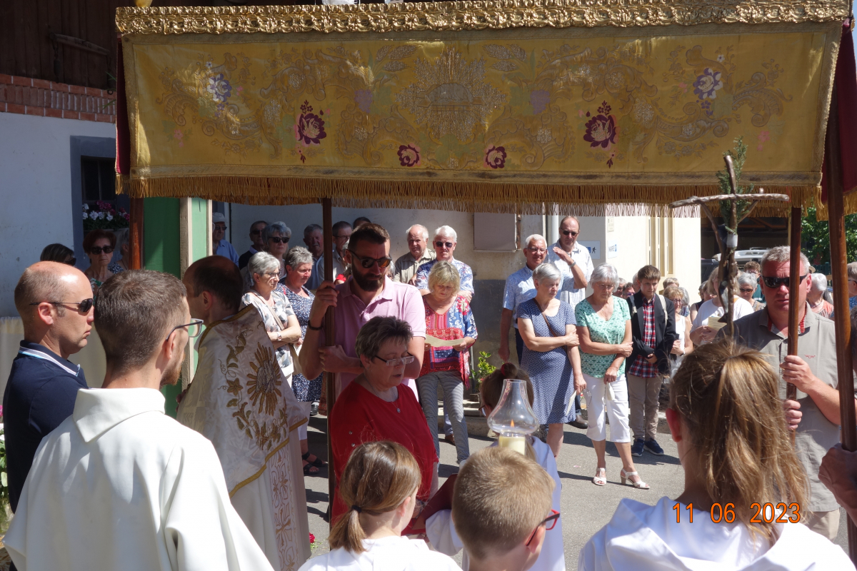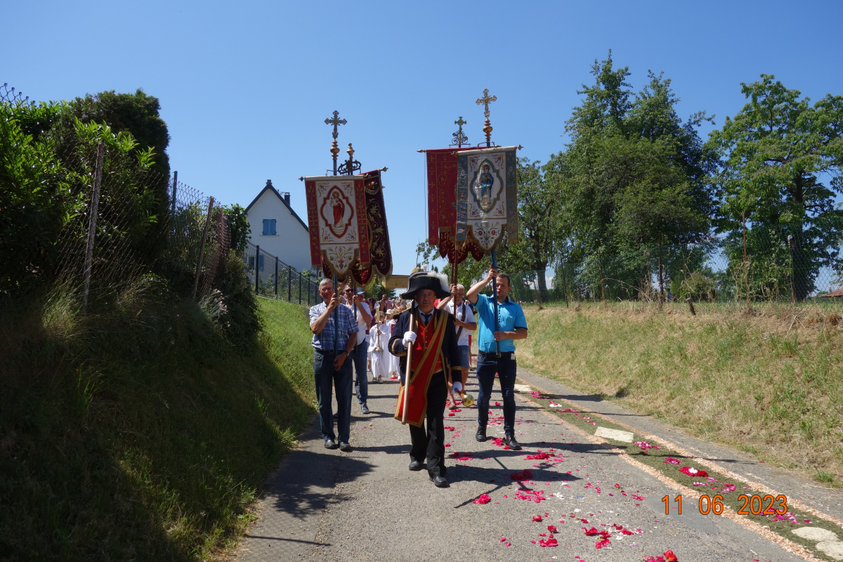 Cette année encore, à Muespach-le-Haut, un bon groupe de personnes aux mains expertes était à pied d'œuvre dès les premières lueurs du jour pour réaliser, comme à l'habitude, les magnifiques tapis de fleurs et orner les trois reposoirs pour la procession du Saint-Sacrement.