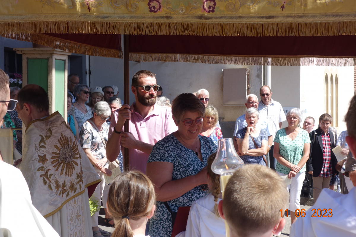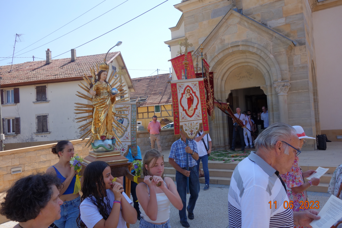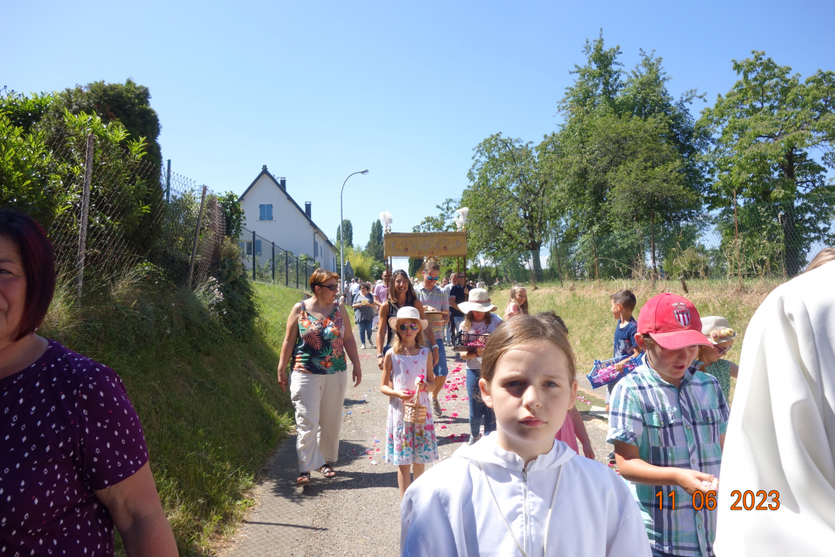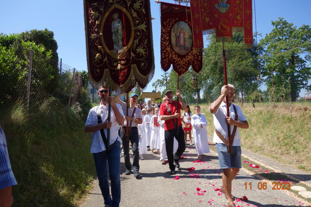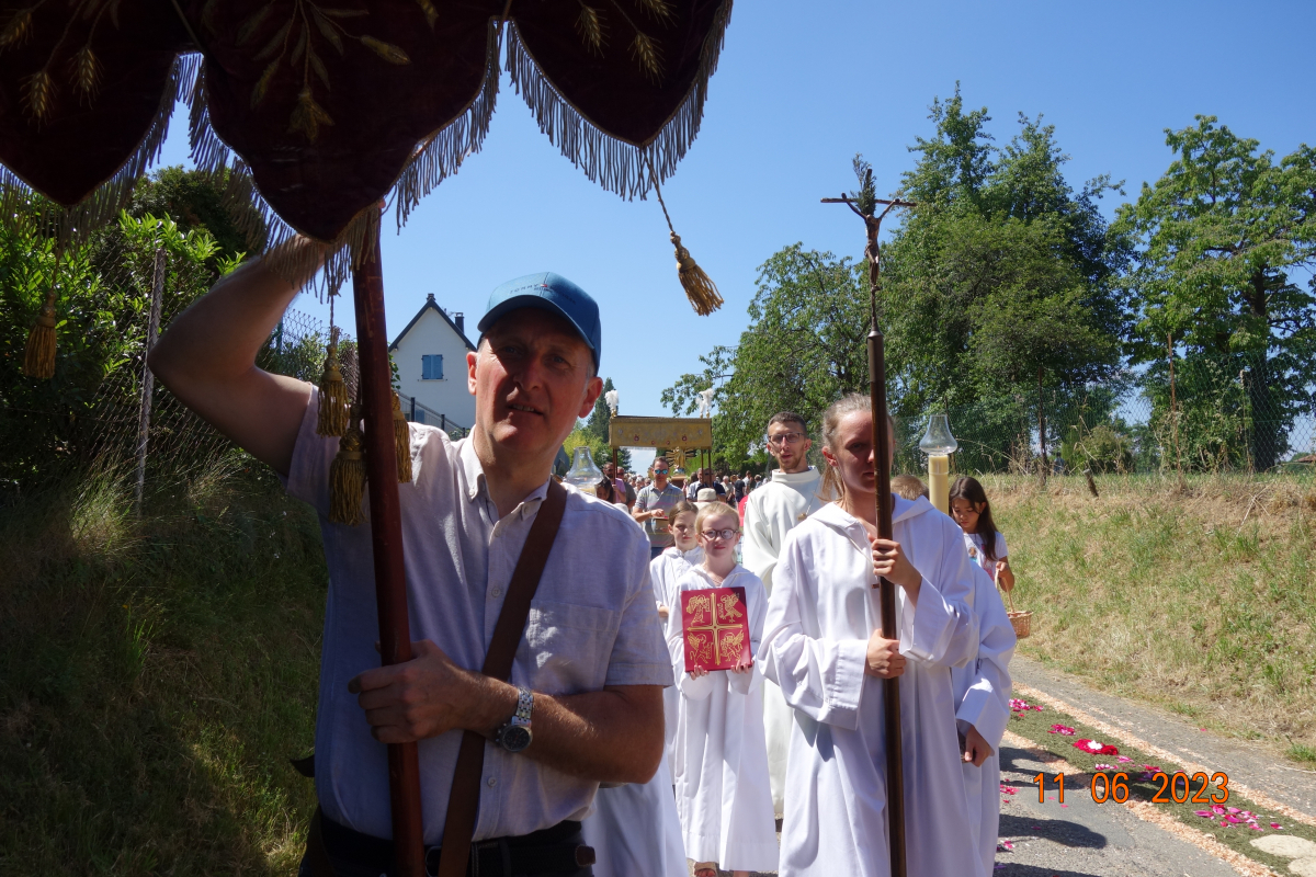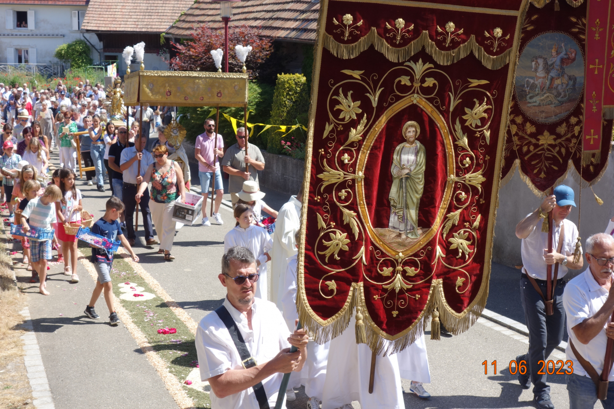 Cette année encore, à Muespach-le-Haut, un bon groupe de personnes aux mains expertes était à pied d'œuvre dès les premières lueurs du jour pour réaliser, comme à l'habitude, les magnifiques tapis de fleurs et orner les trois reposoirs pour la procession du Saint-Sacrement.