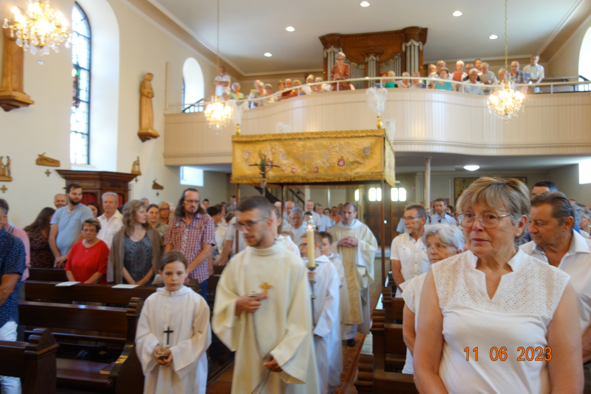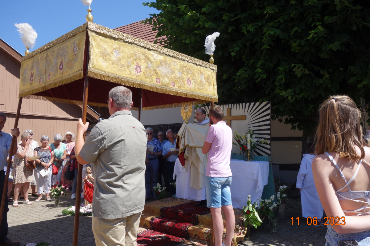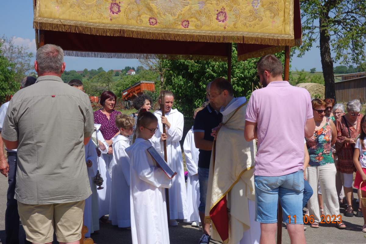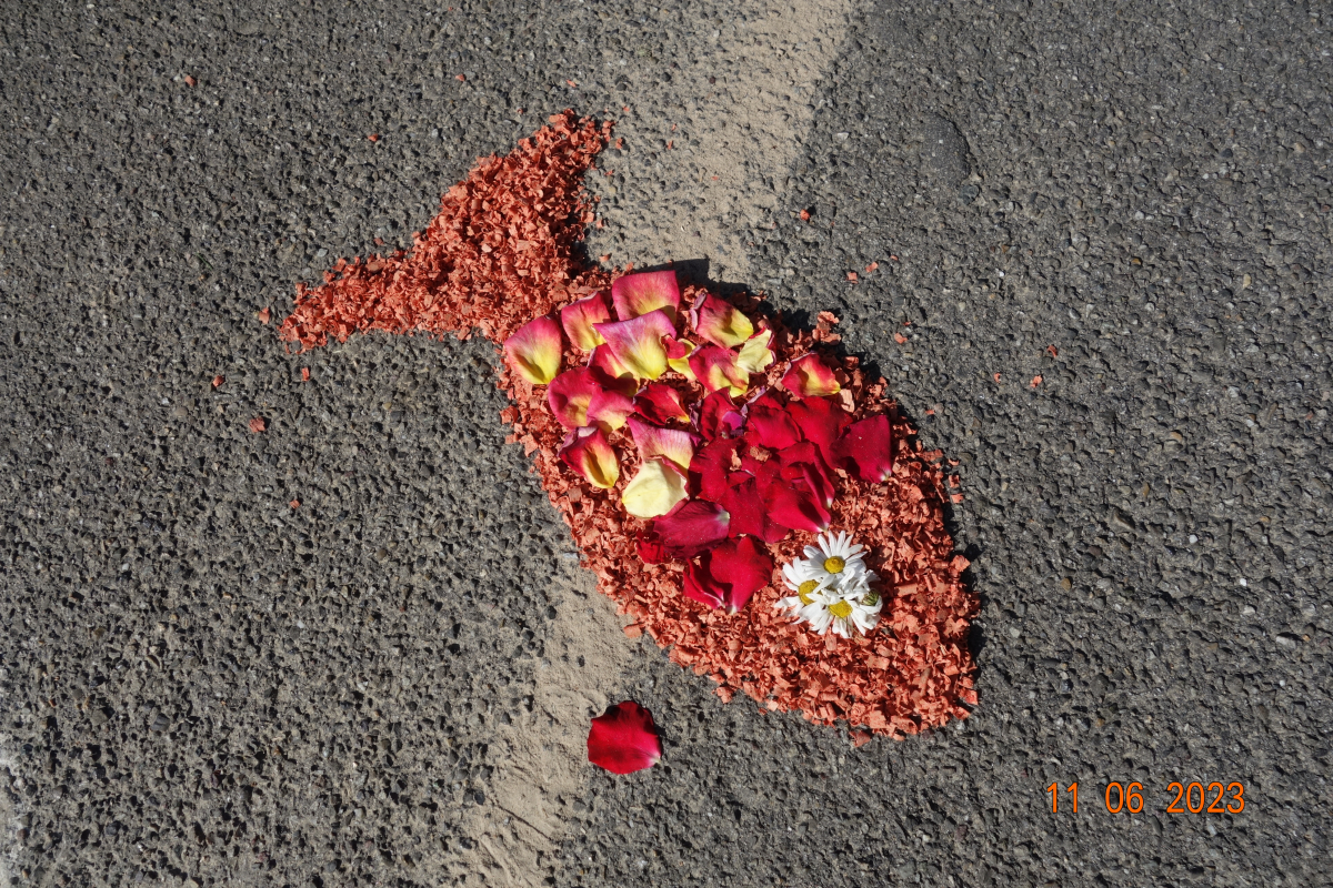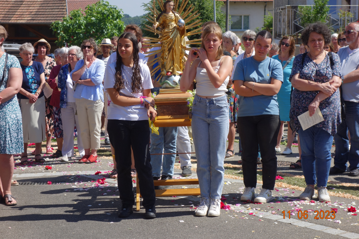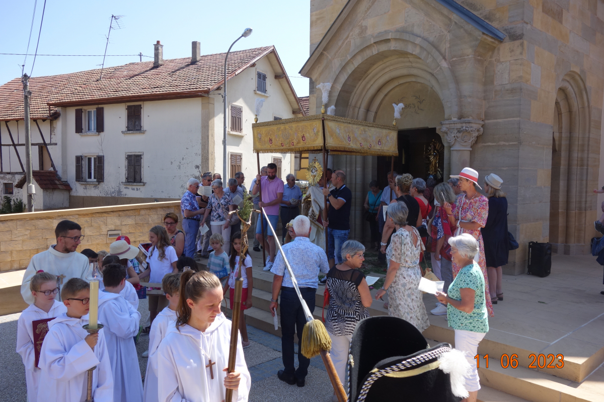Cette année encore, à Muespach-le-Haut, un bon groupe de personnes aux mains expertes était à pied d'œuvre dès les premières lueurs du jour pour réaliser, comme à l'habitude, les magnifiques tapis de fleurs et orner les trois reposoirs pour la procession du Saint-Sacrement.