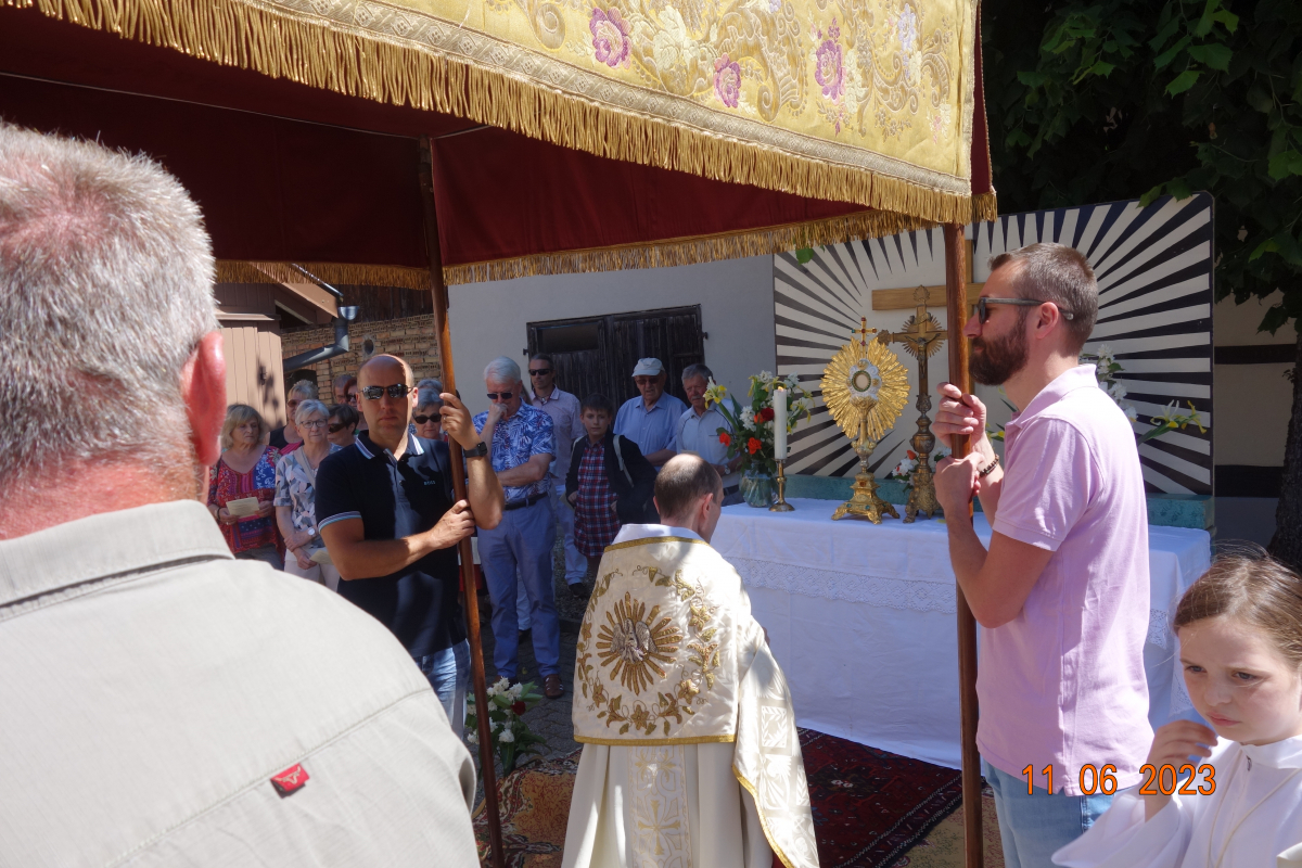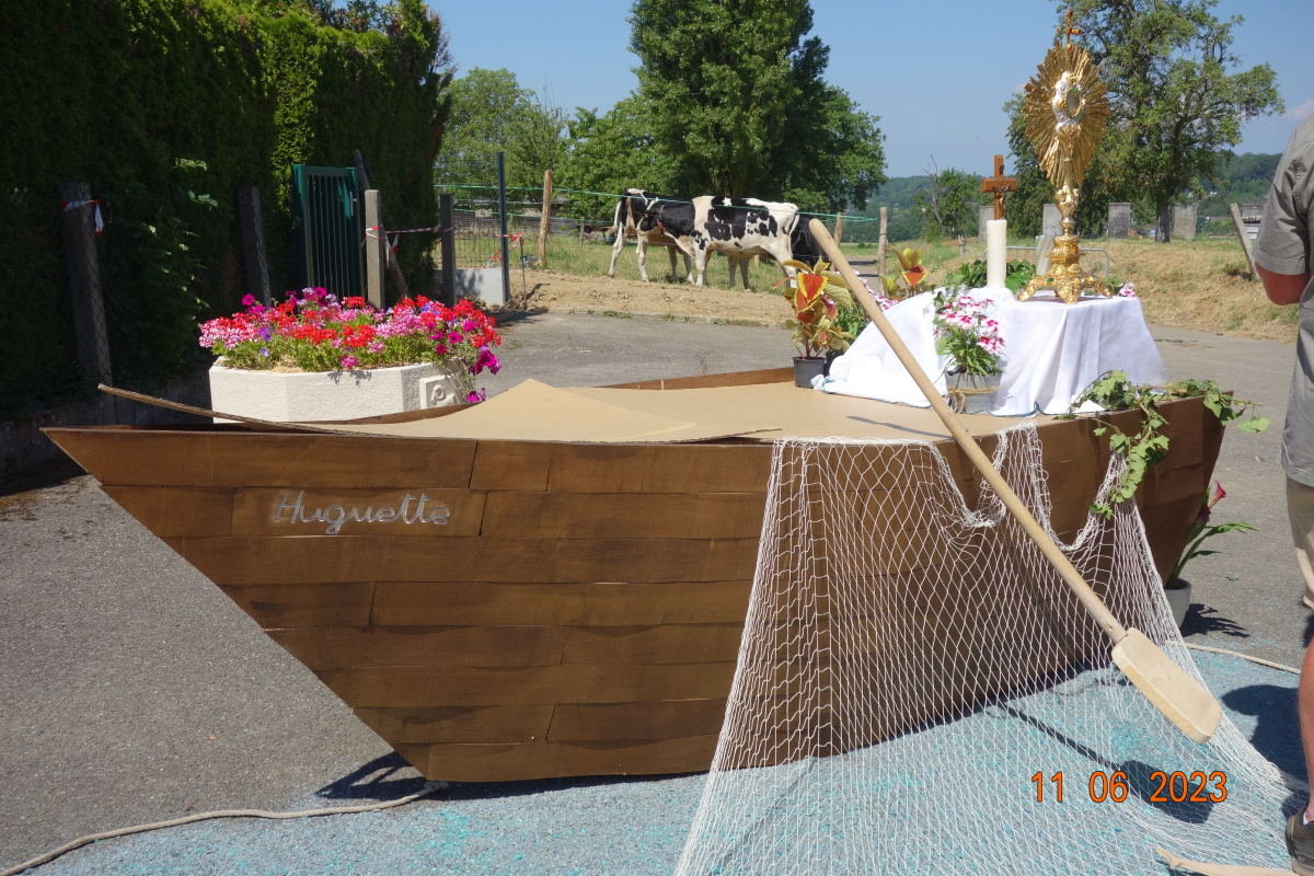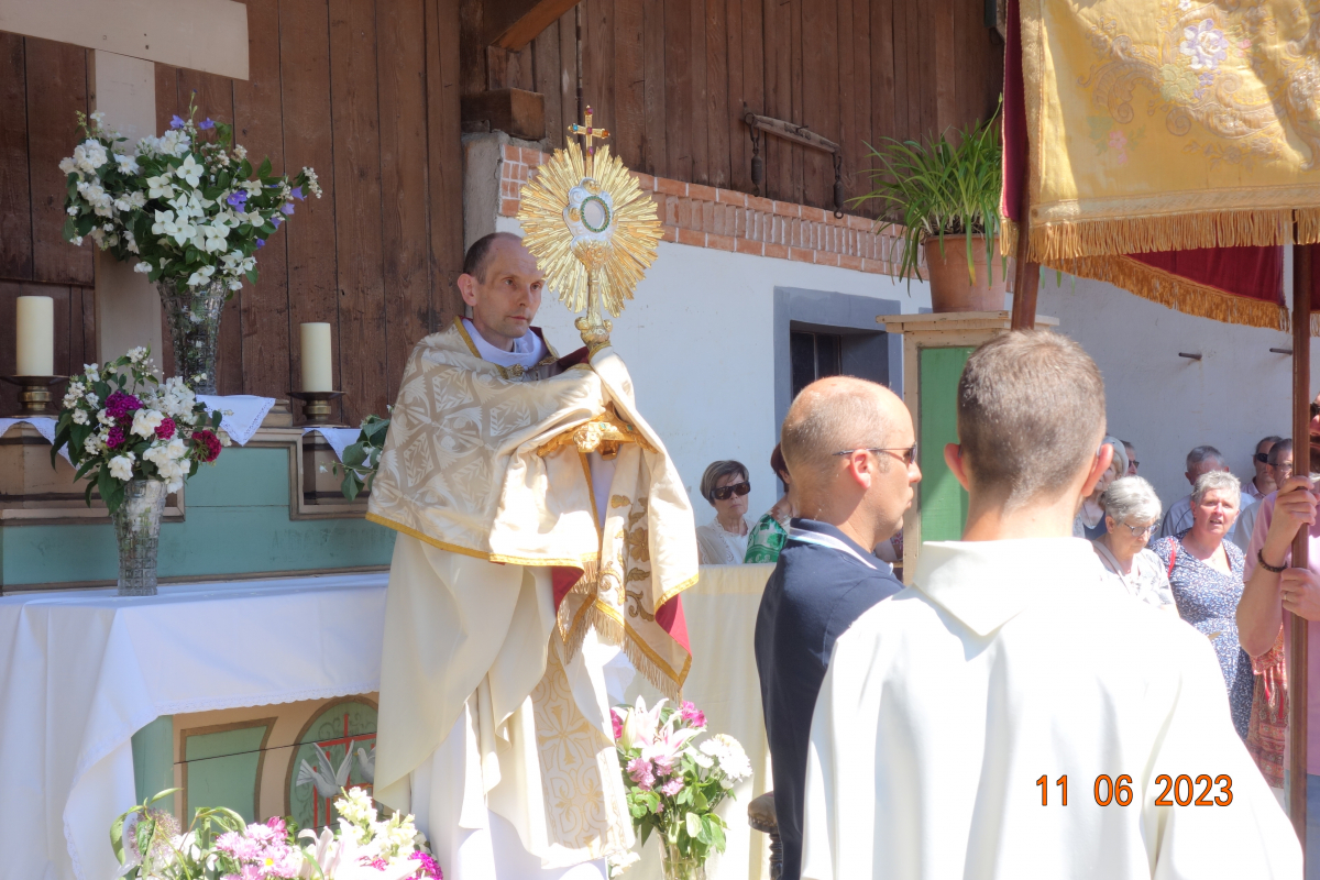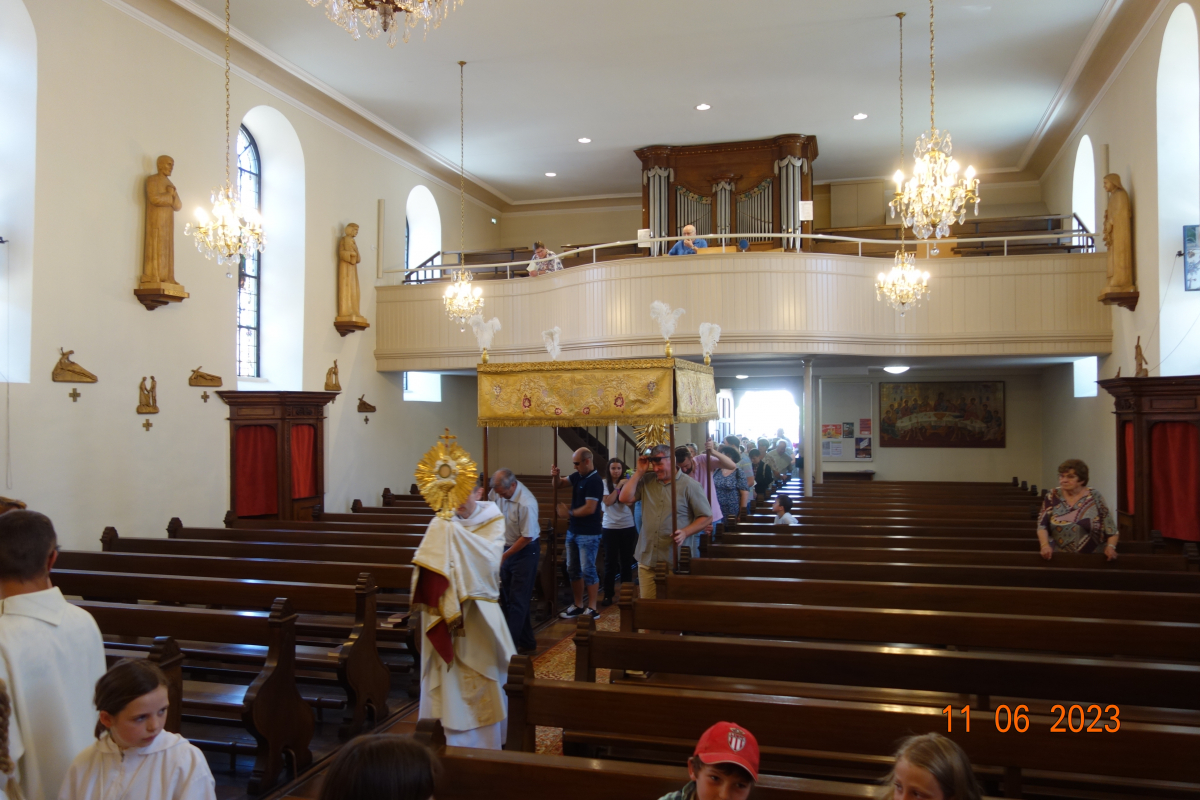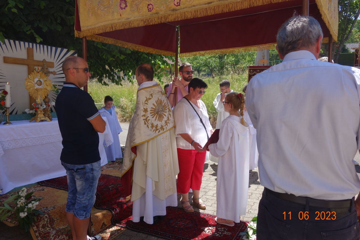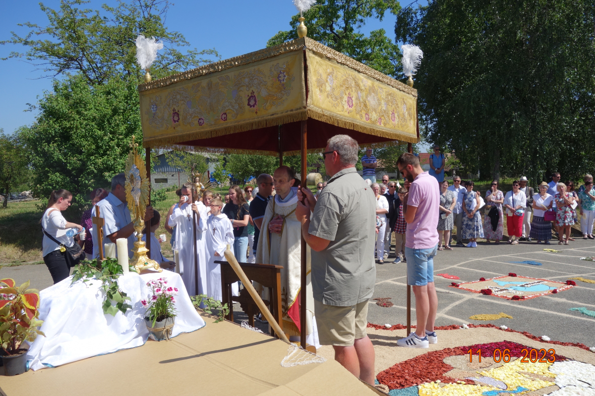 Cette année encore, à Muespach-le-Haut, un bon groupe de personnes aux mains expertes était à pied d'œuvre dès les premières lueurs du jour pour réaliser, comme à l'habitude, les magnifiques tapis de fleurs et orner les trois reposoirs pour la procession du Saint-Sacrement.