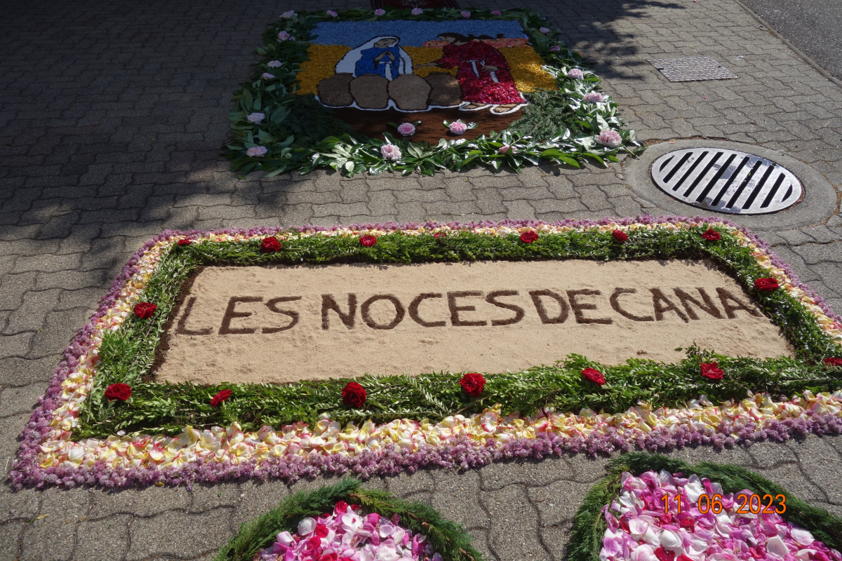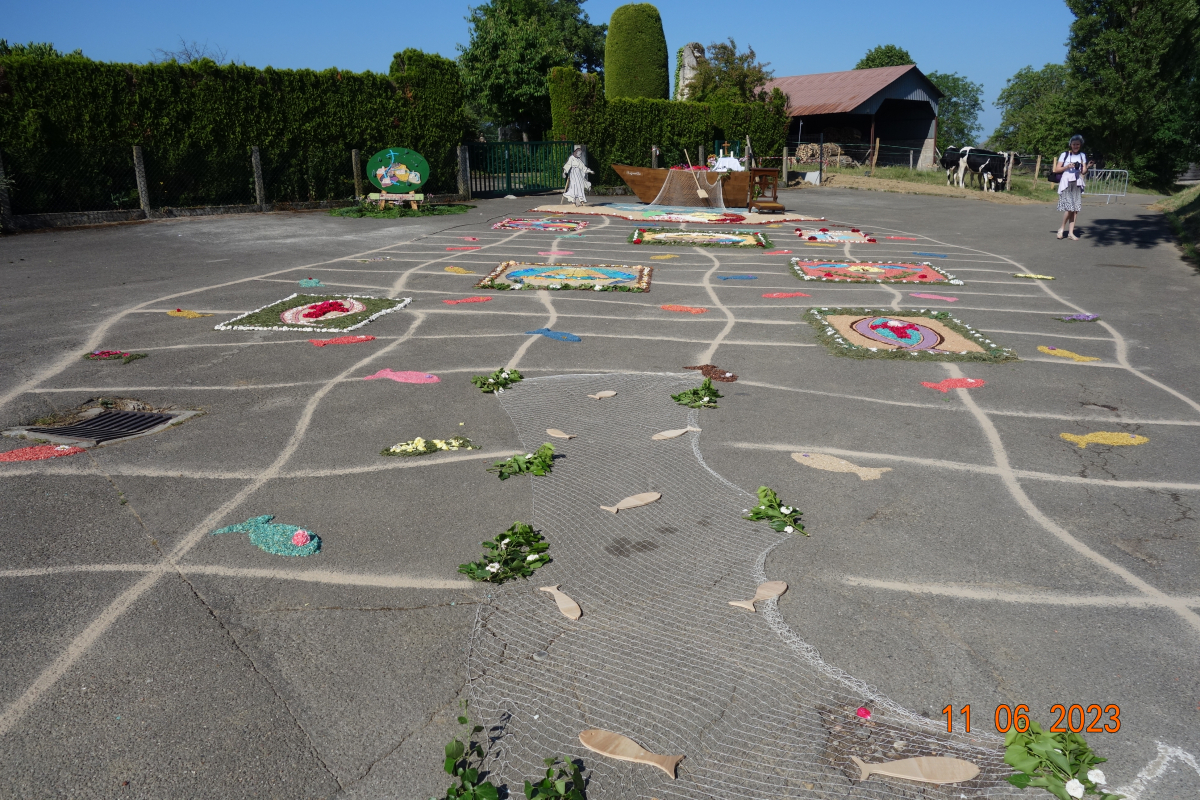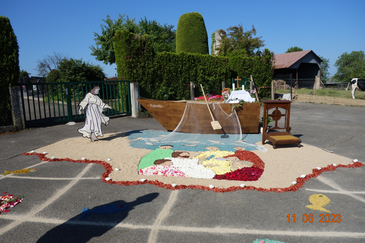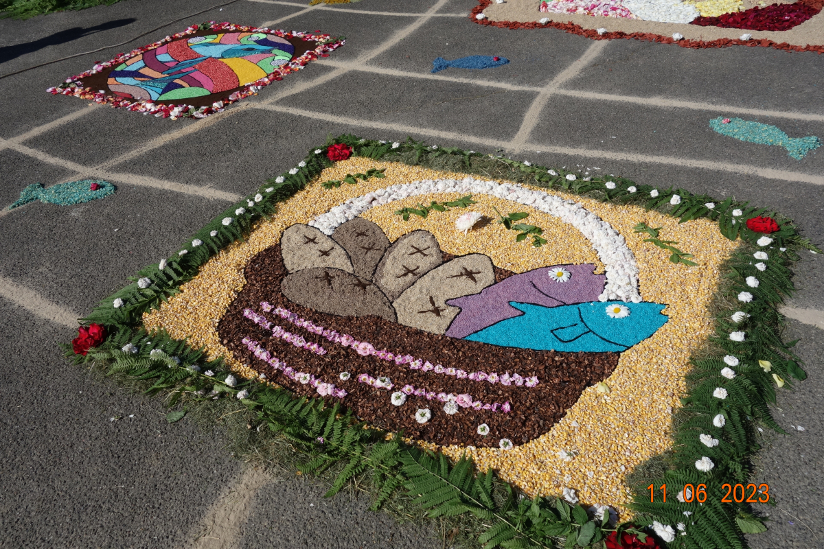 Trois passages de l'Evangile ont inspiré les tapis de fleurs : la multiplication des pains, la pêche miraculeuse et les noces de Cana.