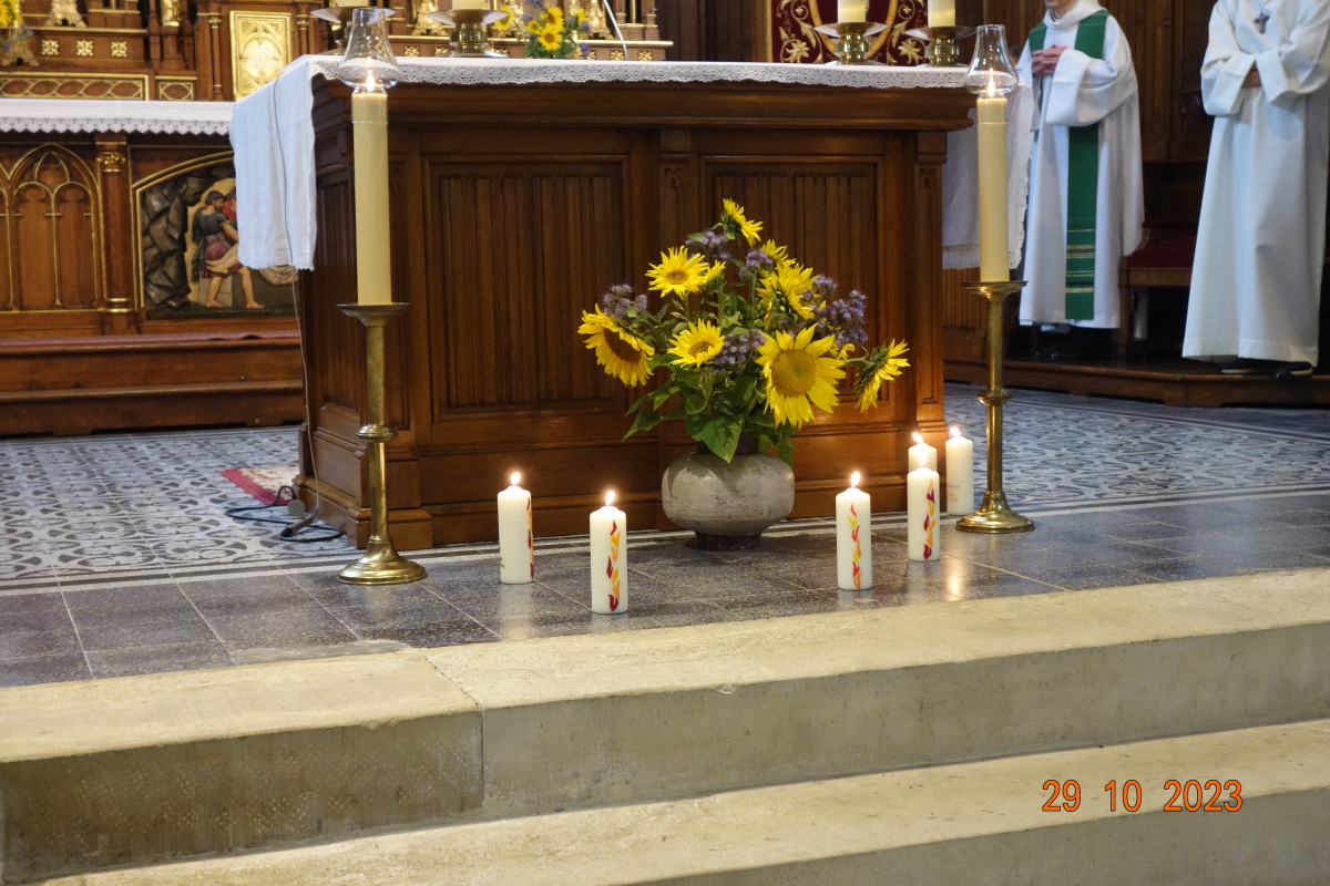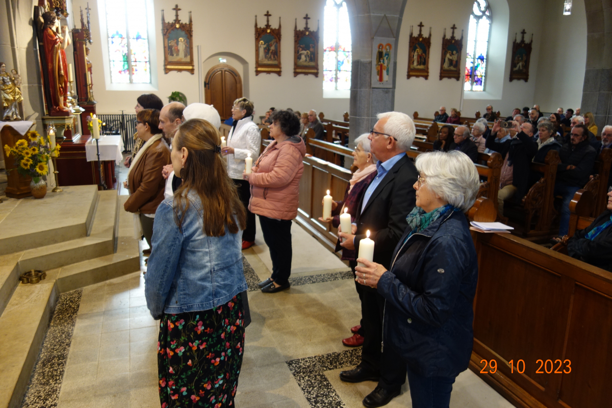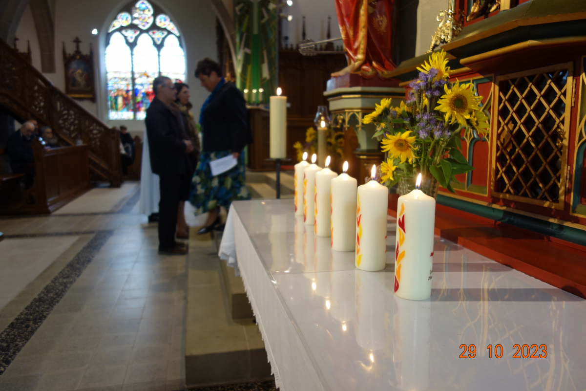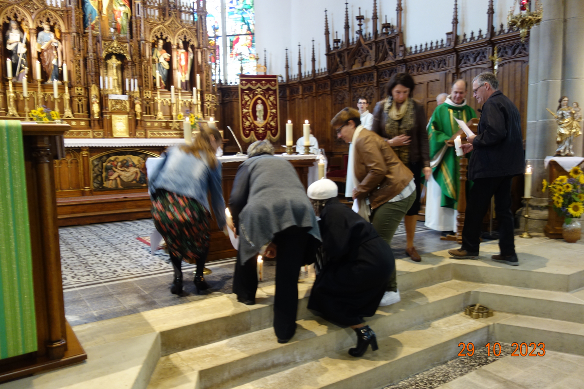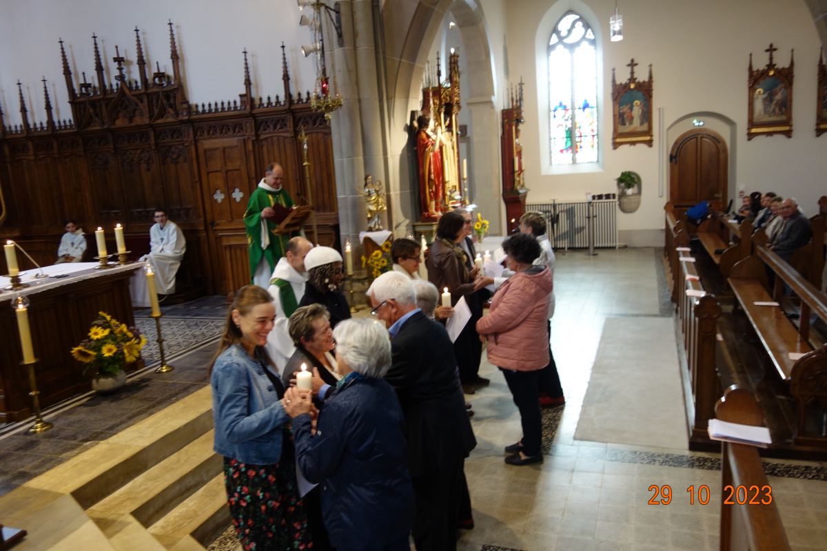 Les cinq membres qui constituaient l’équipe depuis la naissance de la communauté de paroisses ont été vivement remerciés de leur long engagement au service de tous. Pour signifier qu’ils passaient à présent le flambeau à d’autres, ils ont remis aux nouveaux membres un cierge allumé.