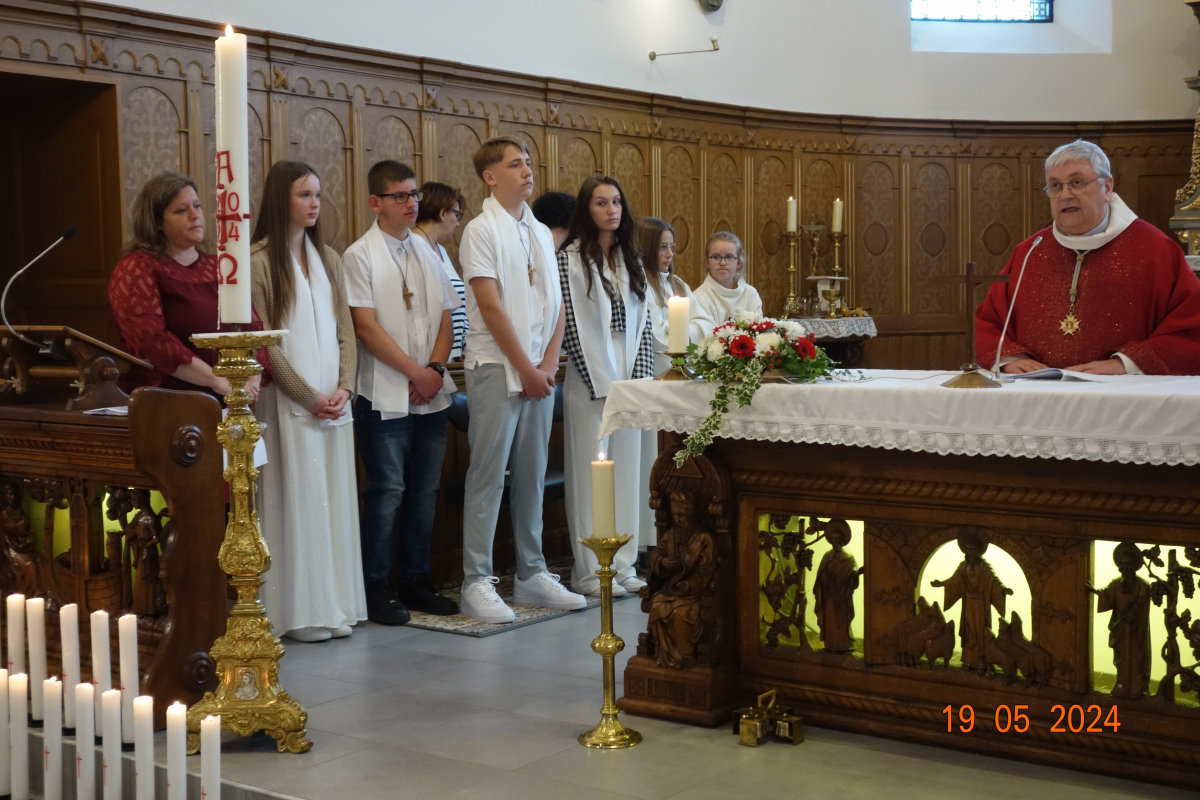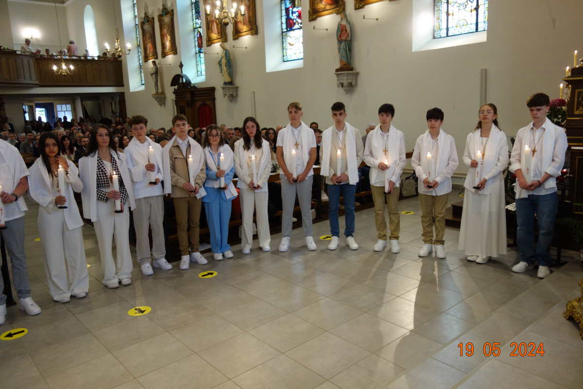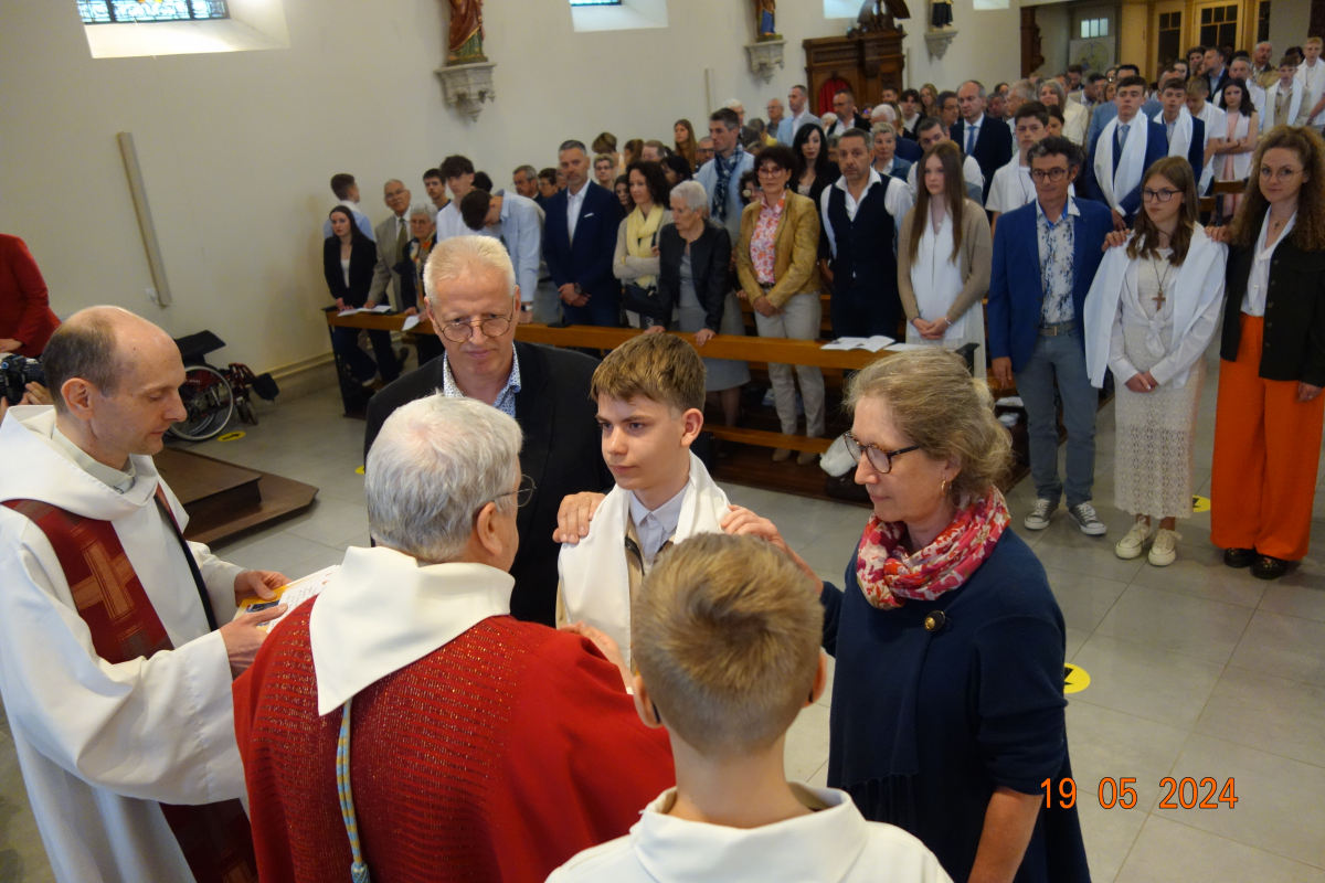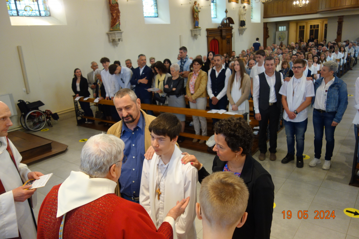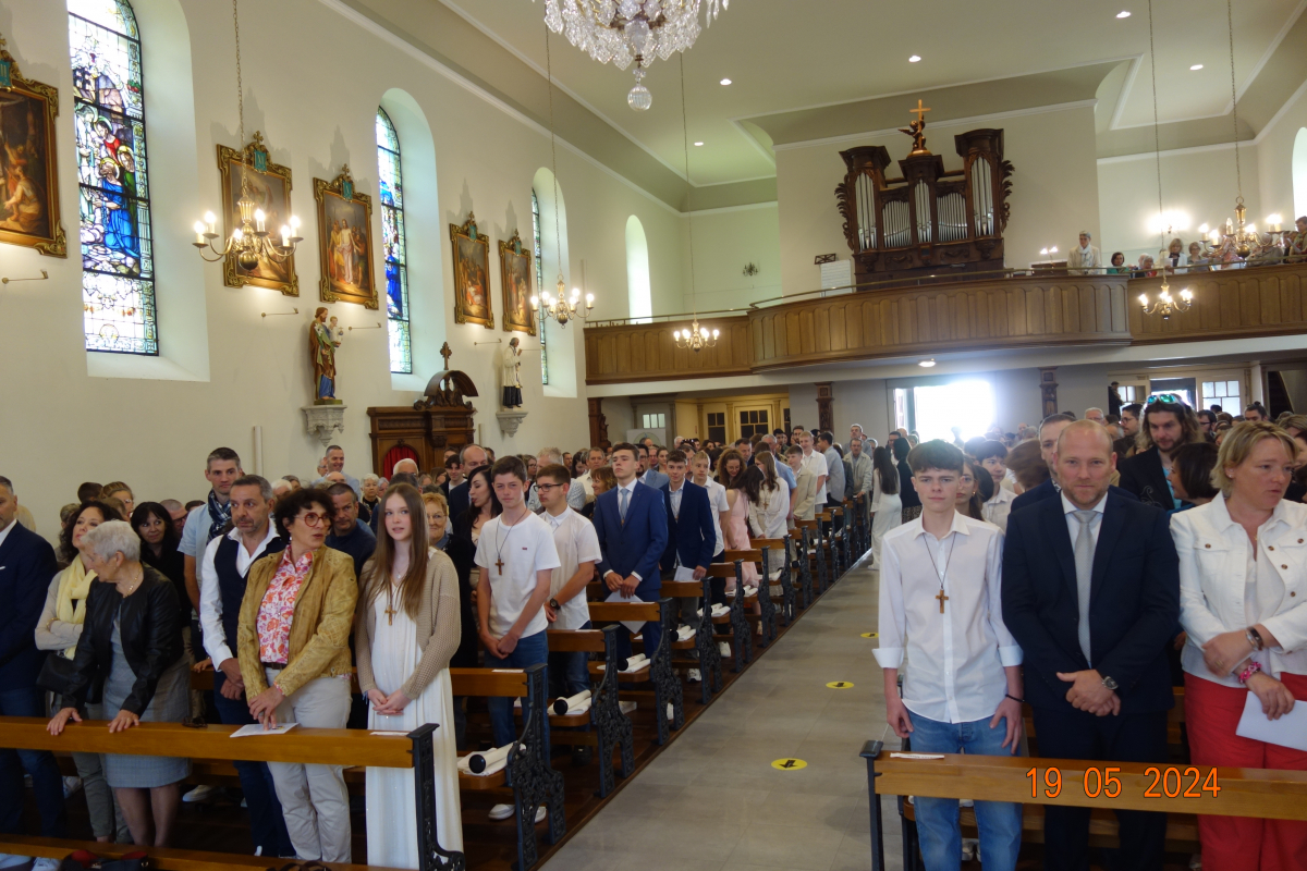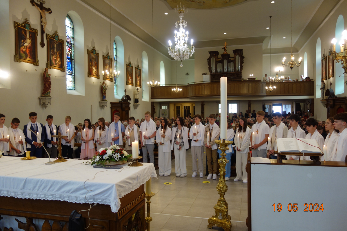 Après deux belles années de cheminement, 23 jeunes ont fait leur profession de foi et ont été confirmés, le dimanche de la Pentecôte, 19 mai 2024, par le Chanoine Hubert Schmitt.
