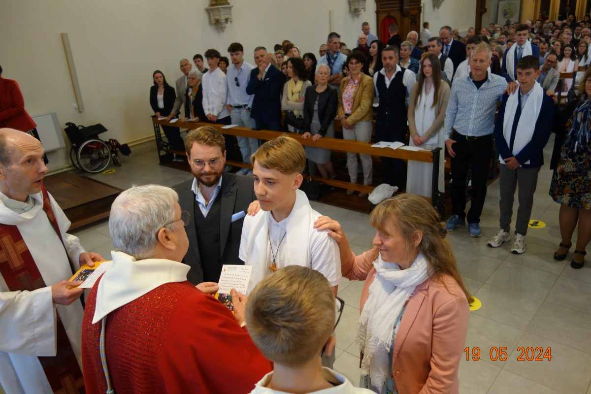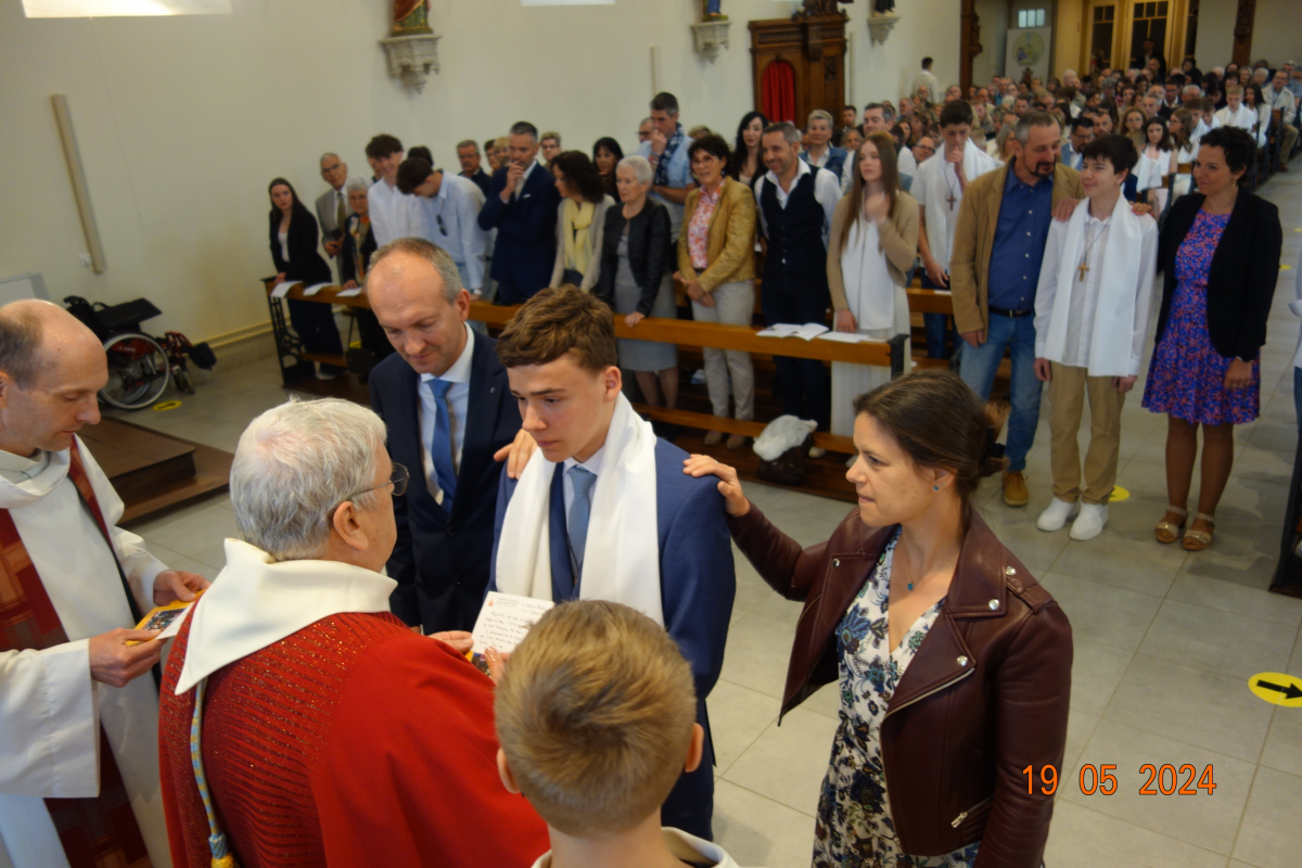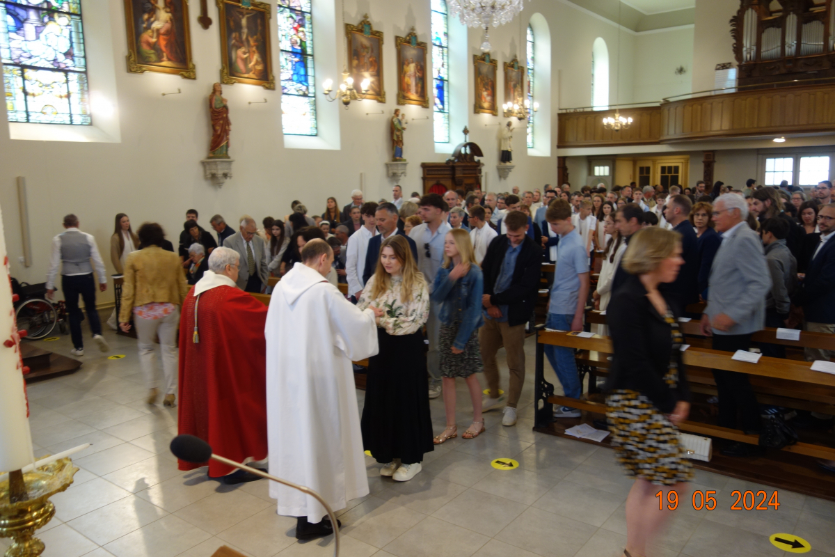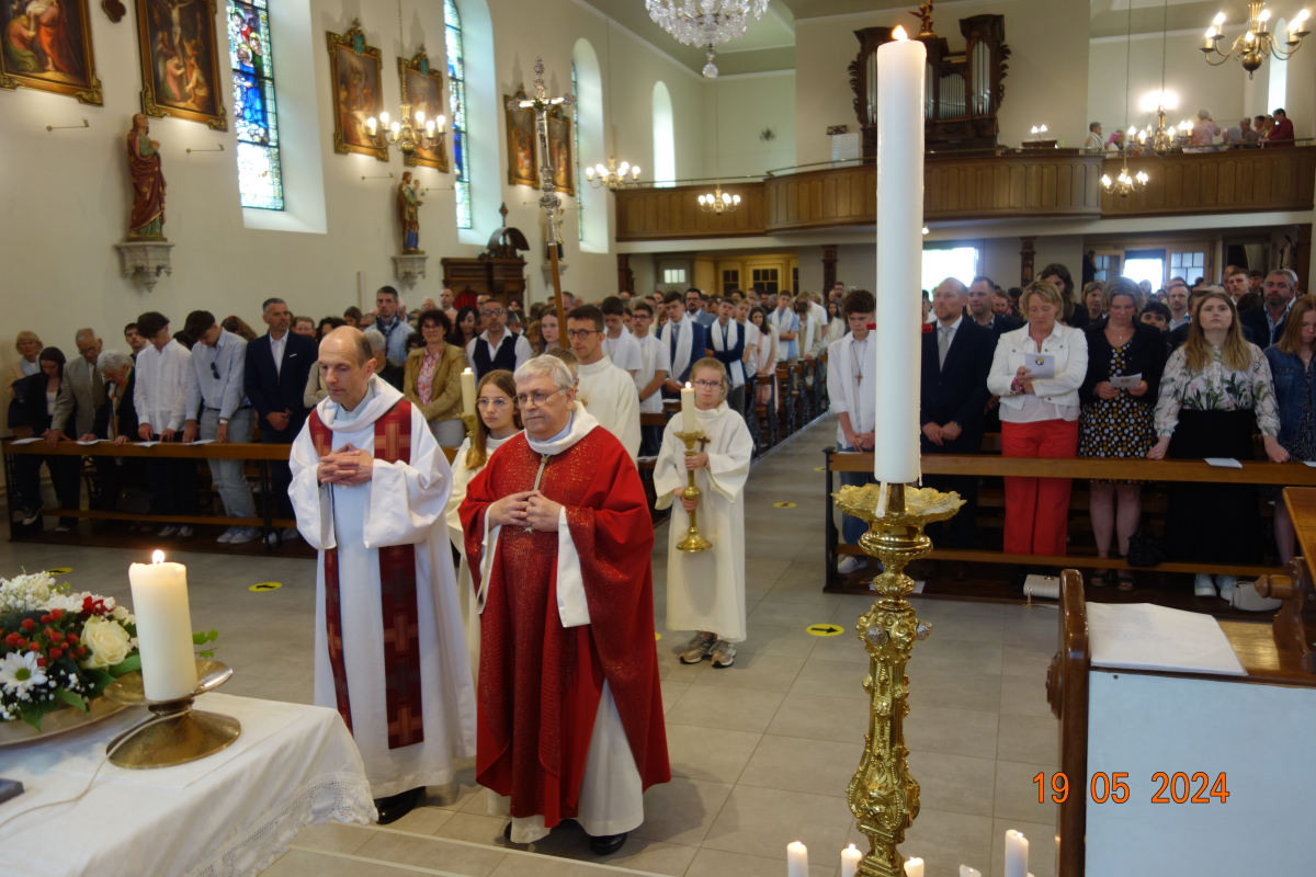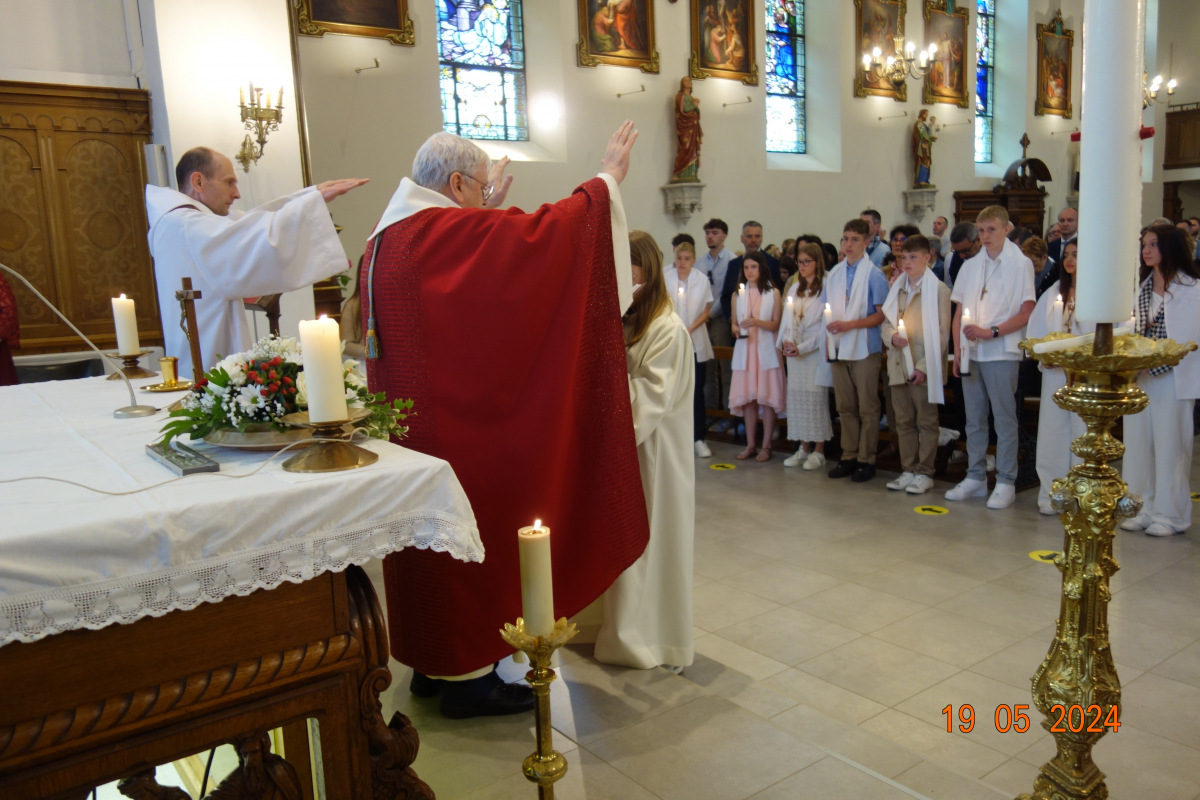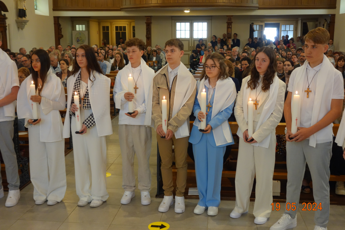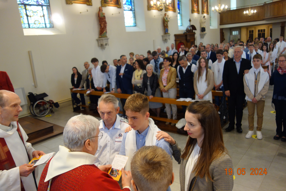 Après deux belles années de cheminement, 23 jeunes ont fait leur profession de foi et ont été confirmés, le dimanche de la Pentecôte, 19 mai 2024, par le Chanoine Hubert Schmitt.