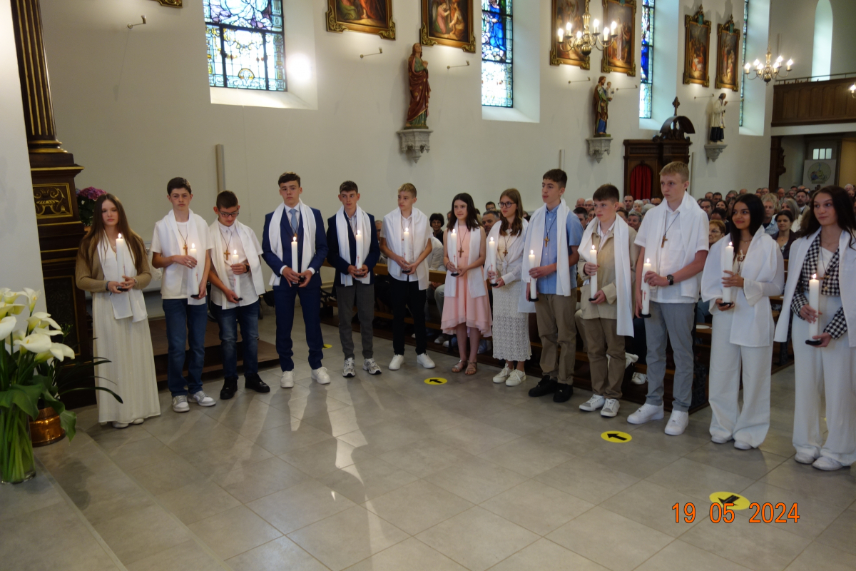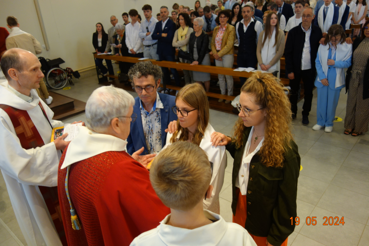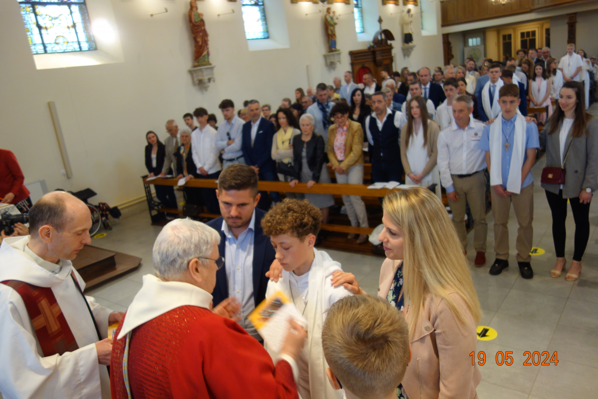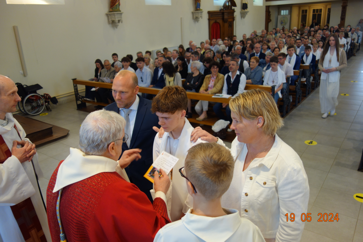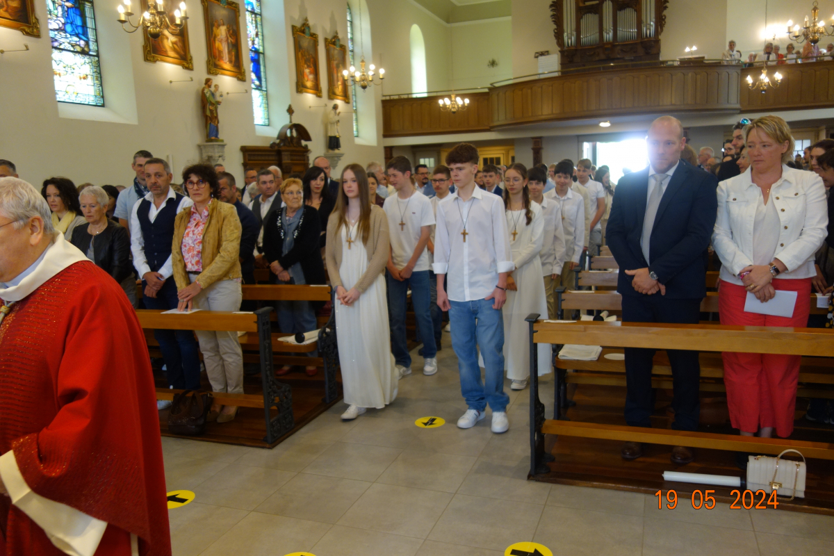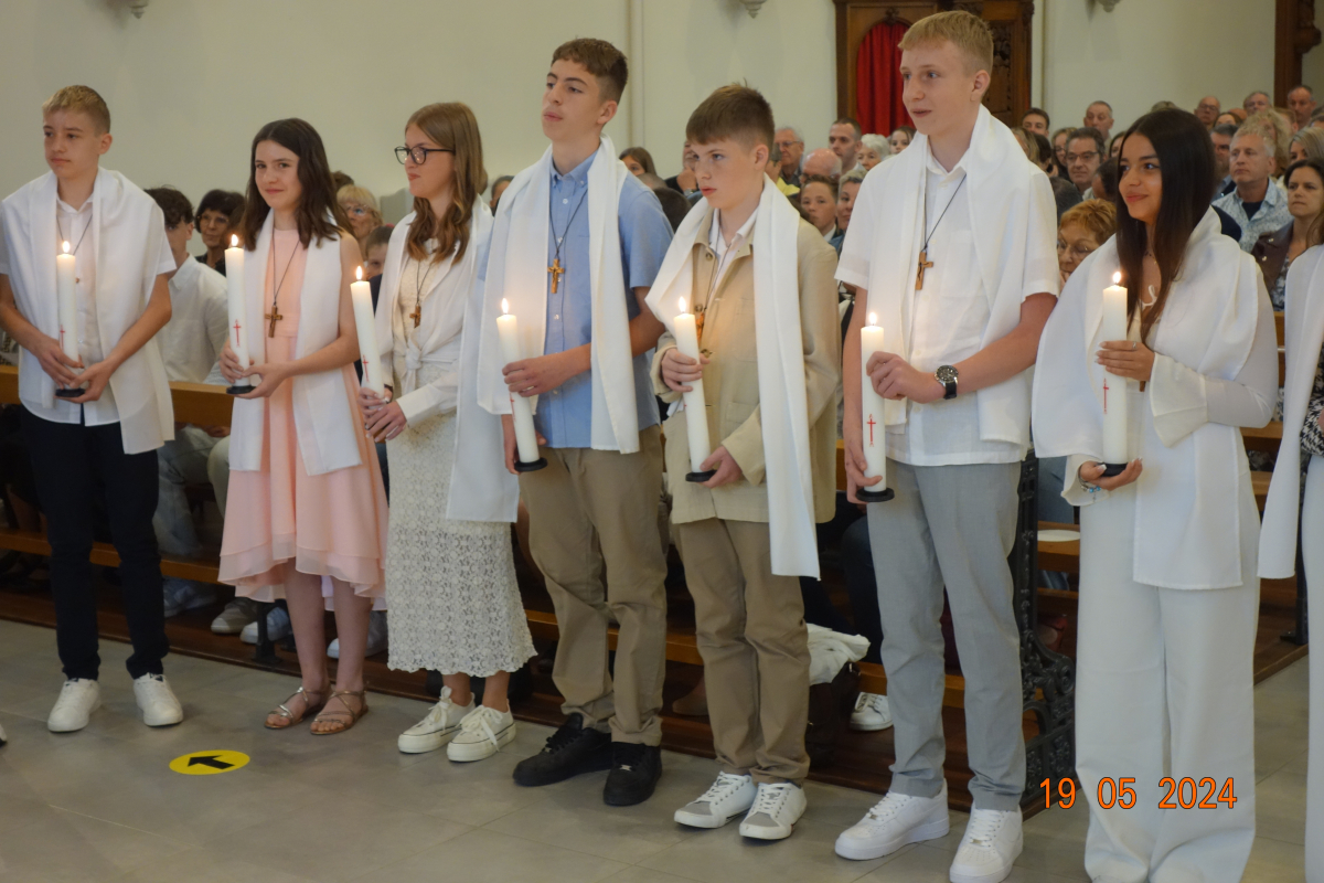 Après deux belles années de cheminement, 23 jeunes ont fait leur profession de foi et ont été confirmés, le dimanche de la Pentecôte, 19 mai 2024, par le Chanoine Hubert Schmitt.