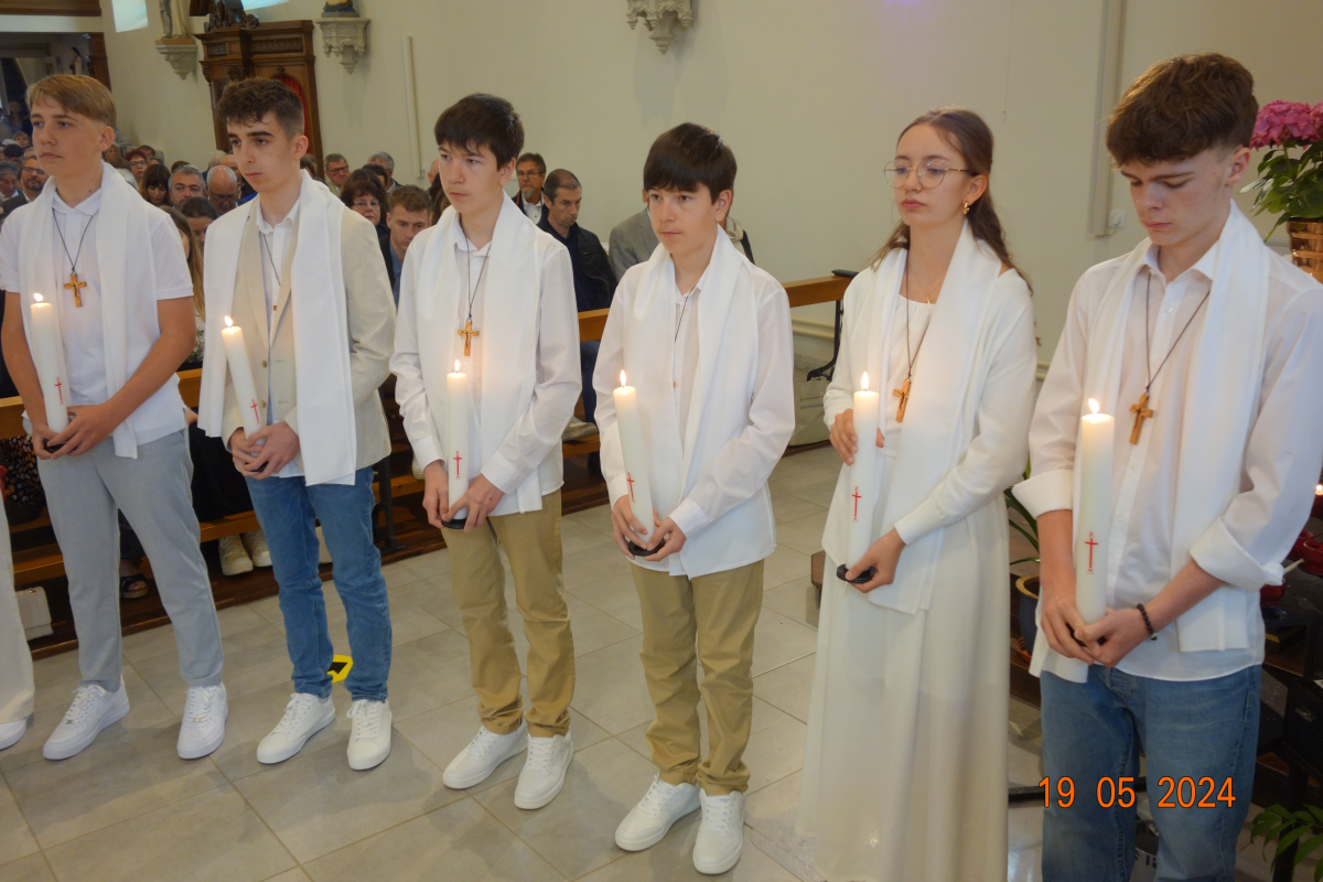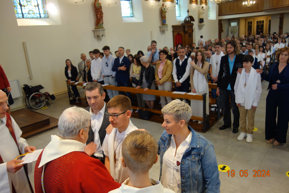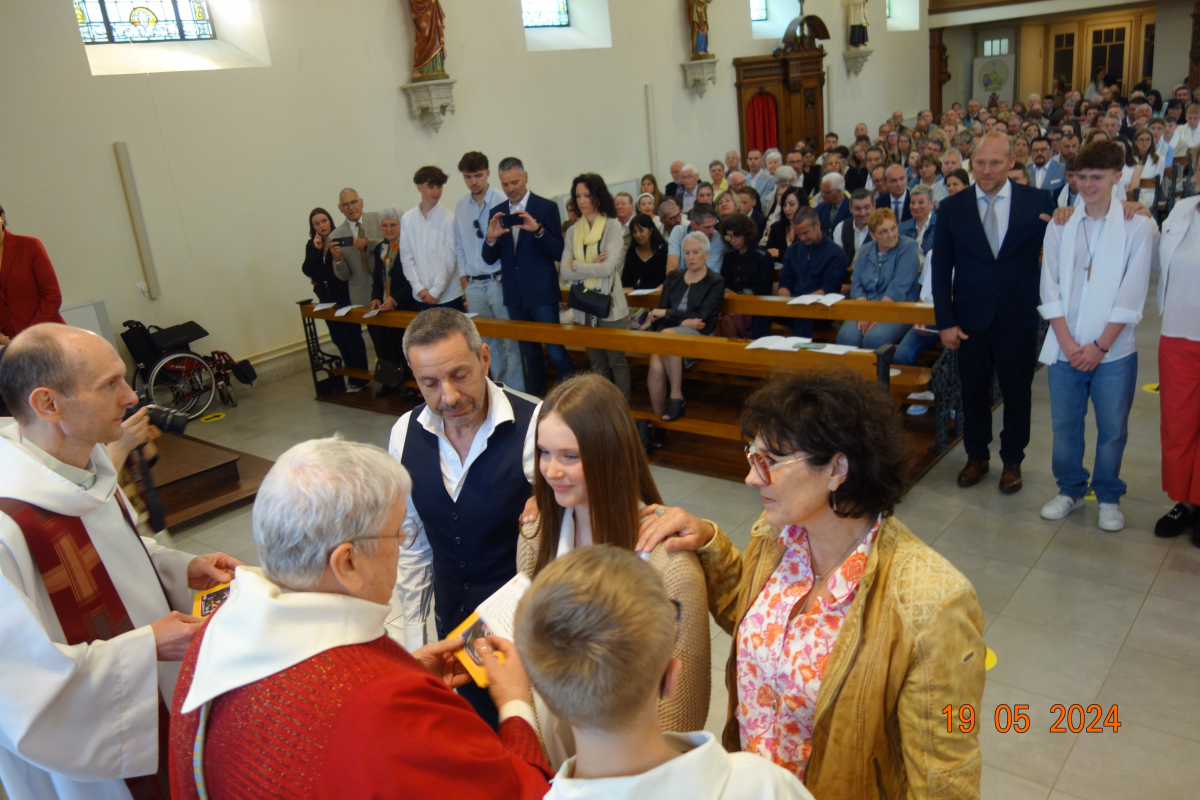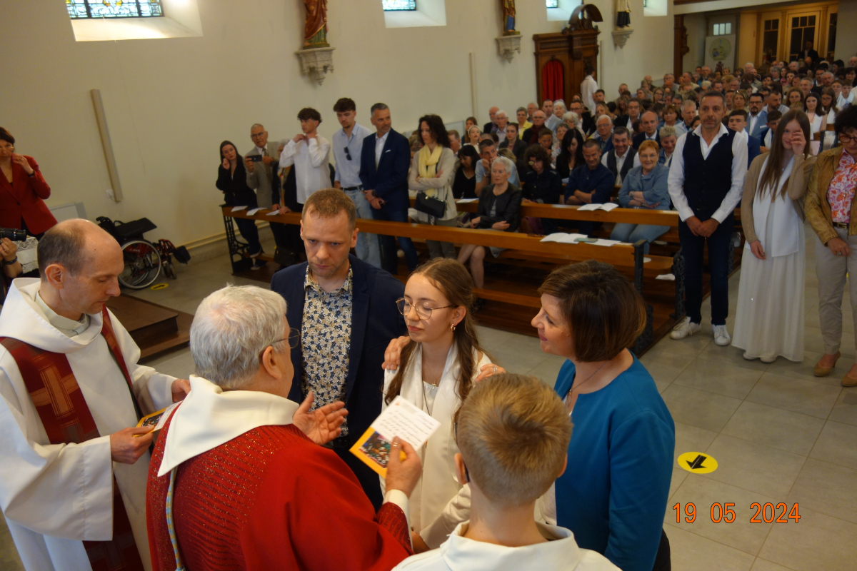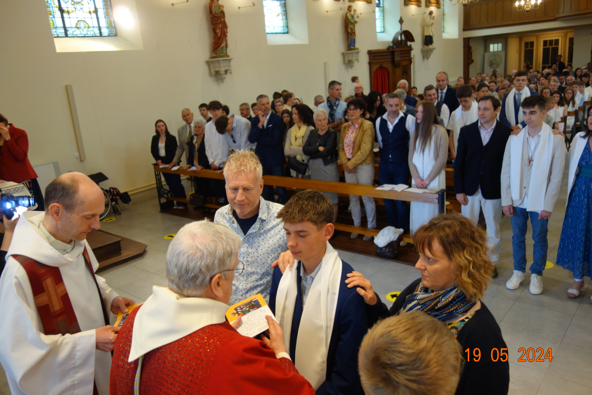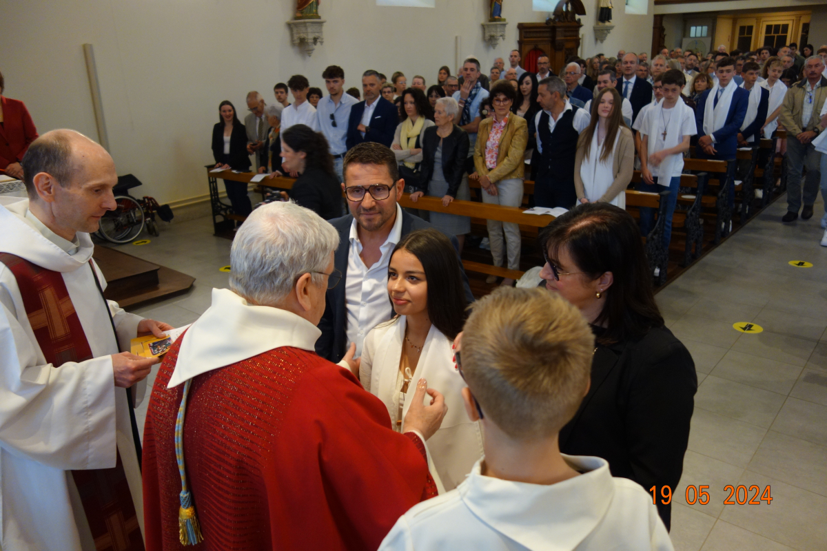 Après deux belles années de cheminement, 23 jeunes ont fait leur profession de foi et ont été confirmés, le dimanche de la Pentecôte, 19 mai 2024, par le Chanoine Hubert Schmitt.