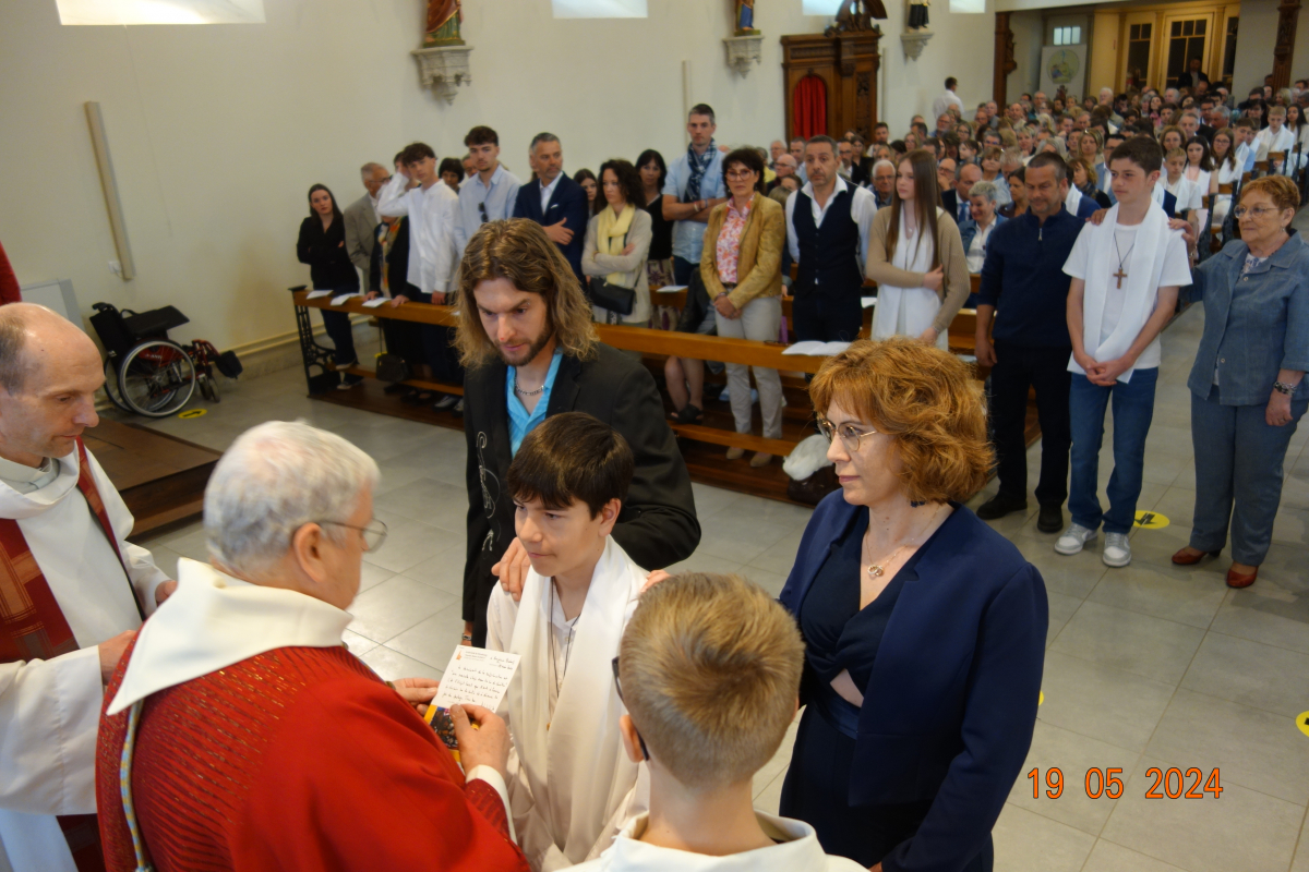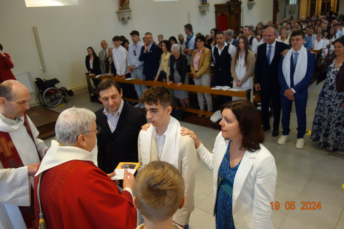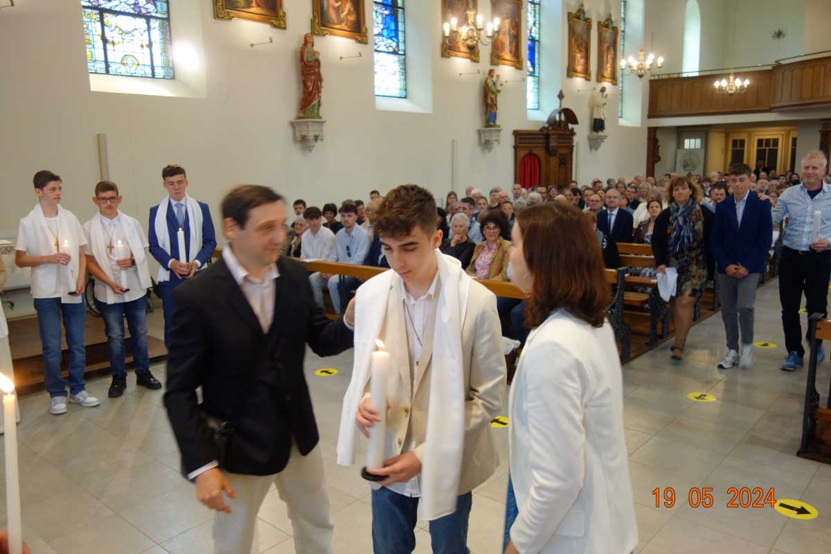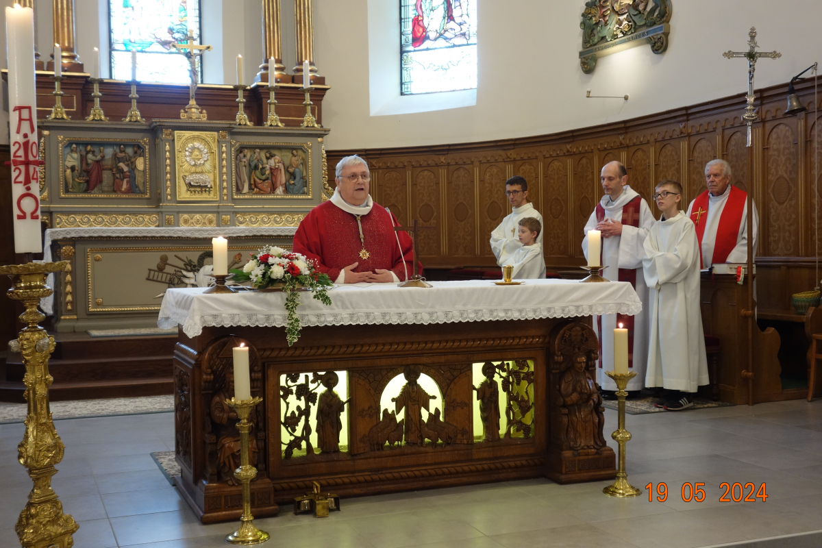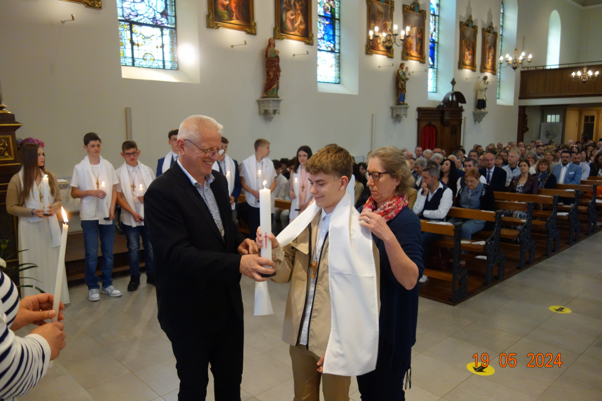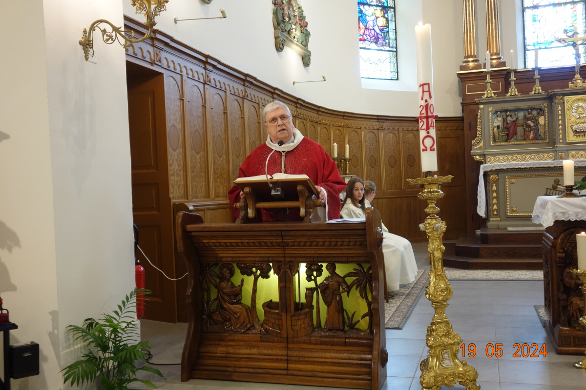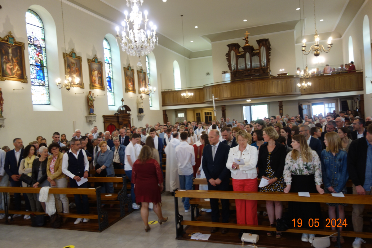 Après deux belles années de cheminement, 23 jeunes ont fait leur profession de foi et ont été confirmés, le dimanche de la Pentecôte, 19 mai 2024, par le Chanoine Hubert Schmitt.