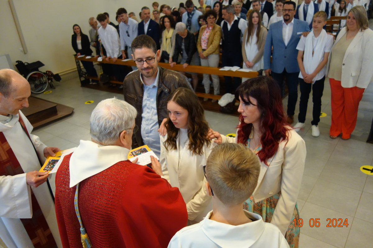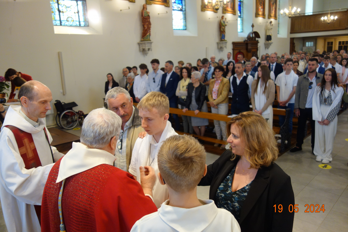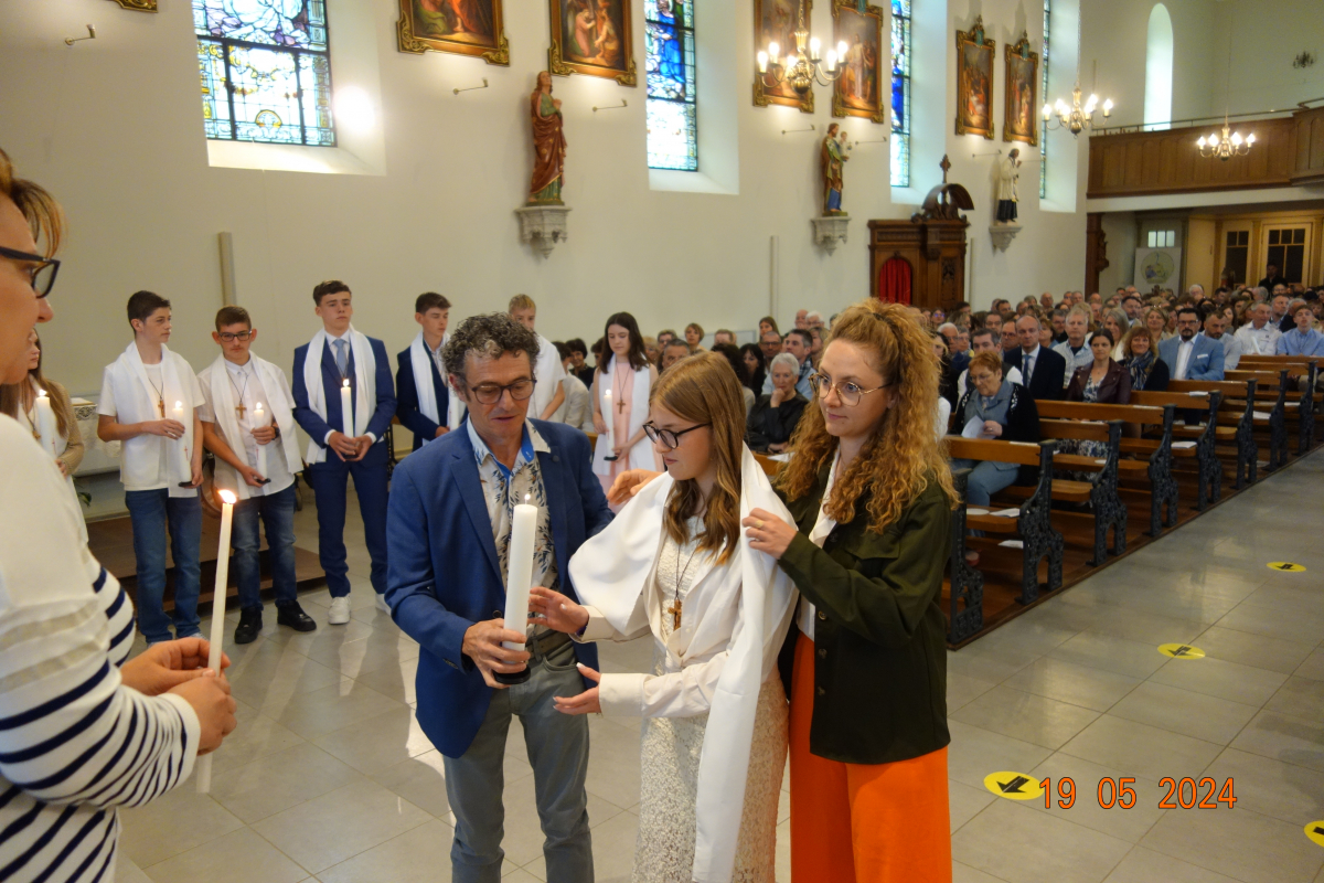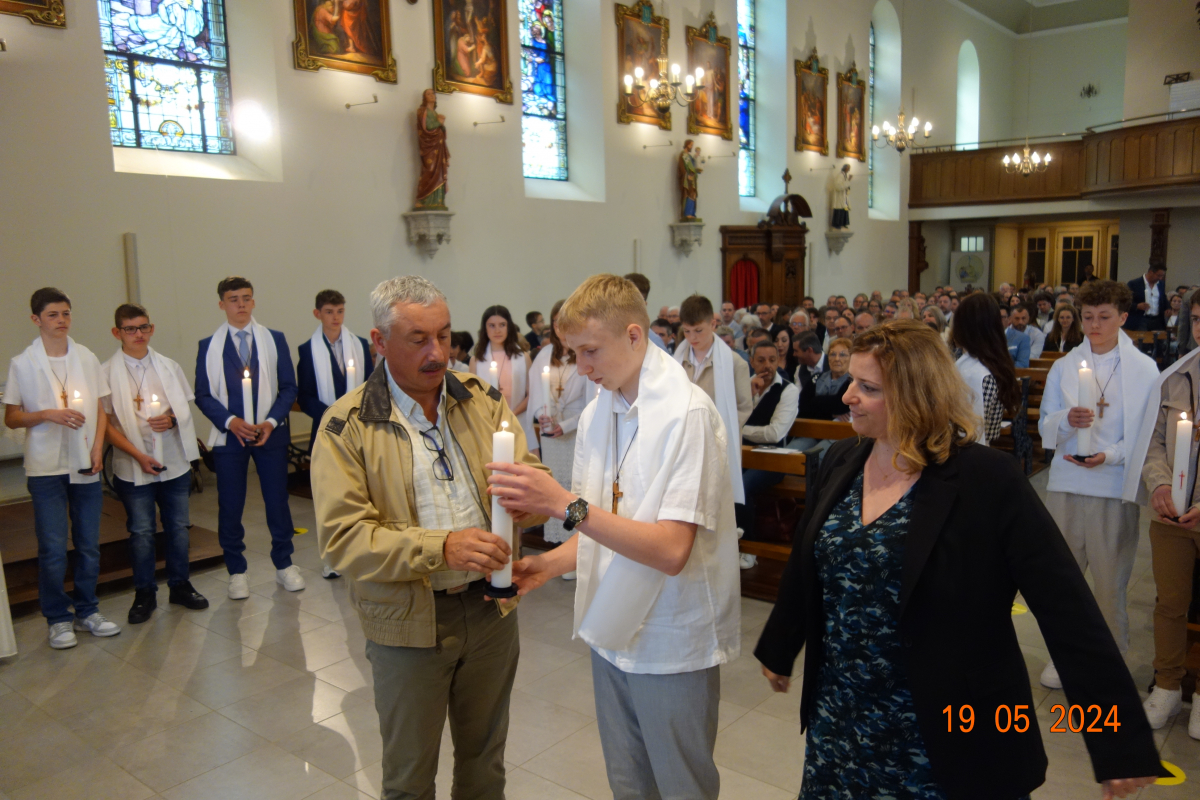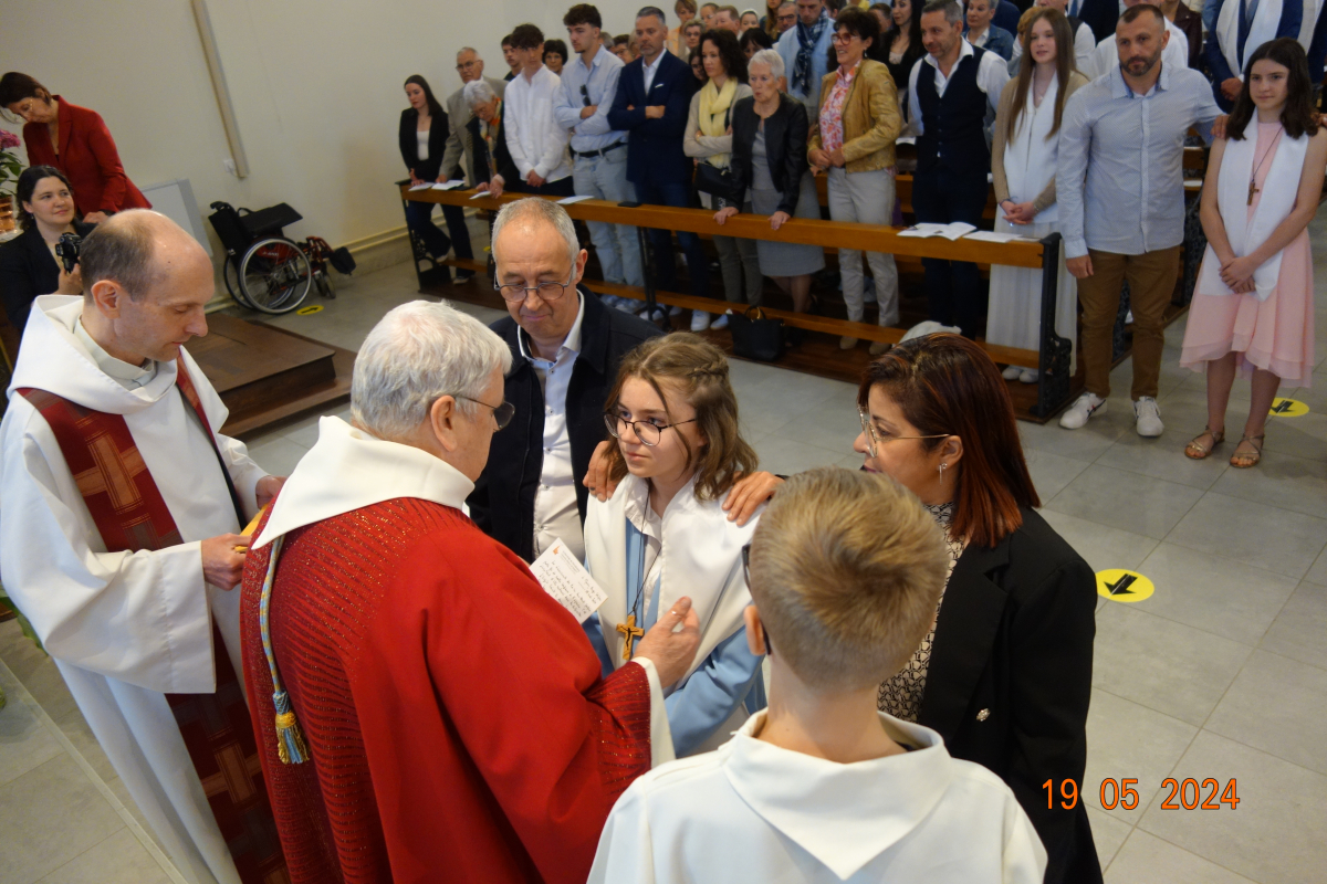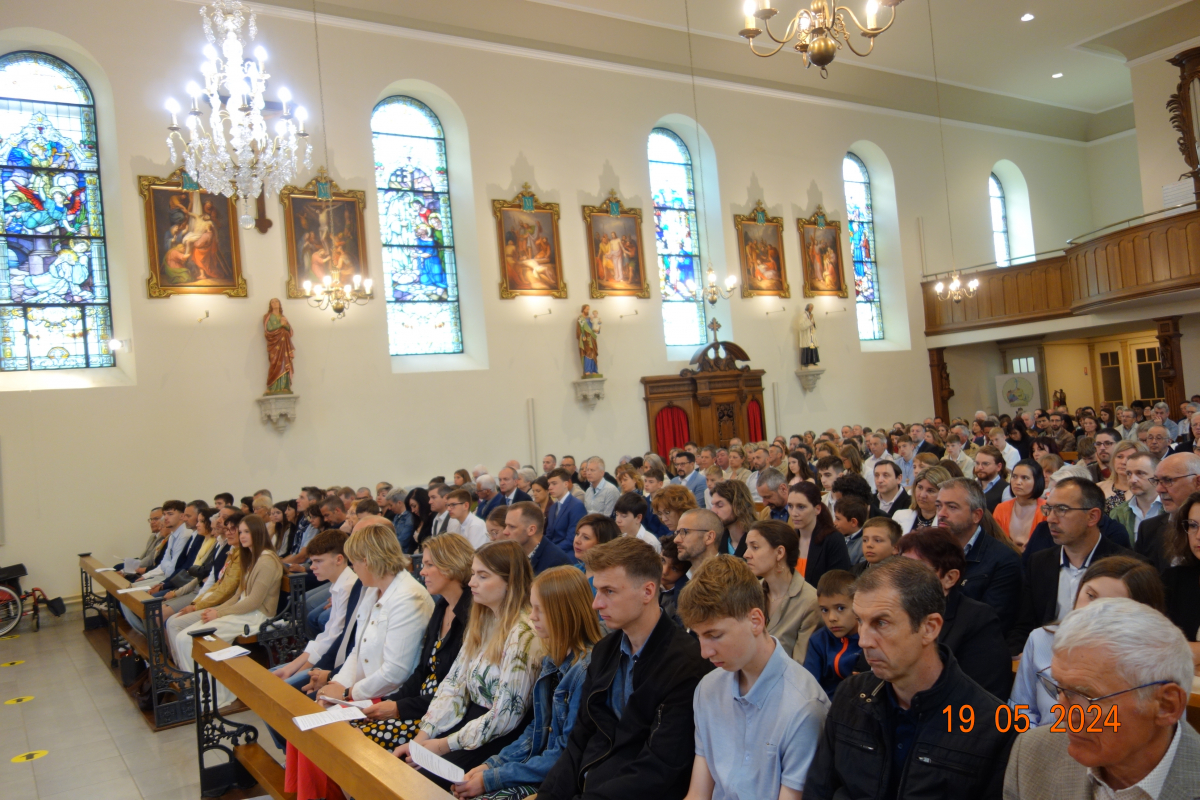 Après deux belles années de cheminement, 23 jeunes ont fait leur profession de foi et ont été confirmés, le dimanche de la Pentecôte, 19 mai 2024, par le Chanoine Hubert Schmitt.