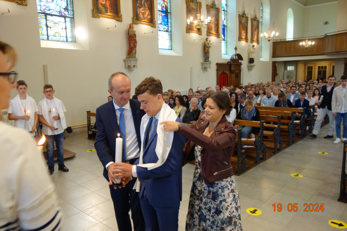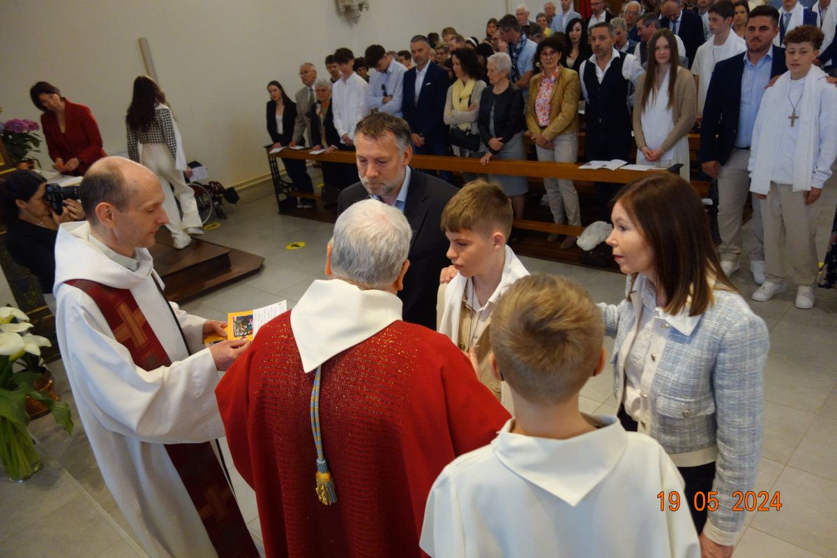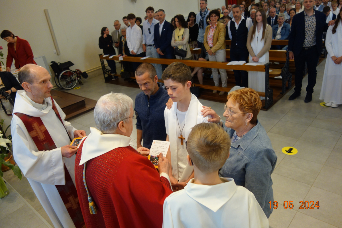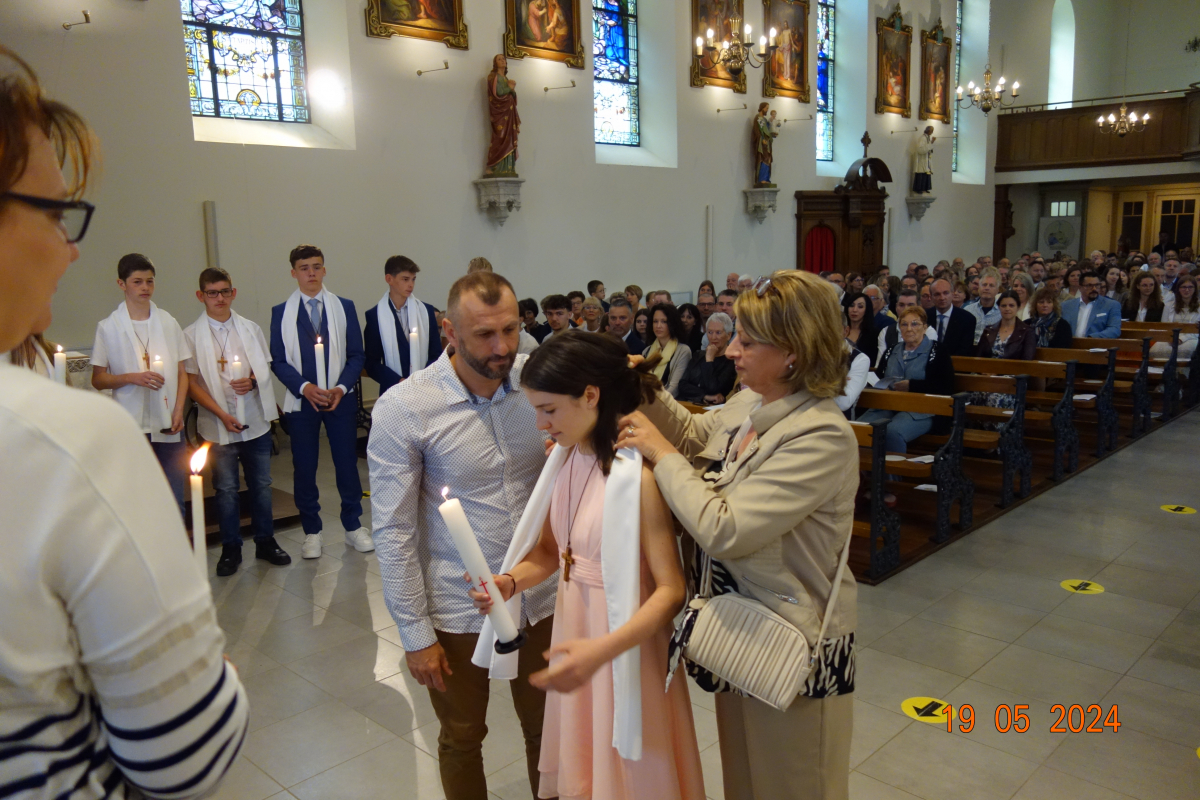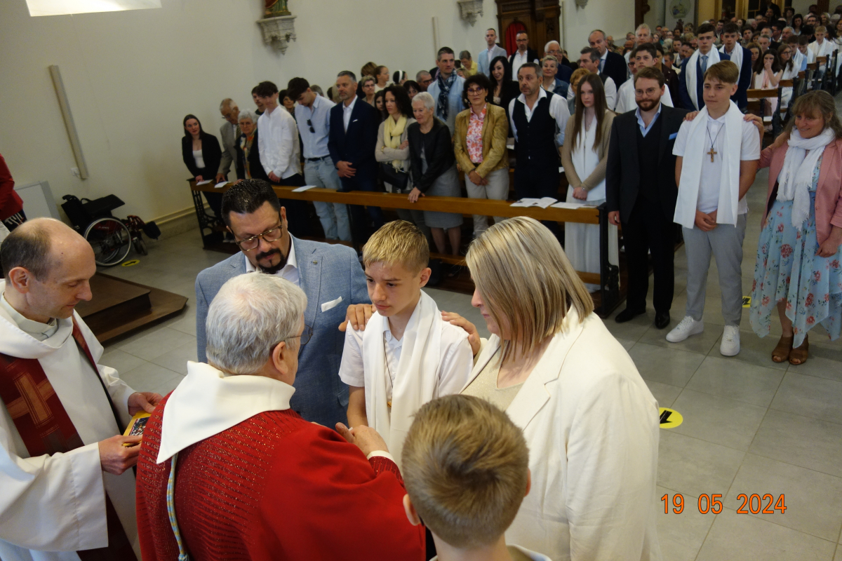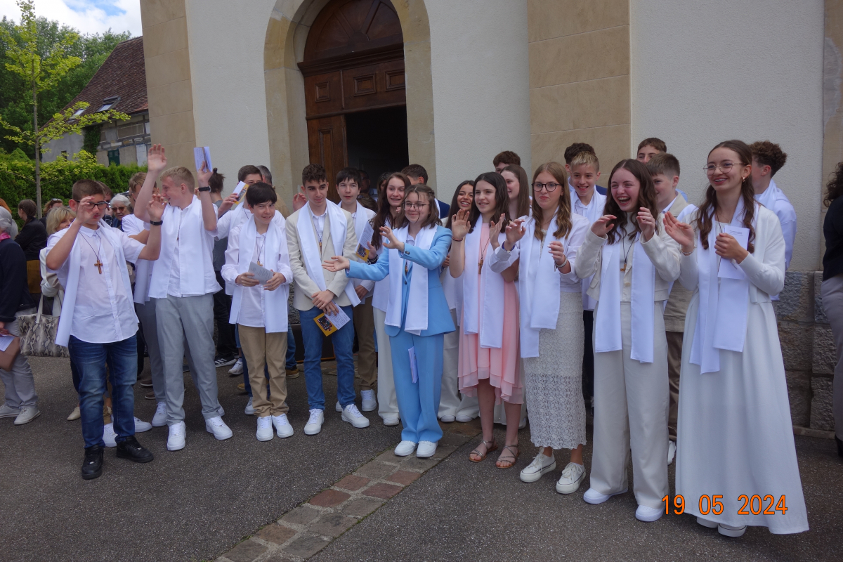 Après deux belles années de cheminement, 23 jeunes ont fait leur profession de foi et ont été confirmés, le dimanche de la Pentecôte, 19 mai 2024, par le Chanoine Hubert Schmitt.