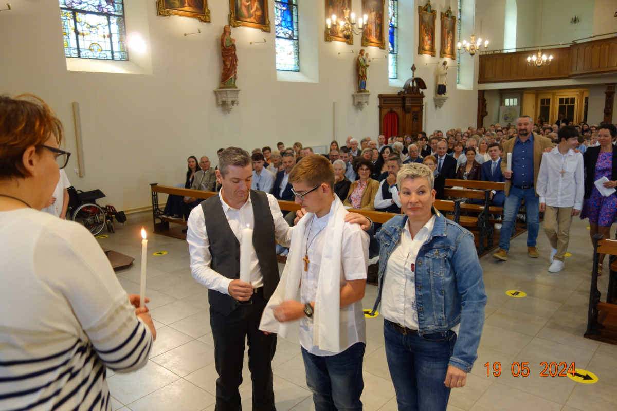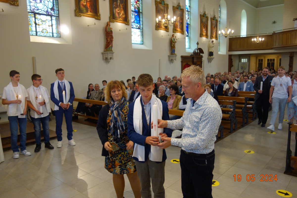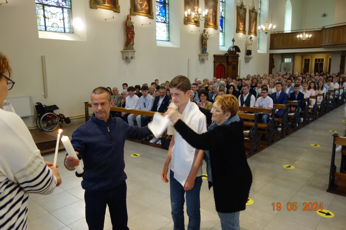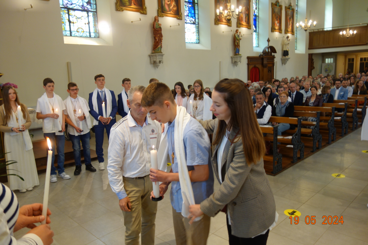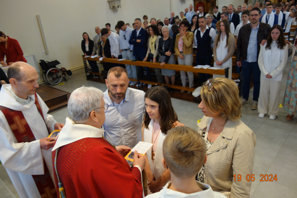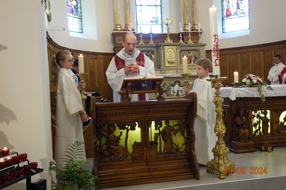 Après deux belles années de cheminement, 23 jeunes ont fait leur profession de foi et ont été confirmés, le dimanche de la Pentecôte, 19 mai 2024, par le Chanoine Hubert Schmitt.