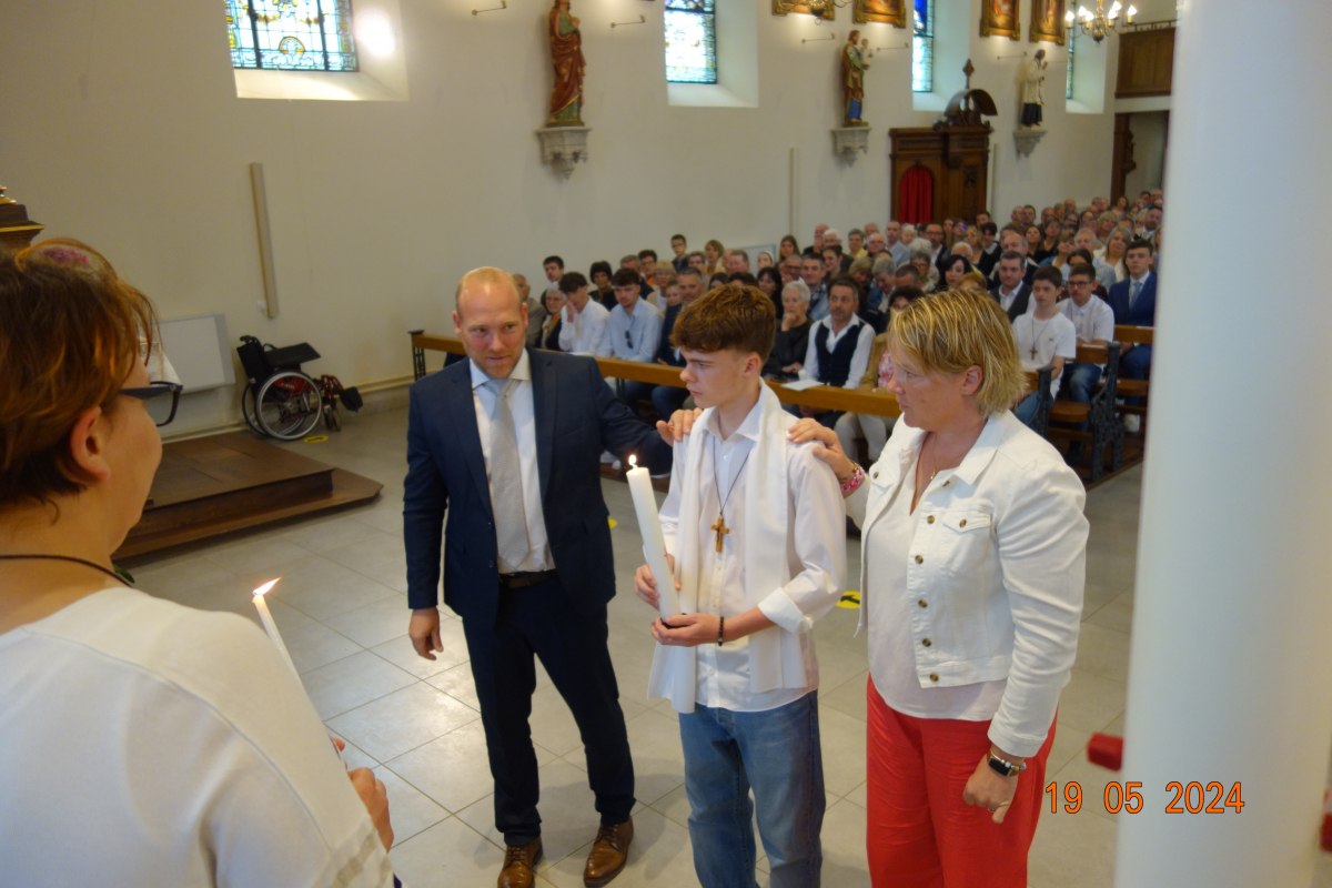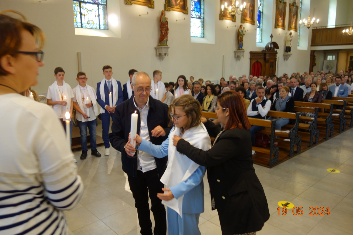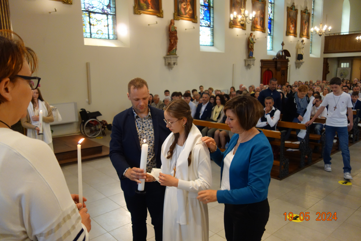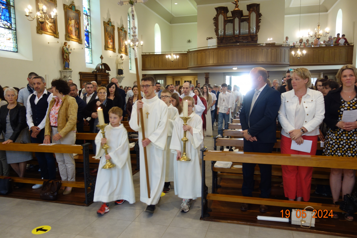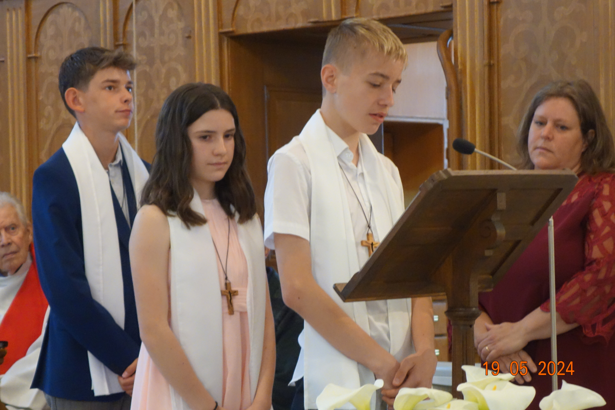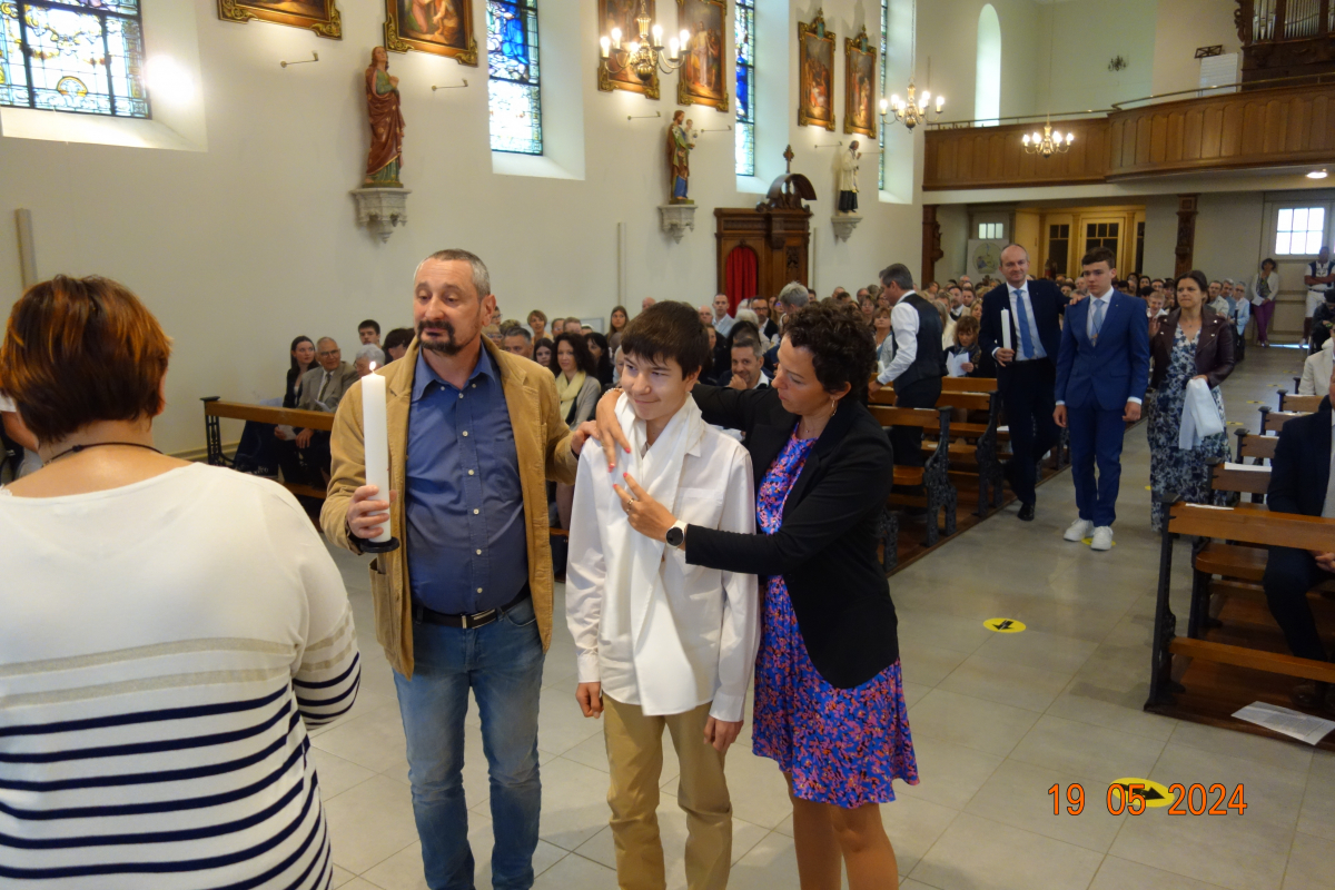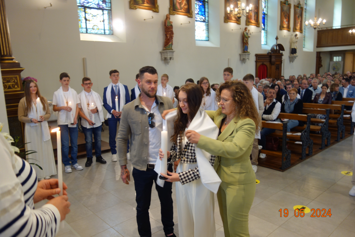 Après deux belles années de cheminement, 23 jeunes ont fait leur profession de foi et ont été confirmés, le dimanche de la Pentecôte, 19 mai 2024, par le Chanoine Hubert Schmitt.