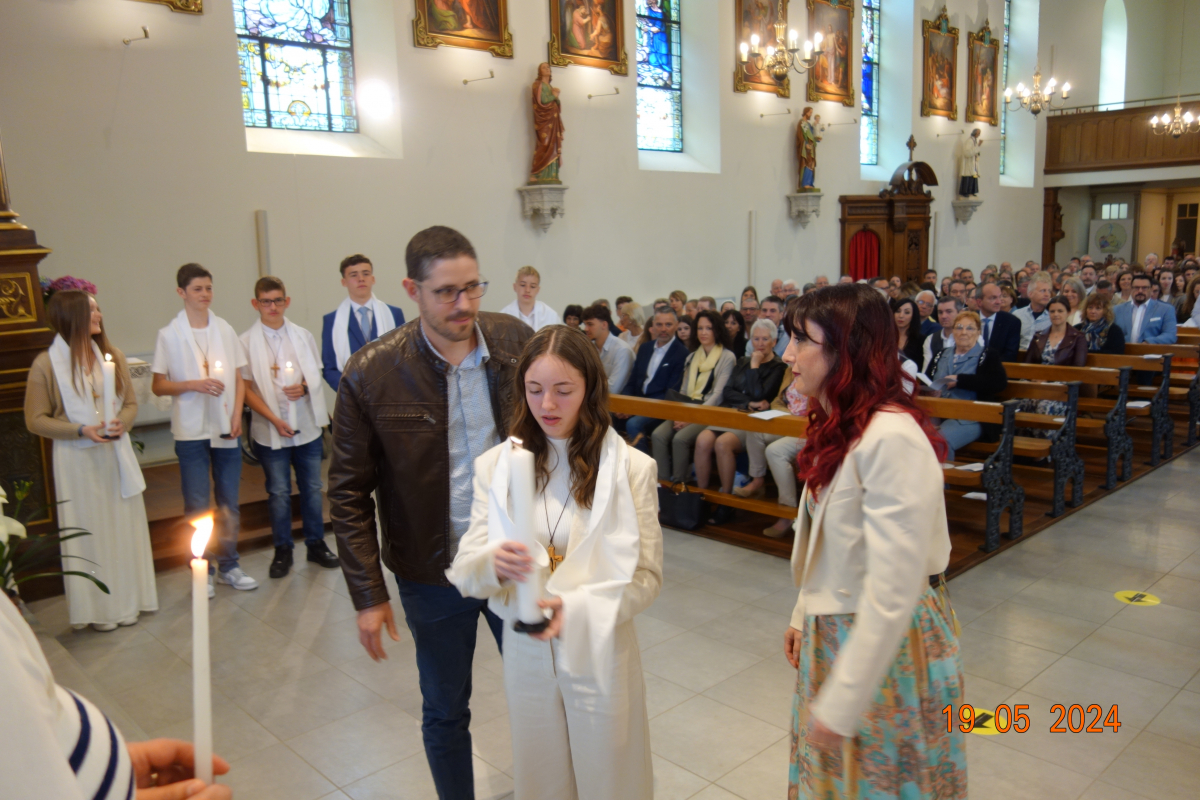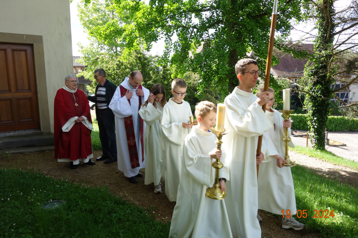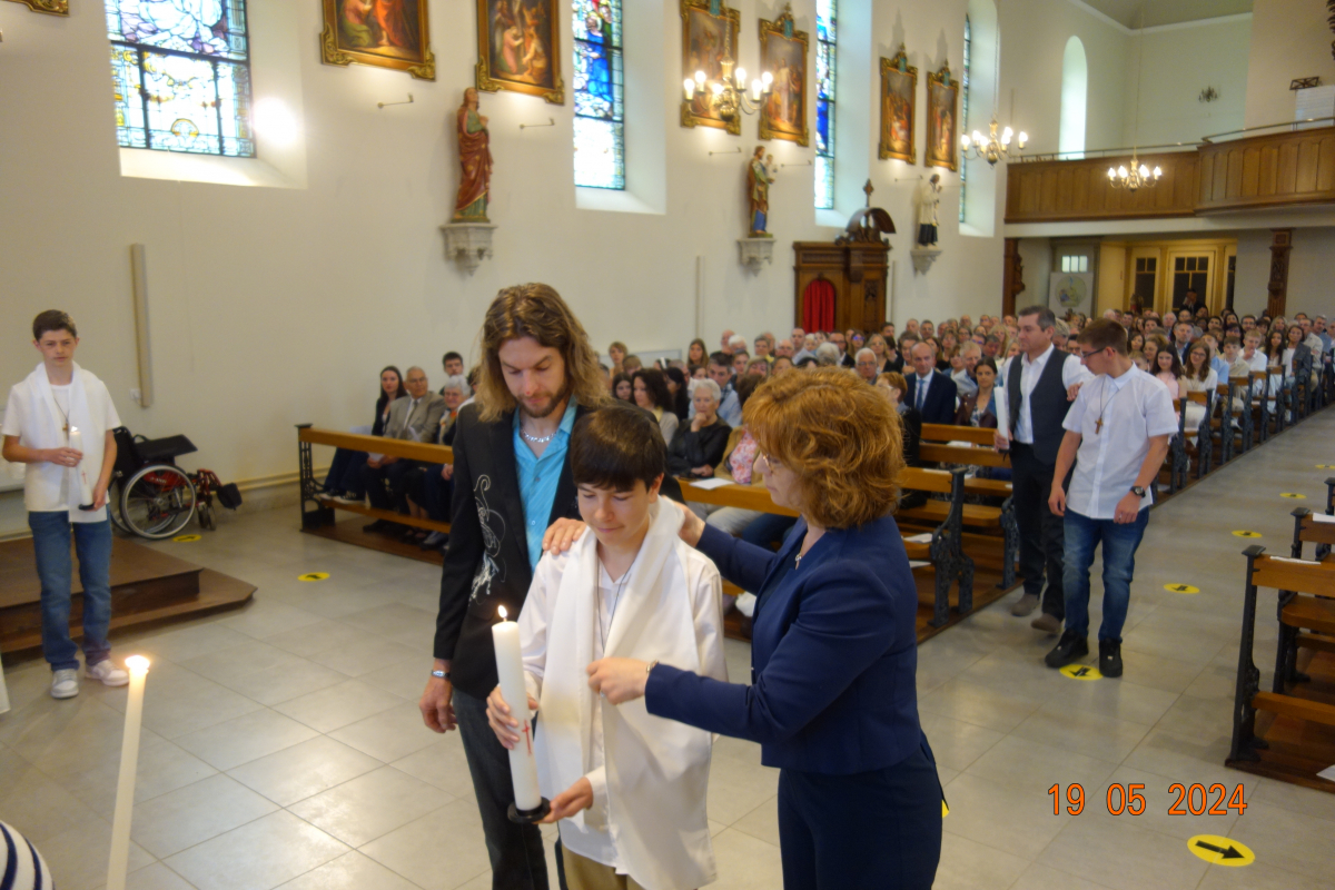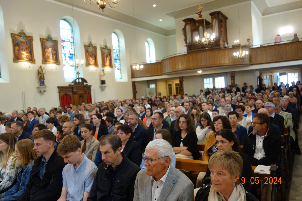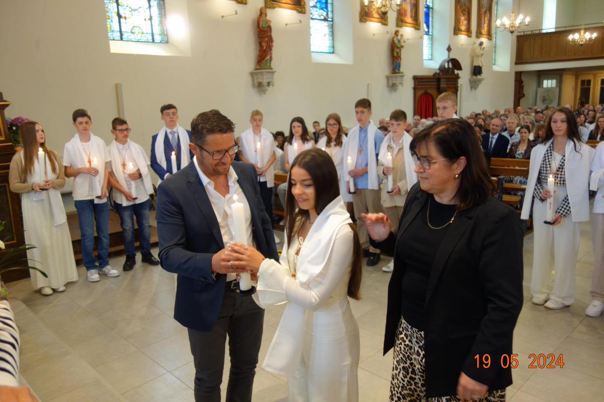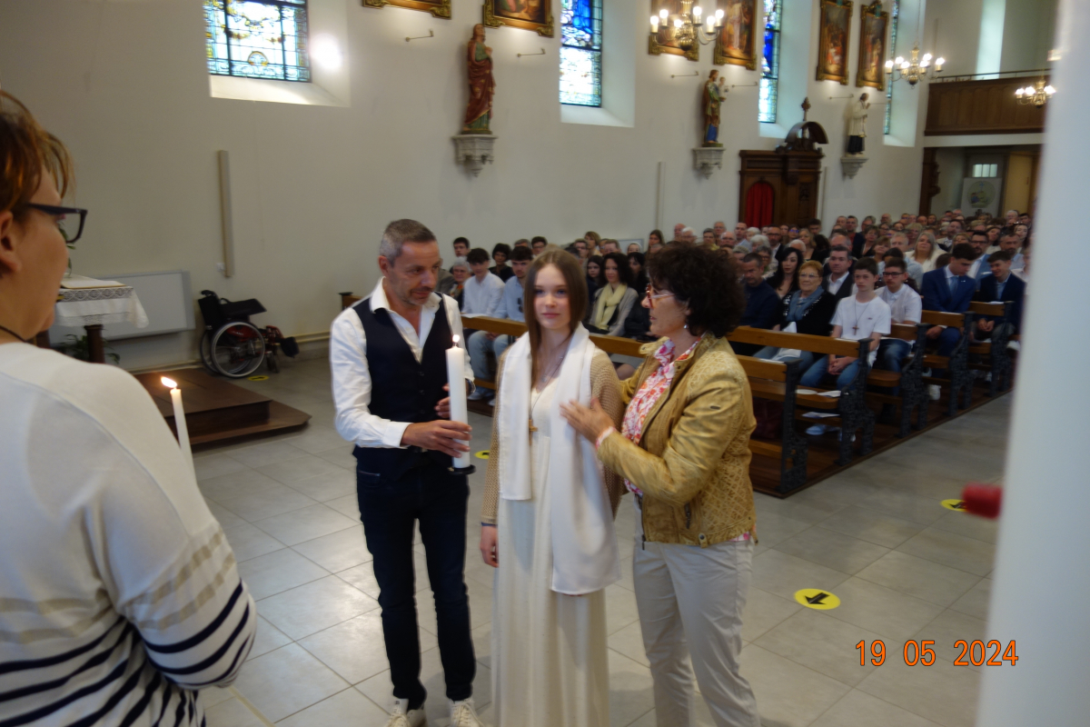 Après deux belles années de cheminement, 23 jeunes ont fait leur profession de foi et ont été confirmés, le dimanche de la Pentecôte, 19 mai 2024, par le Chanoine Hubert Schmitt.