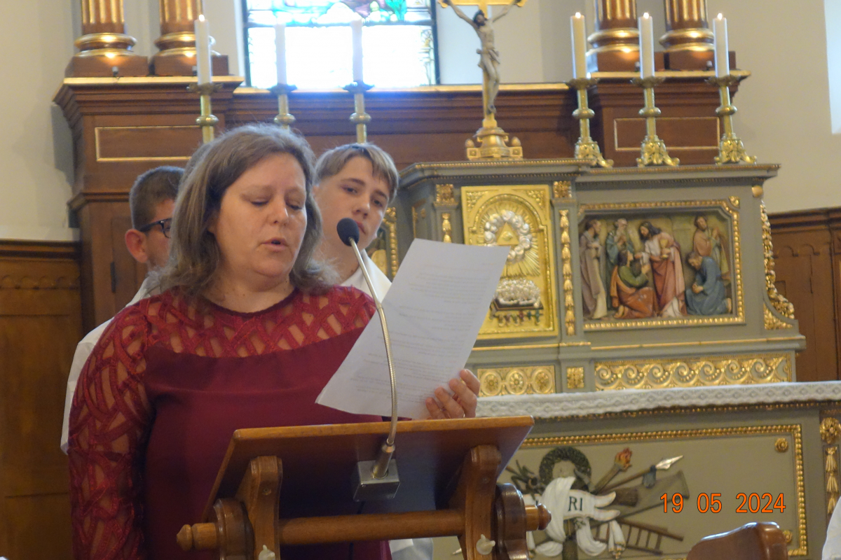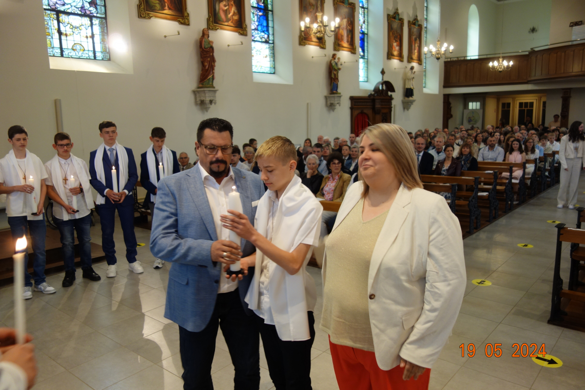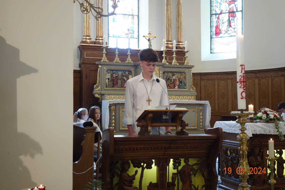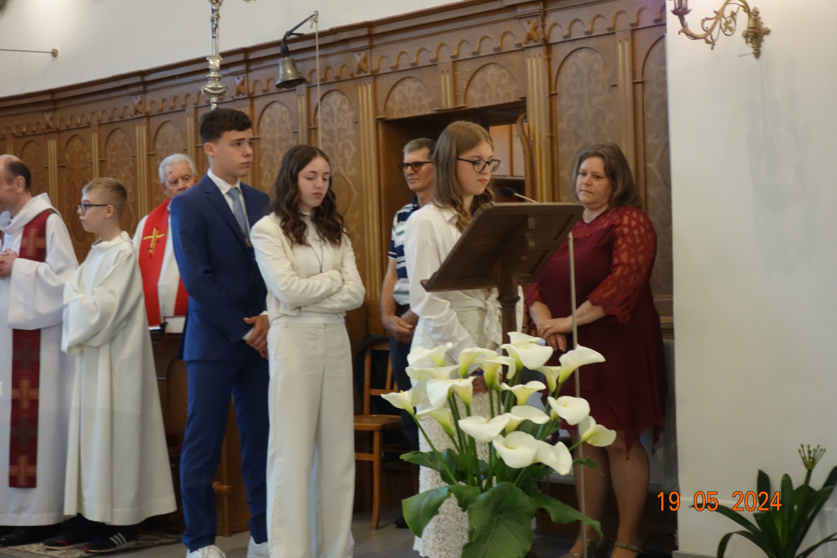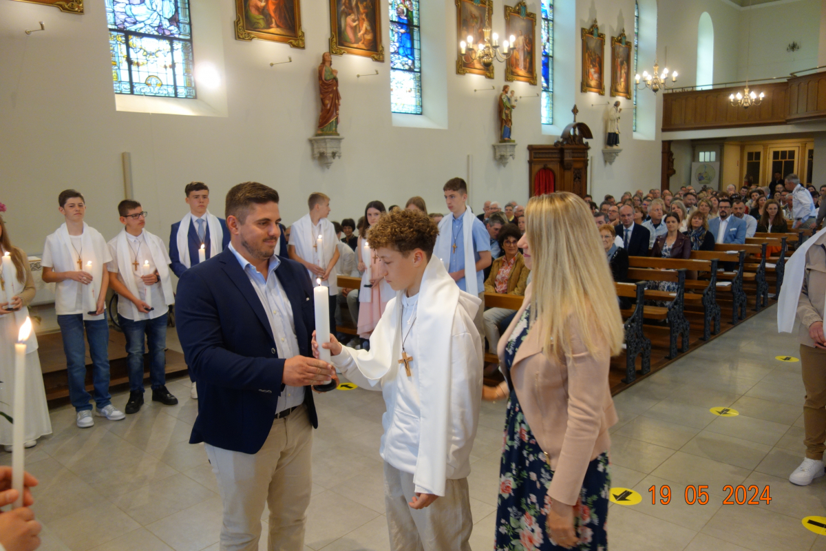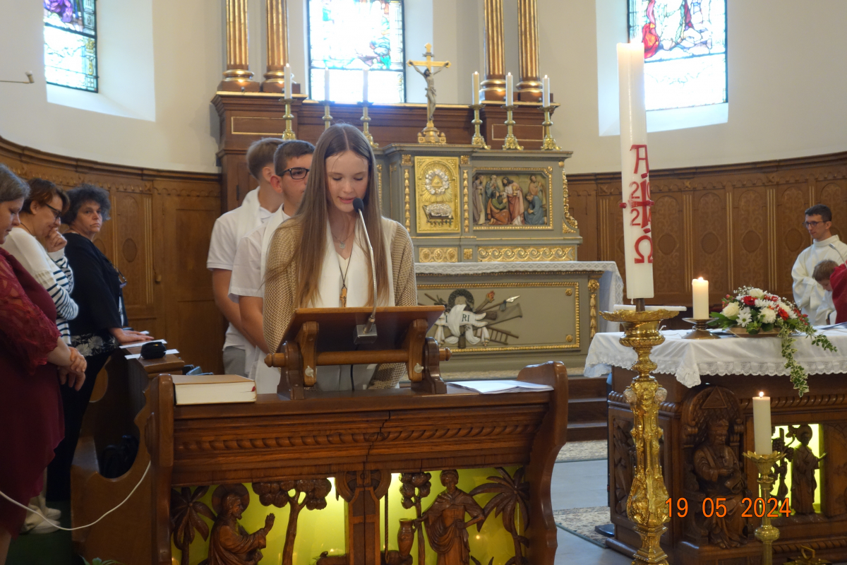 Après deux belles années de cheminement, 23 jeunes ont fait leur profession de foi et ont été confirmés, le dimanche de la Pentecôte, 19 mai 2024, par le Chanoine Hubert Schmitt.