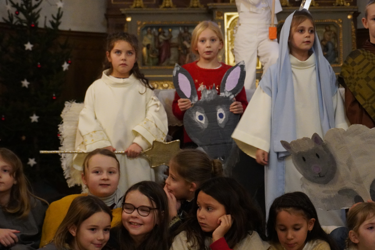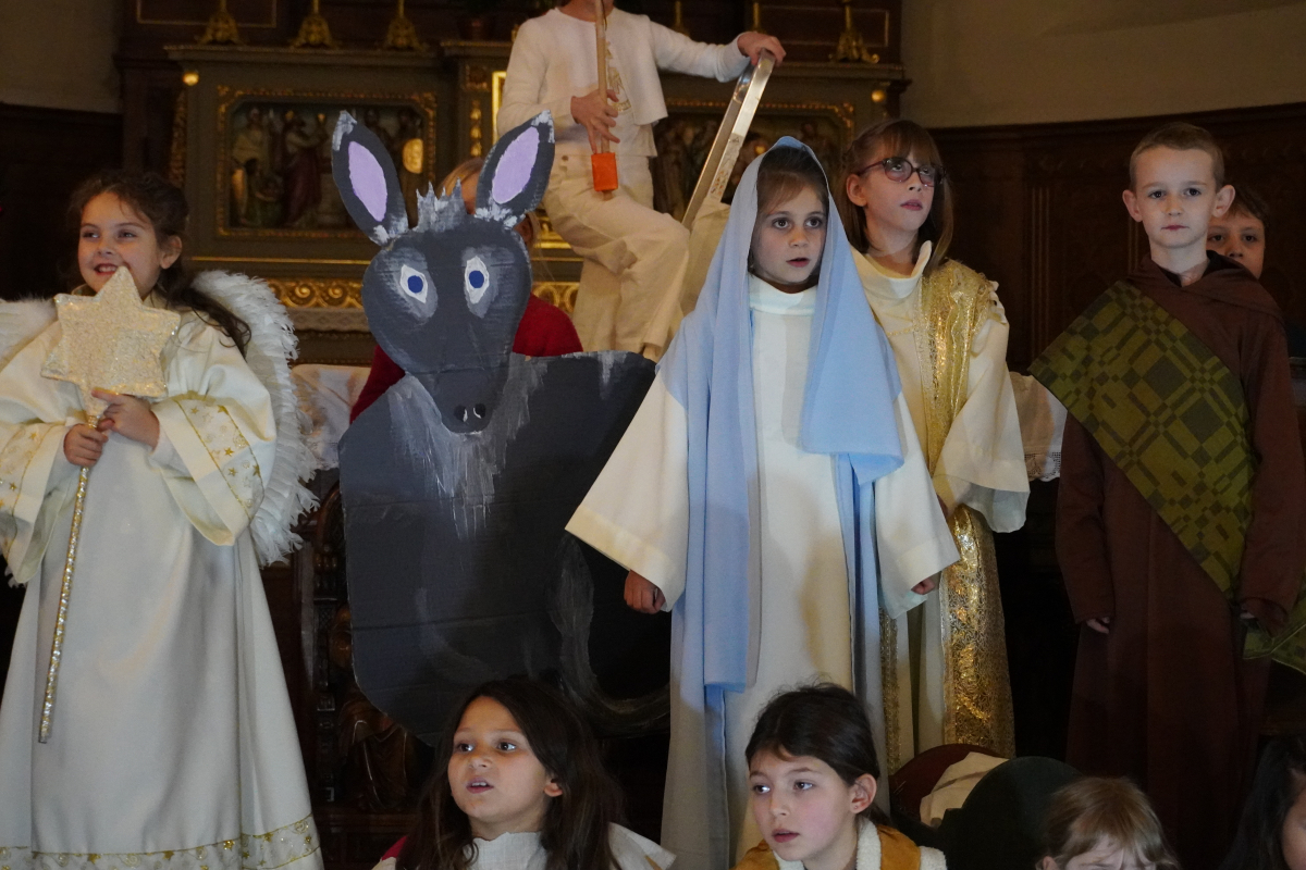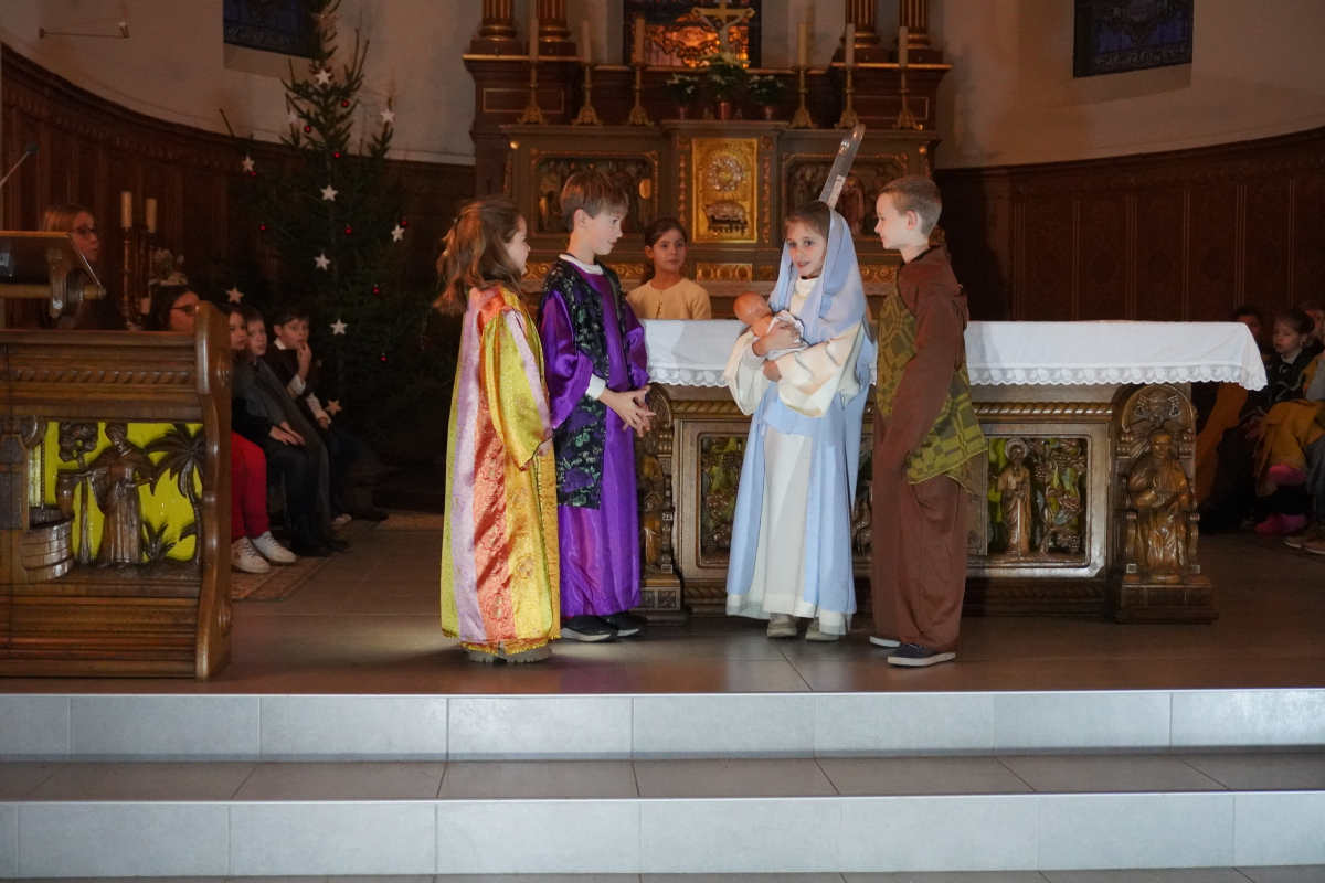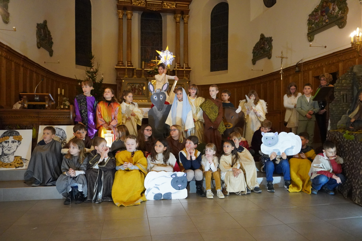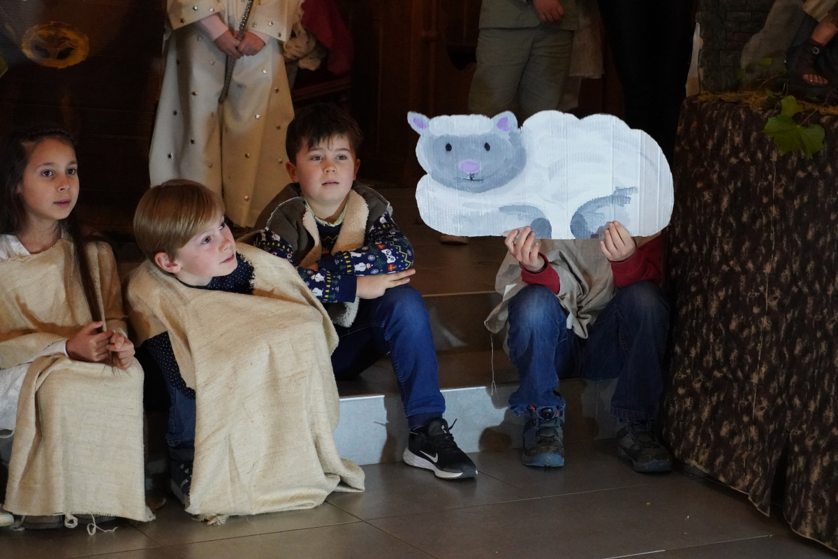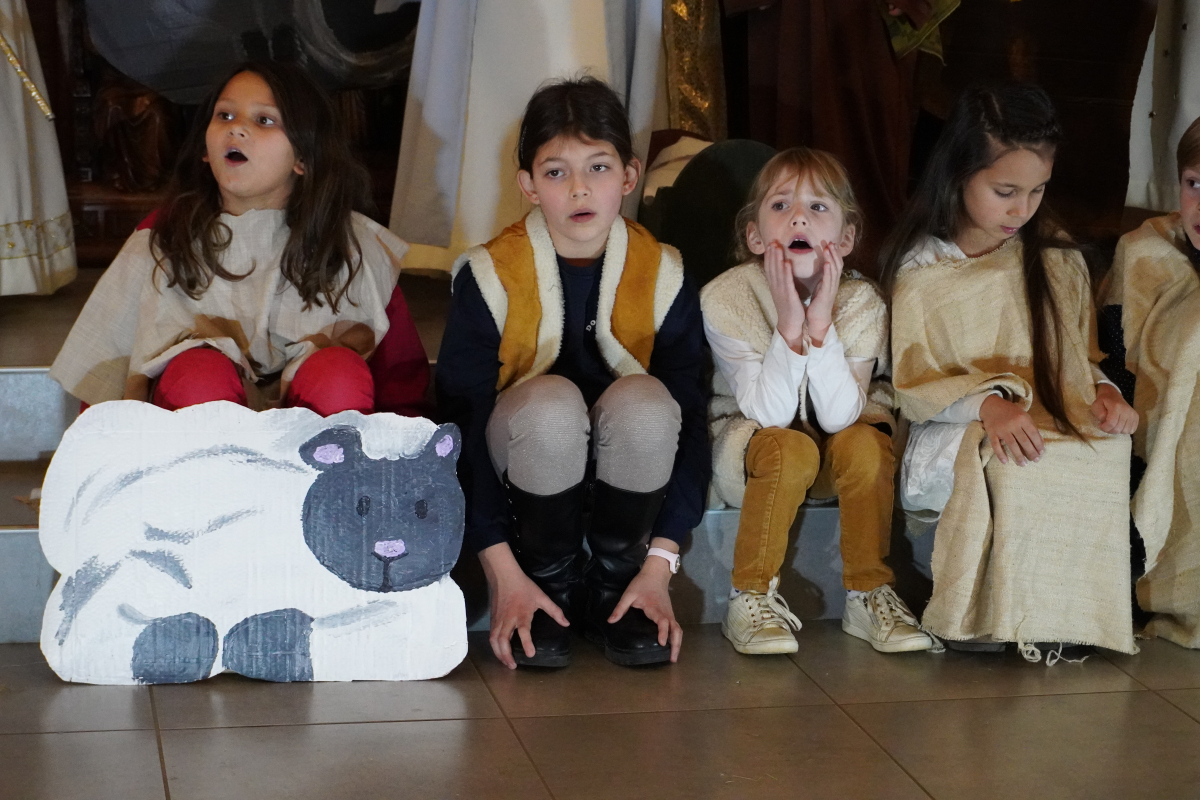 Les enfants ont présenté une saynète racontant l’histoire de deux enfants à Bethléem. D’abord fixés sur le sol, ils ne voyaient pas l’étoile, mais en levant les yeux, ils ont découvert la lumière qui les a conduits à Jésus.