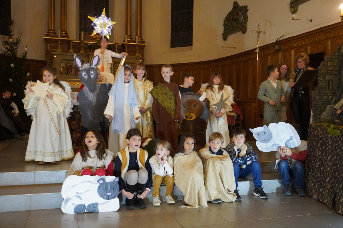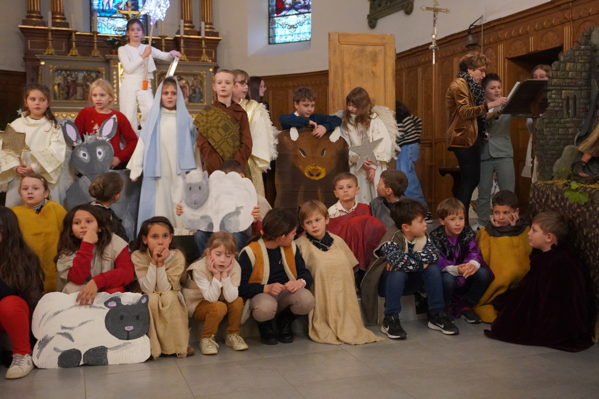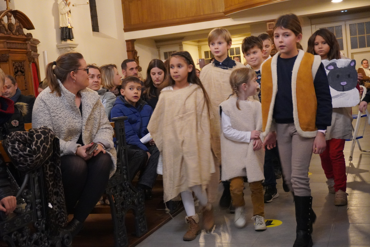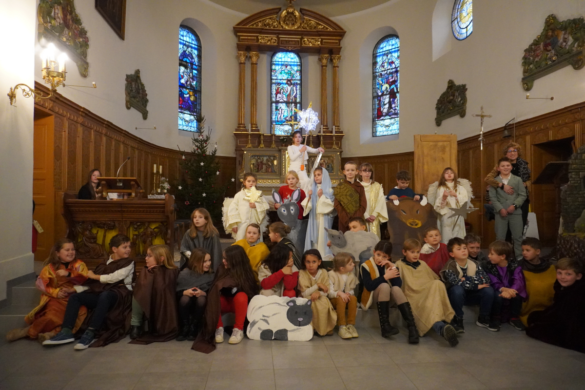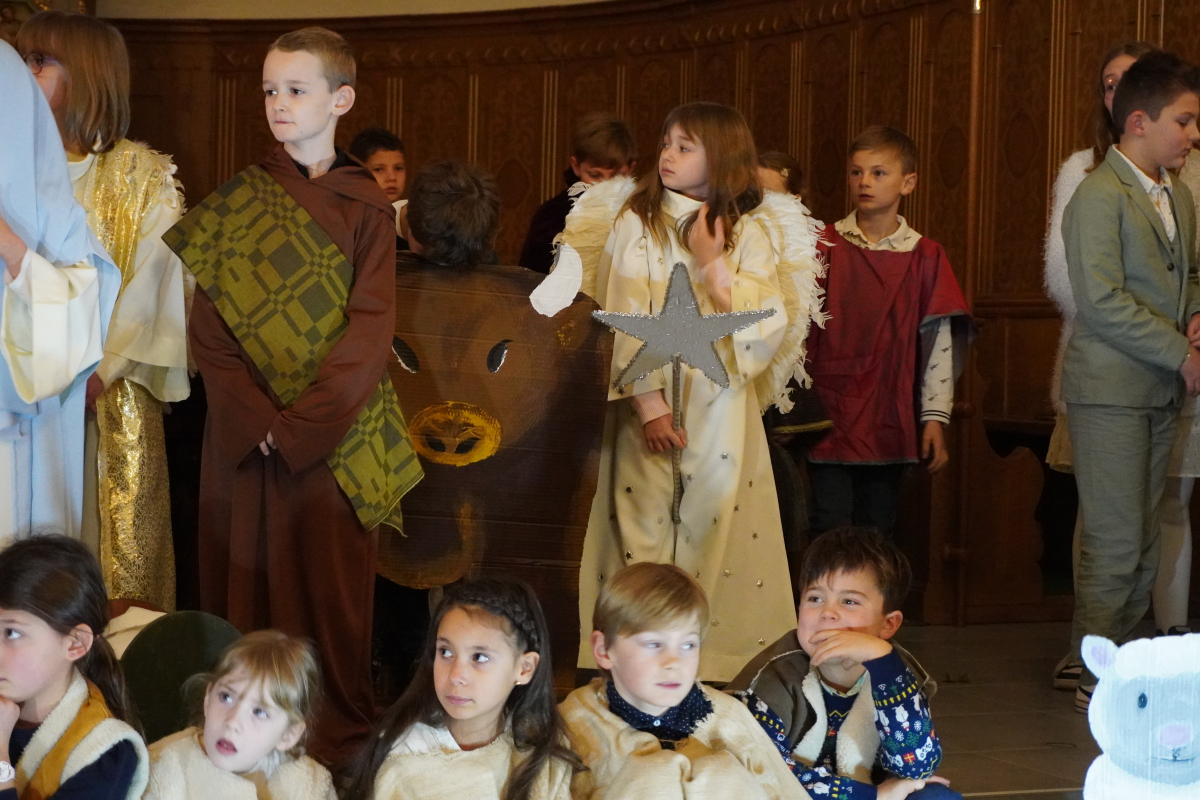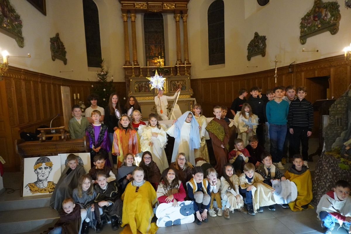 Les enfants ont présenté une saynète racontant l’histoire de deux enfants à Bethléem. D’abord fixés sur le sol, ils ne voyaient pas l’étoile, mais en levant les yeux, ils ont découvert la lumière qui les a conduits à Jésus.