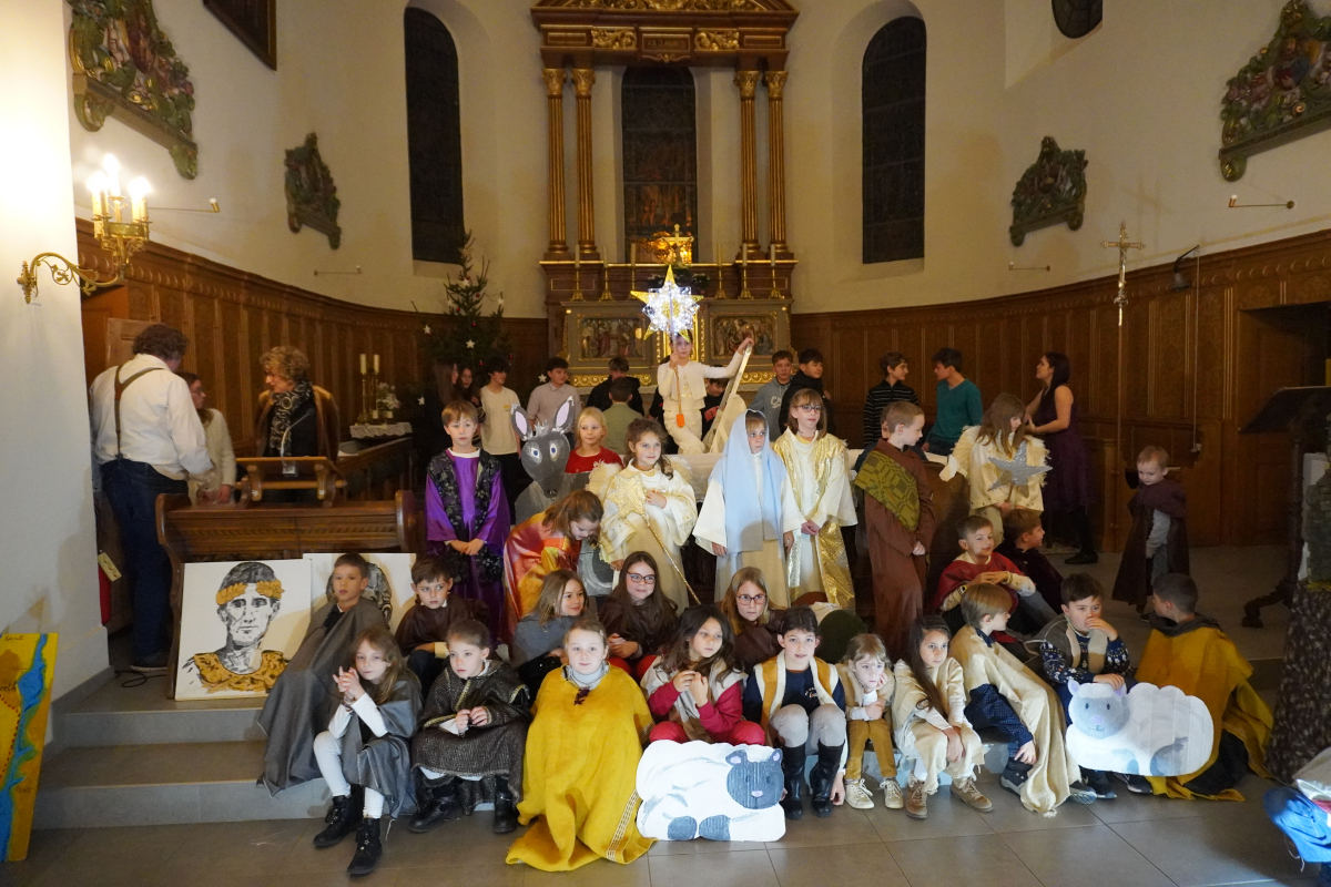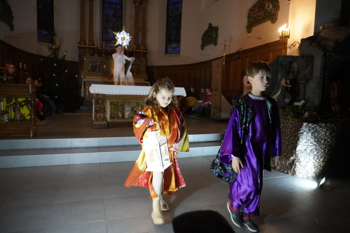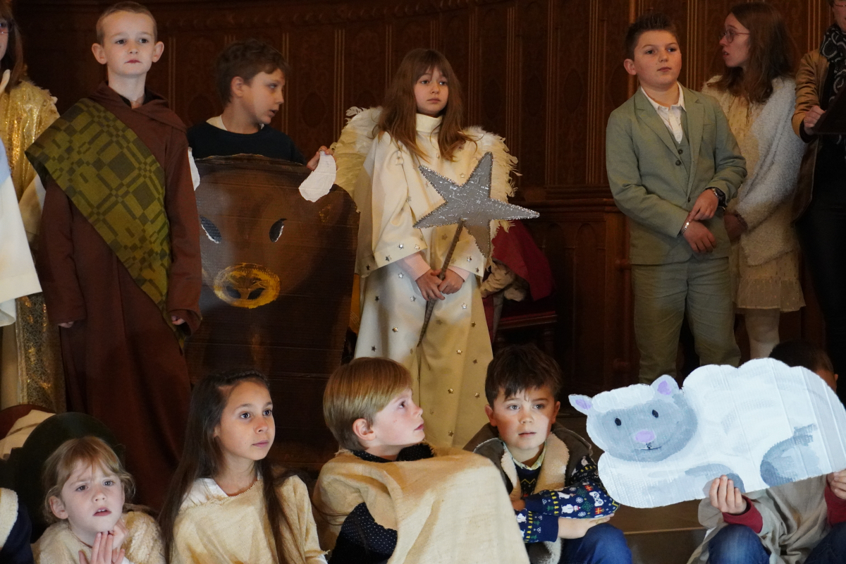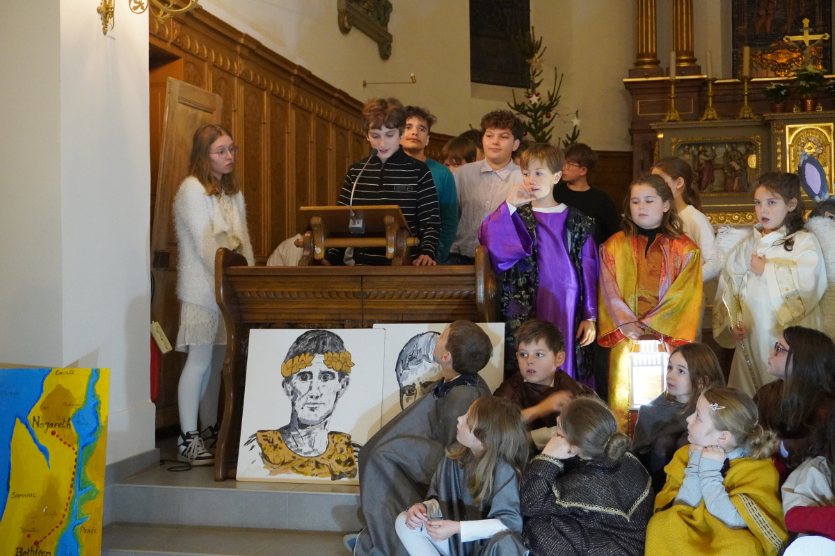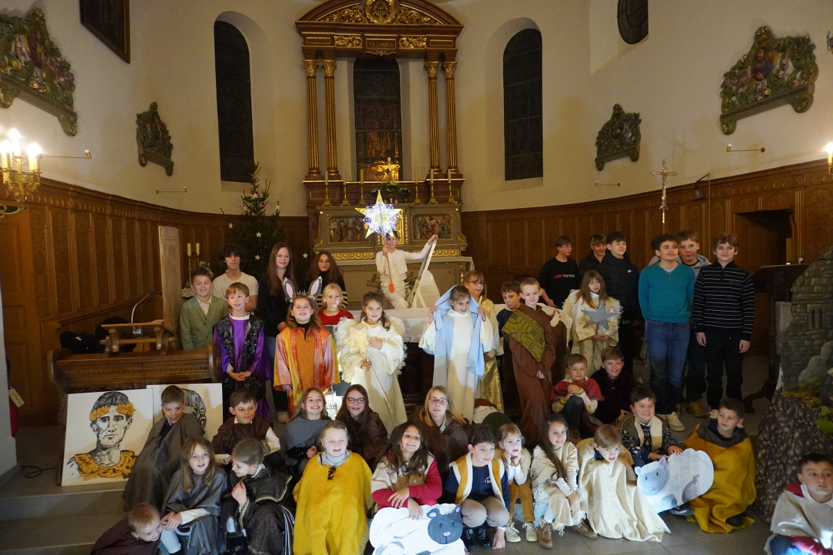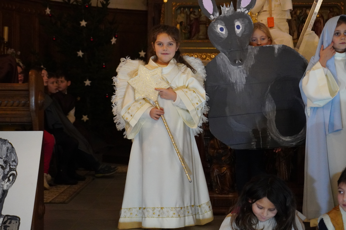 Les enfants ont présenté une saynète racontant l’histoire de deux enfants à Bethléem. D’abord fixés sur le sol, ils ne voyaient pas l’étoile, mais en levant les yeux, ils ont découvert la lumière qui les a conduits à Jésus.