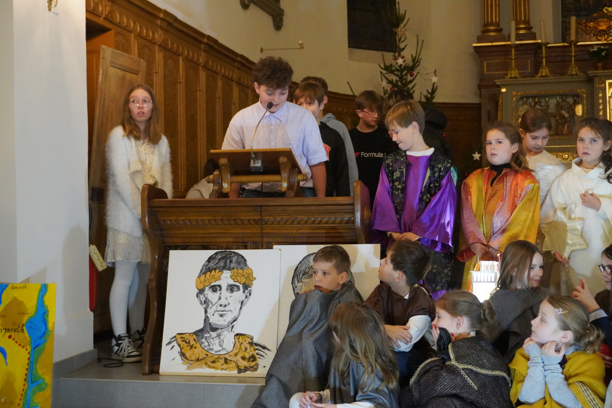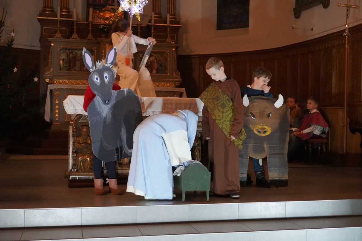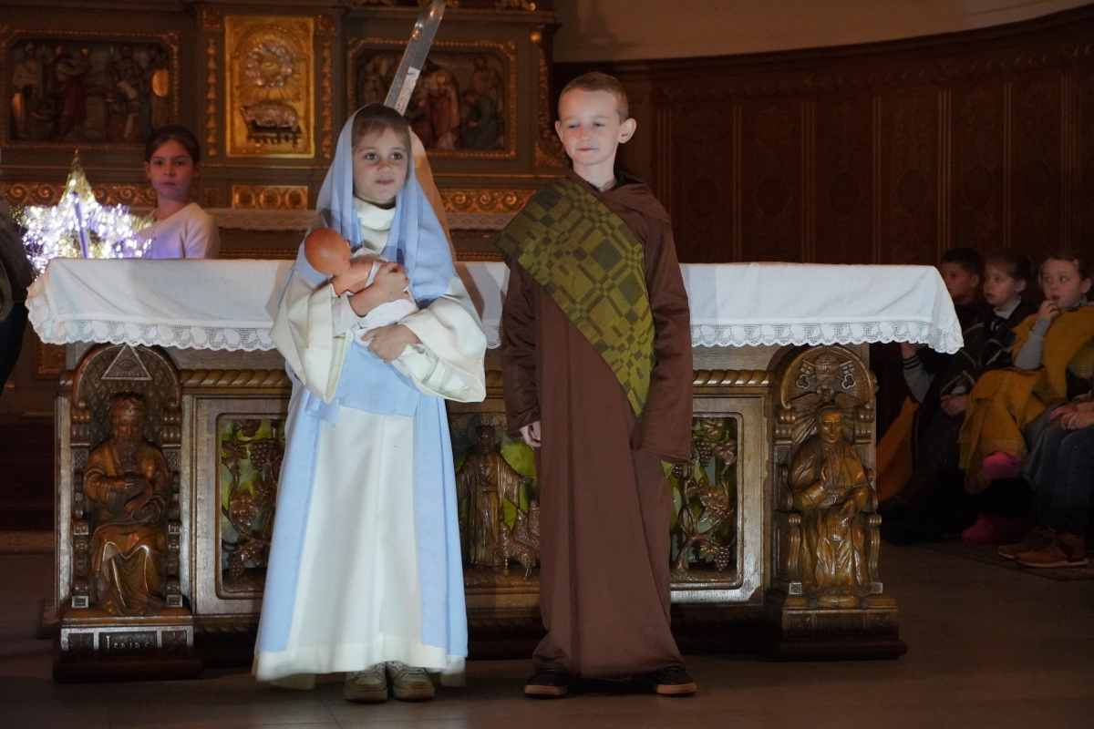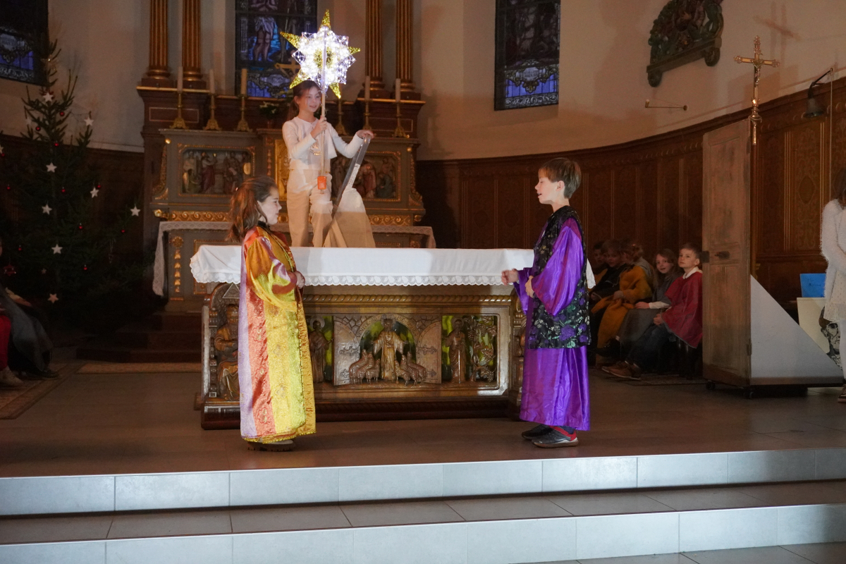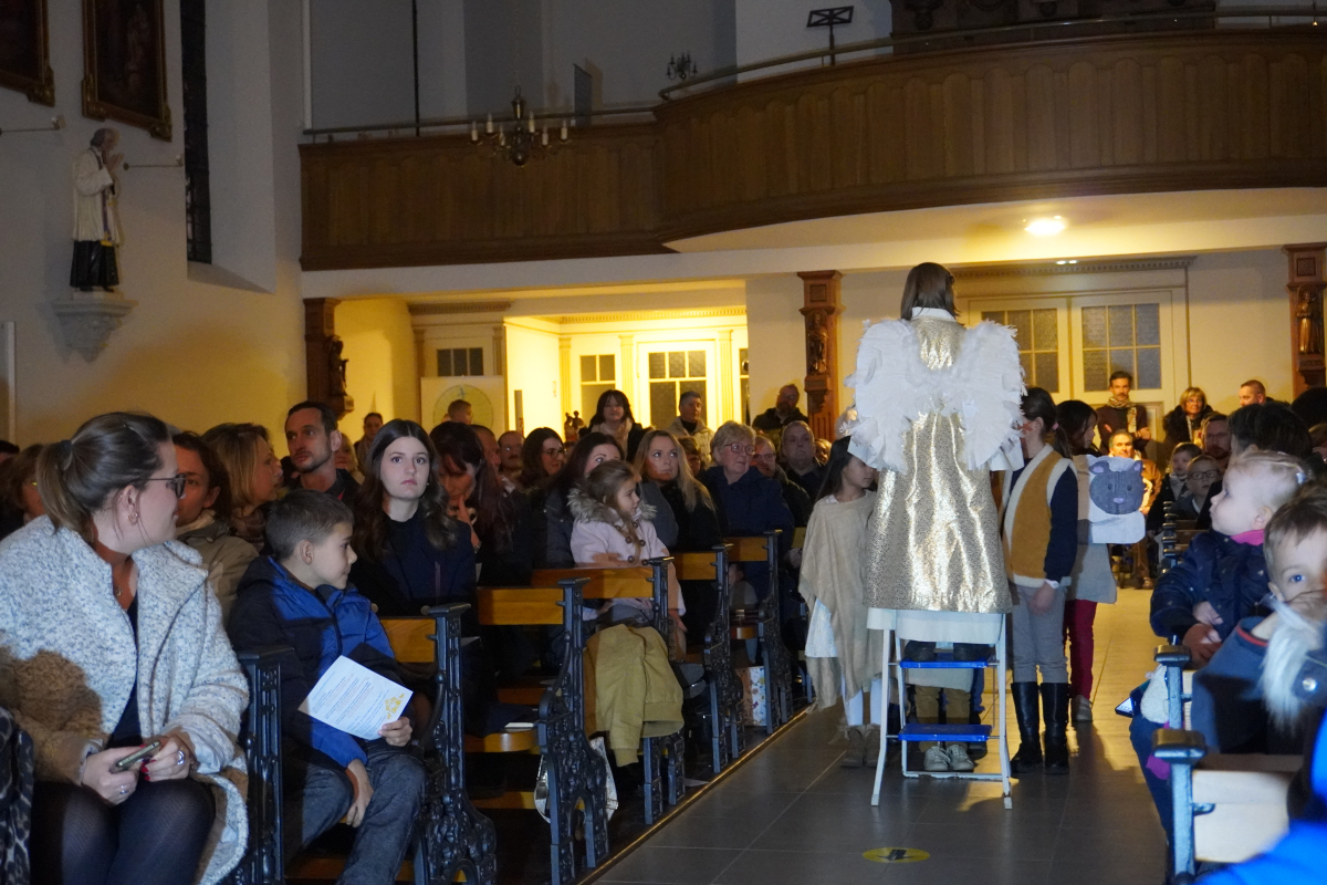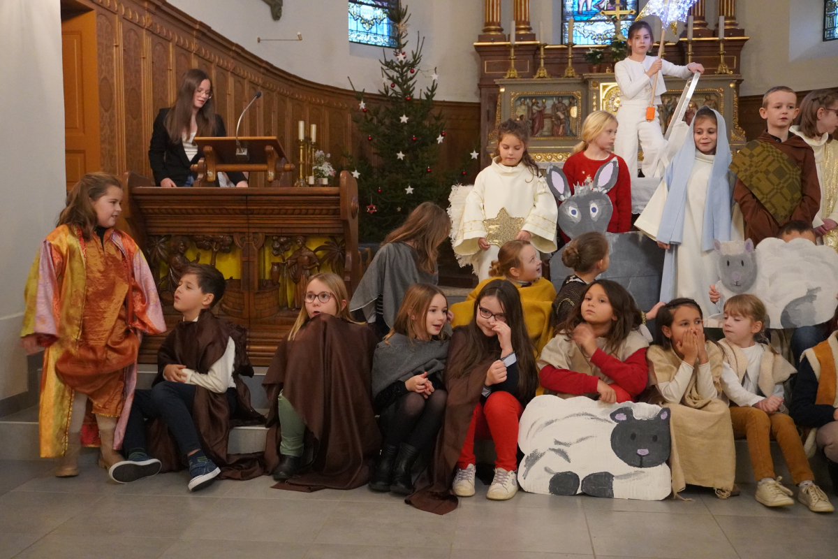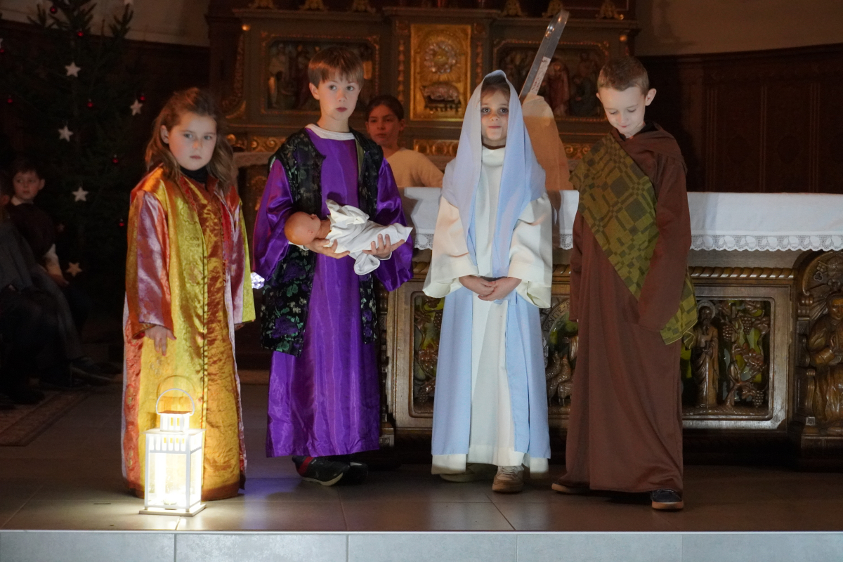 Les enfants ont présenté une saynète racontant l’histoire de deux enfants à Bethléem. D’abord fixés sur le sol, ils ne voyaient pas l’étoile, mais en levant les yeux, ils ont découvert la lumière qui les a conduits à Jésus.