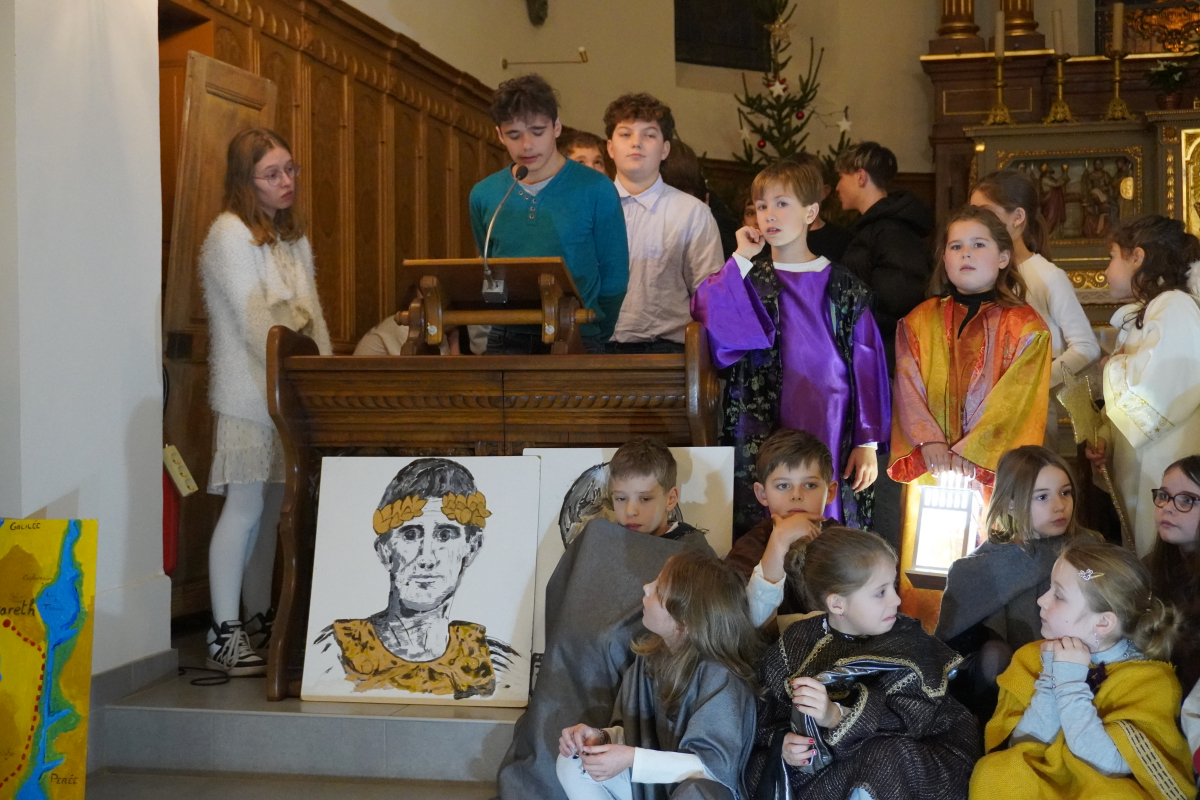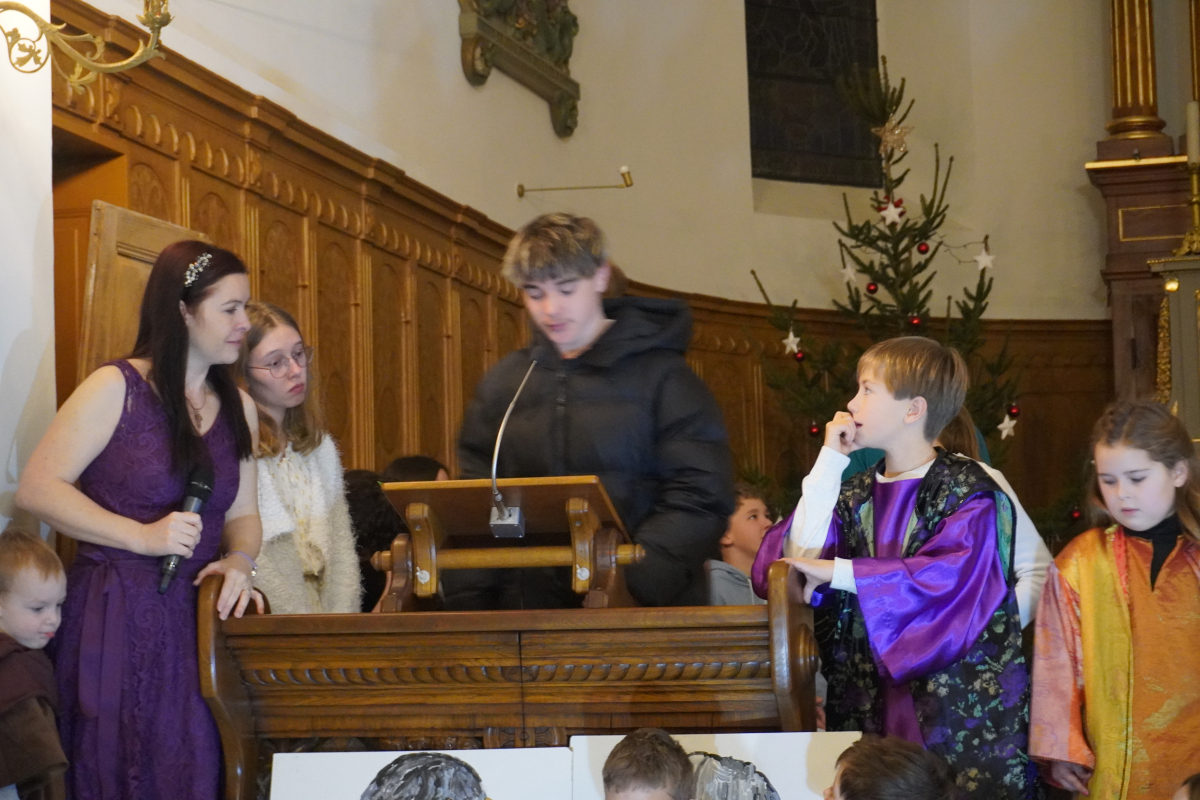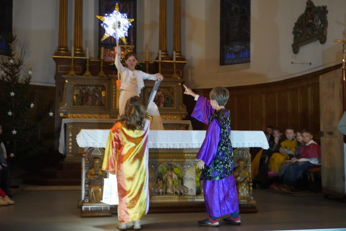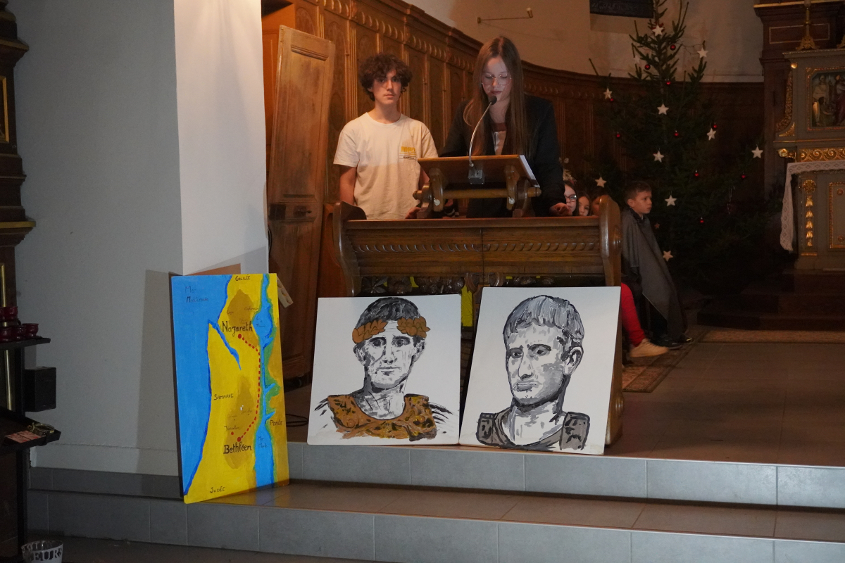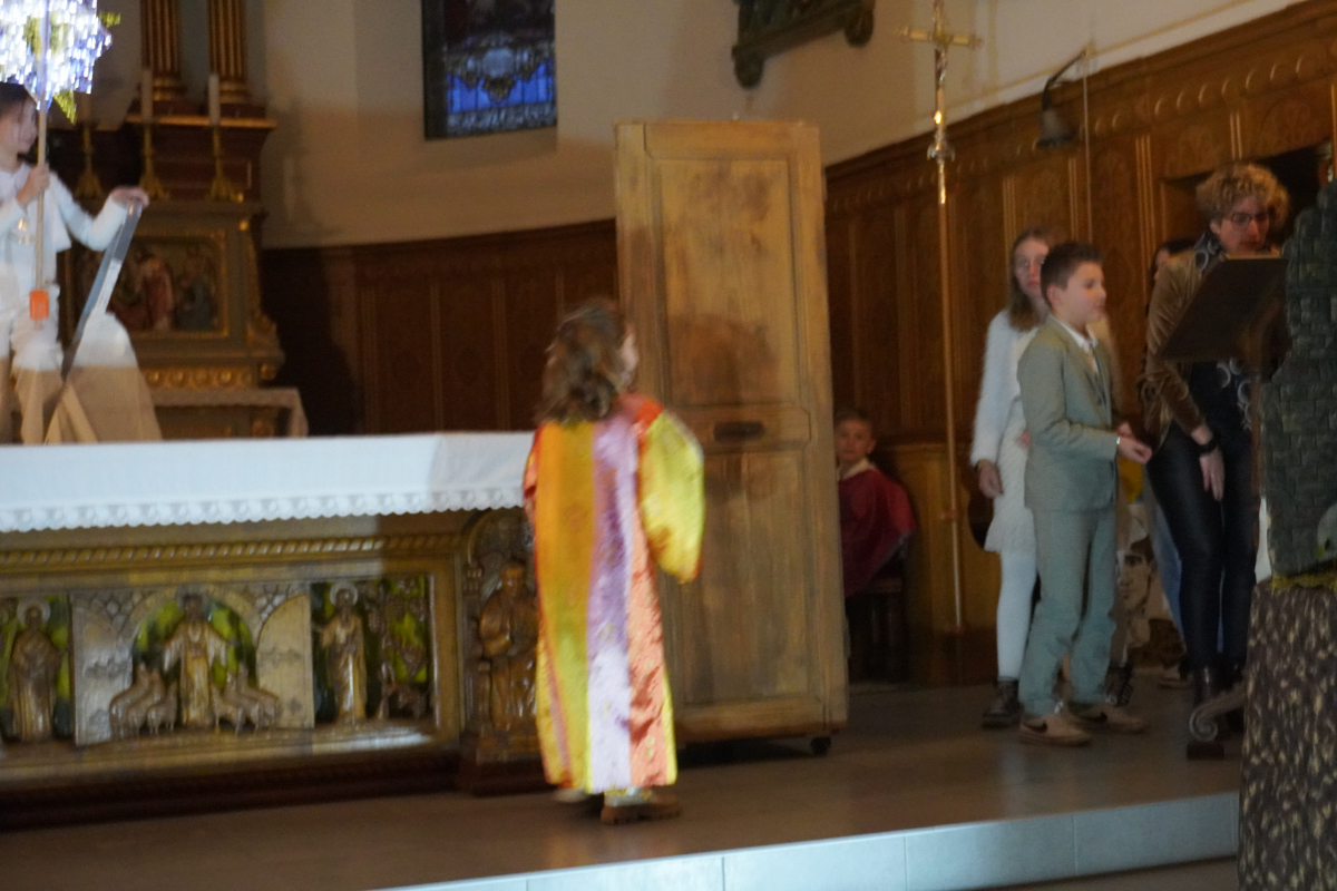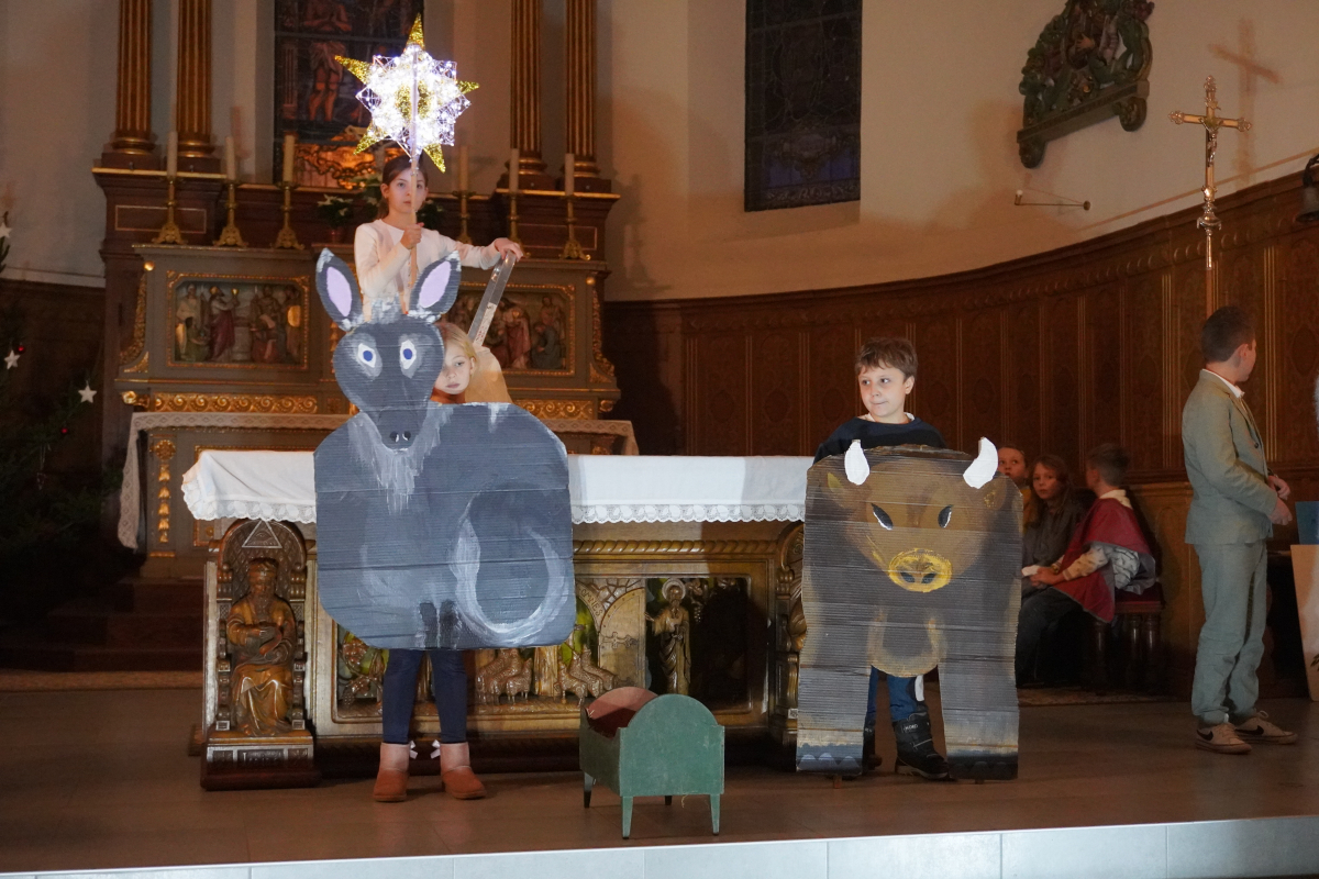 Les enfants ont présenté une saynète racontant l’histoire de deux enfants à Bethléem. D’abord fixés sur le sol, ils ne voyaient pas l’étoile, mais en levant les yeux, ils ont découvert la lumière qui les a conduits à Jésus.