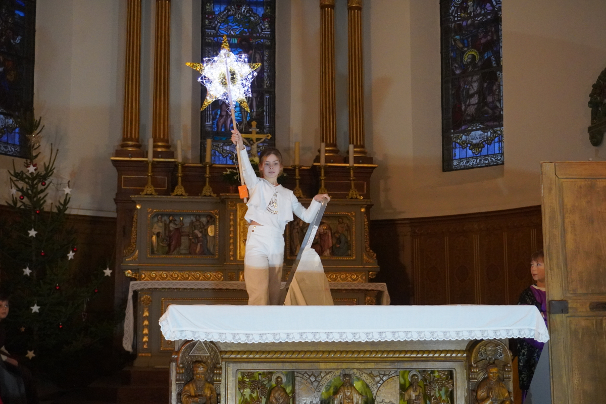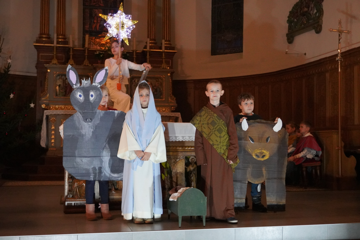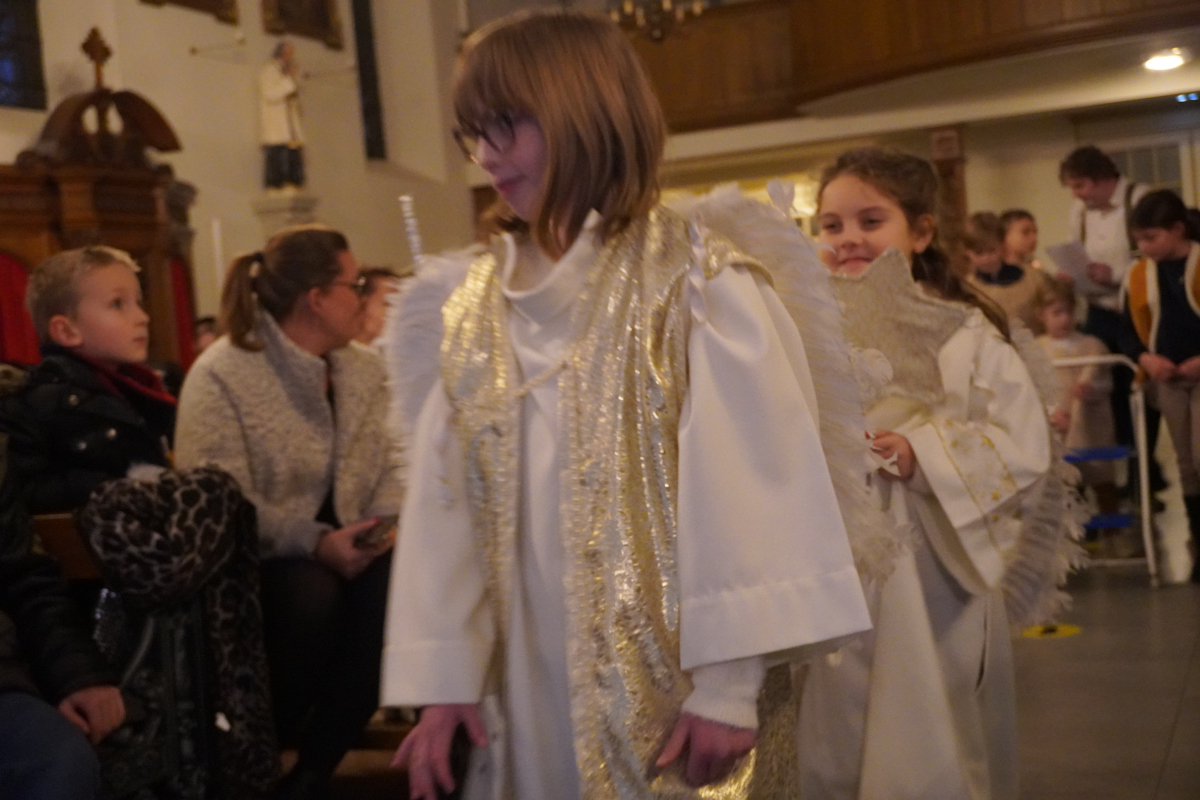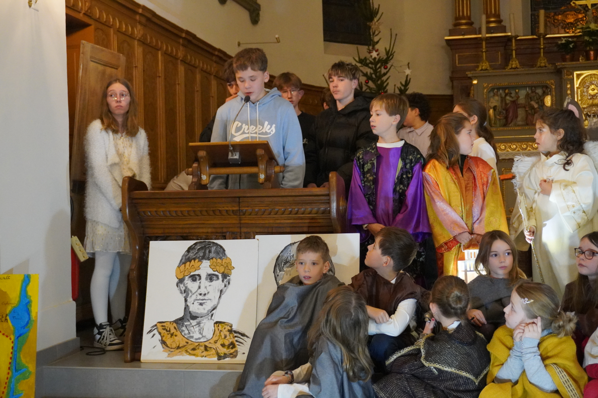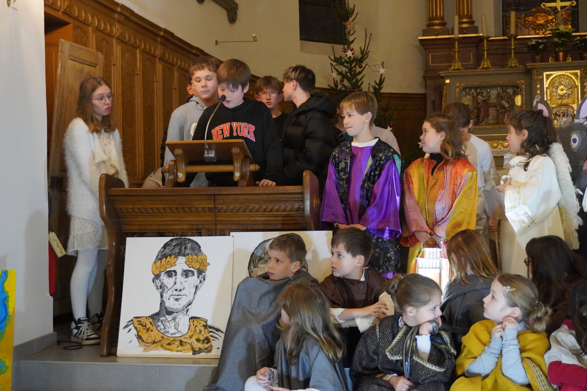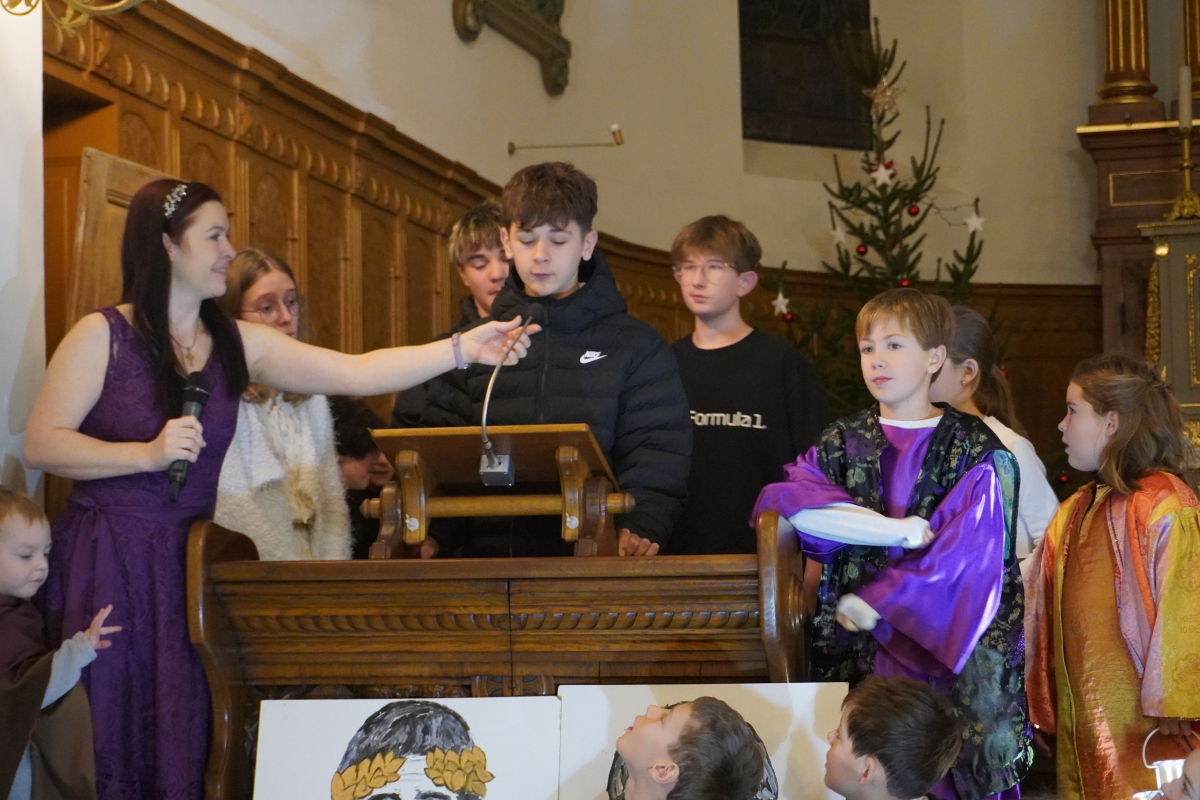 Les enfants ont présenté une saynète racontant l’histoire de deux enfants à Bethléem. D’abord fixés sur le sol, ils ne voyaient pas l’étoile, mais en levant les yeux, ils ont découvert la lumière qui les a conduits à Jésus.