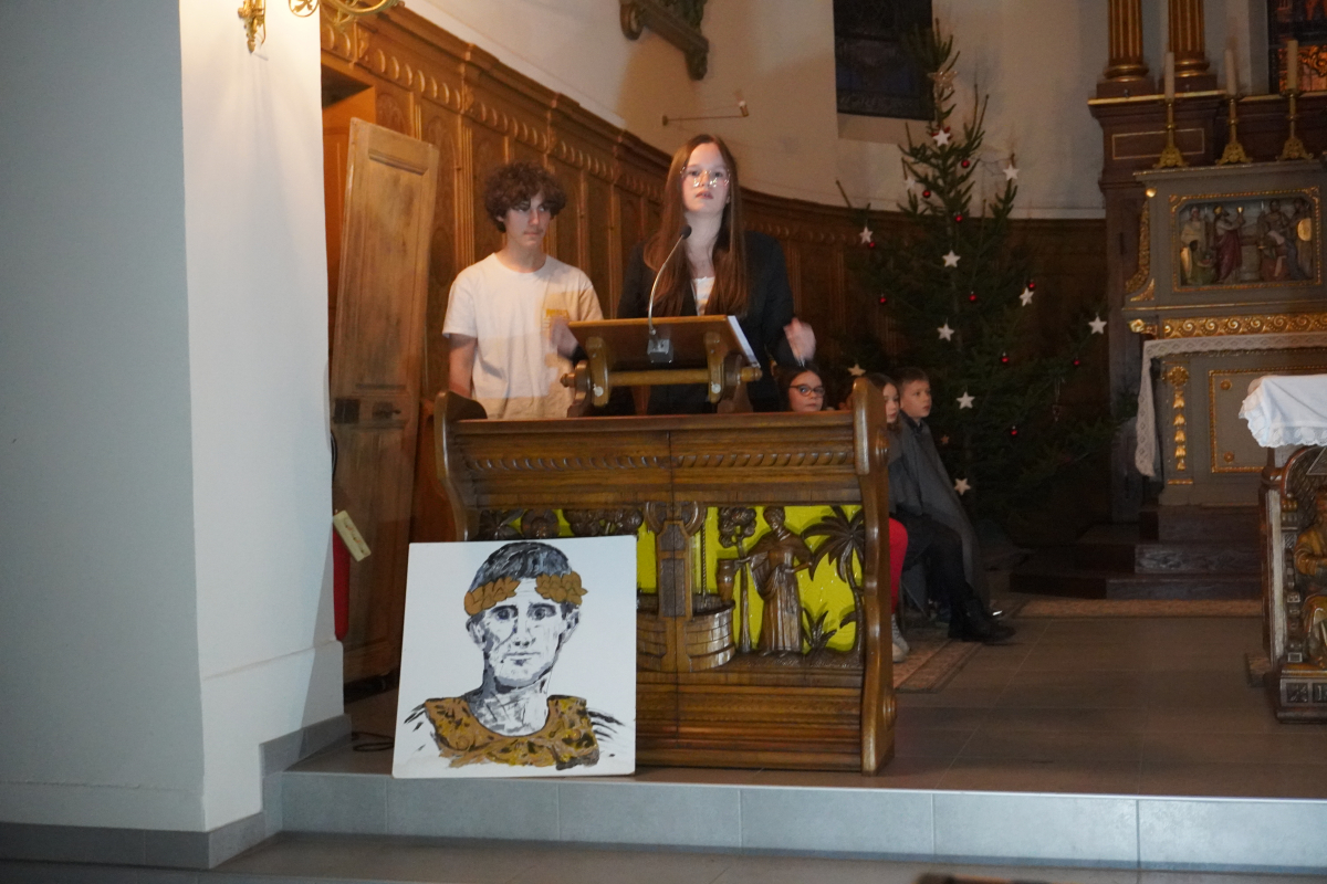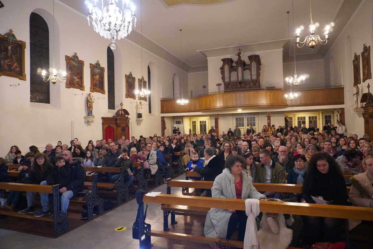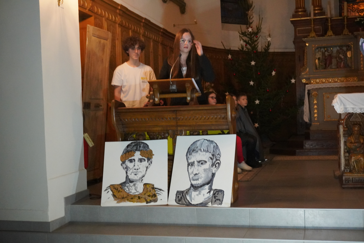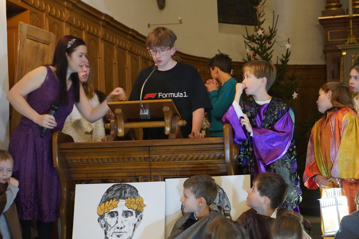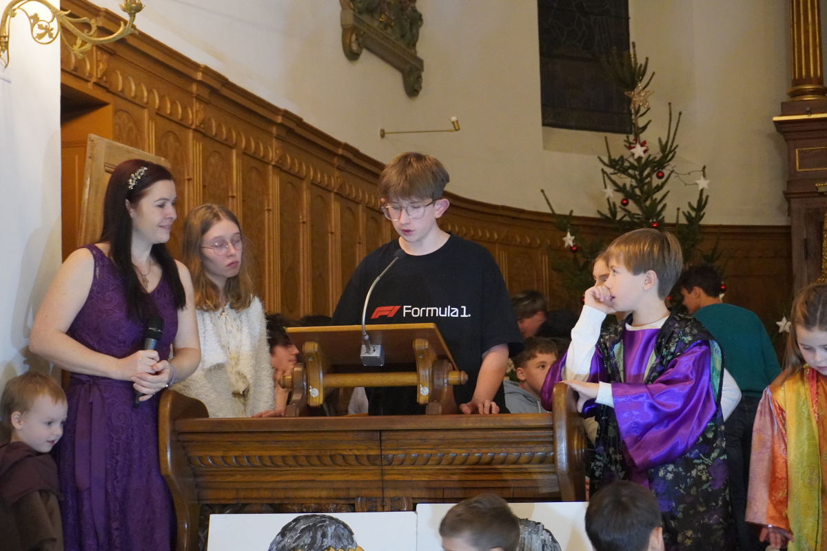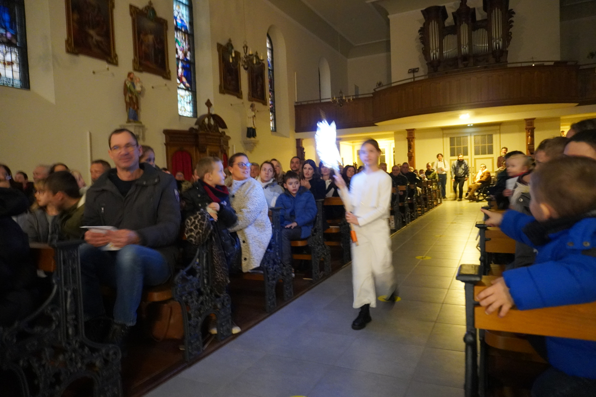Les enfants ont présenté une saynète racontant l’histoire de deux enfants à Bethléem. D’abord fixés sur le sol, ils ne voyaient pas l’étoile, mais en levant les yeux, ils ont découvert la lumière qui les a conduits à Jésus.