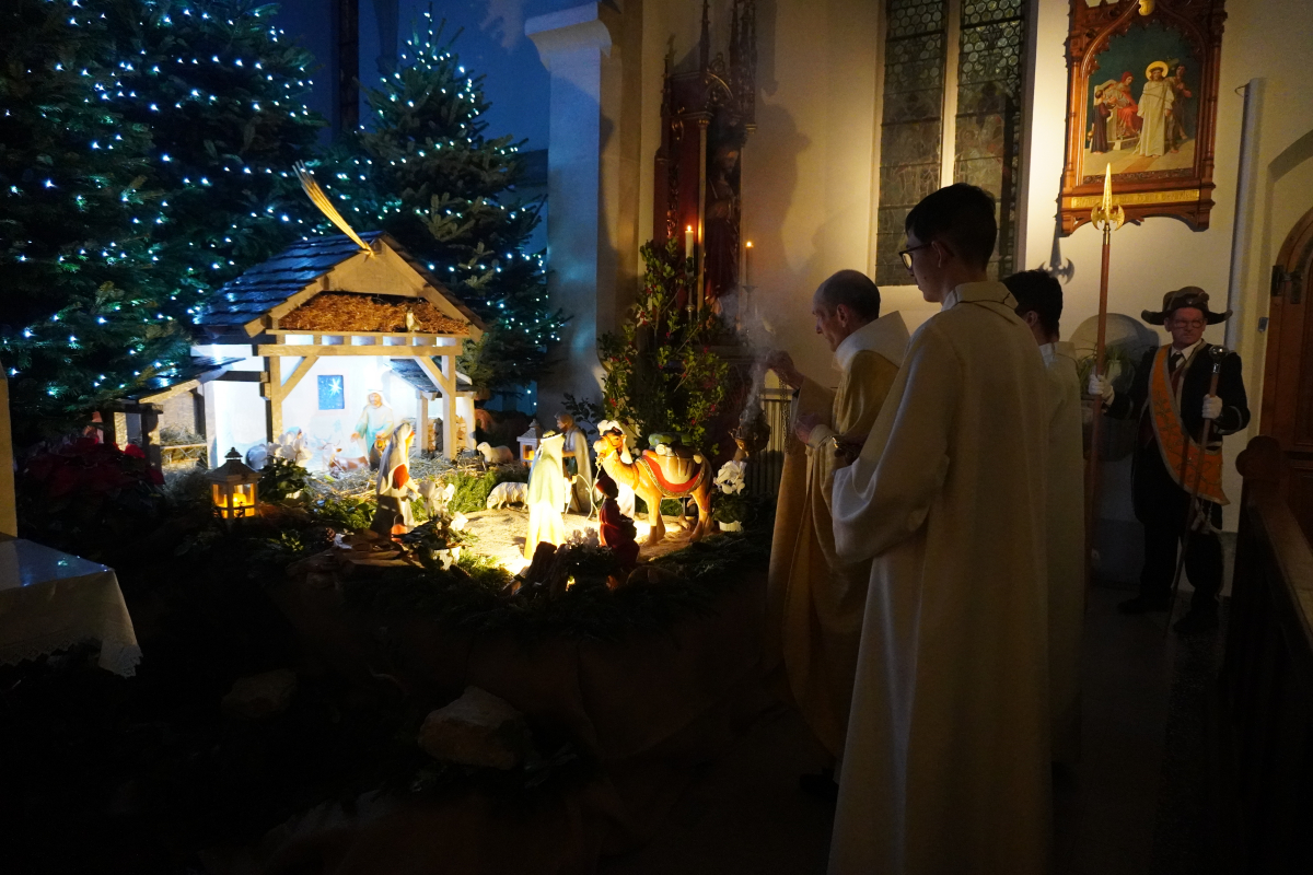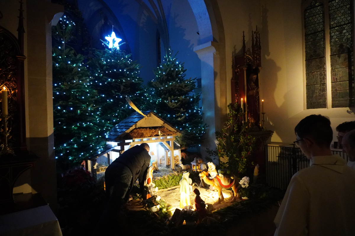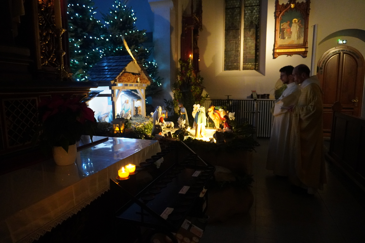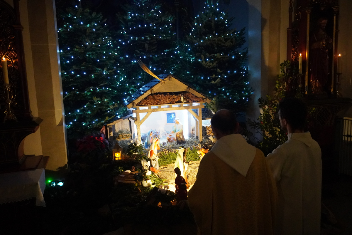 Cette année, la messe de minuit a été célébrée dans l'église Sts Pierre et Paul de Waldighoffen, point de rencontre de nombreux fidèles venus aussi d'autres communautés de paroisses avoisinantes. C'est donc dans une belle ferveur que cet office s'est déroulé en débutant, dans la pénombre, par la mise en place dans la crèche de "l'Enfant Jésus". La pénombre a disparu progressivement lorsque le "Gloria" a débuté pour être en pleine lumière à la fin de celui-ci pendant que les 5 cloches sonnaient à toutes volées pour annoncer la naissance du Christ.