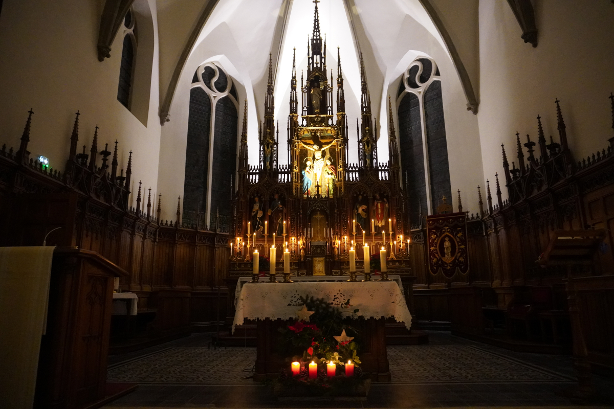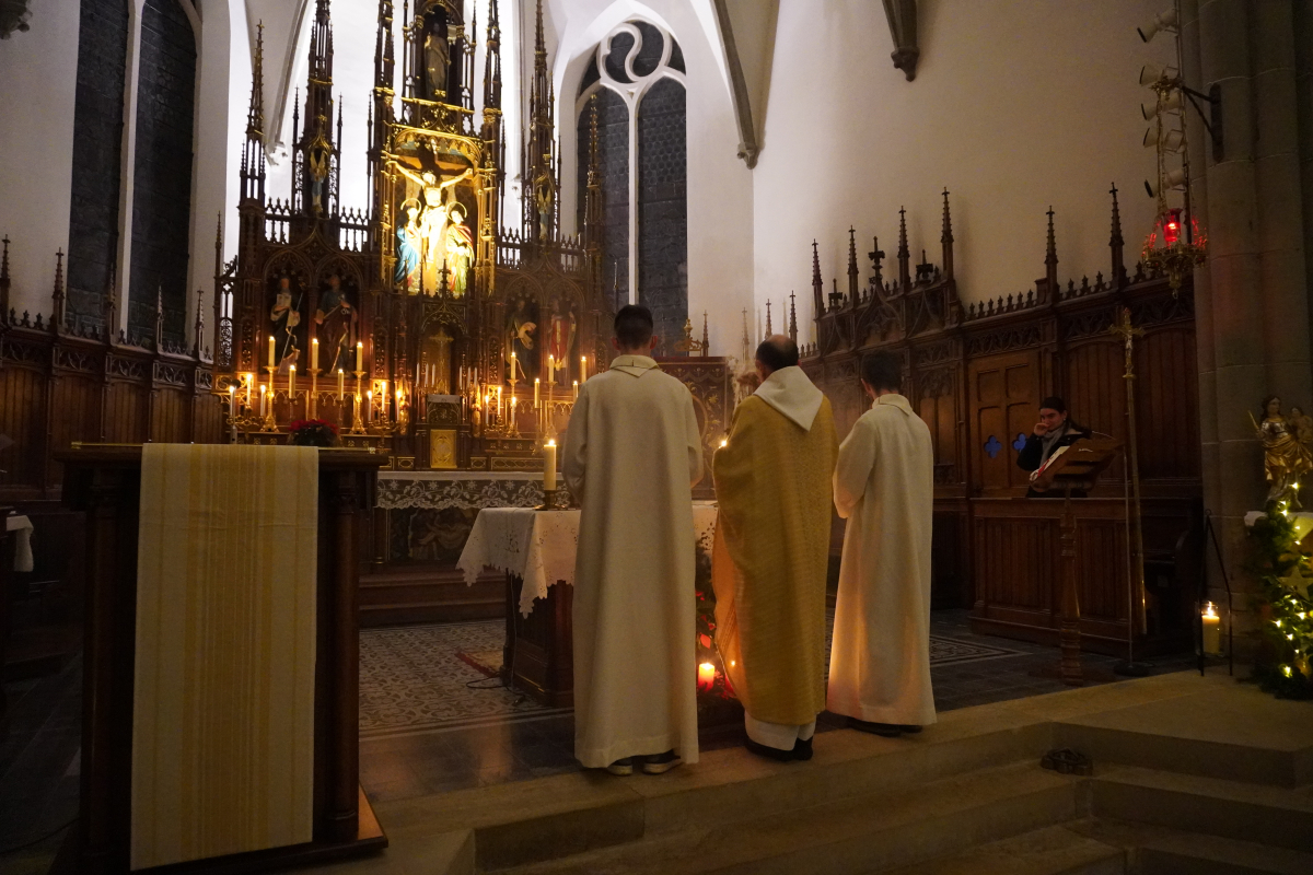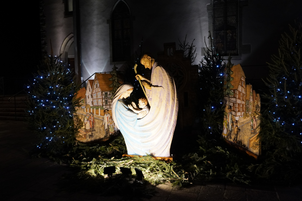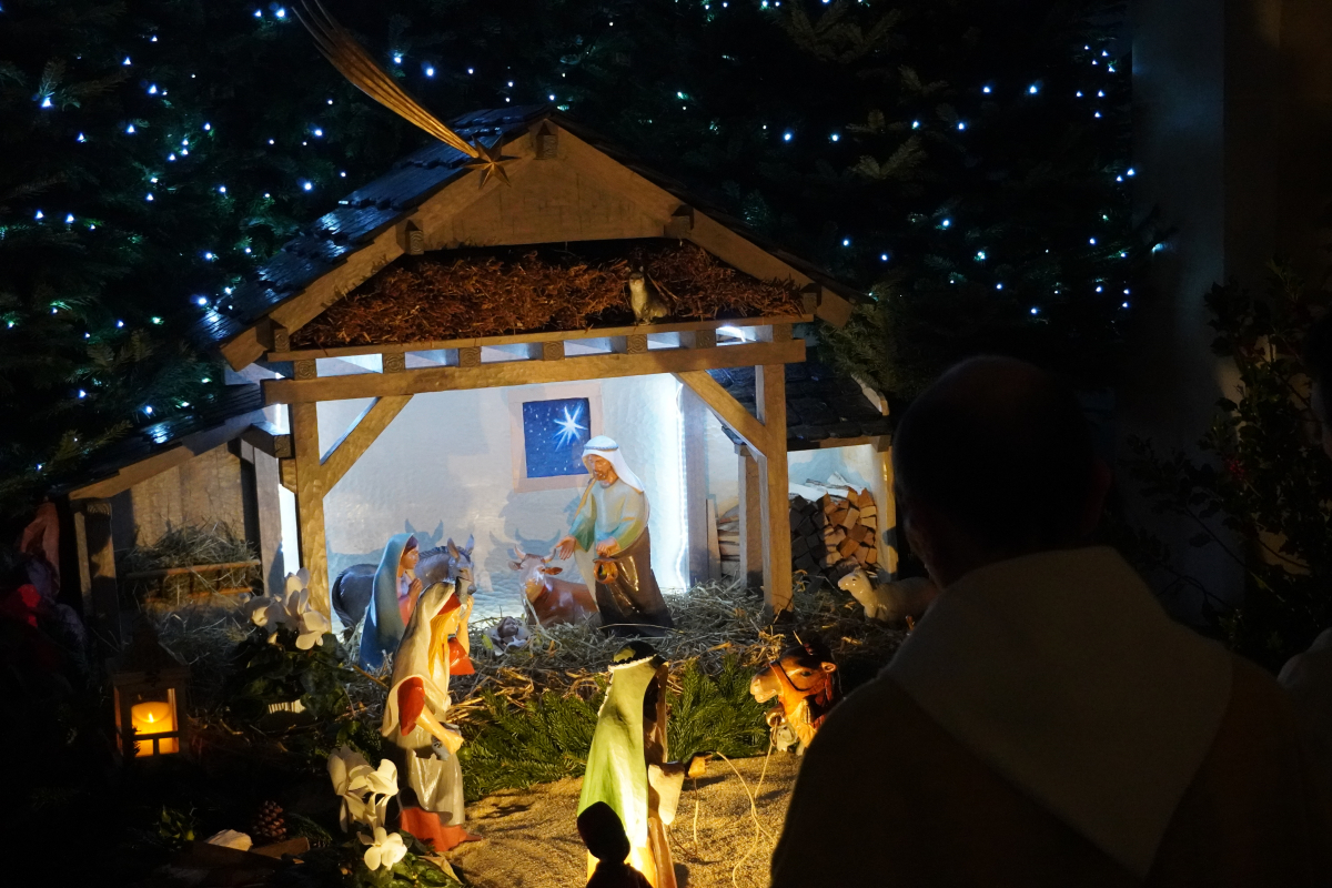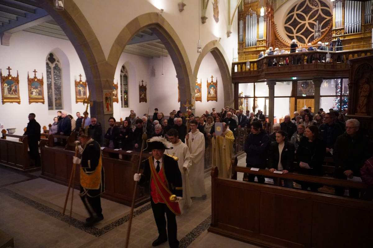 Cette année, la messe de minuit a été célébrée dans l'église Sts Pierre et Paul de Waldighoffen, point de rencontre de nombreux fidèles venus aussi d'autres communautés de paroisses avoisinantes. C'est donc dans une belle ferveur que cet office s'est déroulé en débutant, dans la pénombre, par la mise en place dans la crèche de "l'Enfant Jésus". La pénombre a disparu progressivement lorsque le "Gloria" a débuté pour être en pleine lumière à la fin de celui-ci pendant que les 5 cloches sonnaient à toutes volées pour annoncer la naissance du Christ.