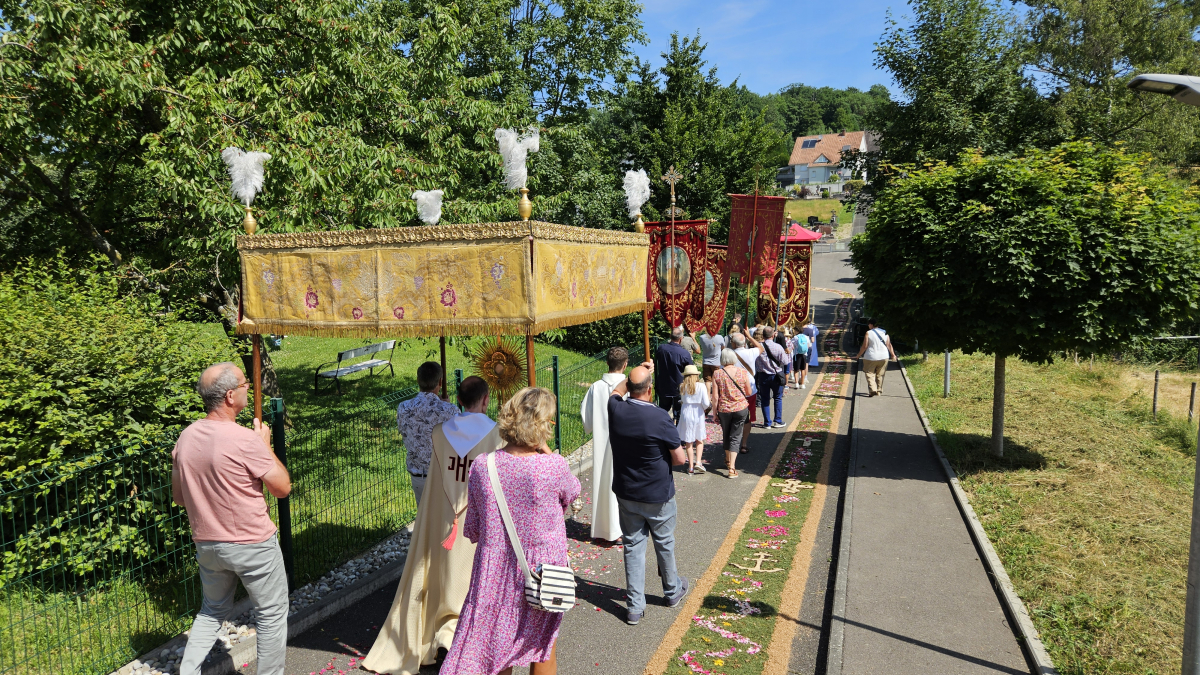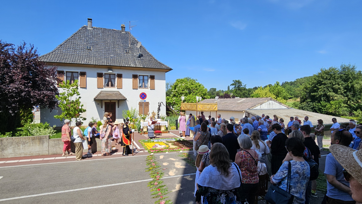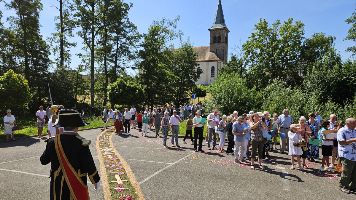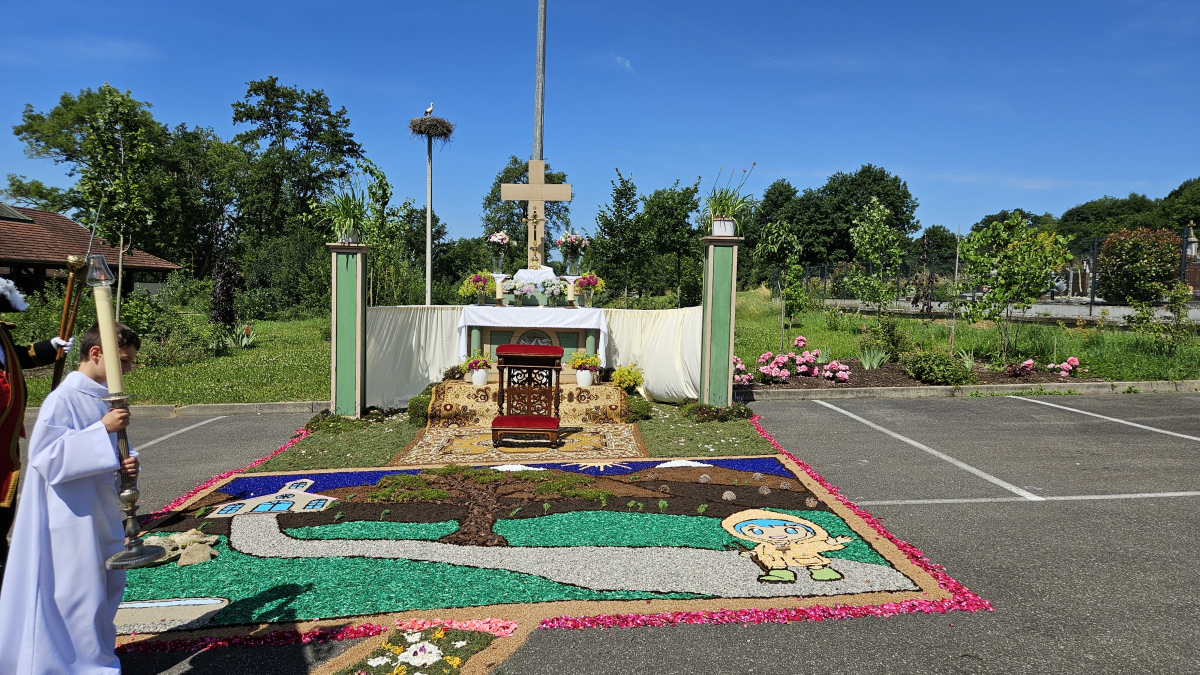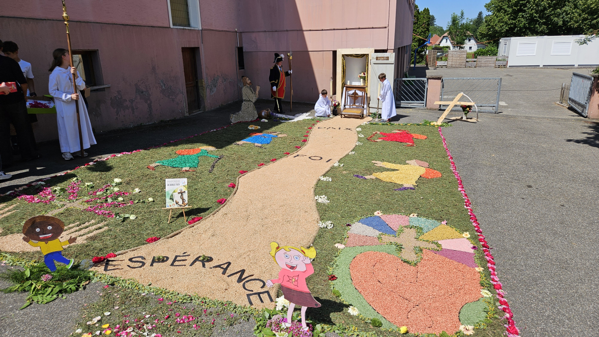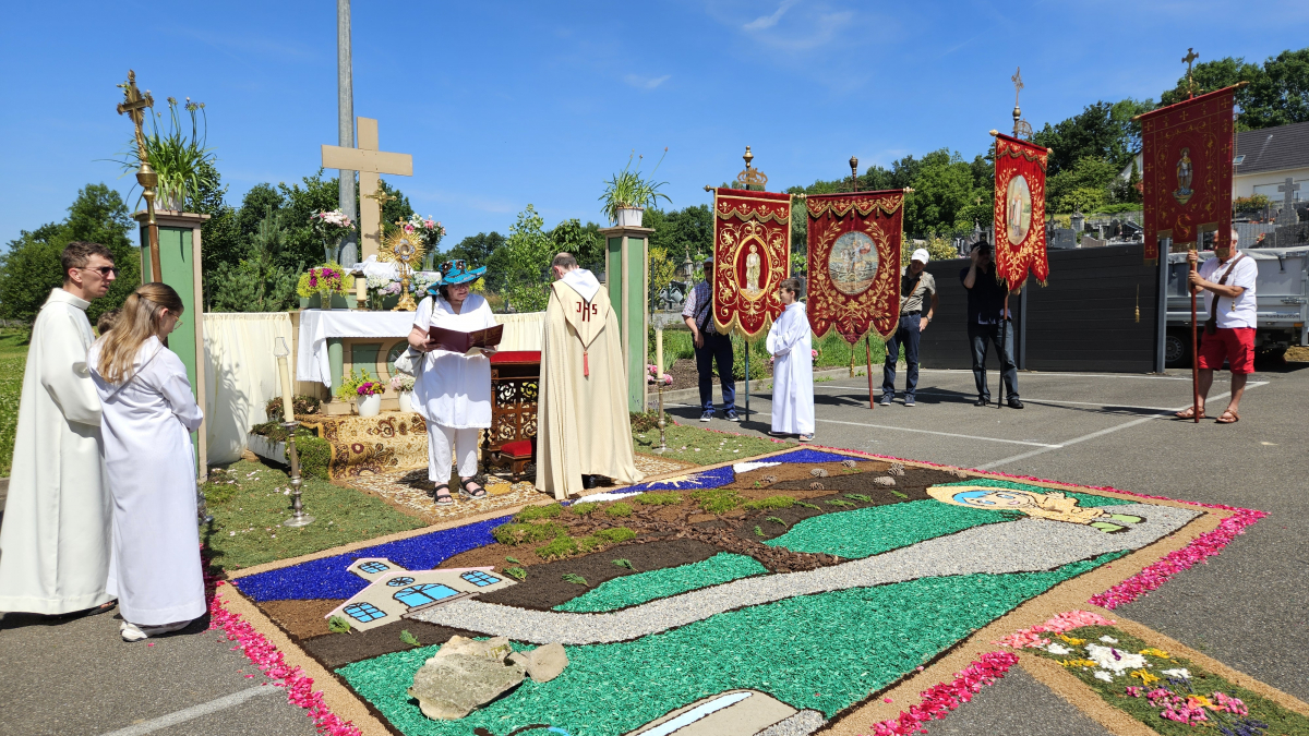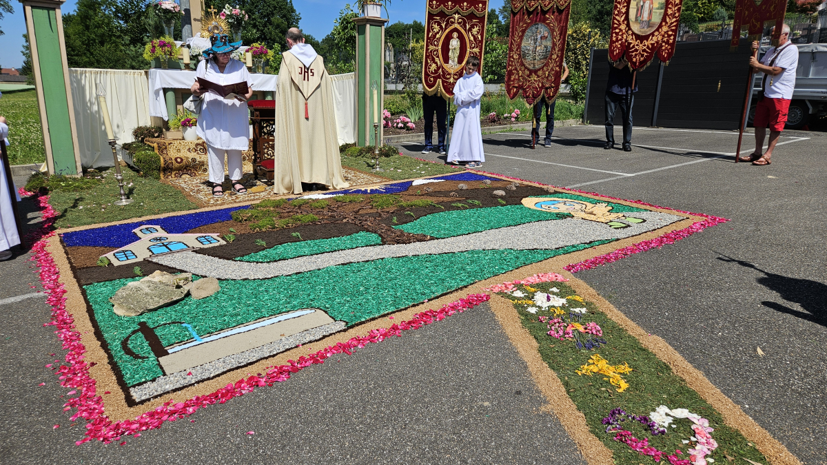 Cette année encore, à Muespach, un bon groupe de personnes aux mains agiles était à pied d'œuvre dès les premières lueurs du jour pour réaliser, comme à l'habitude, les magnifiques tapis de fleurs et orner les trois reposoirs pour la procession du Saint-Sacrement.