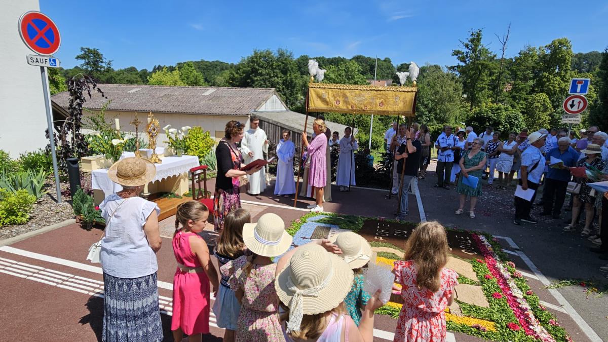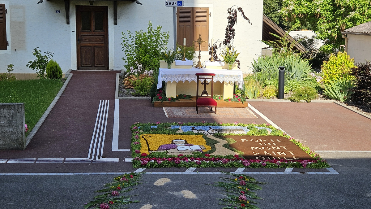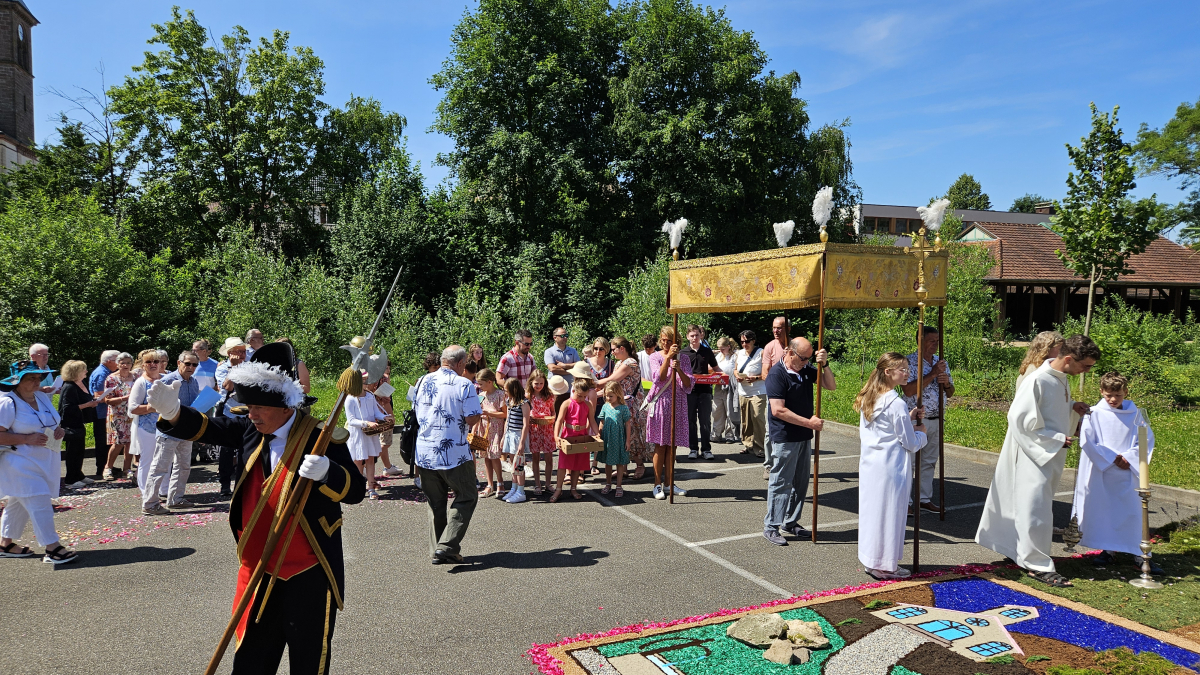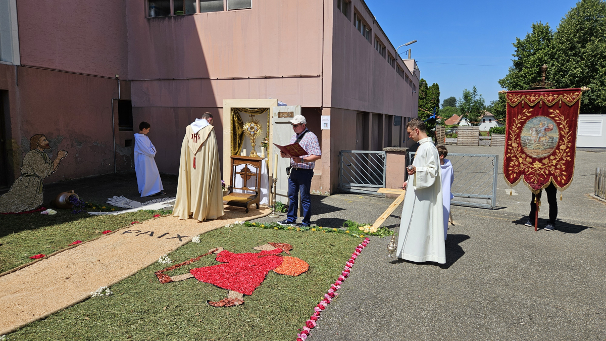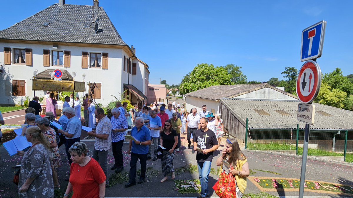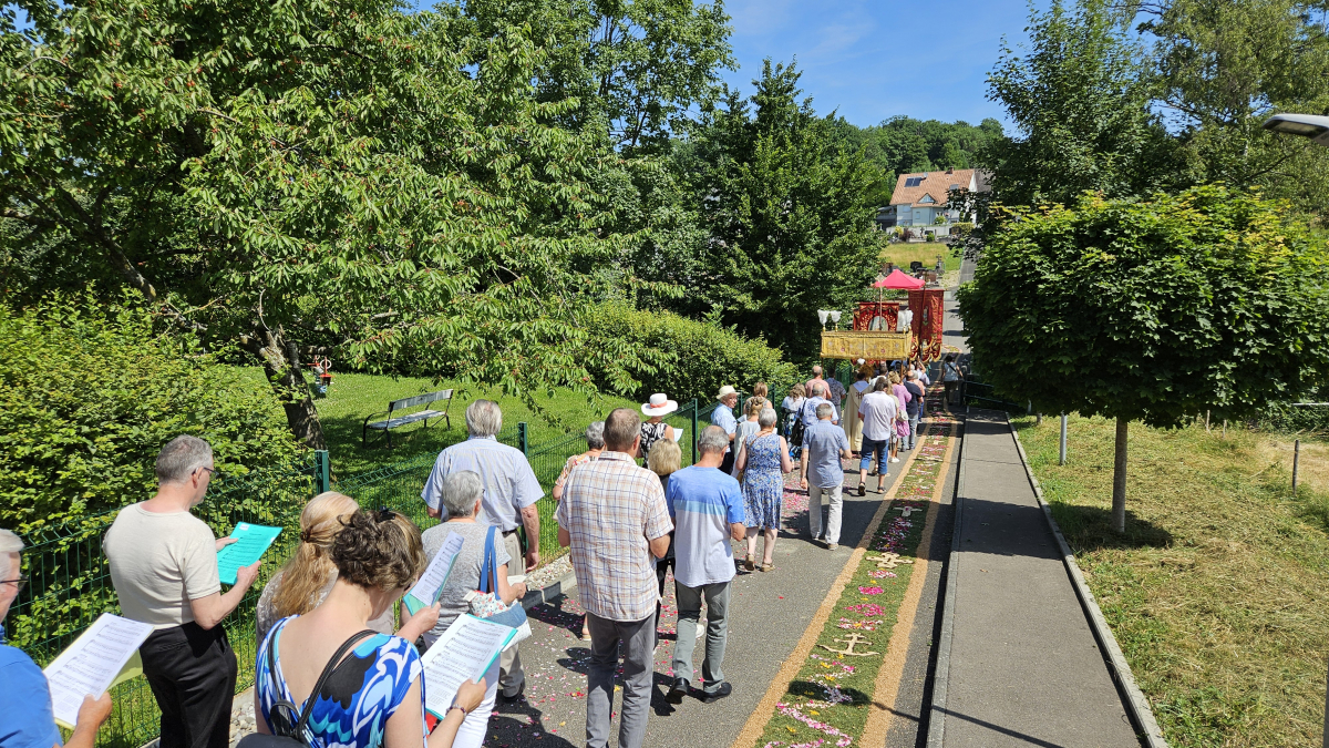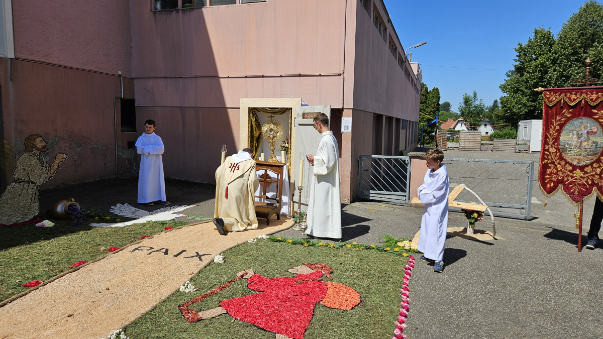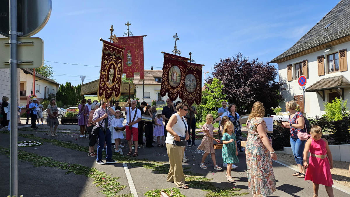 Cette année encore, à Muespach, un bon groupe de personnes aux mains agiles était à pied d'œuvre dès les premières lueurs du jour pour réaliser, comme à l'habitude, les magnifiques tapis de fleurs et orner les trois reposoirs pour la procession du Saint-Sacrement.