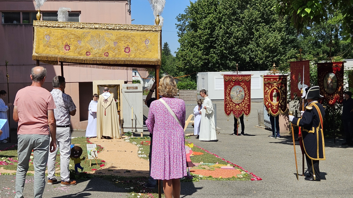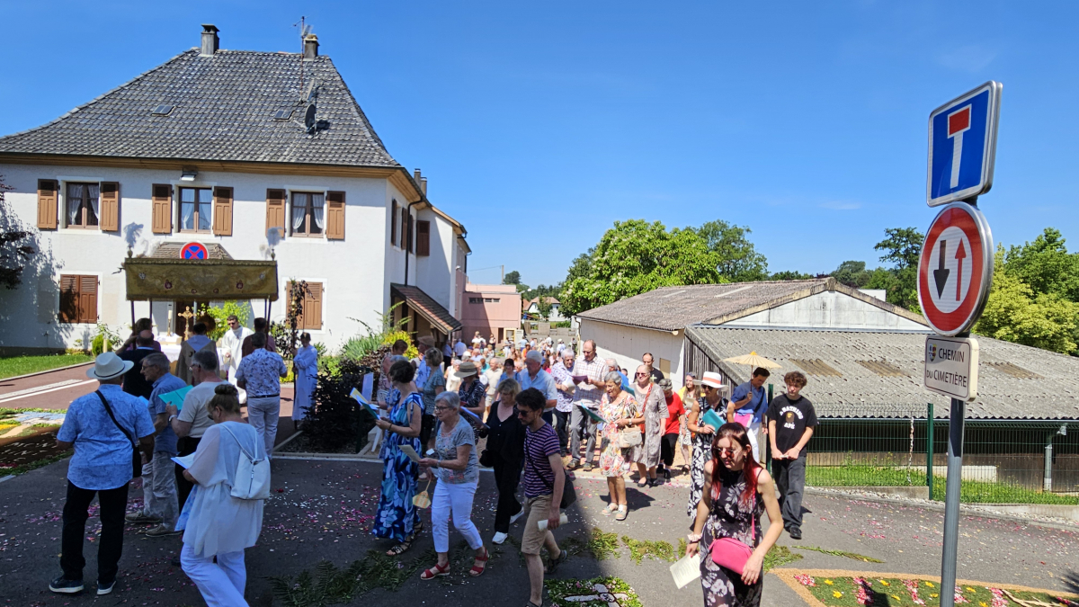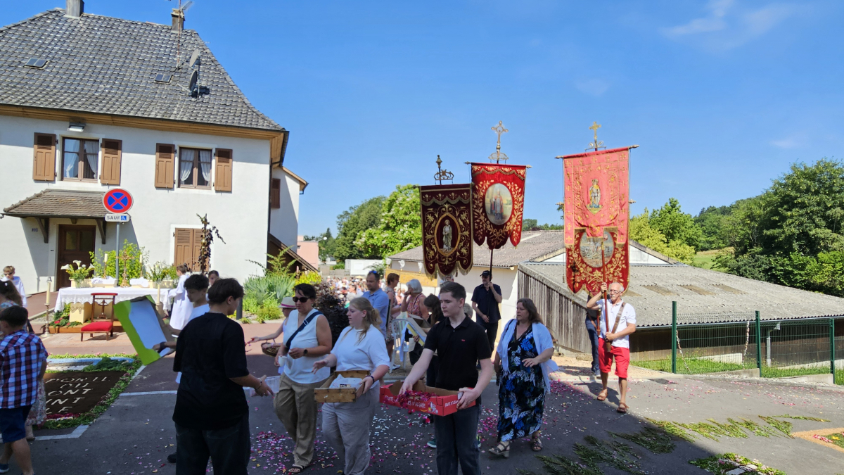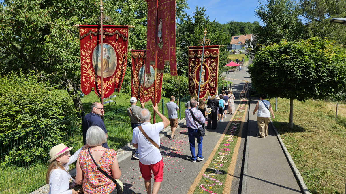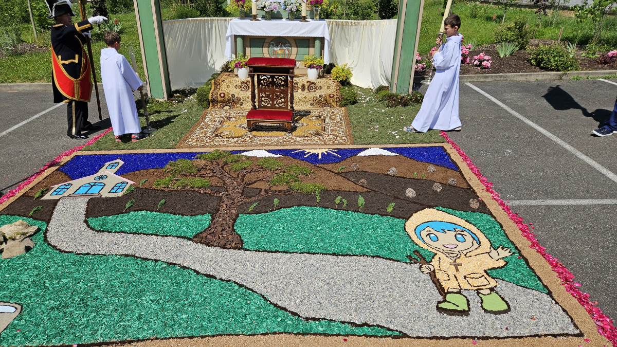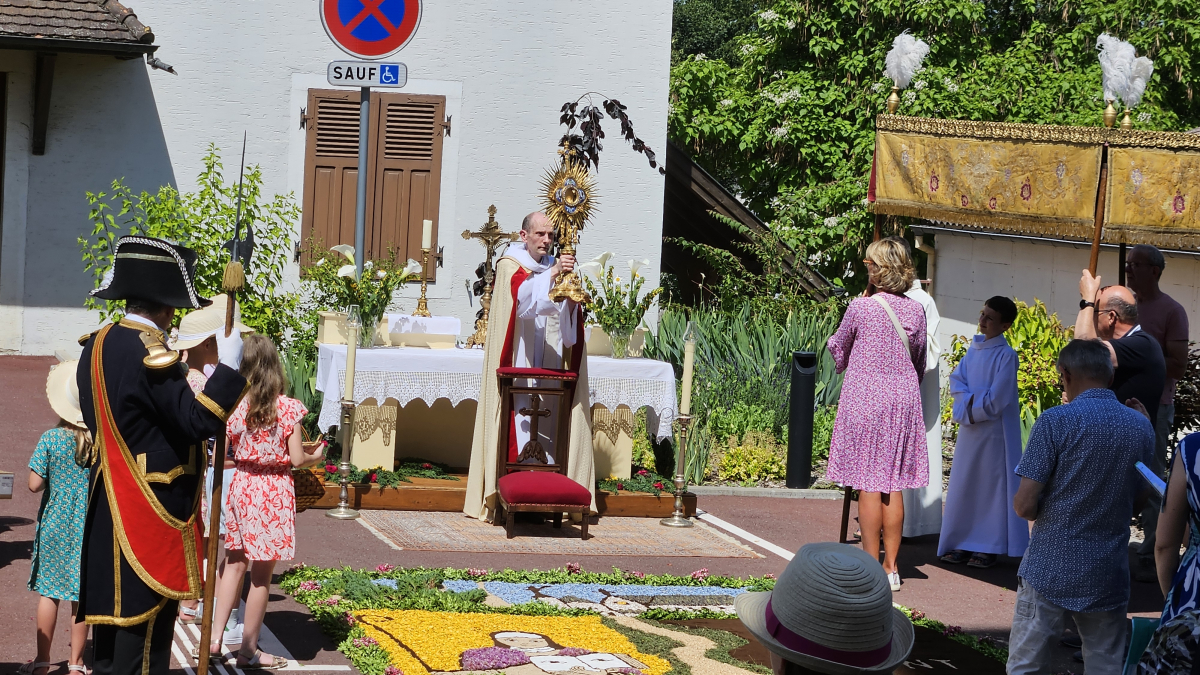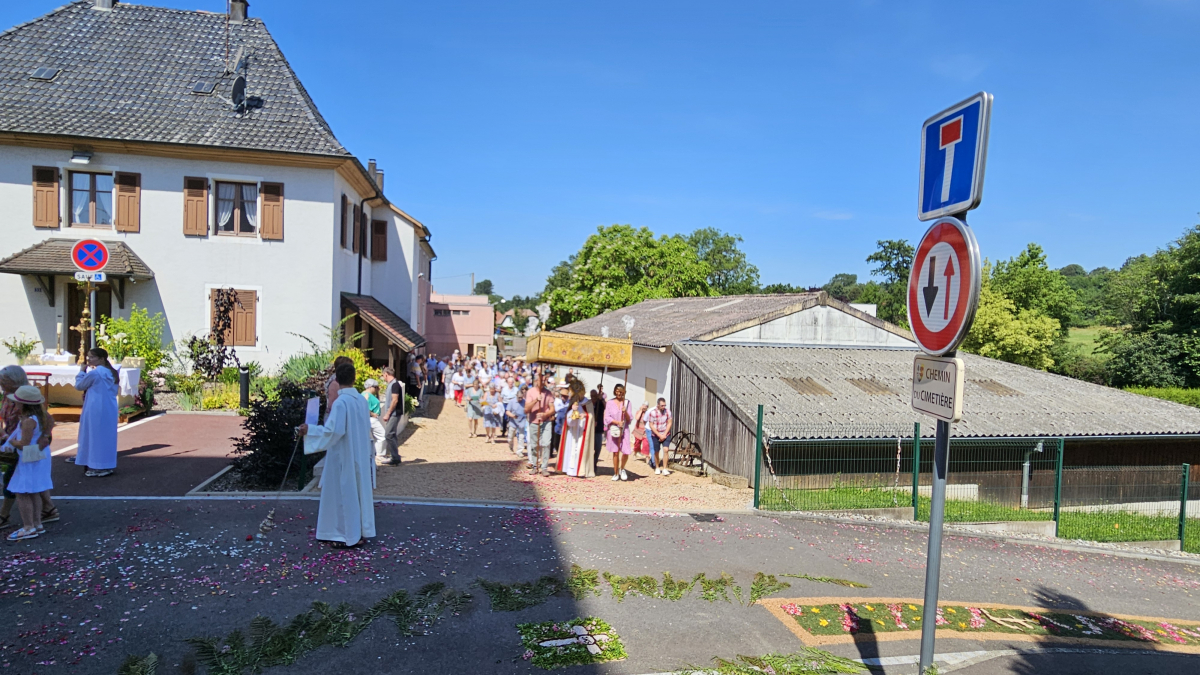 Cette année encore, à Muespach, un bon groupe de personnes aux mains agiles était à pied d'œuvre dès les premières lueurs du jour pour réaliser, comme à l'habitude, les magnifiques tapis de fleurs et orner les trois reposoirs pour la procession du Saint-Sacrement.