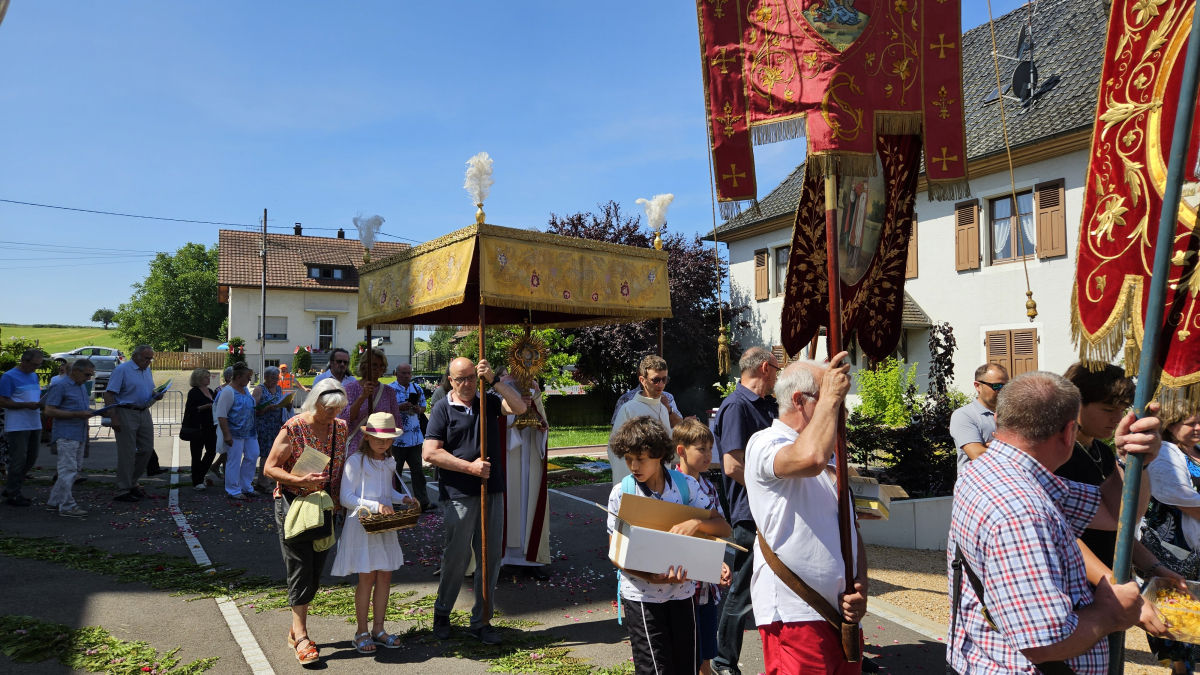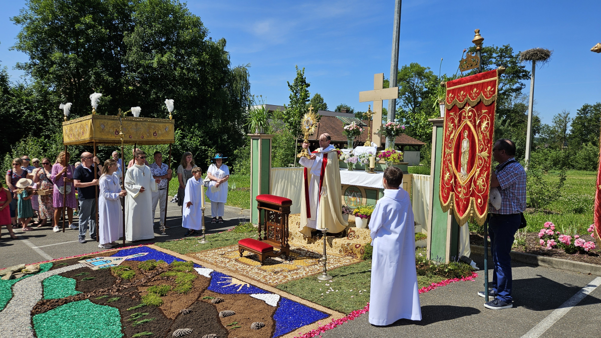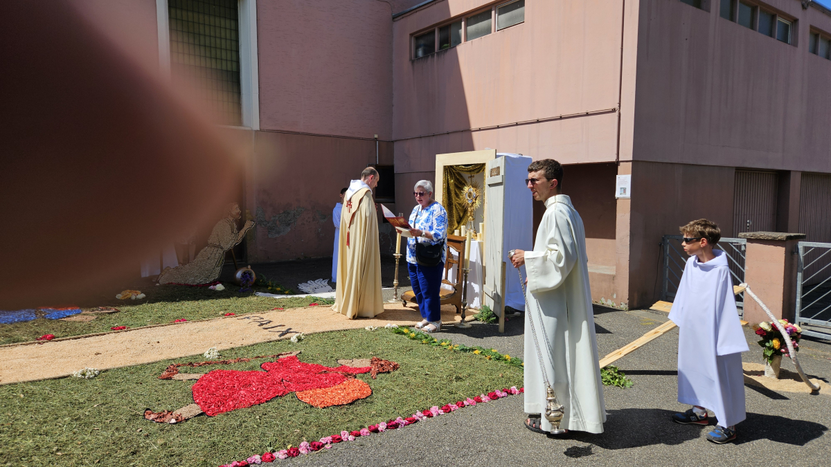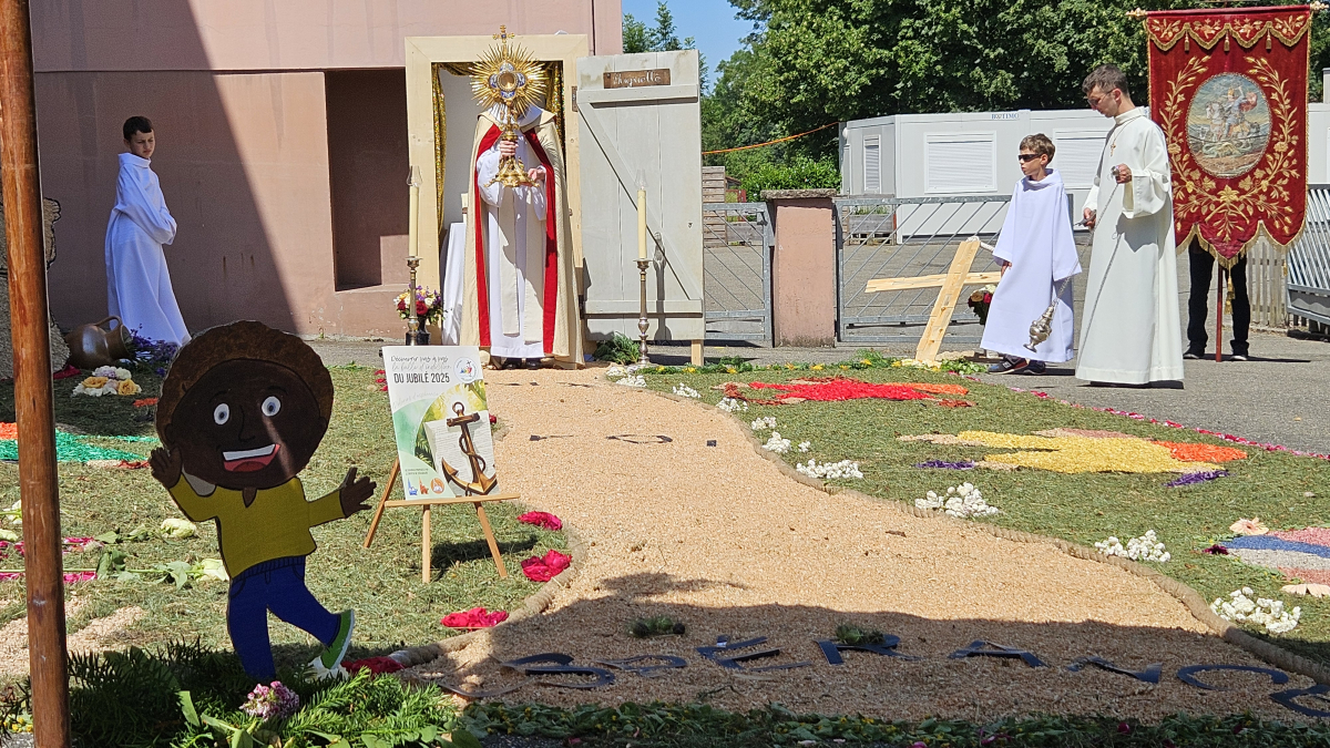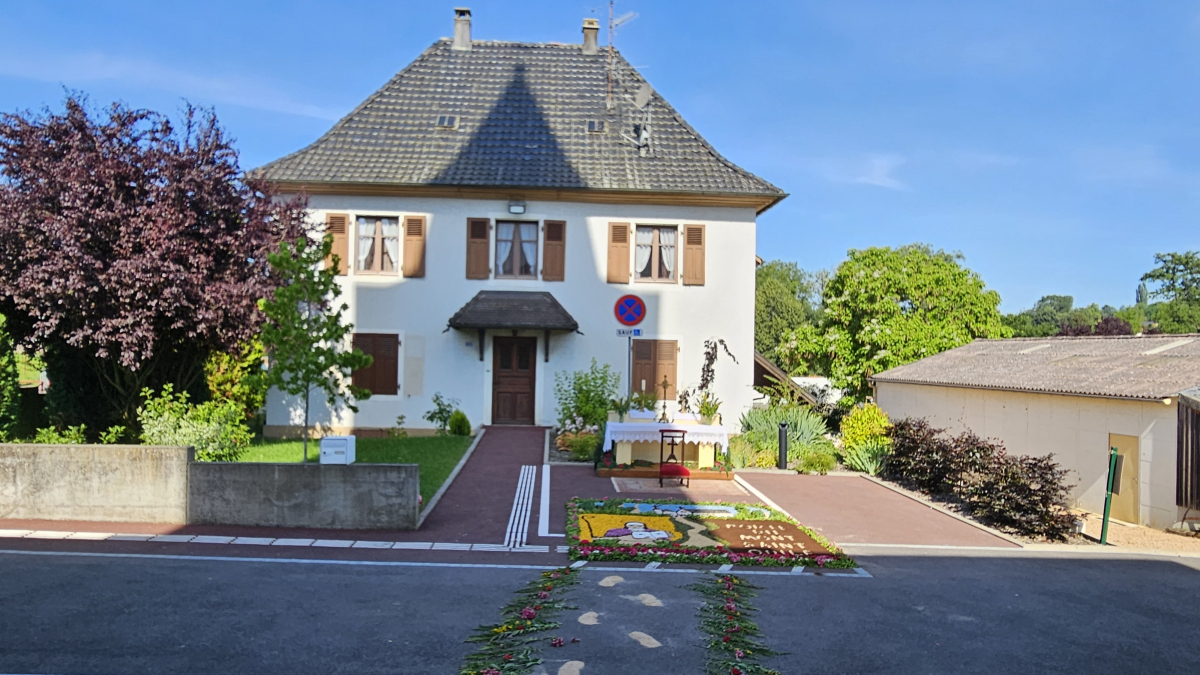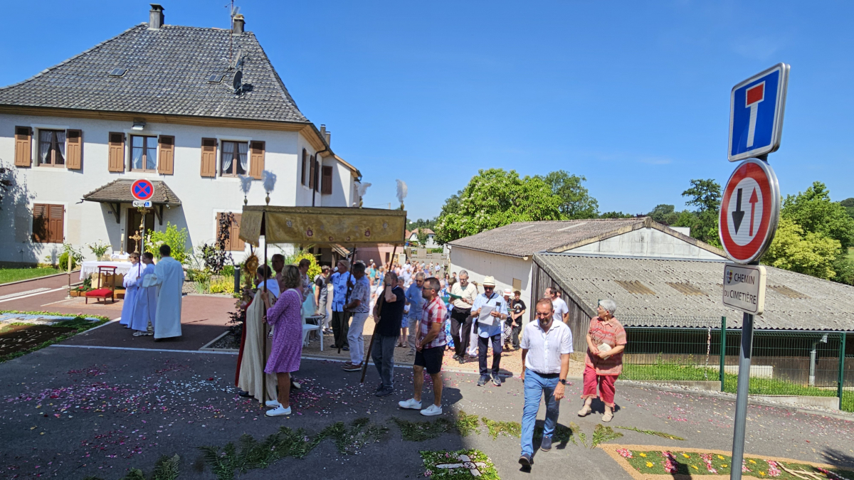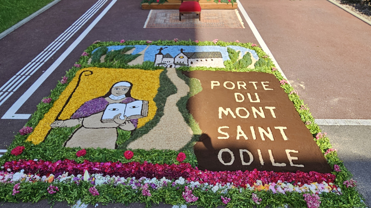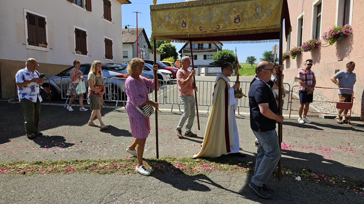 Cette année encore, à Muespach, un bon groupe de personnes aux mains agiles était à pied d'œuvre dès les premières lueurs du jour pour réaliser, comme à l'habitude, les magnifiques tapis de fleurs et orner les trois reposoirs pour la procession du Saint-Sacrement.
