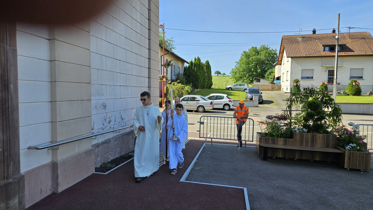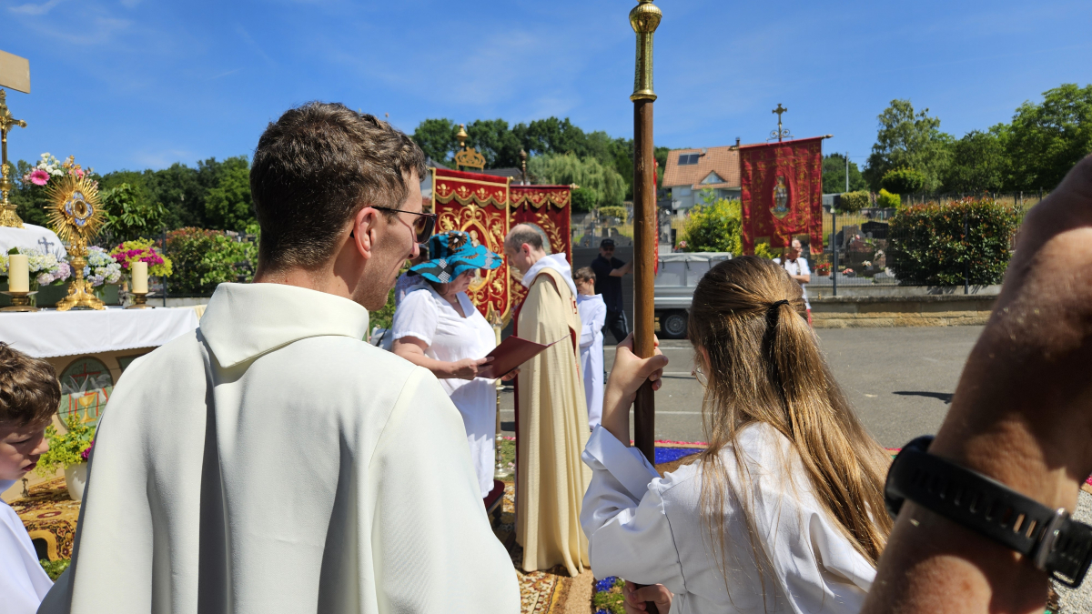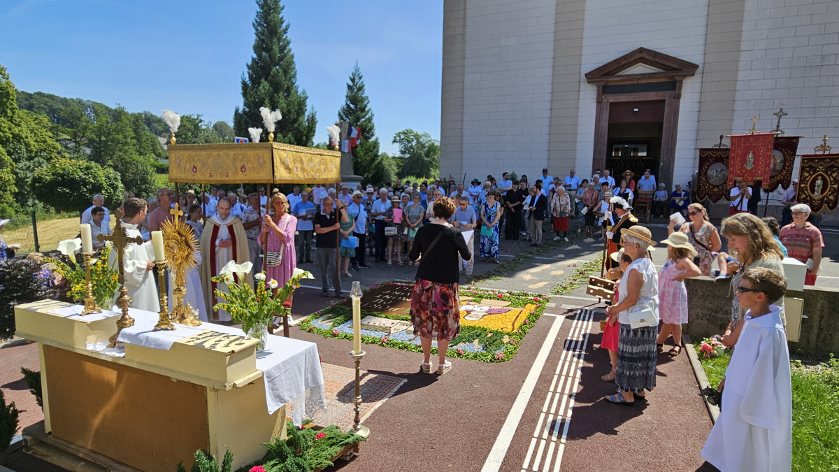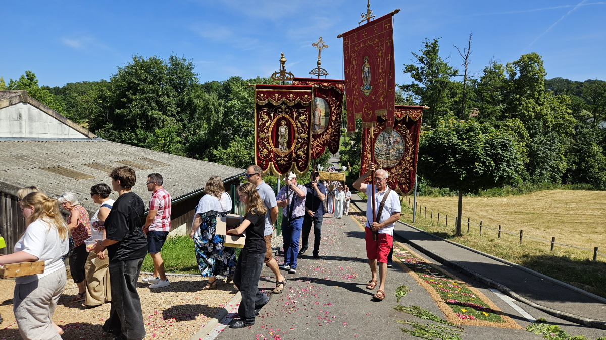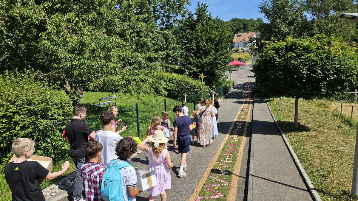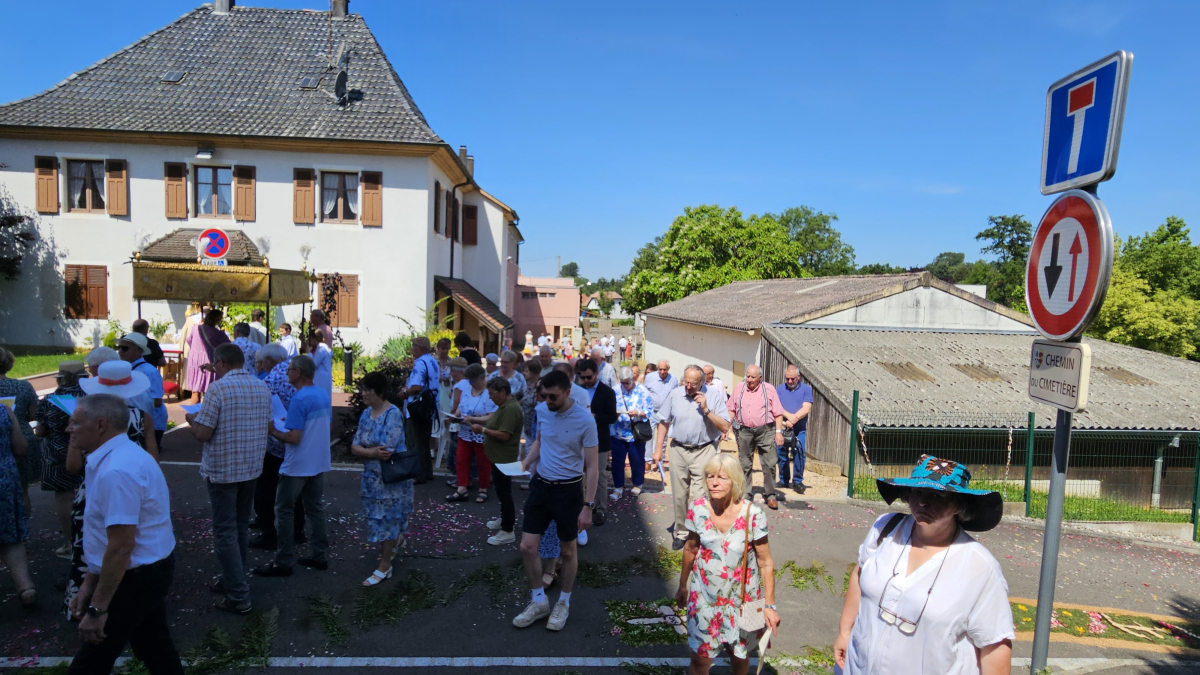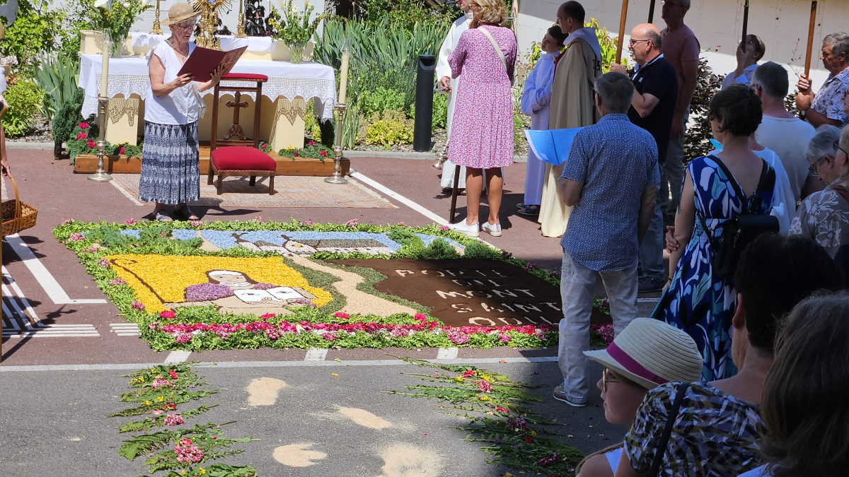 Cette année encore, à Muespach, un bon groupe de personnes aux mains agiles était à pied d'œuvre dès les premières lueurs du jour pour réaliser, comme à l'habitude, les magnifiques tapis de fleurs et orner les trois reposoirs pour la procession du Saint-Sacrement.