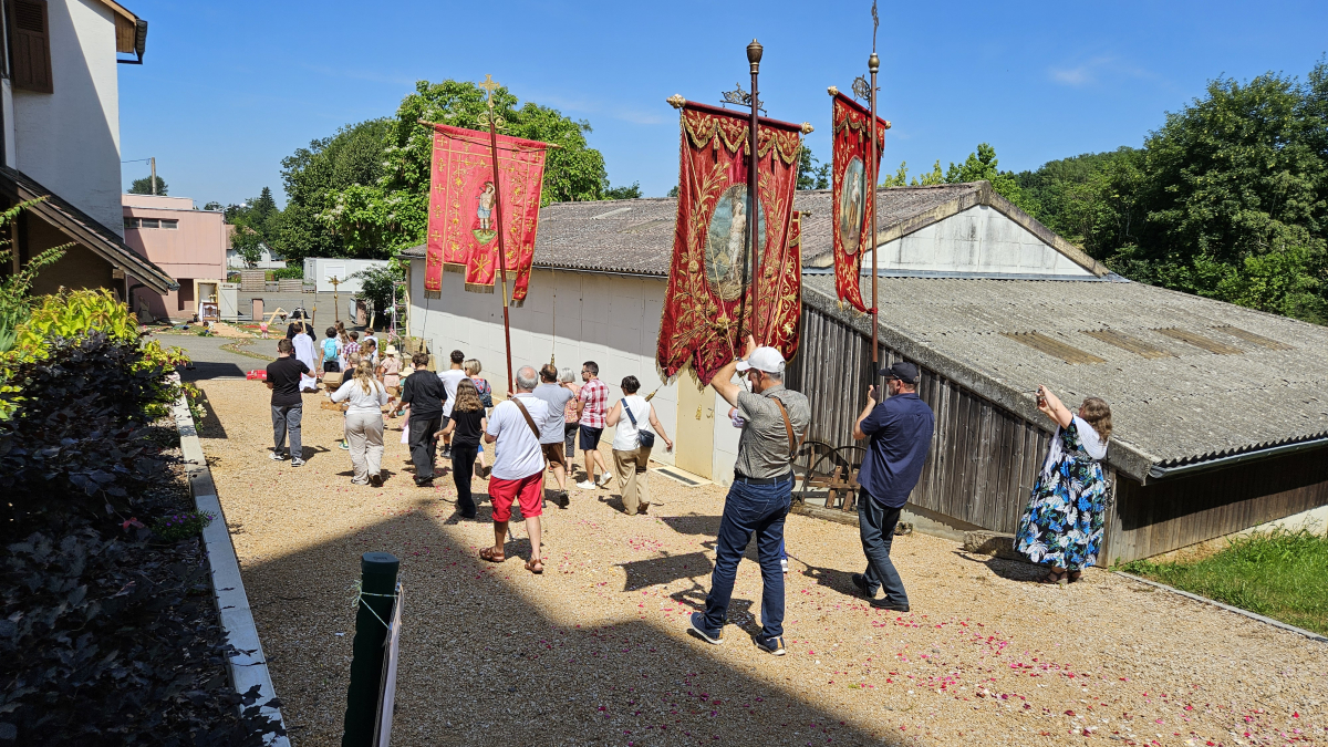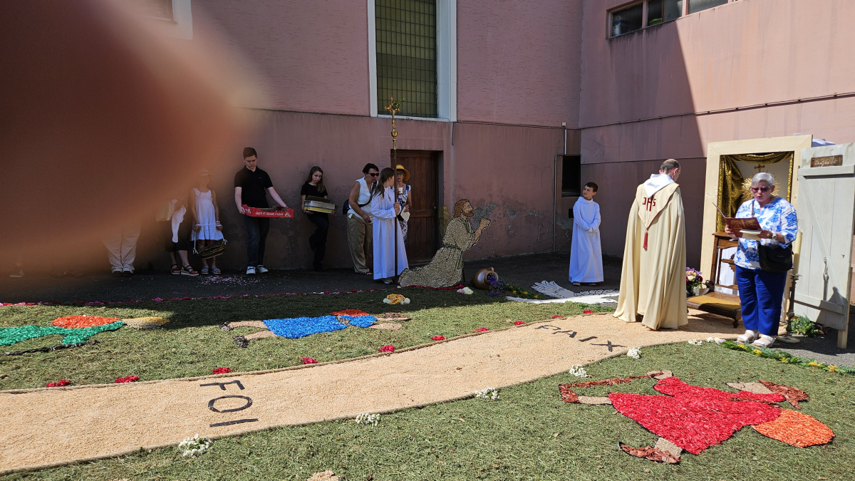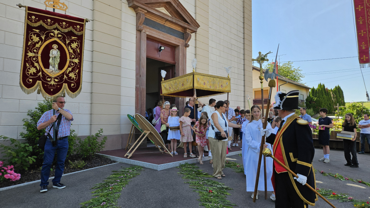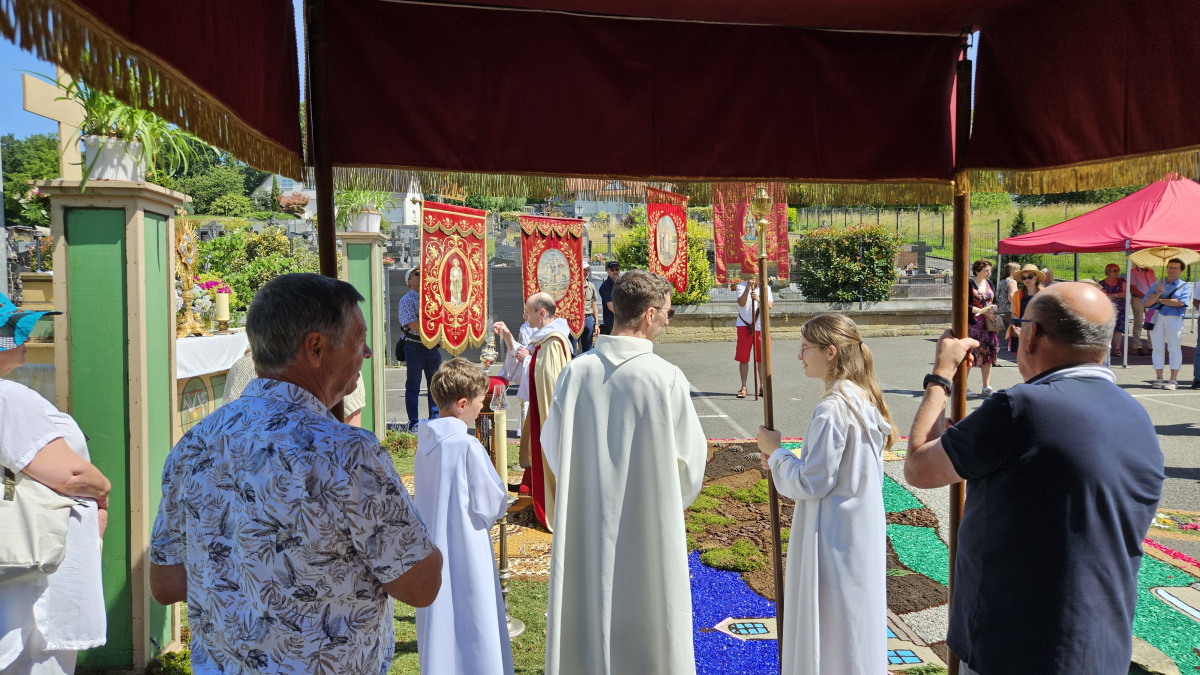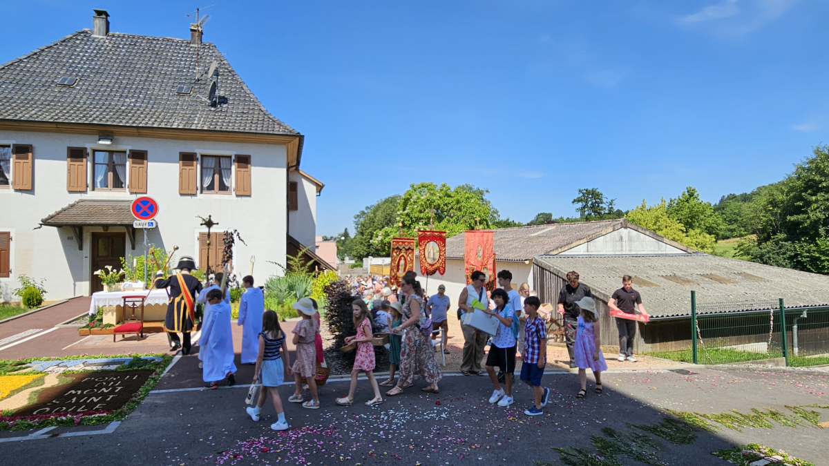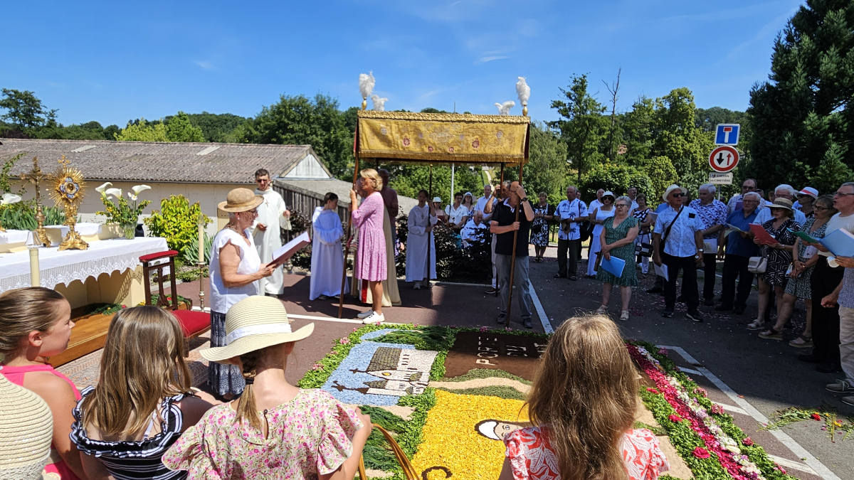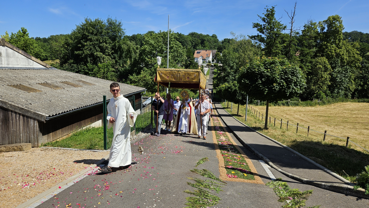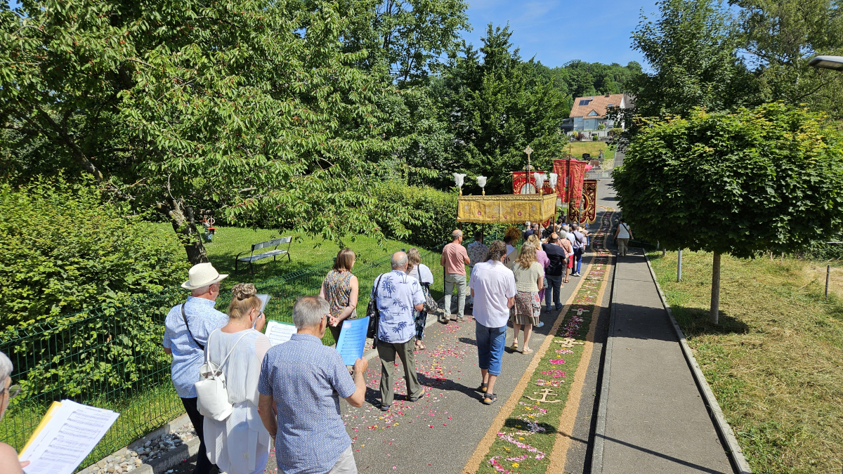 Cette année encore, à Muespach, un bon groupe de personnes aux mains agiles était à pied d'œuvre dès les premières lueurs du jour pour réaliser, comme à l'habitude, les magnifiques tapis de fleurs et orner les trois reposoirs pour la procession du Saint-Sacrement.