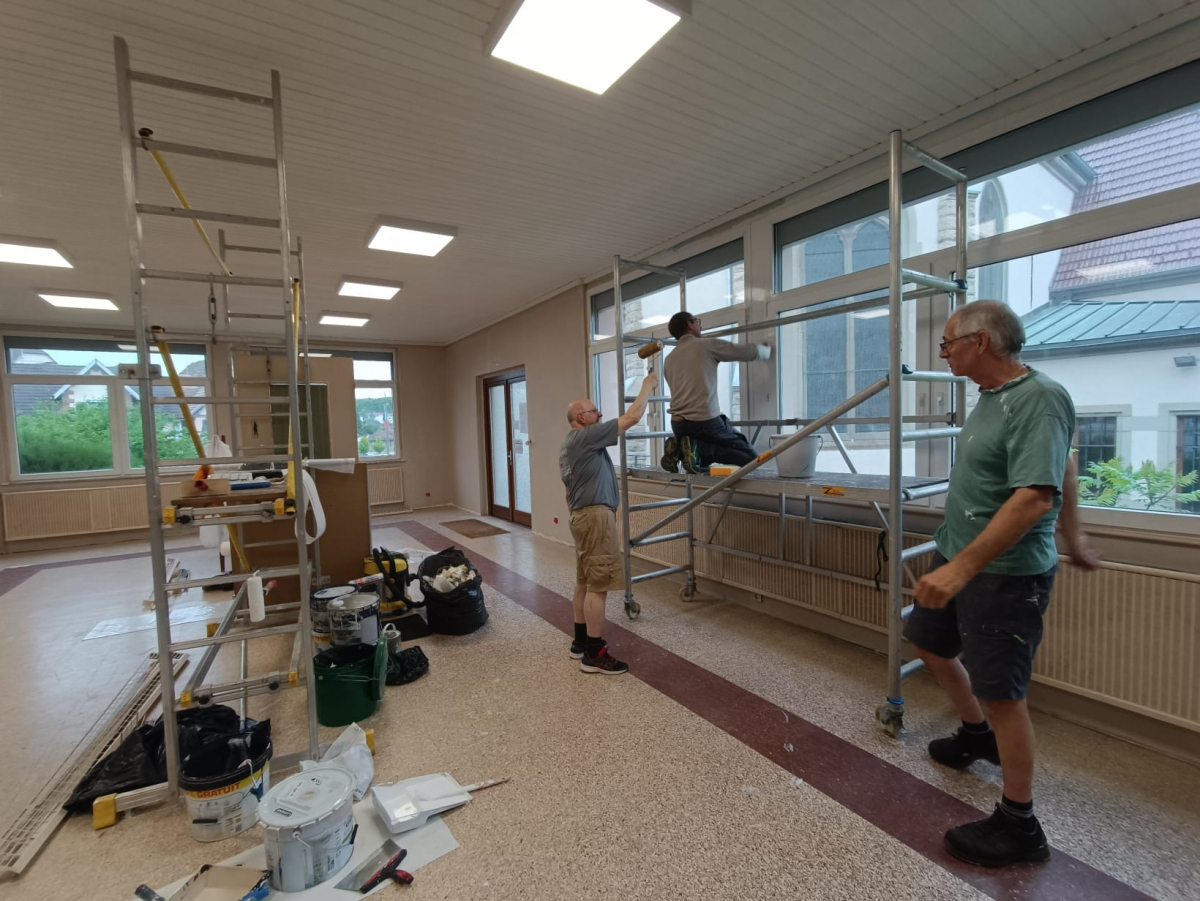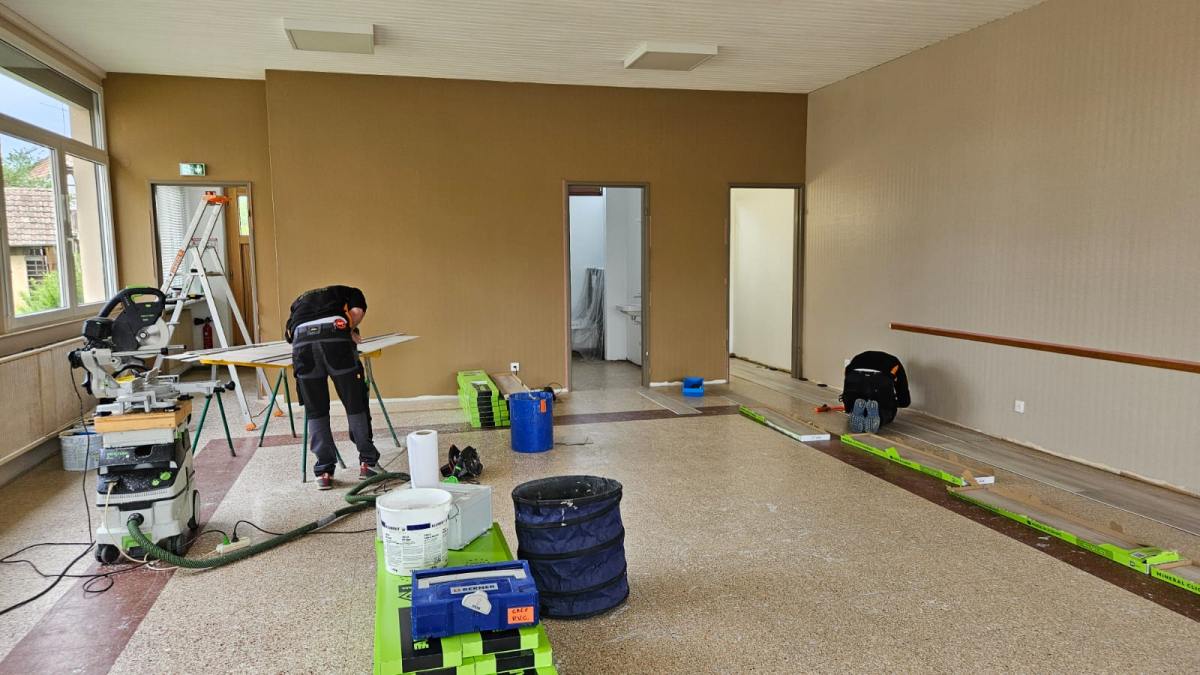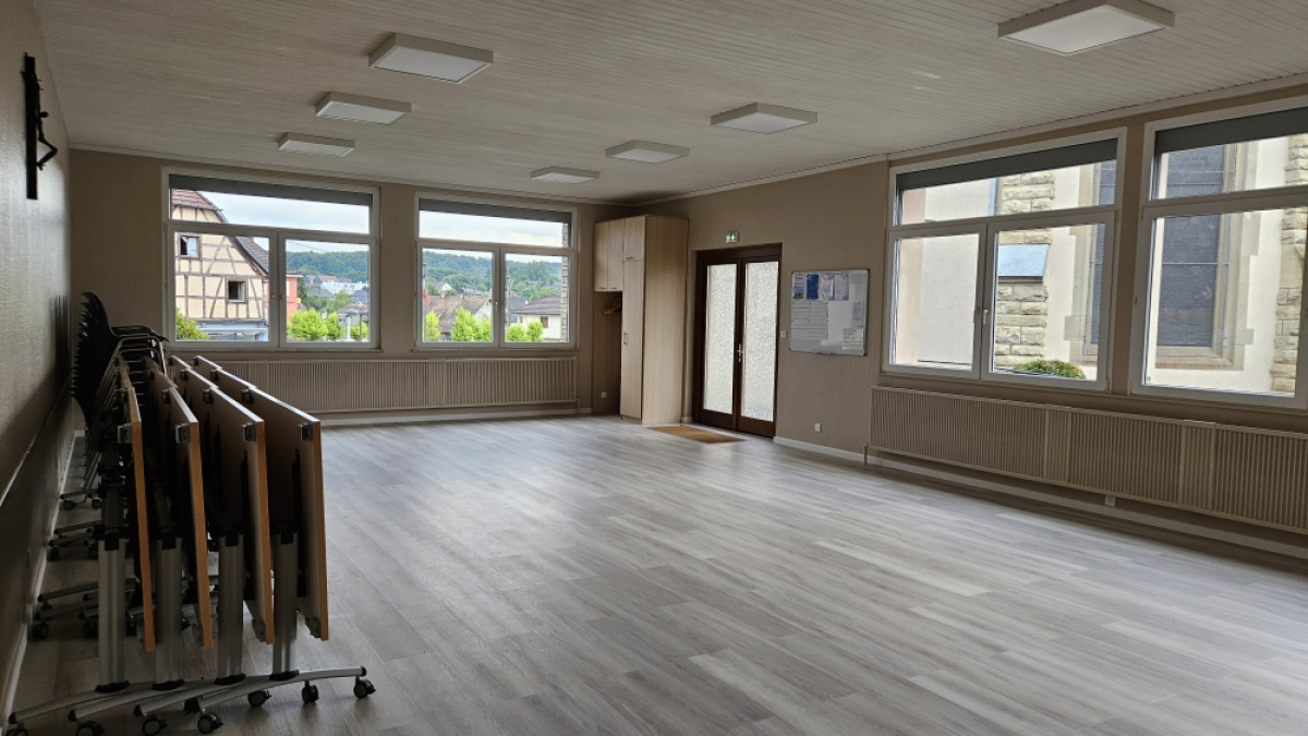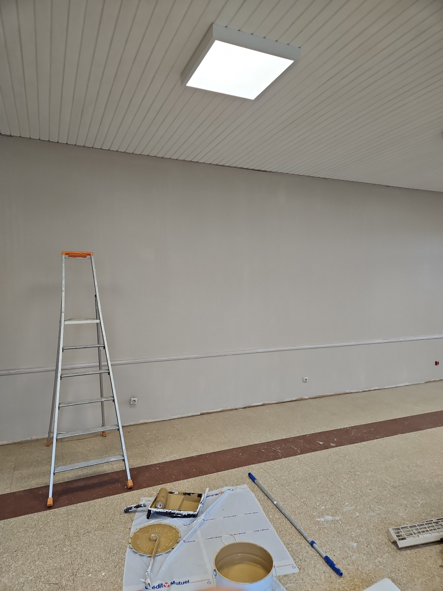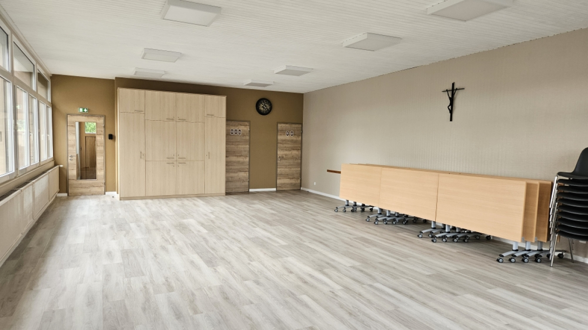 Suite à notre réunion du budget de février 2025, nous avons décidé d’entamer le processus de rénovation de la salle du foyer tout d’abord en supprimant armoires et living qui encombraient les murs puis en remplaçant les toilettes, les luminaires, les prises, les interrupteurs et en repeignant plafonds et murs. L’adjonction de volets roulants à lames isolées renforcera l’isolation thermique en hiver. Des nouvelles portes d’intérieur et deux nouveaux placards sont venus prendre place afin d’accueillir au mieux chorales et catéchistes. Mais un fait inattendu lors de la réhabilitation des toilettes pour « p.m.r. », nous a obligé à couvrir le sol de l’ensemble du foyer, rajoutant un surcout de 10500 € au budget initial de 35000 €.