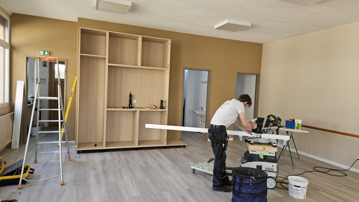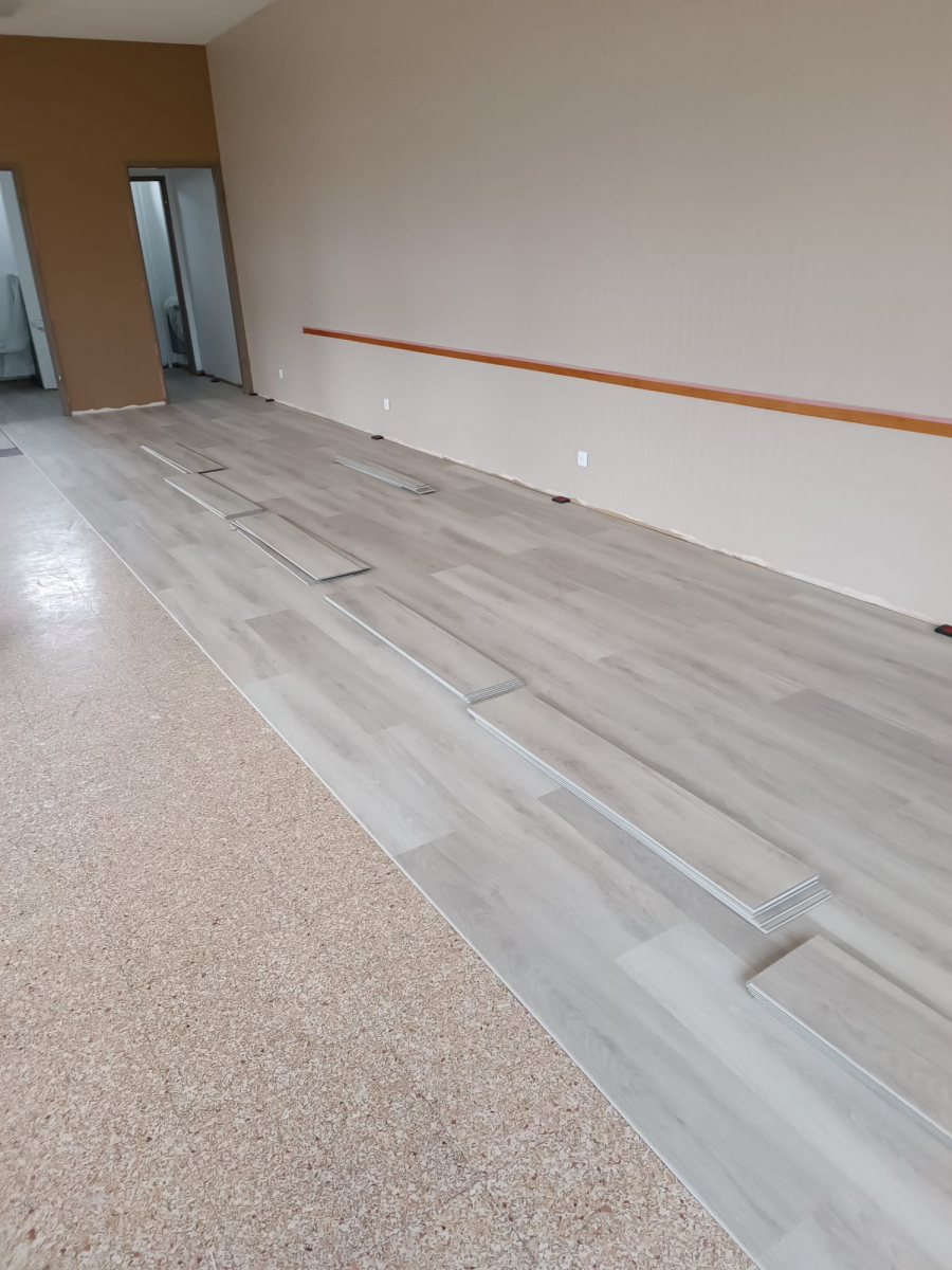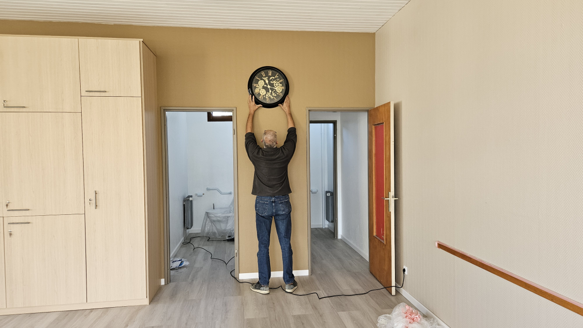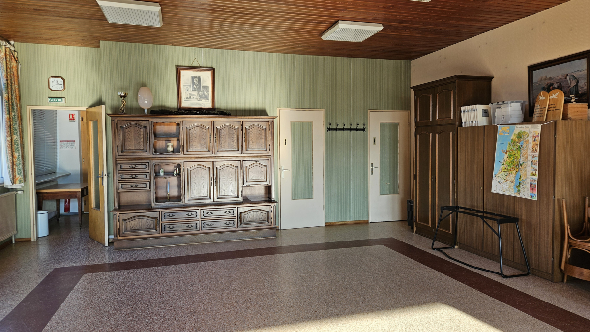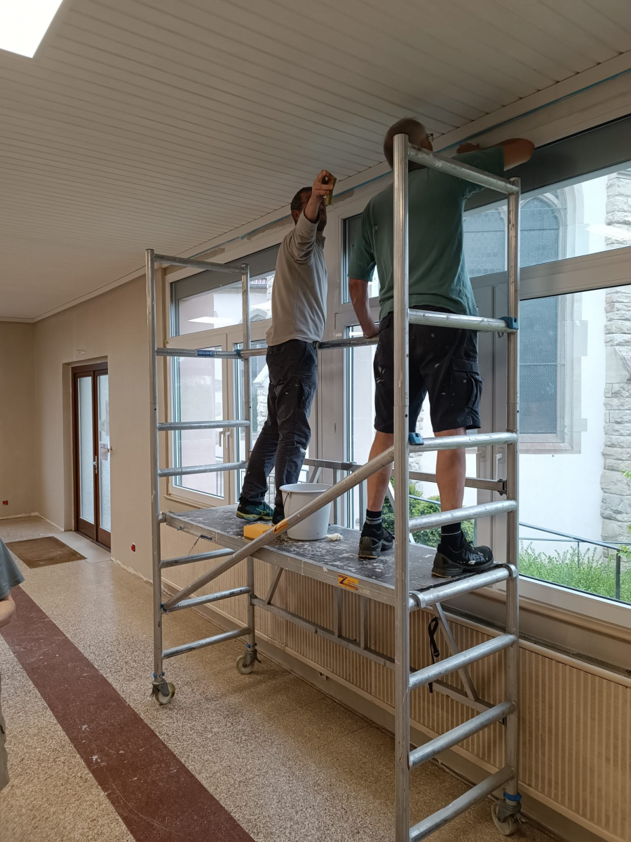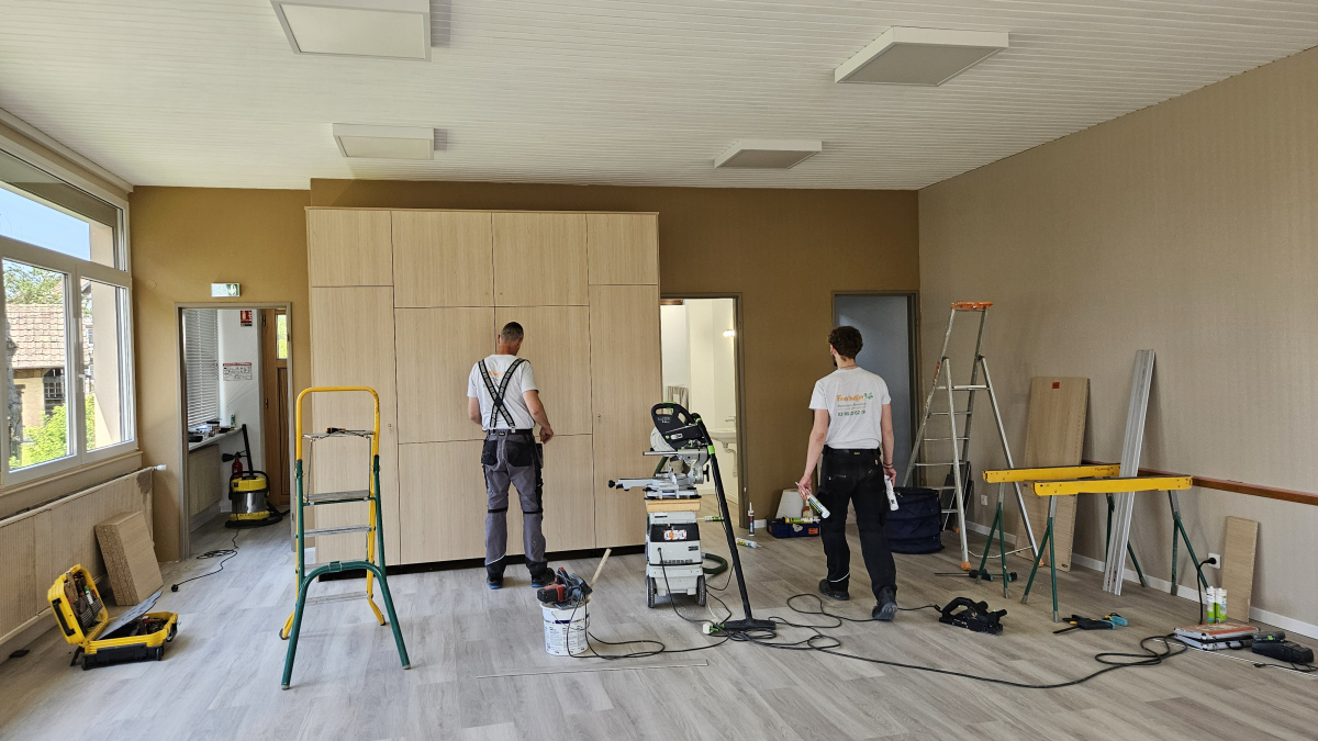 Suite à notre réunion du budget de février 2025, nous avons décidé d’entamer le processus de rénovation de la salle du foyer tout d’abord en supprimant armoires et living qui encombraient les murs puis en remplaçant les toilettes, les luminaires, les prises, les interrupteurs et en repeignant plafonds et murs. L’adjonction de volets roulants à lames isolées renforcera l’isolation thermique en hiver. Des nouvelles portes d’intérieur et deux nouveaux placards sont venus prendre place afin d’accueillir au mieux chorales et catéchistes. Mais un fait inattendu lors de la réhabilitation des toilettes pour « p.m.r. », nous a obligé à couvrir le sol de l’ensemble du foyer, rajoutant un surcout de 10500 € au budget initial de 35000 €.