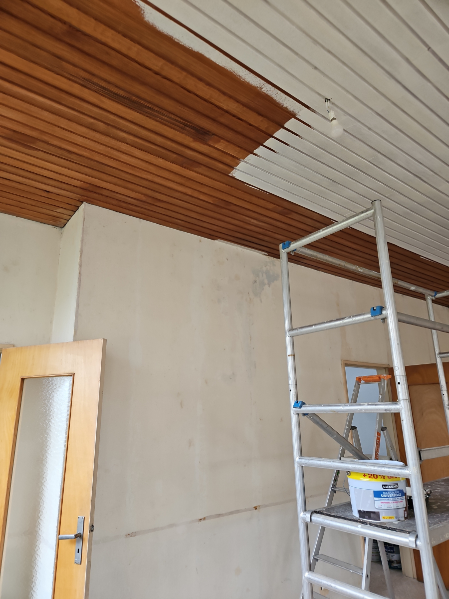En 2021, devant l’augmentation du nombre d’infiltrations provenant du toit, celui-ci a été entièrement remplacé, le bardage en bois et les planches de rive protégées par de l’aluminium laqué, le plafond isolé par 40 cm de ouate de cellulose et les gouttières changées. A partir de ce moment, nous débutons une lente réflexion sur la modernisation du foyer.