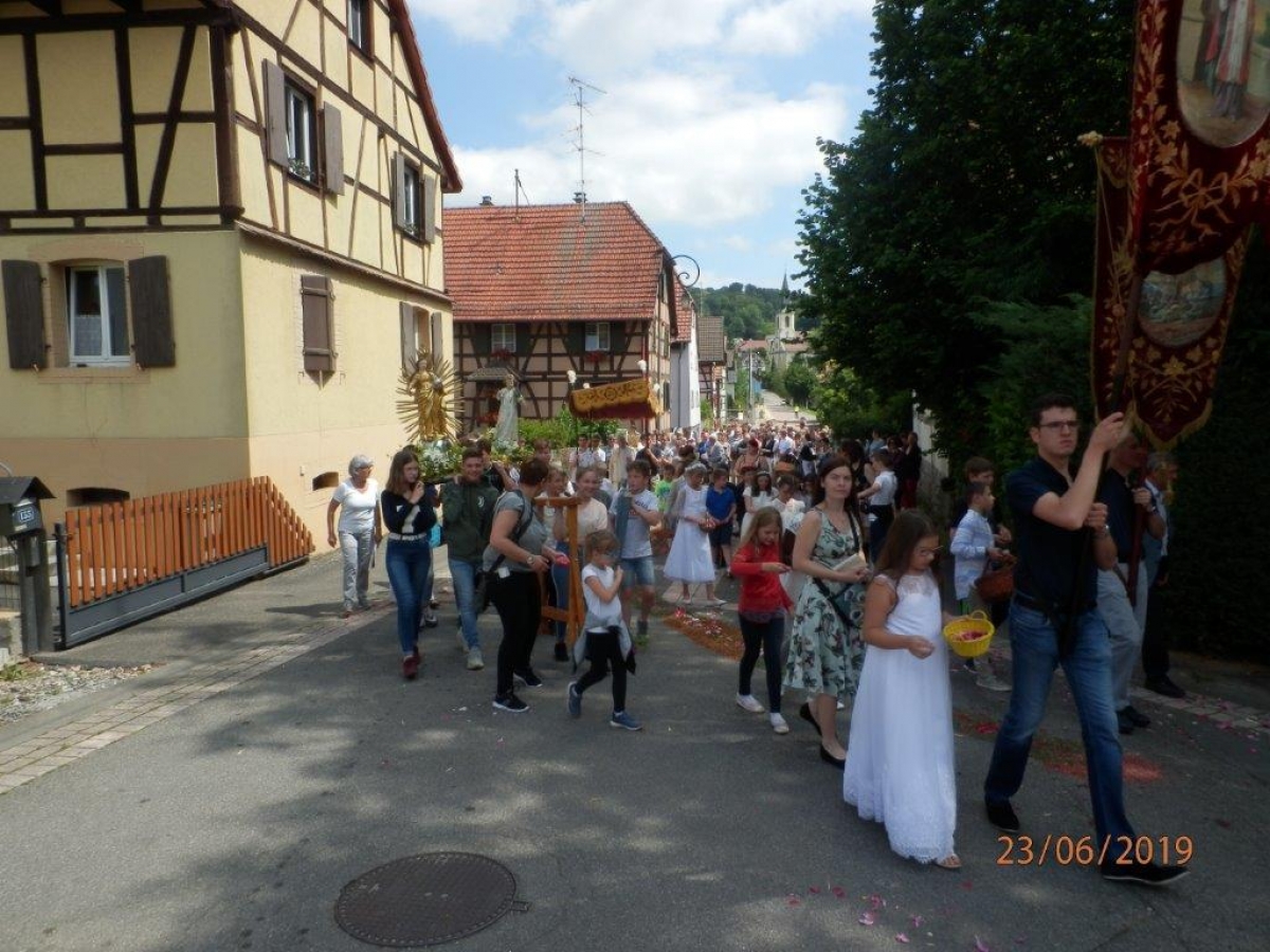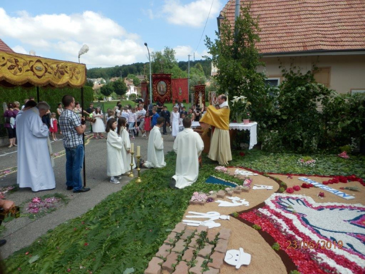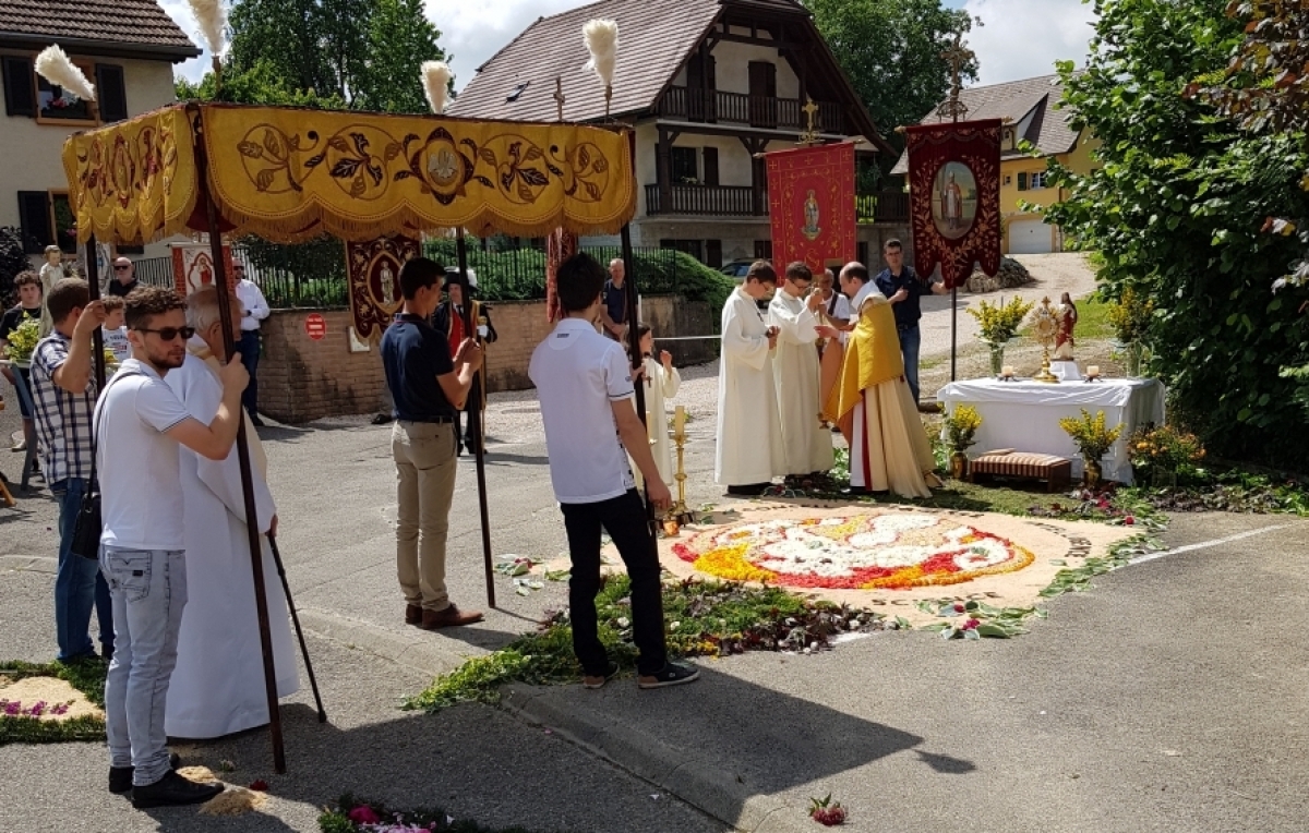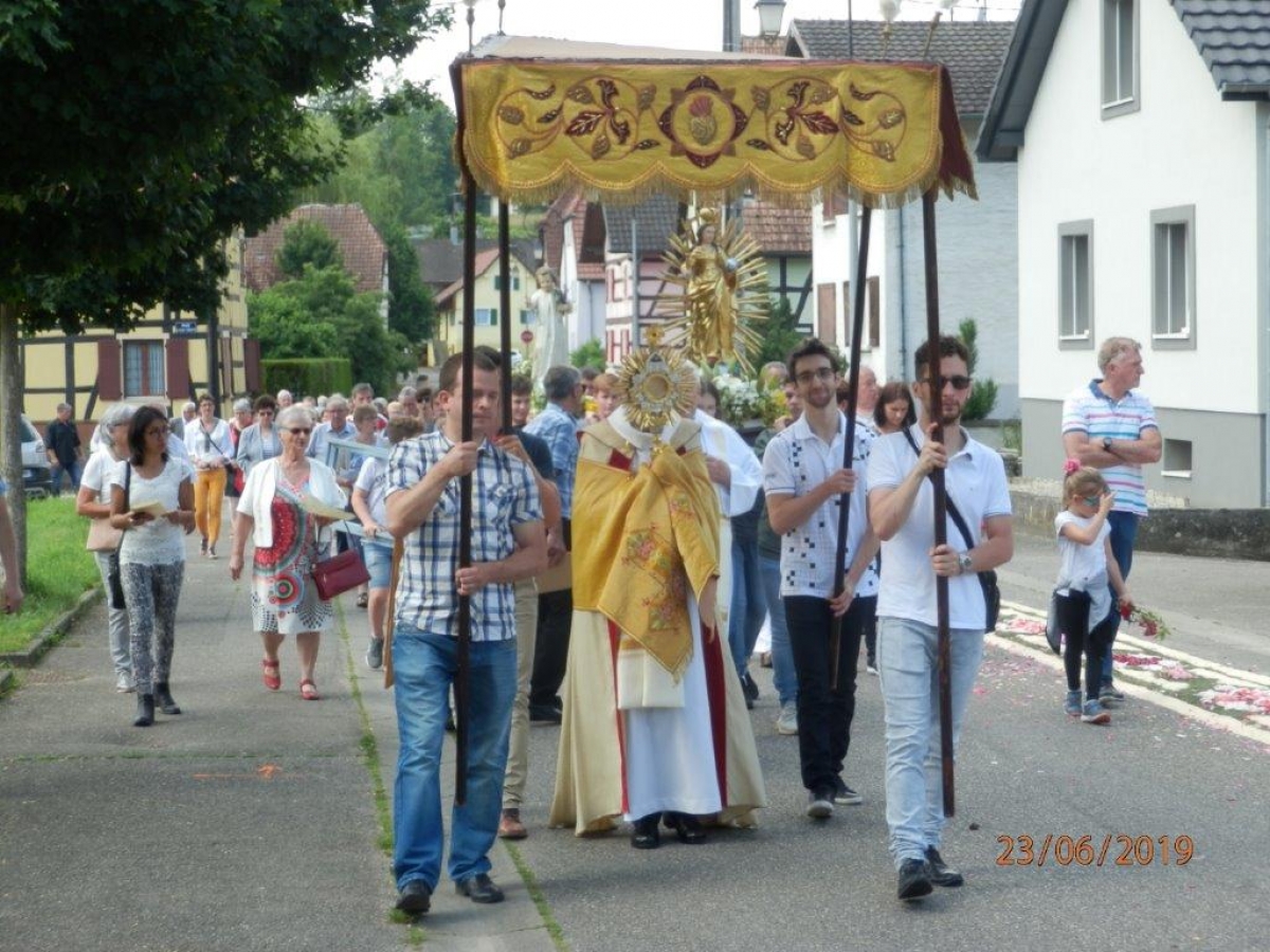 Dimanche dernier, sous un soleil radieux, la procession s'est tenue à Roppentzwiller, suivie par de nombreux fidèles. Les paroissiens bénévoles, comme chaque année, n'ont pas ménagé leurs efforts pour rendre cette fête toujours aussi belle et haute en couleur. Merci à toutes et tous et à l'année prochaine.