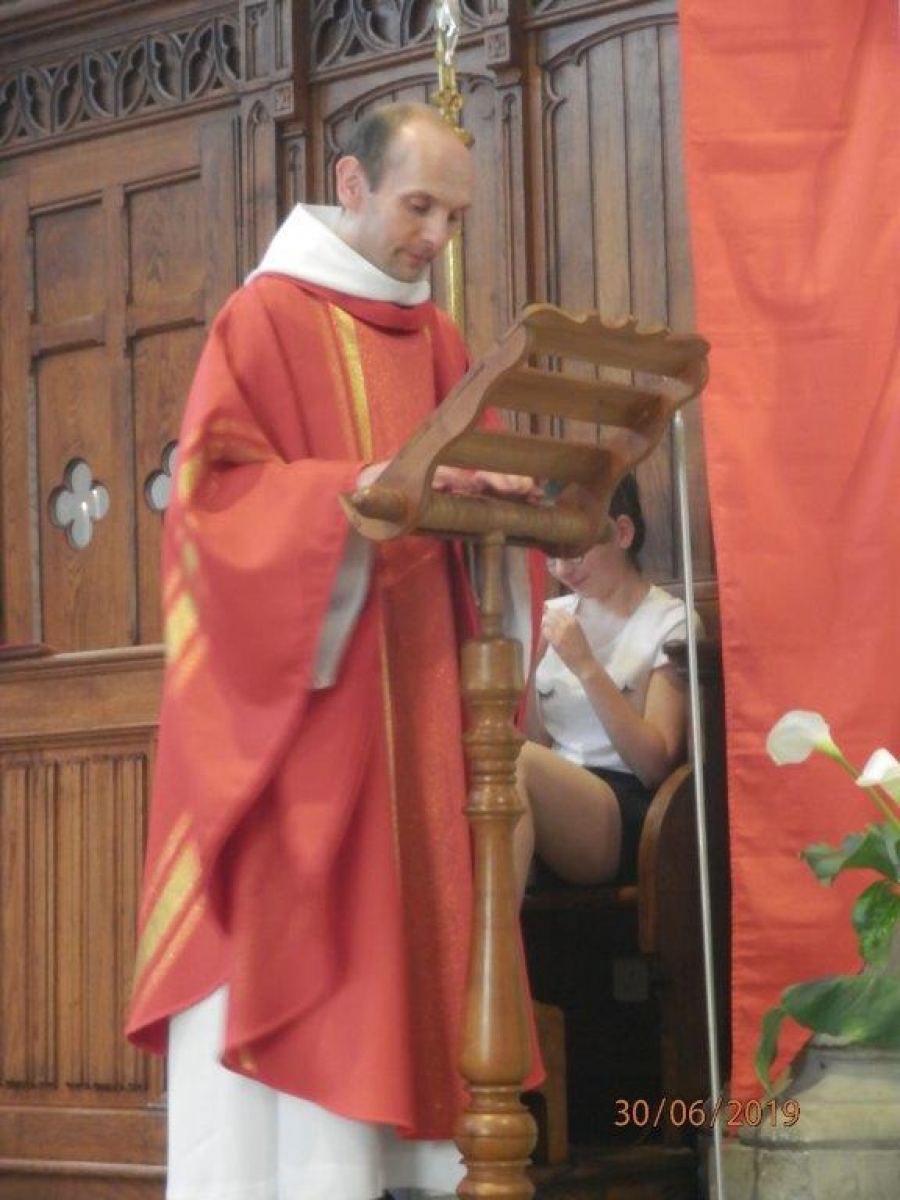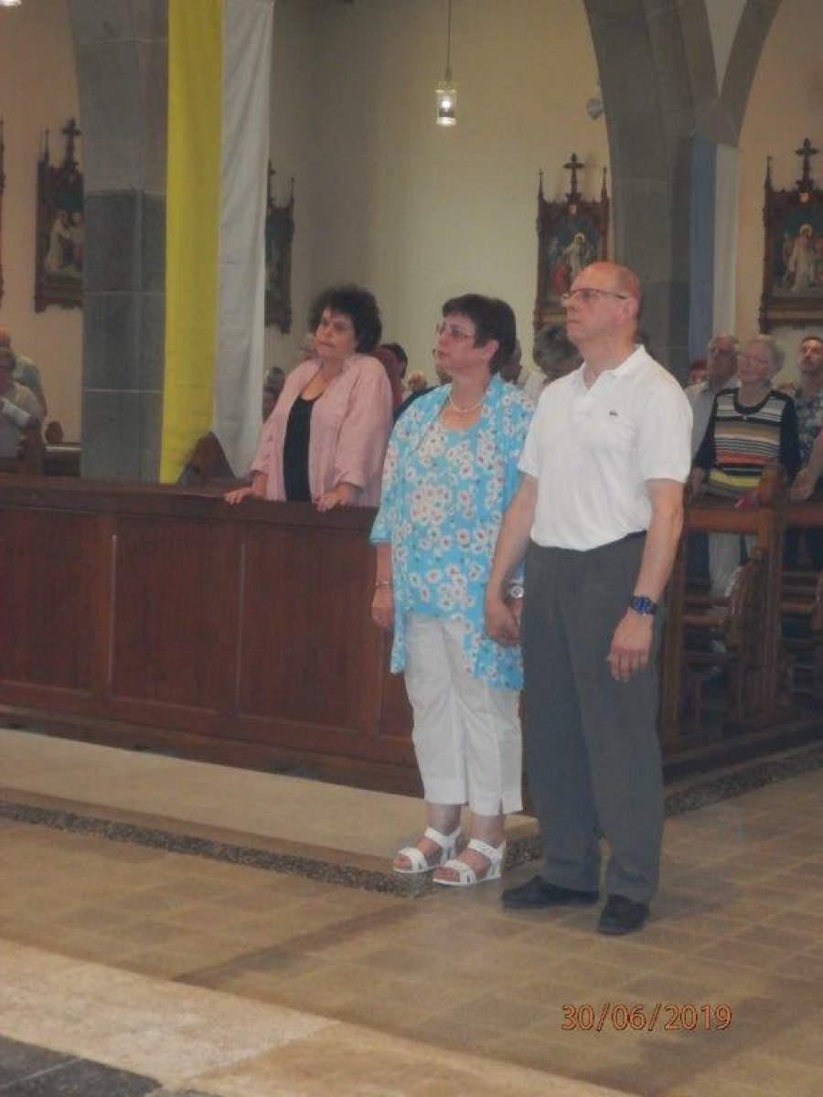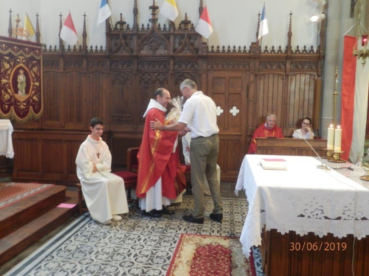 Ce dimanche 30 juin 2019, nous avons eu la joie de fêter, dans le cadre de la fête patronale de Waldighoffen, le jubilé de porcelaine (20 années de sacerdoce) du père Sébastien Schmitt. La sainte messe fût présidée par notre vicaire général, Hubert Schmitt. L'occasion a été donnée aux Fabriques de nos six paroisses de remettre un présent constitué de produits "monastic" par l'intermédiaire de Jean-Luc Laborde,président de la fabrique de Waldighoffen, au père Sébastien. Un discours plein d'humour a clôturé cette célébration qui s'en est suivi d'un vin d'honneur offert par la paroisse.