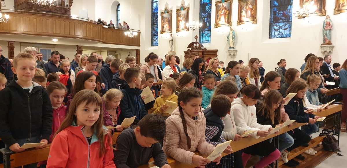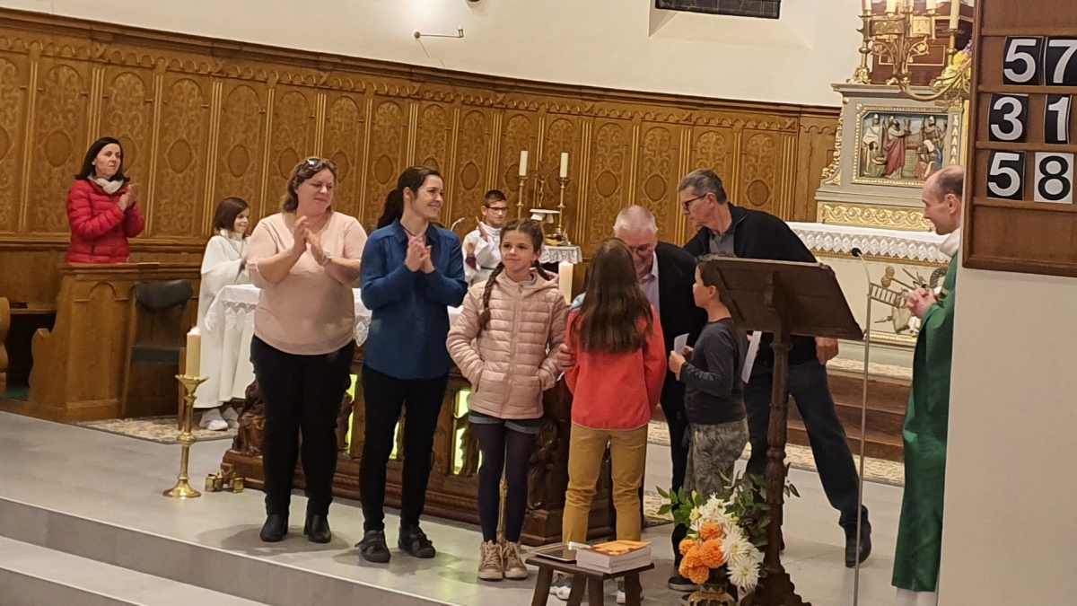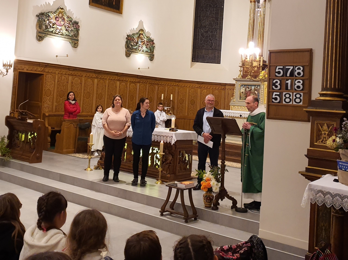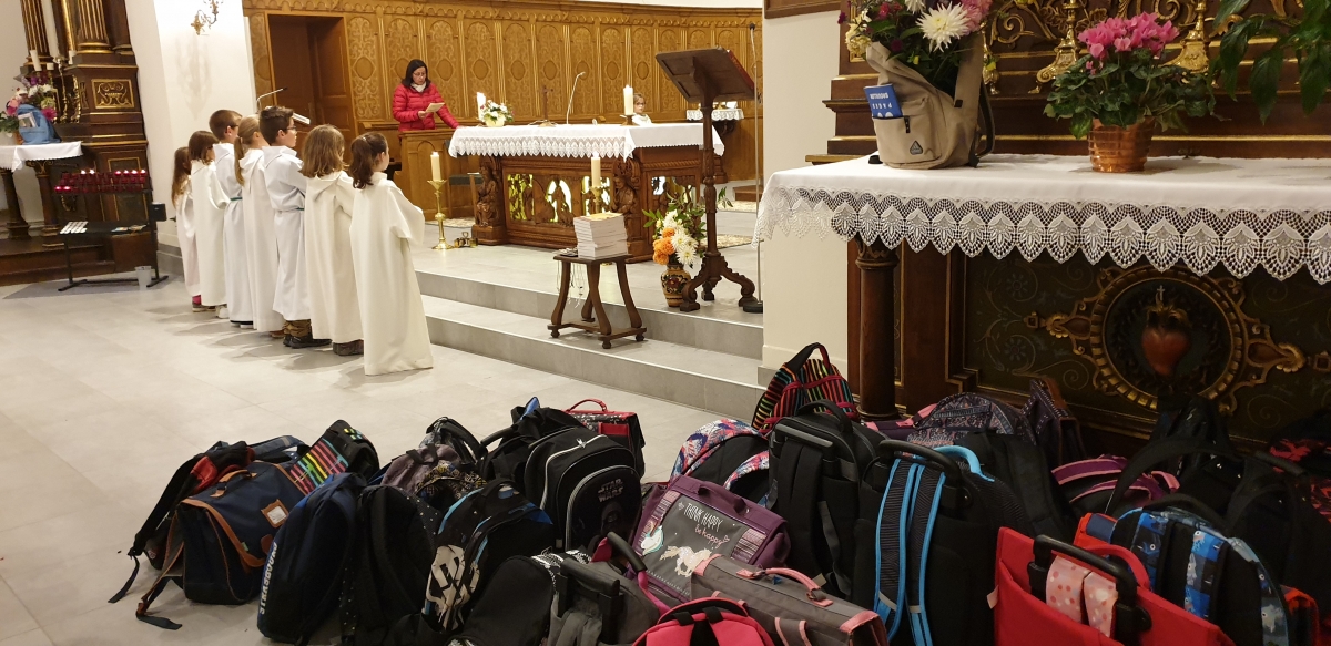 Les enfants sont entrés dans l'église en procession avec leurs cartables, les servants d'autel engagés depuis un an ont reçu leur croix, les jeunes en 1e année ont reçu le Nouveau Testament et l'ensemble des enfants ont été bénis.