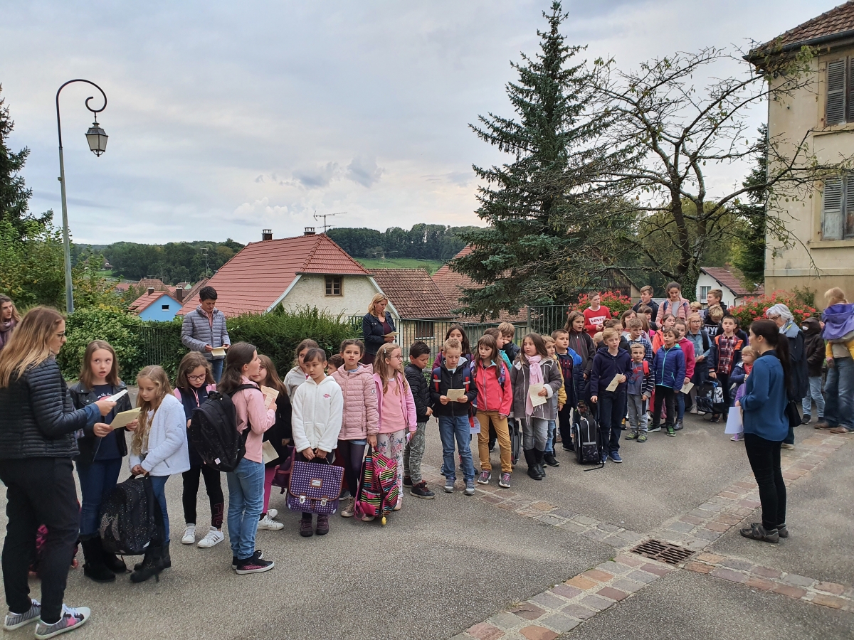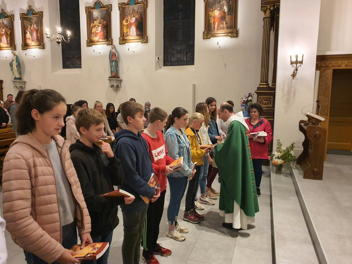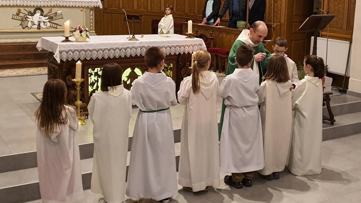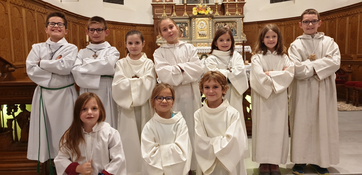 Les enfants sont entrés dans l'église en procession avec leurs cartables, les servants d'autel engagés depuis un an ont reçu leur croix, les jeunes en 1e année ont reçu le Nouveau Testament et l'ensemble des enfants ont été bénis.