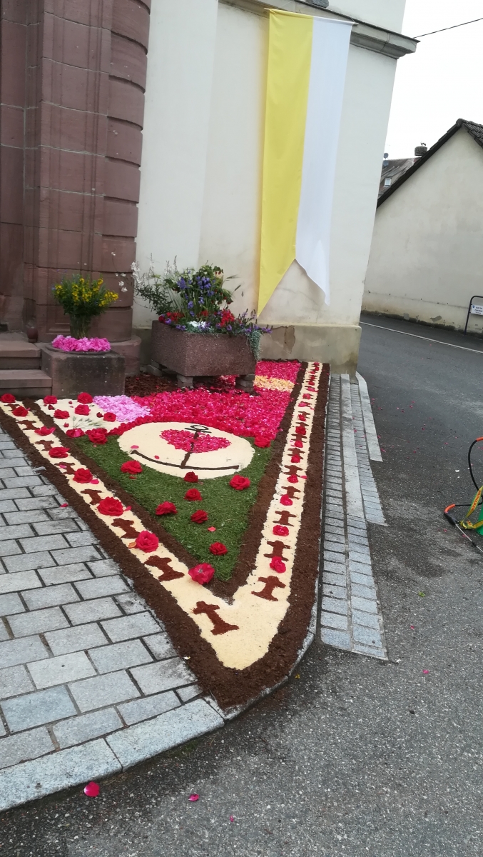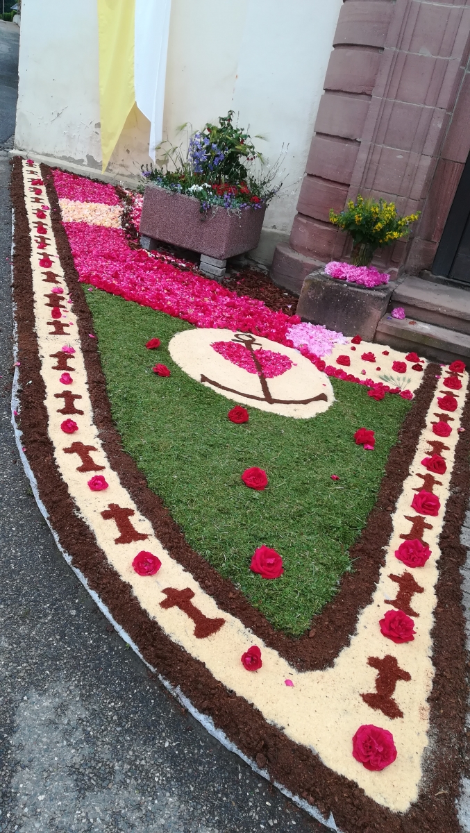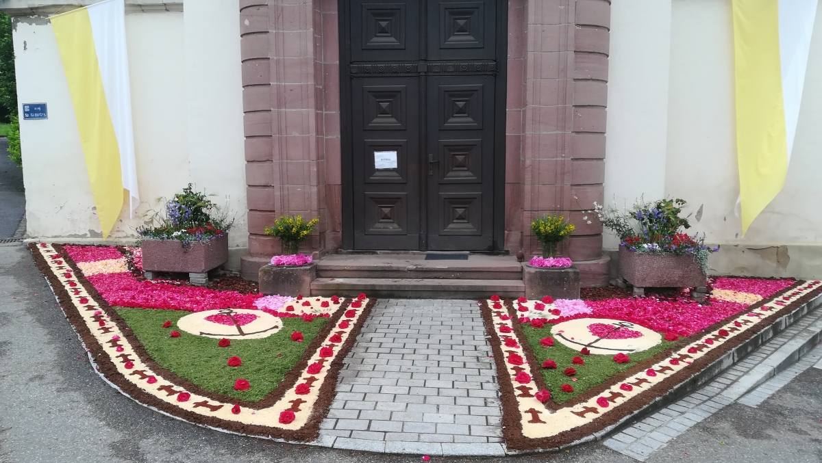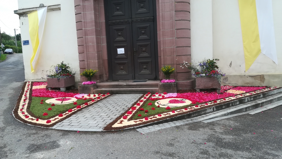 A la suite des restrictions sanitaires, un petit groupe de personnes s'est rassemblé pour réaliser un tapis de fleurs, sur le parvis de l'église de Durmenach, pour accueillir les fidèles à la célébration de la messe.
