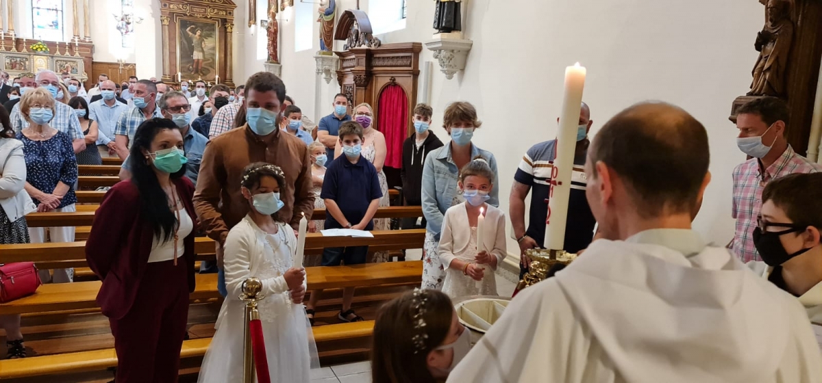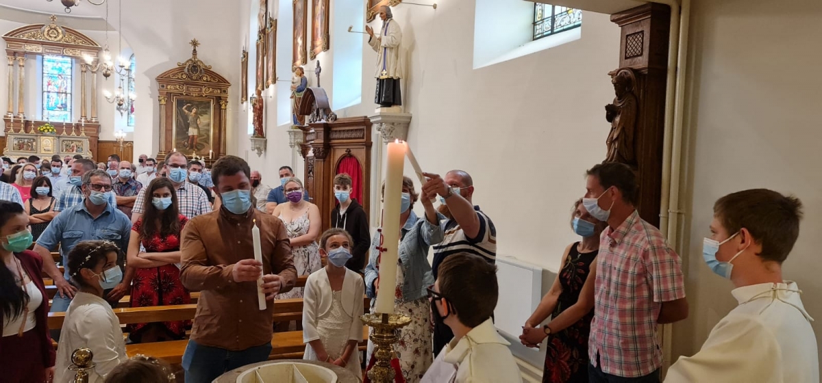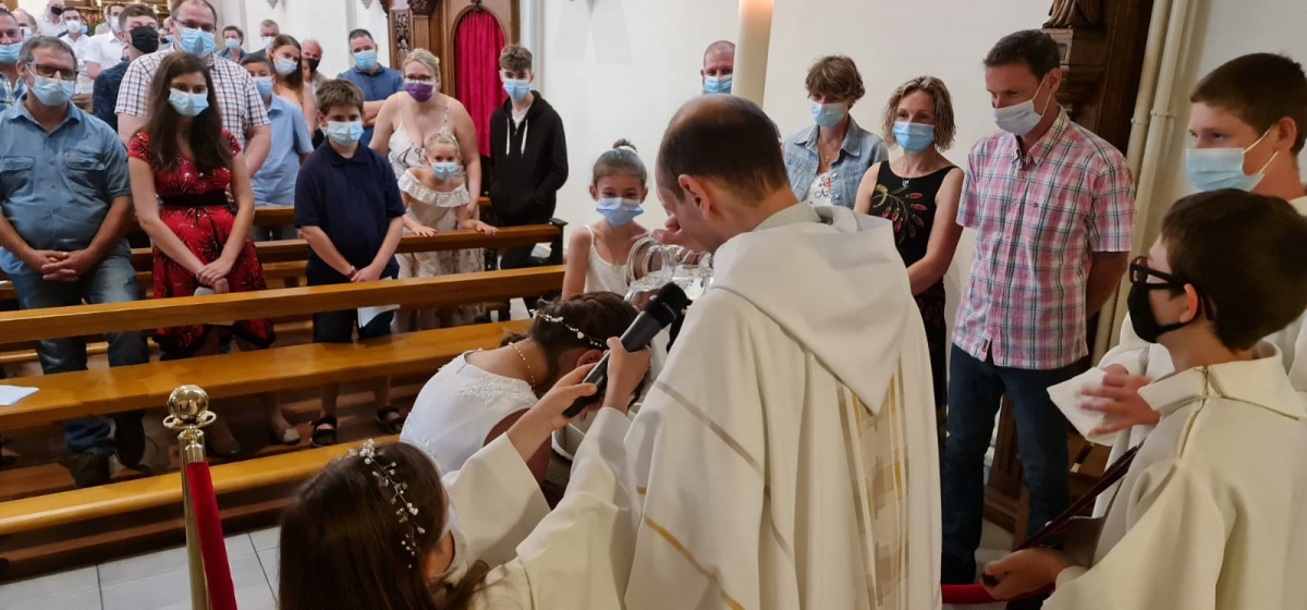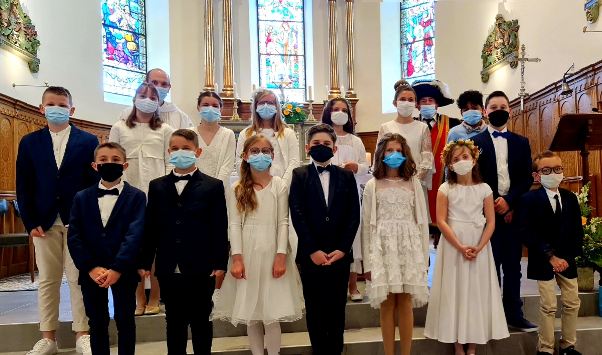 En juin, c'est la première communion prévue cette année qui a été célébrée, après que les rencontres aient repris durant l'été dernier, en vue du premier pardon, et qu'elles aient dû être adaptées à plusieurs reprises aux diverses mesures sanitaires et aux confinements successifs, si bien que certaines n'ont finalement eu lieu qu'à distance.