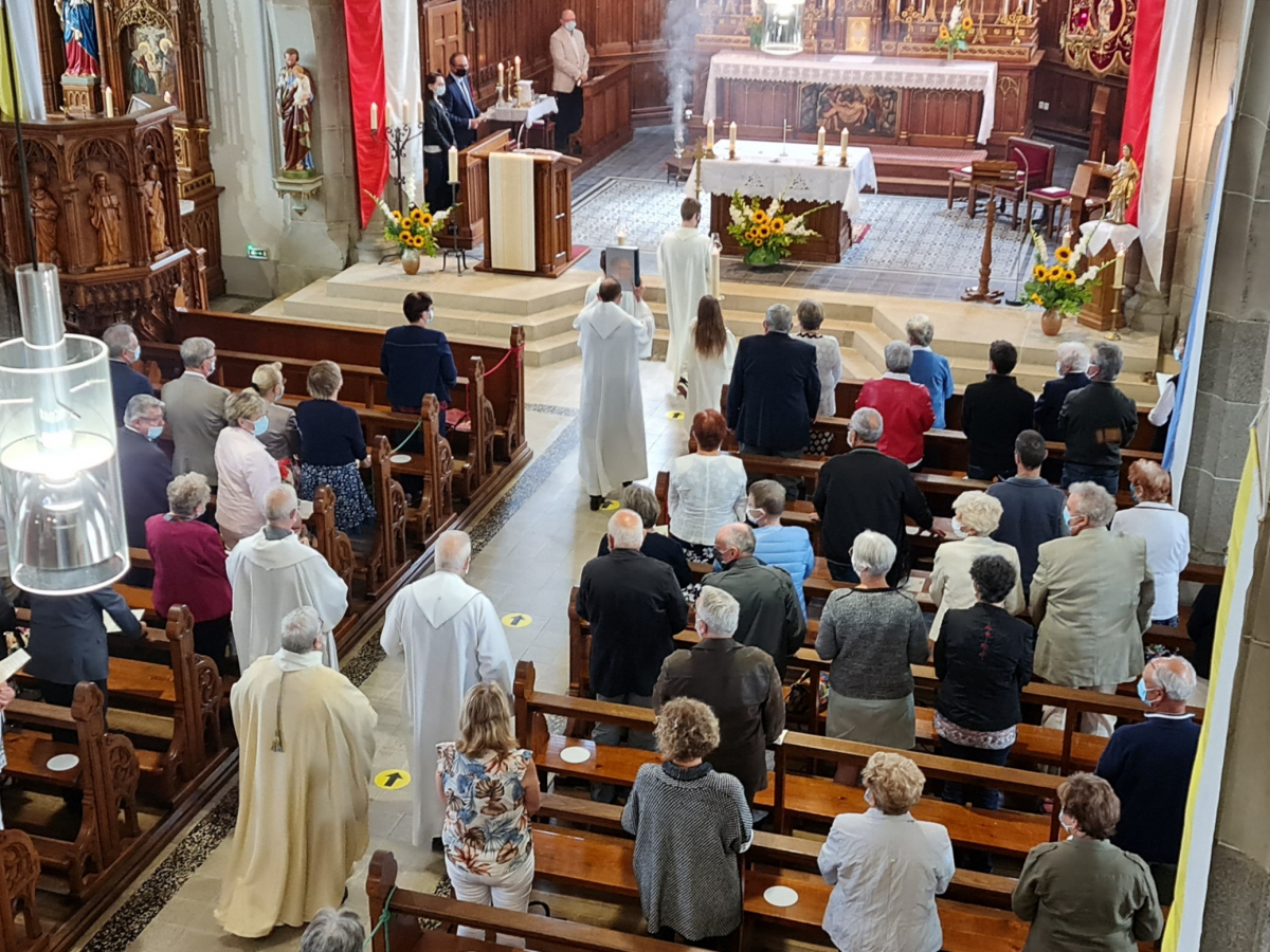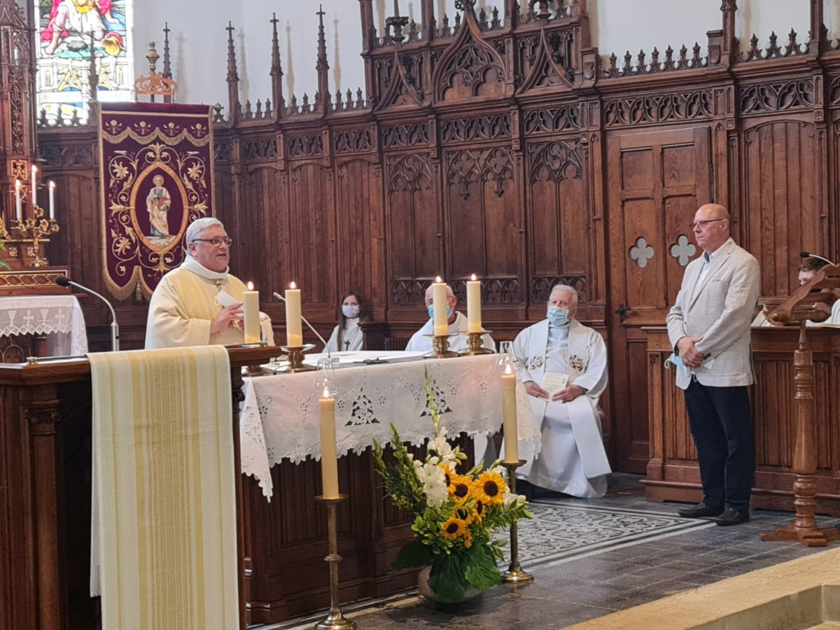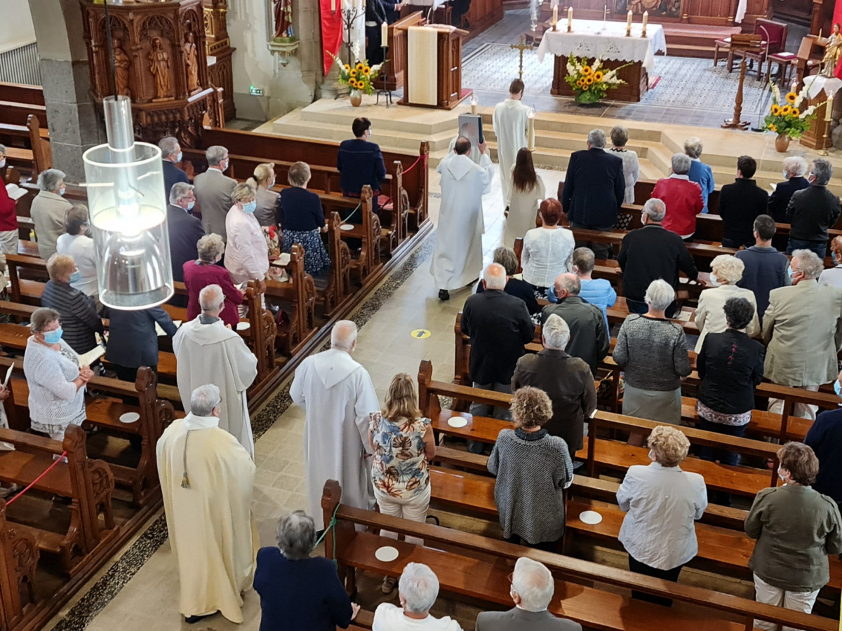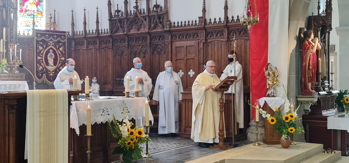 A la fin de la messe, les différents Conseils de Fabrique, au nom de tous, lui ont offert une chasuble rouge dont le motif brodé sont les saints Pierre et Paul, les saints patrons de sa paroisse. Il a promis qu’il la porterait lorsqu’il viendra, dans quelques semaines, confirmer les jeunes !