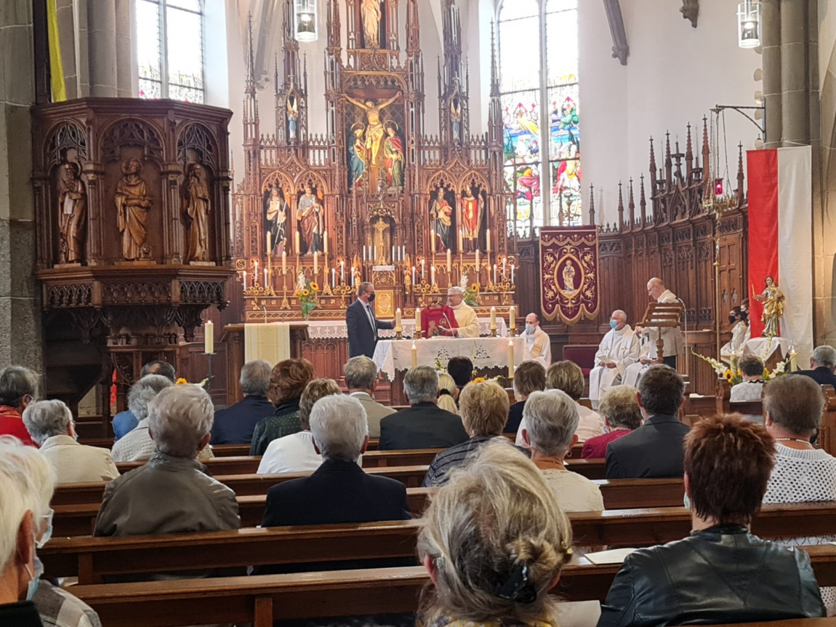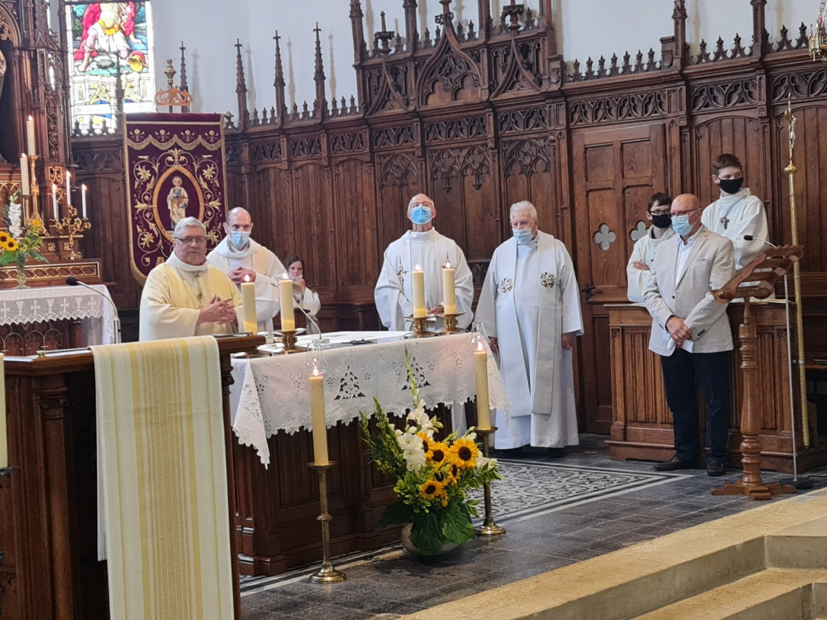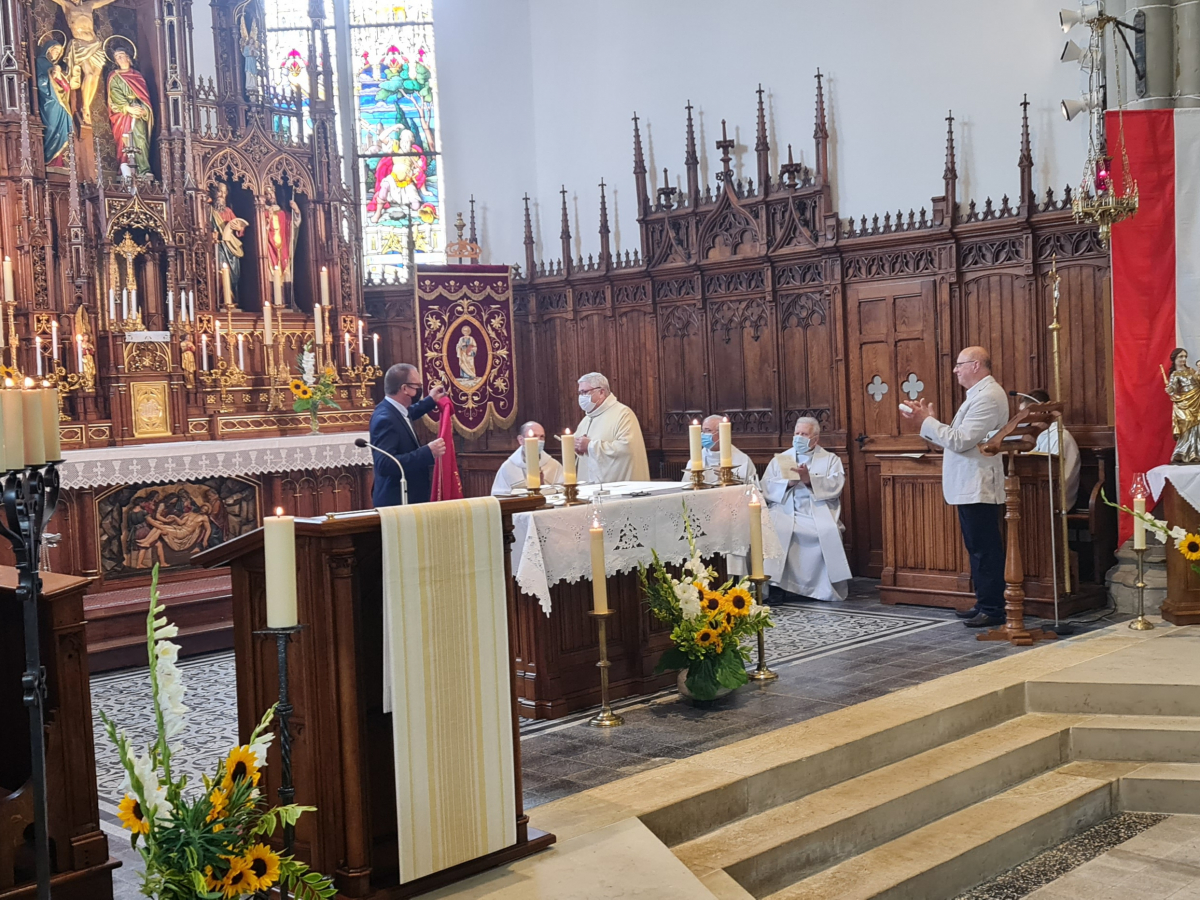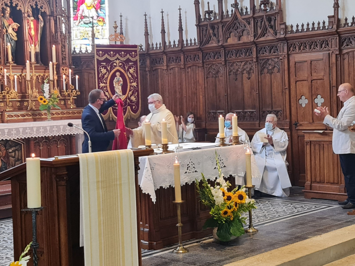A la fin de la messe, les différents Conseils de Fabrique, au nom de tous, lui ont offert une chasuble rouge dont le motif brodé sont les saints Pierre et Paul, les saints patrons de sa paroisse. Il a promis qu’il la porterait lorsqu’il viendra, dans quelques semaines, confirmer les jeunes !